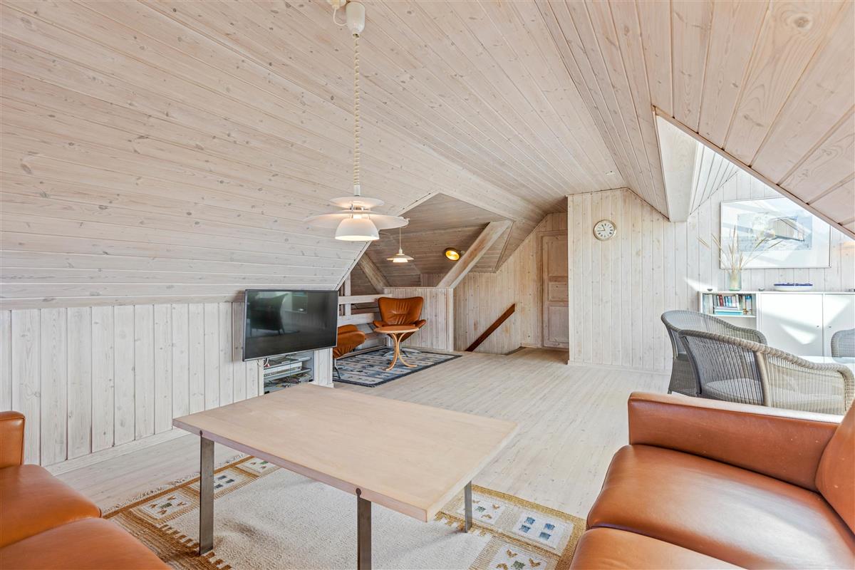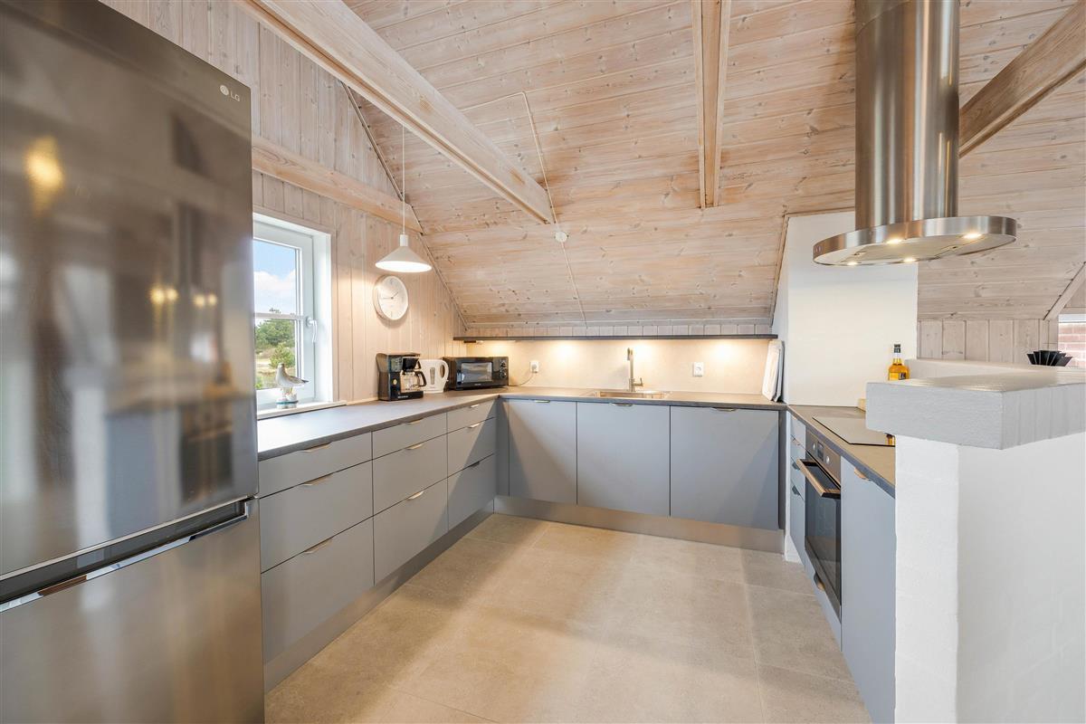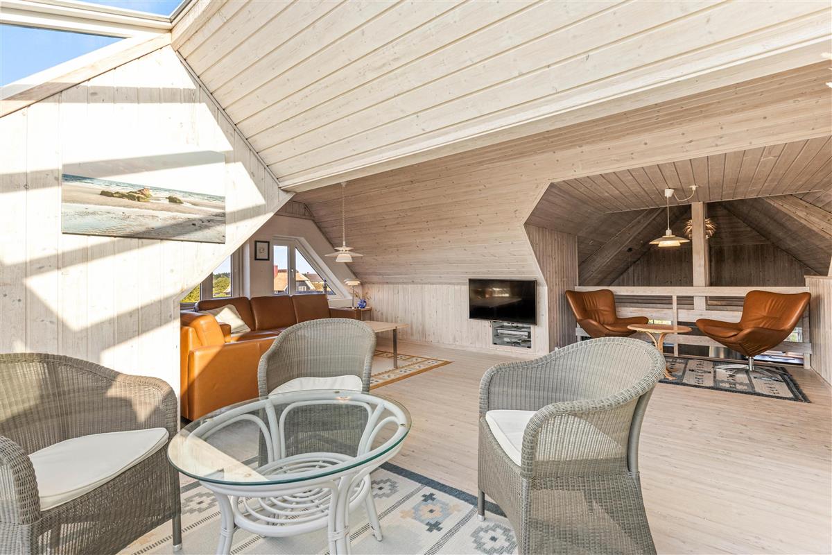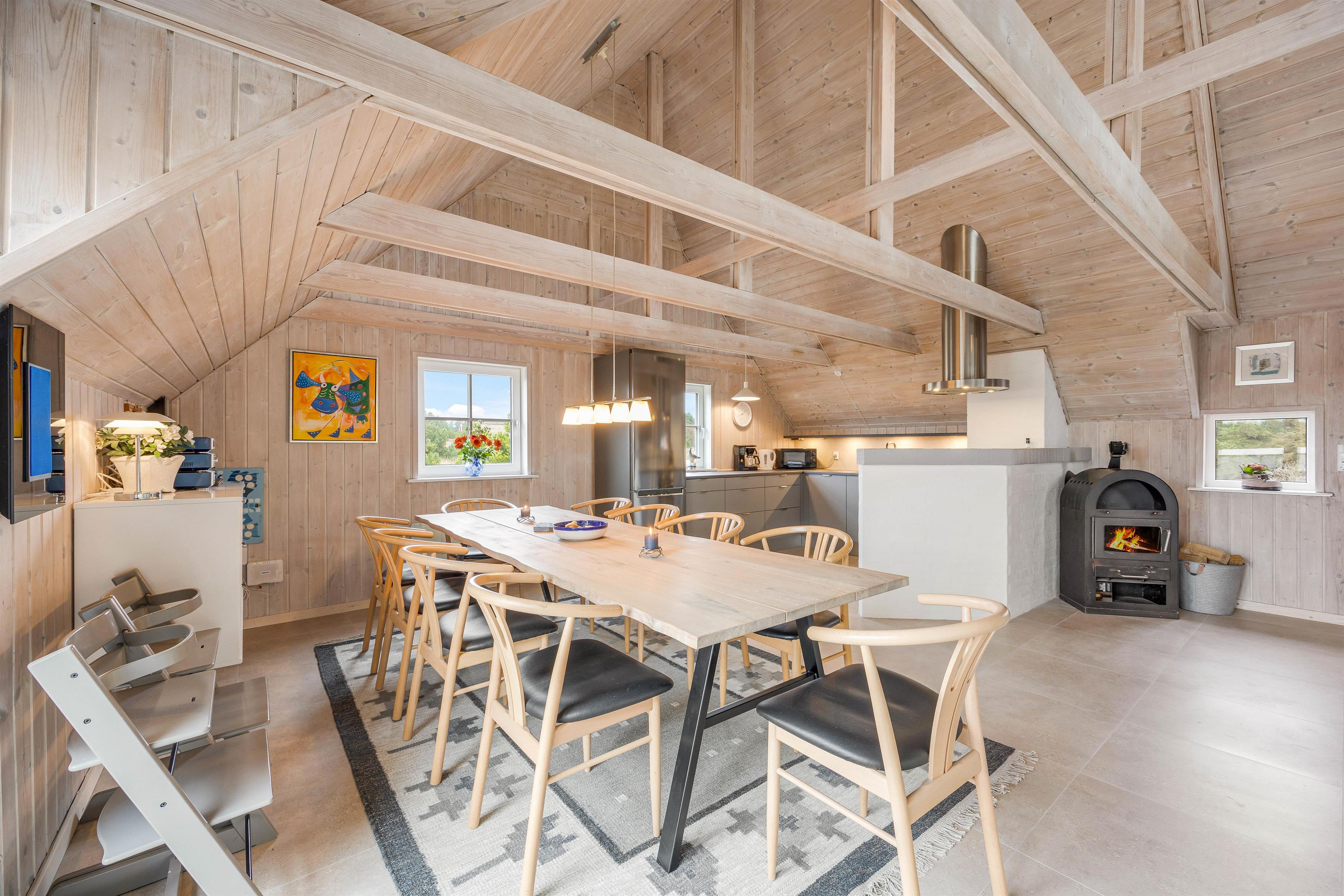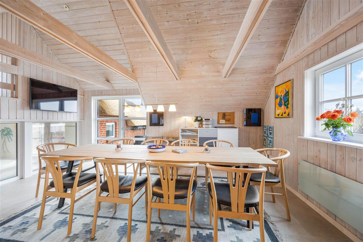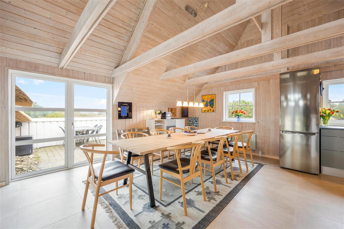 This beautiful thatched holiday home at Ingridsvej 11 exudes a truly special charm with its high ceilings, exposed beams, and tasteful furnishings. You'll feel at home the moment you arrive. Renovated in 2023, the house spans two floors – or two and a half, to be precise, as the wellness area with pool, sauna and hot tub is set on a split level from the ground floor. The ground floor features an open-plan, modern kitchen with all essential amenities and a long dining table with space for everyone to dine together. A window overlooks the pool area – perfect for keeping an eye on children. There's also a cosy wood-burning stove, an essential feature for any Danish holiday home experience.