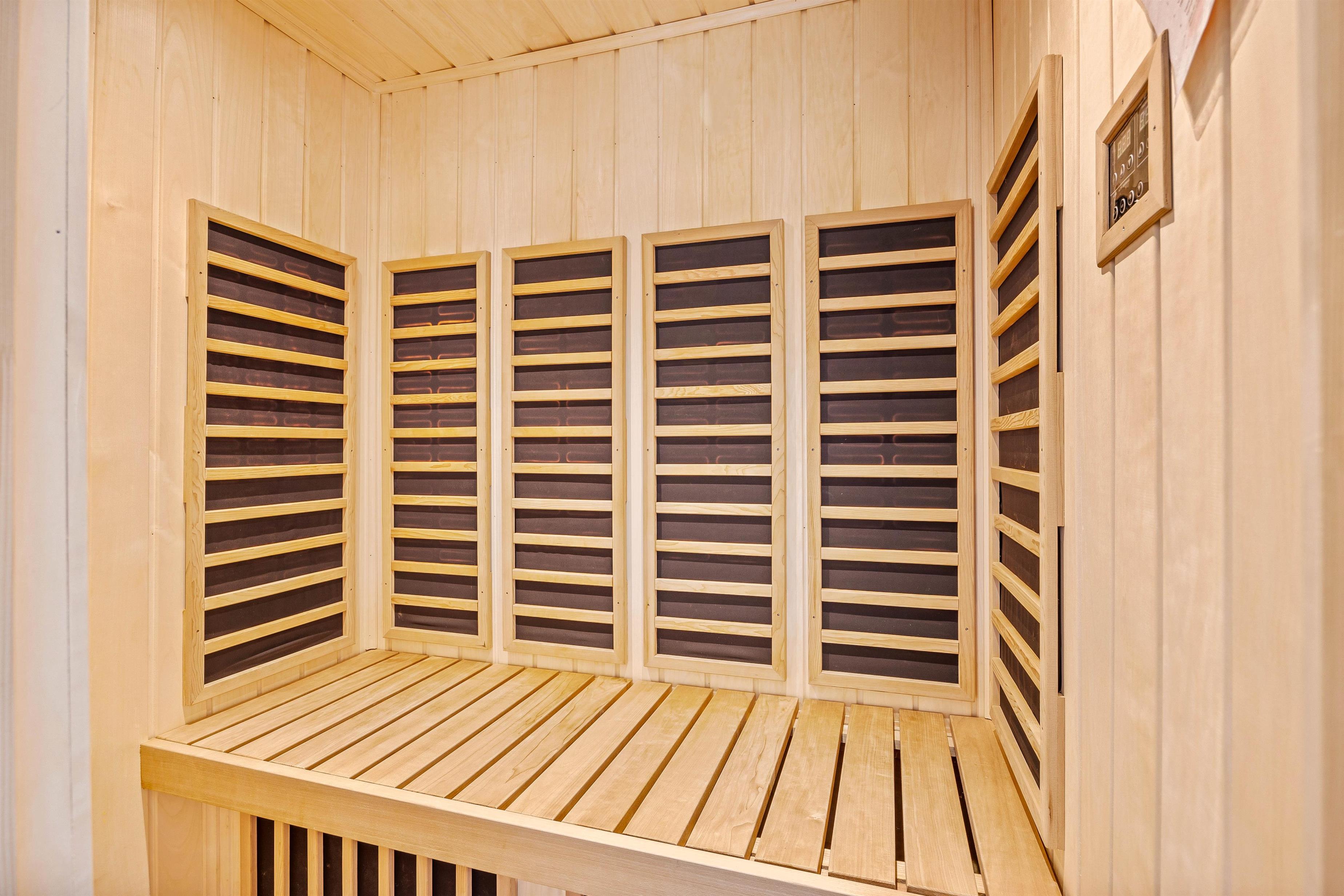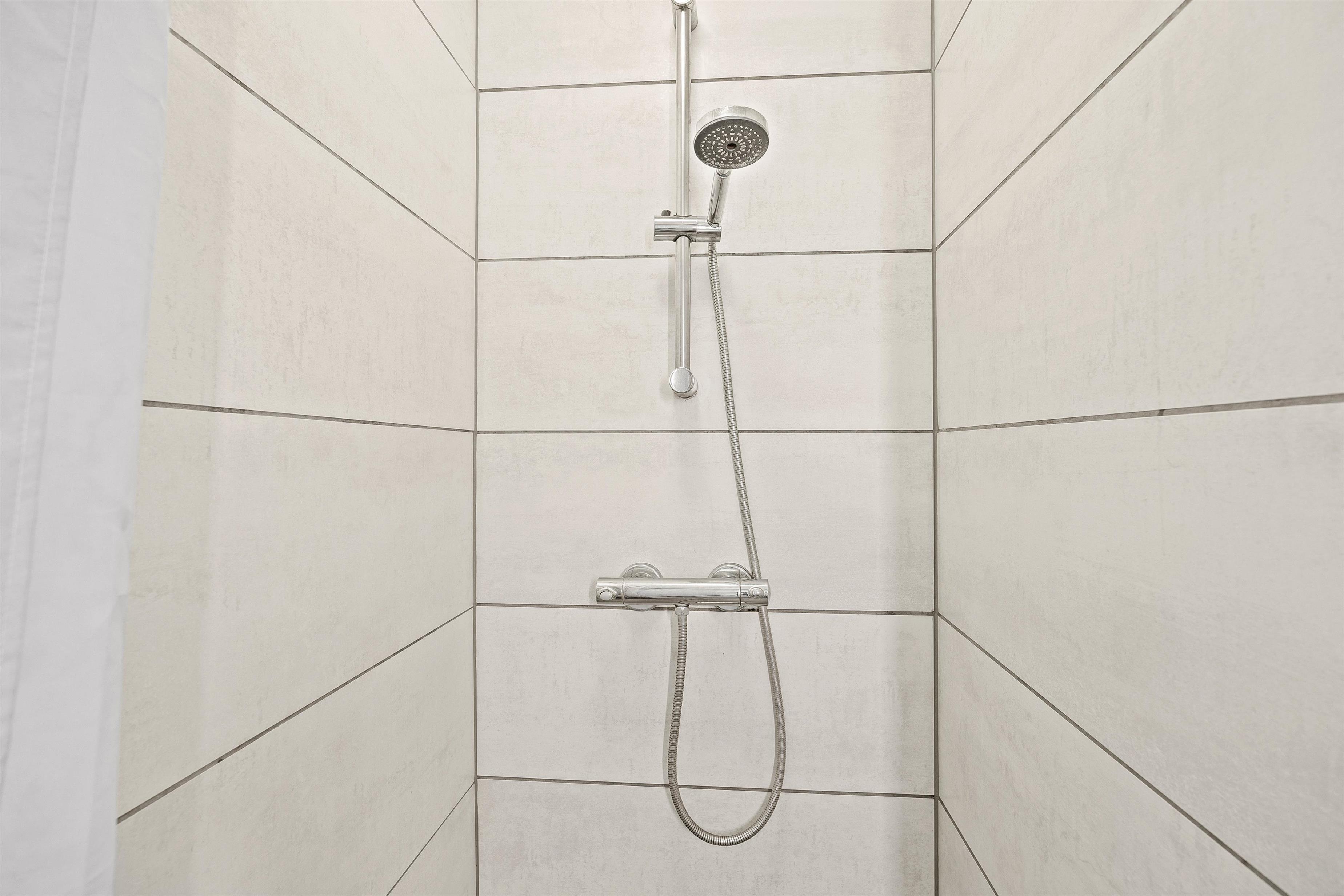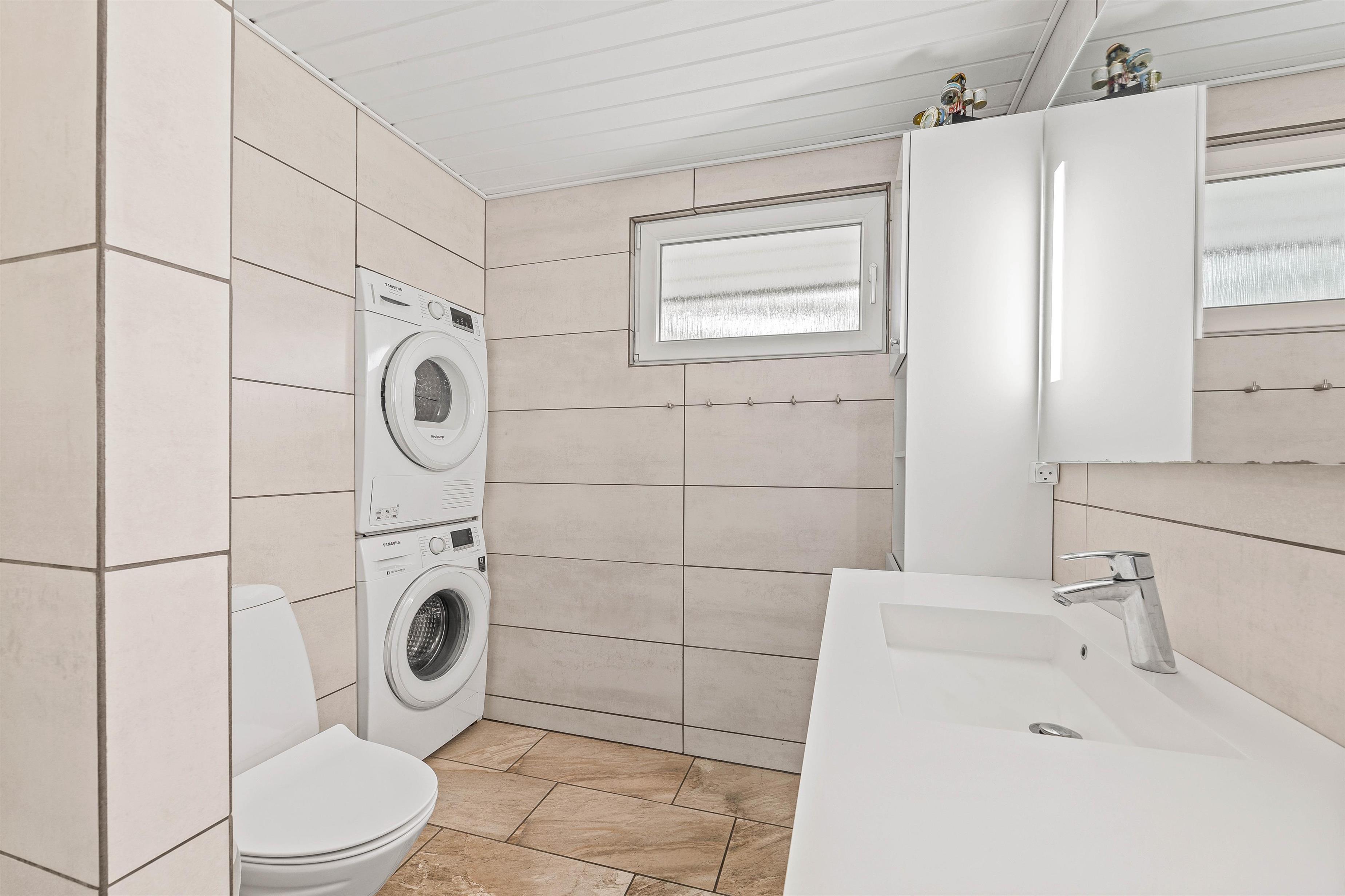 The bathroom features underfloor heating and a shower. Additionally, this bathroom includes a whirlpool and an infrared sauna. As holiday homes with pools typically require plenty of towels, a washing machine and tumble dryer ensure you'll have fresh towels available daily. For added convenience, there's also a separate guest toilet.
