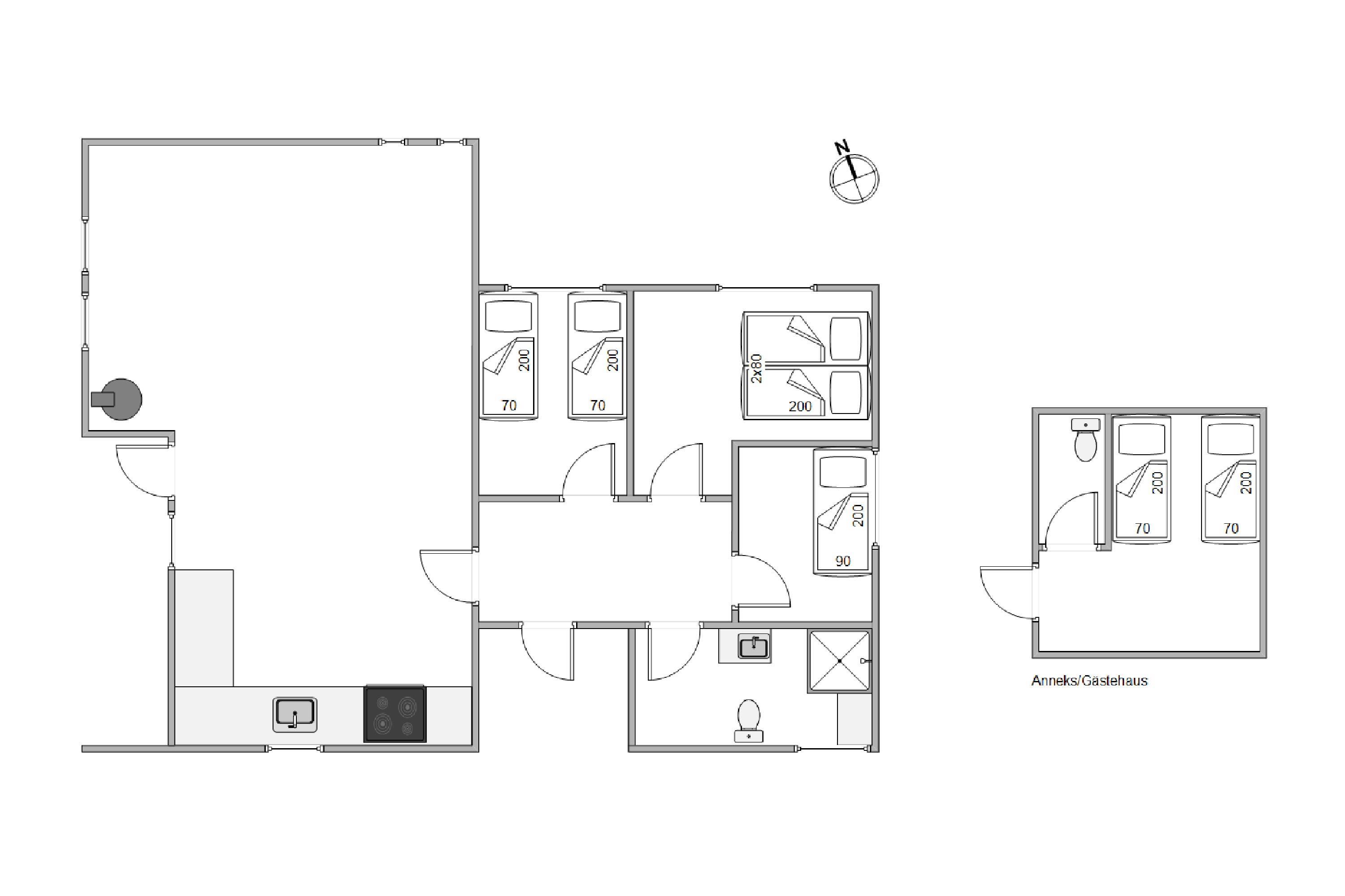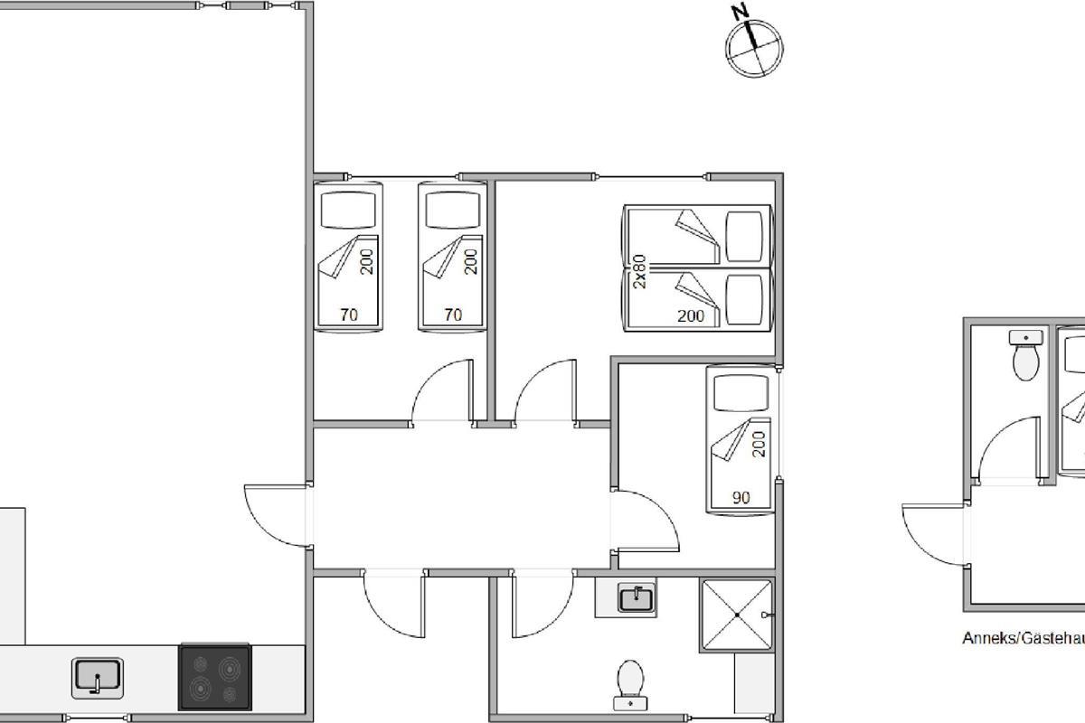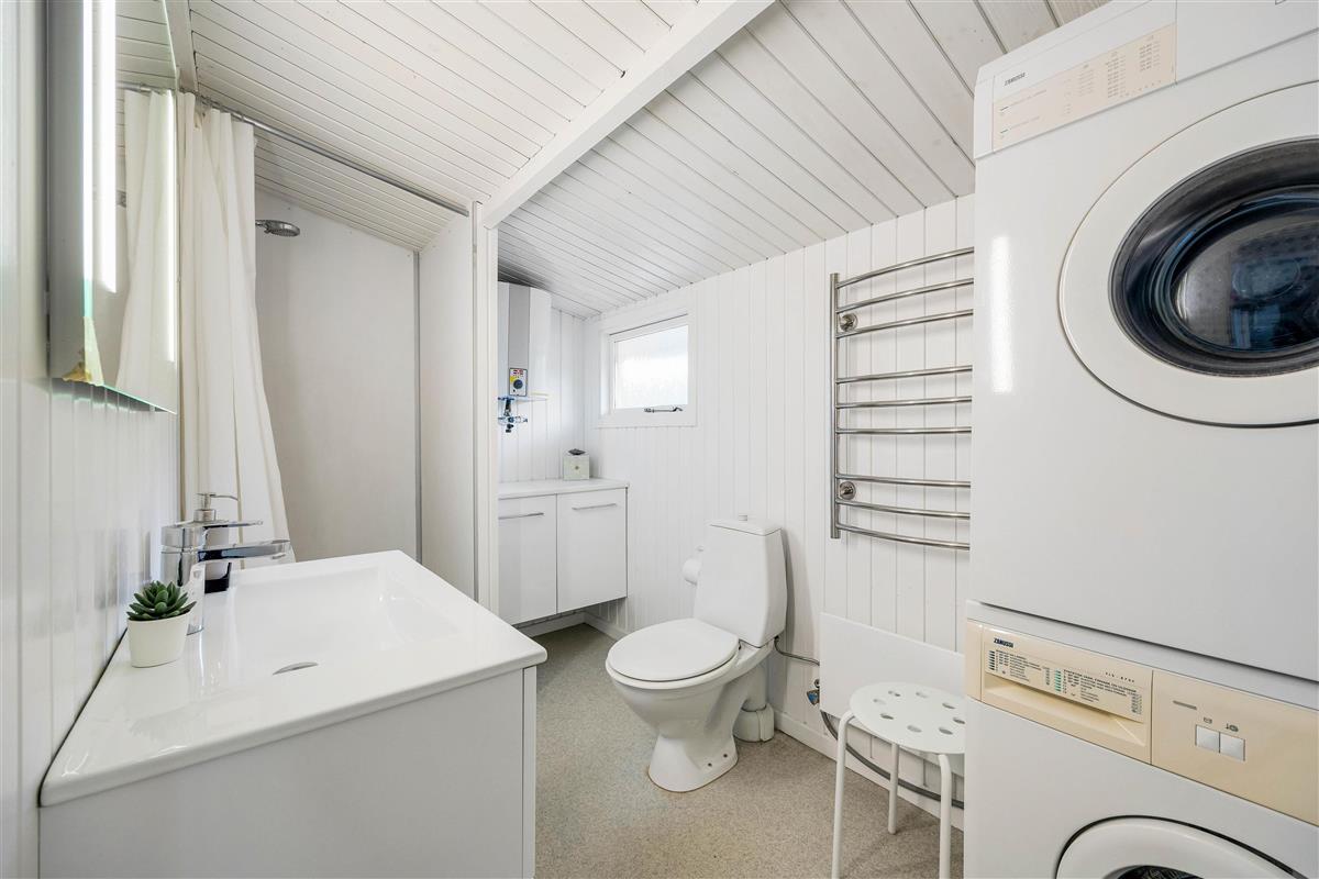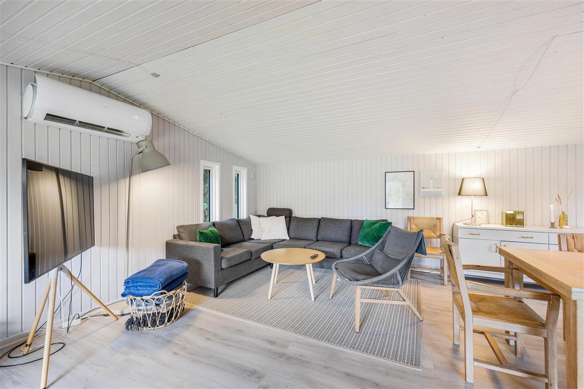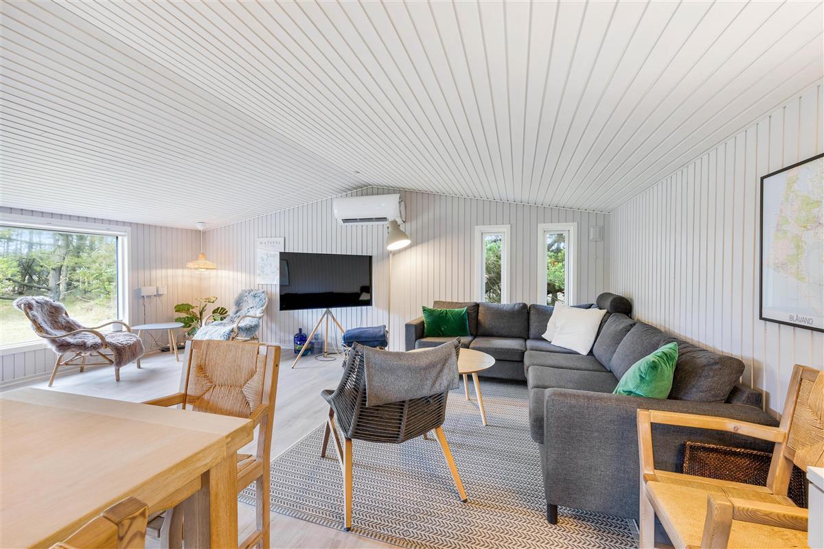 The holiday home is situated on a 2,800 square metre plot, and outside you will find a lovely, partially covered terrace and a garden where the whole family can spend the warm and sunny days of your holiday. If you need to warm up, the outdoor sauna is ready for you, and if you need to cool off quickly on hot days, the outdoor shower will do the trick – the outdoor shower can be used from 1 April to 31 October.