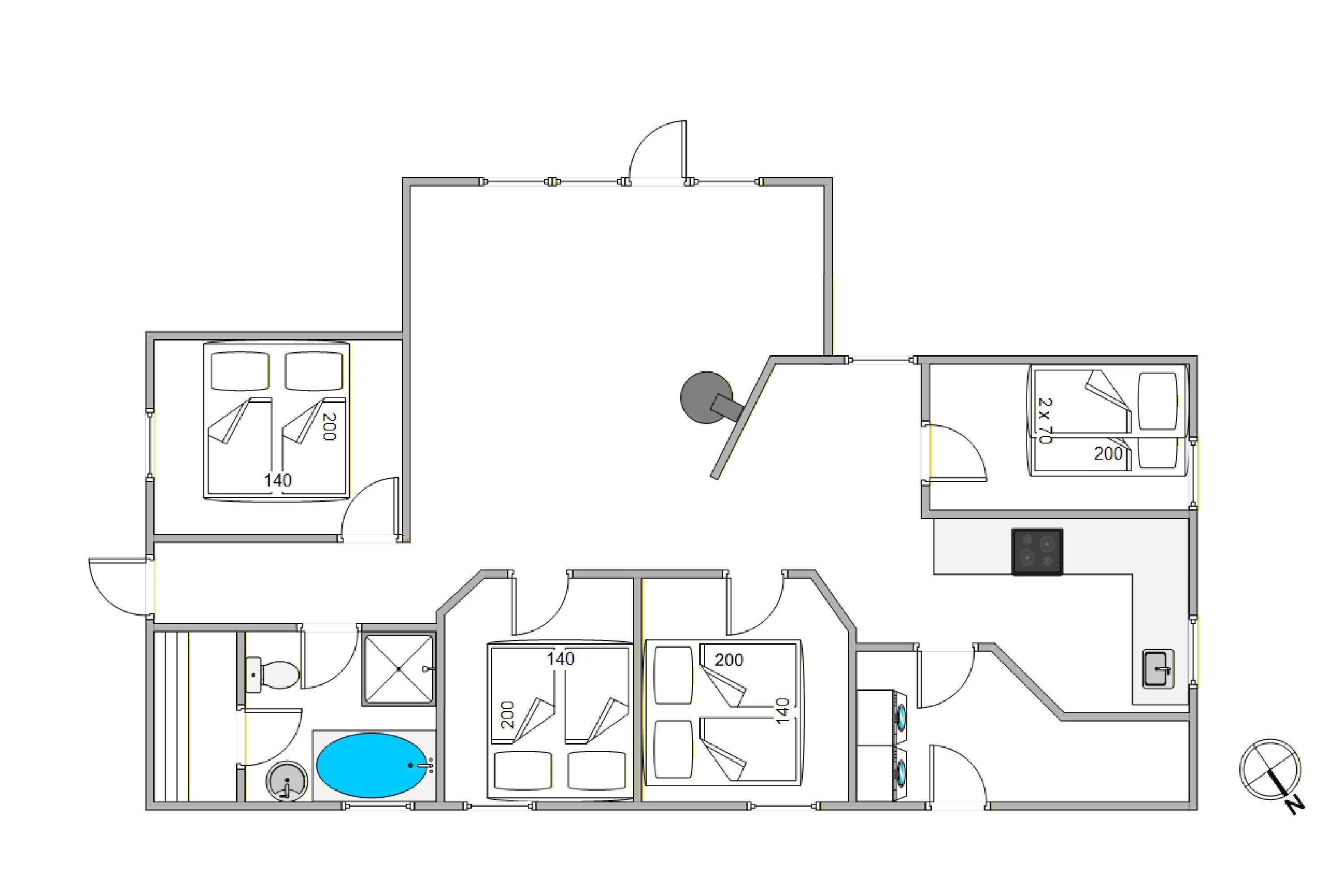 Dieses Ferienhaus in Blåvand ist ideal für einen Urlaub mit Familie oder Freunden. Mit 4 Schlafzimmern, ausgestattet mit 3 Dreiviertelbetten (140x200) und 1 Etagenbett (2x70x200) bietet es Platz für ca. 6 Personen, die sich hier nach intensiven und spannenden Urlaubserlebnissen tagsüber ausruhen und erholen können. Die offene Küche und der einladende Essbereich ermöglichen es dir, gemeinsam zu kochen und gemütliche Abende zu verbringen.