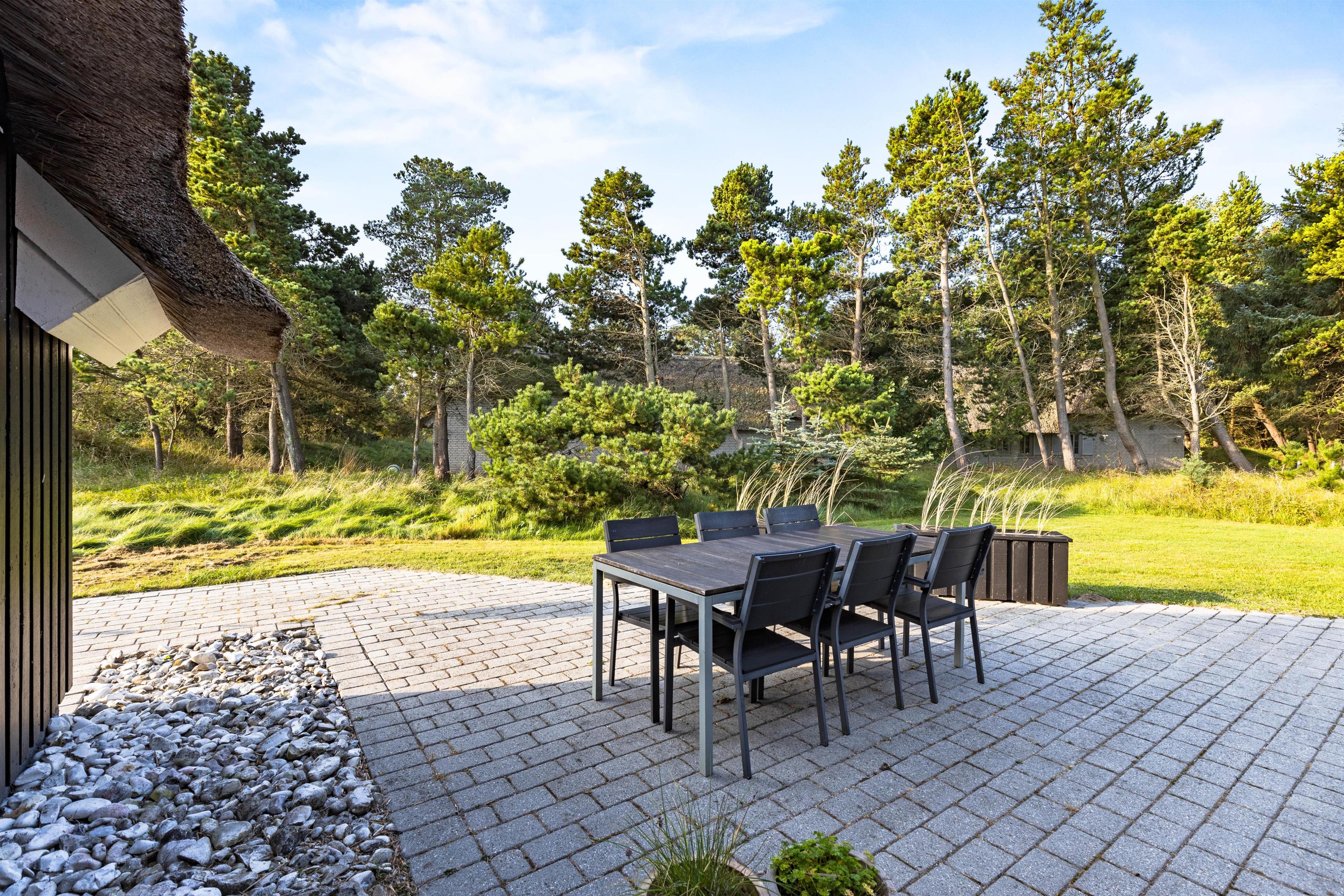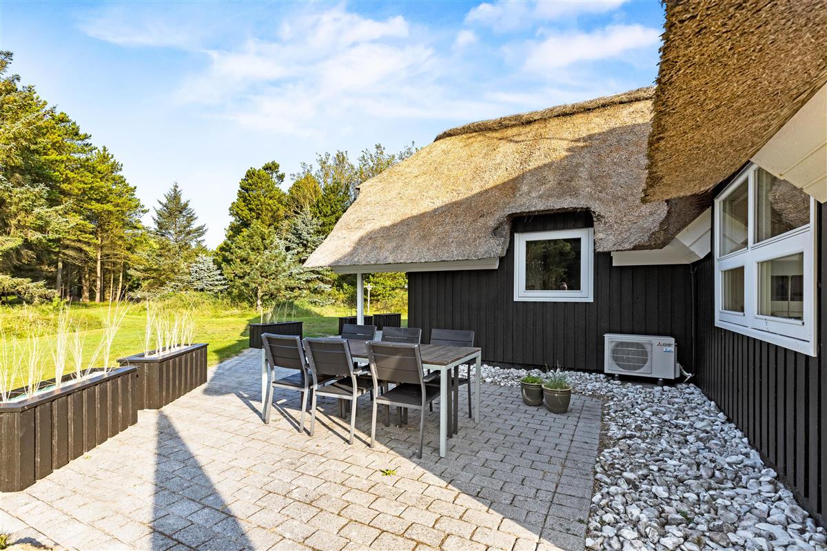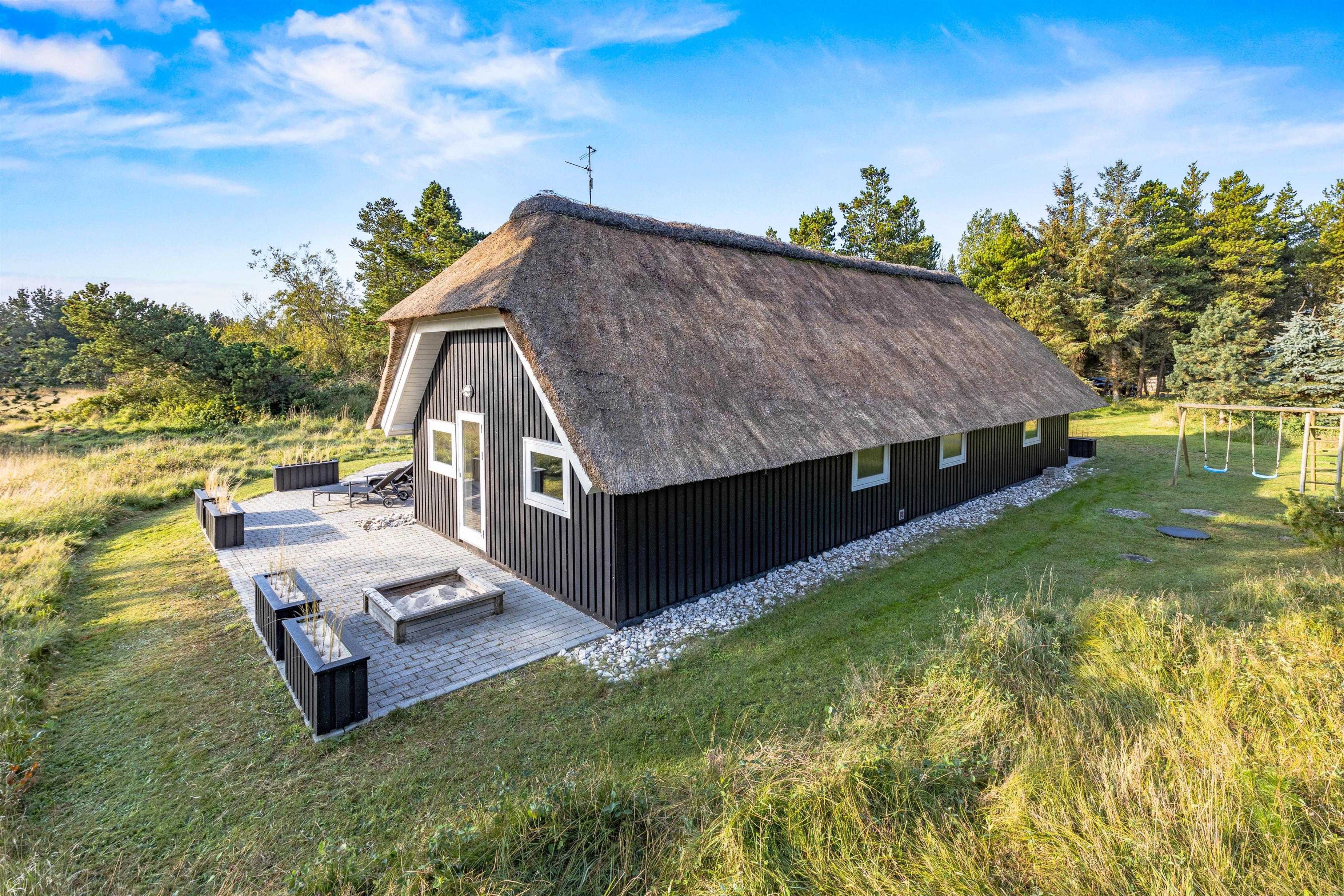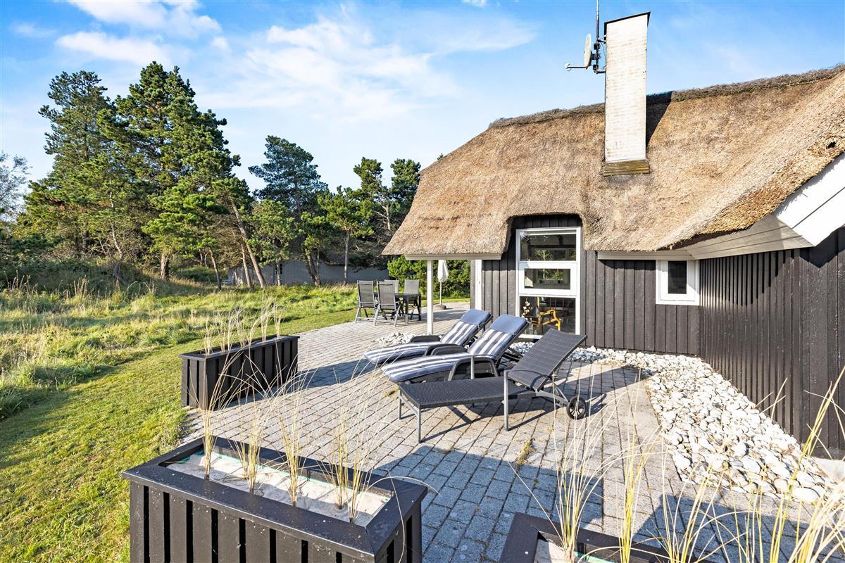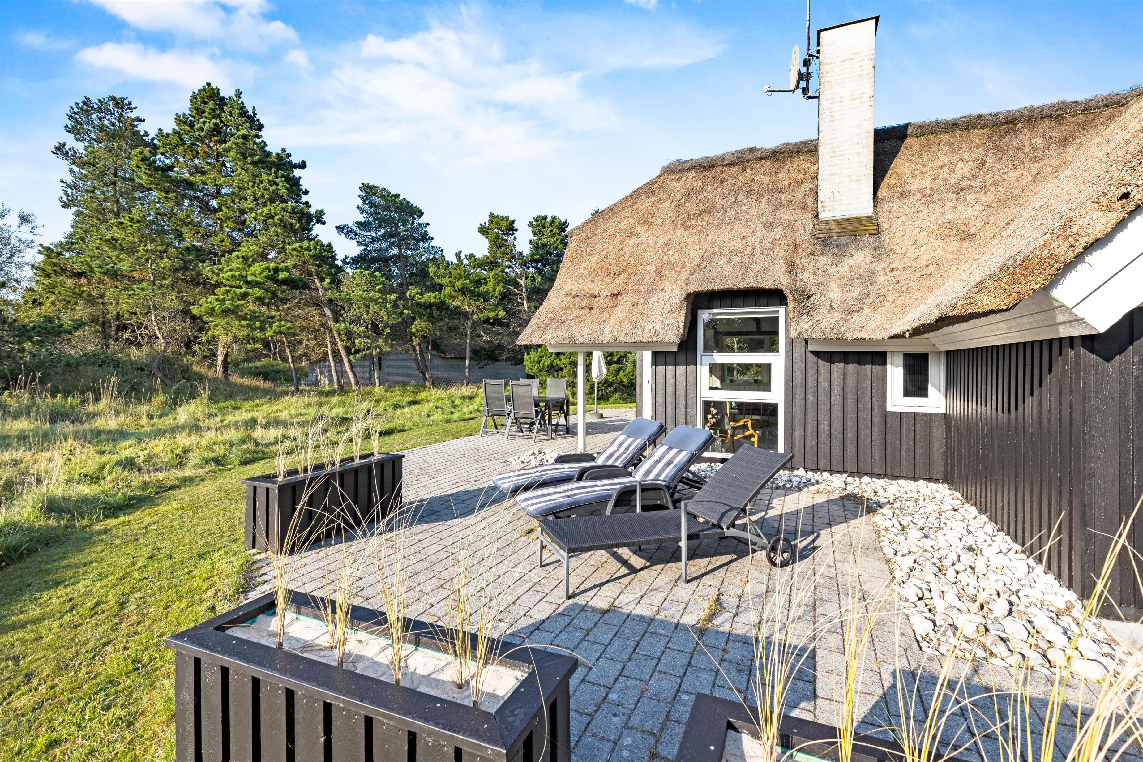 Beautifully screened by trees and bushes at Karl Postsvej 15B, just 700 metres from Blåvand's centre, lies this cosy holiday home nestled under a traditional thatched roof. Families of up to 6 people can look forward to a wonderful and relaxing holiday, complete with sauna and hot tub. The family dog is naturally welcome to join your holiday.