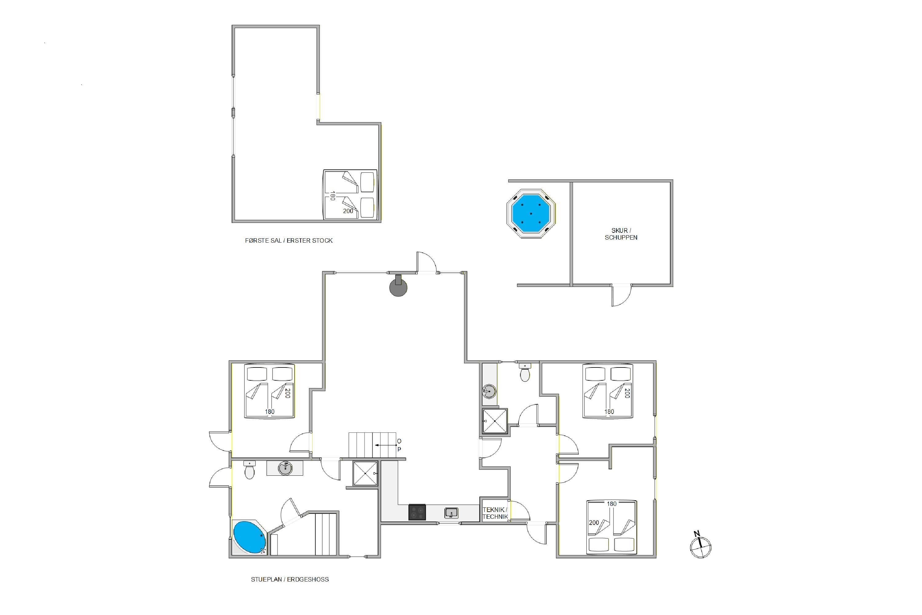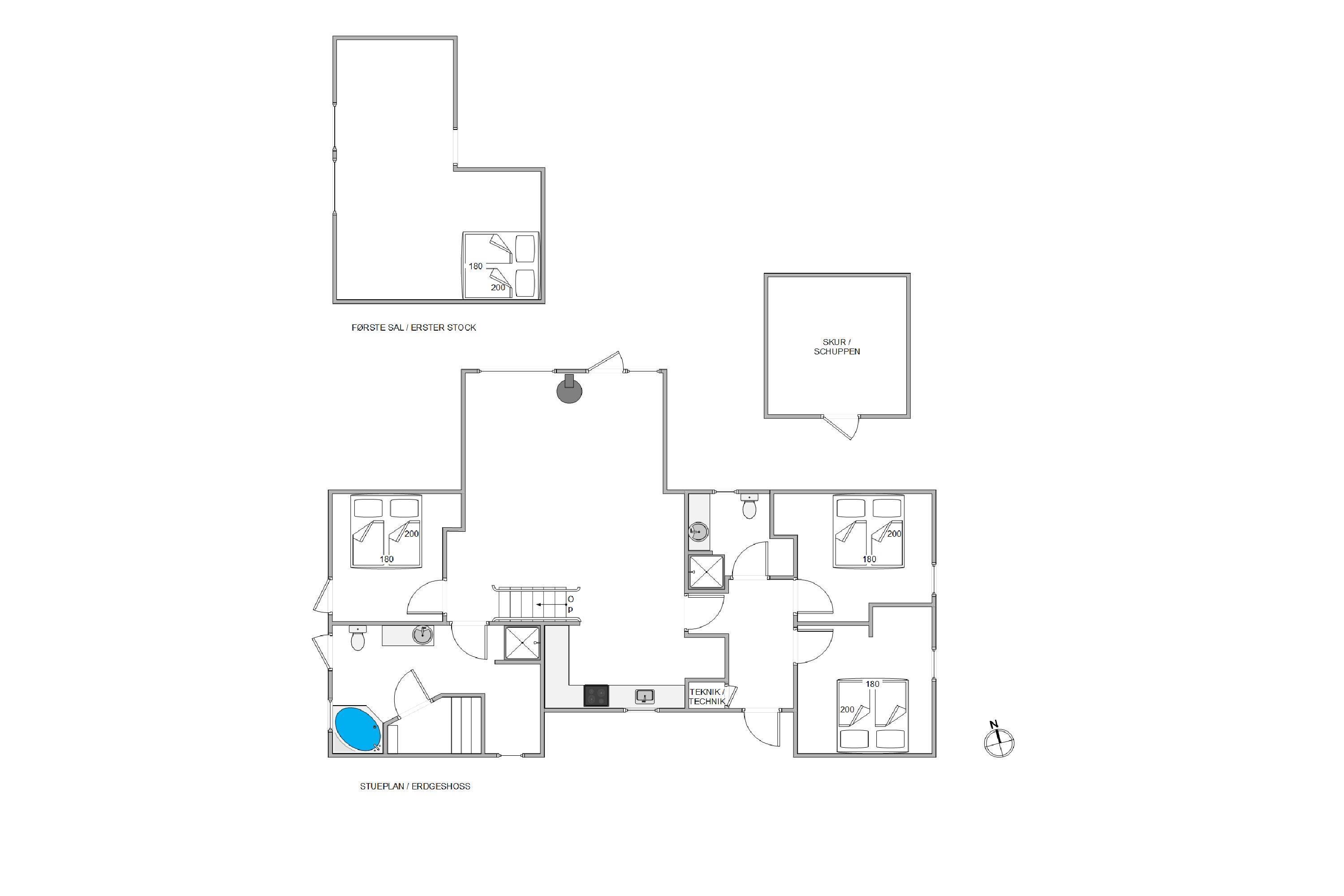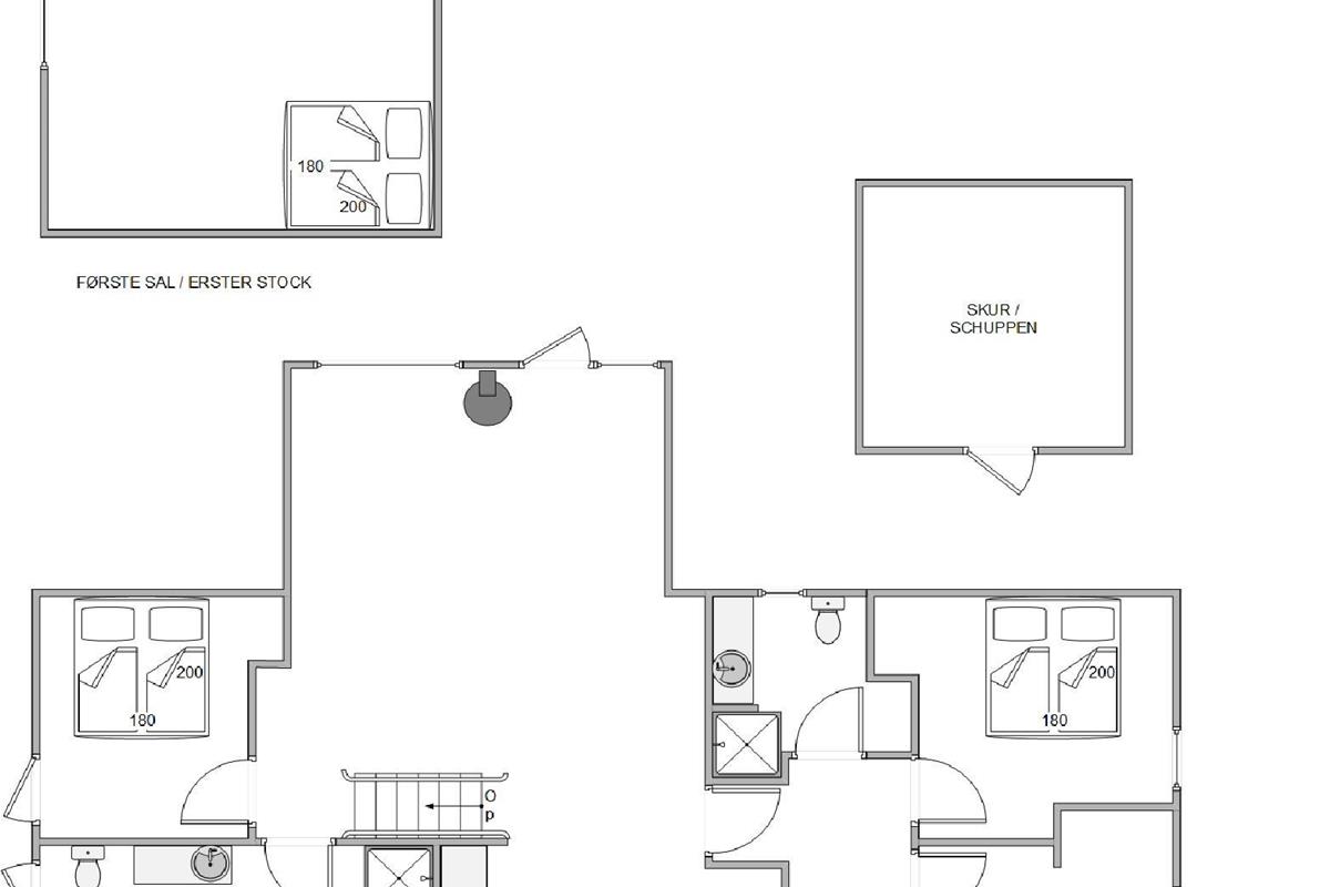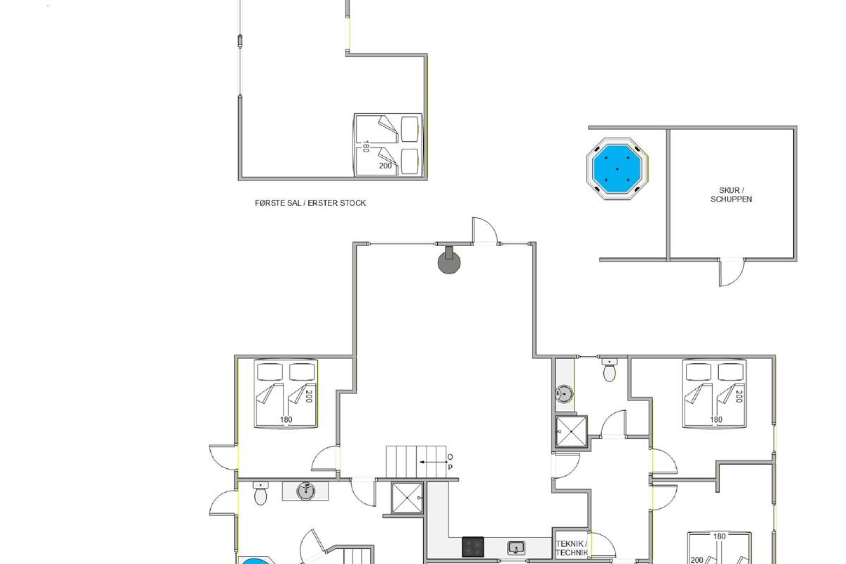 The holiday home has three ground-floor bedrooms, each with a double bed. The remaining two beds are located in a sleeping loft that younger guests will surely love. Additionally, the holiday home features two bathrooms, both equipped with underfloor heating.