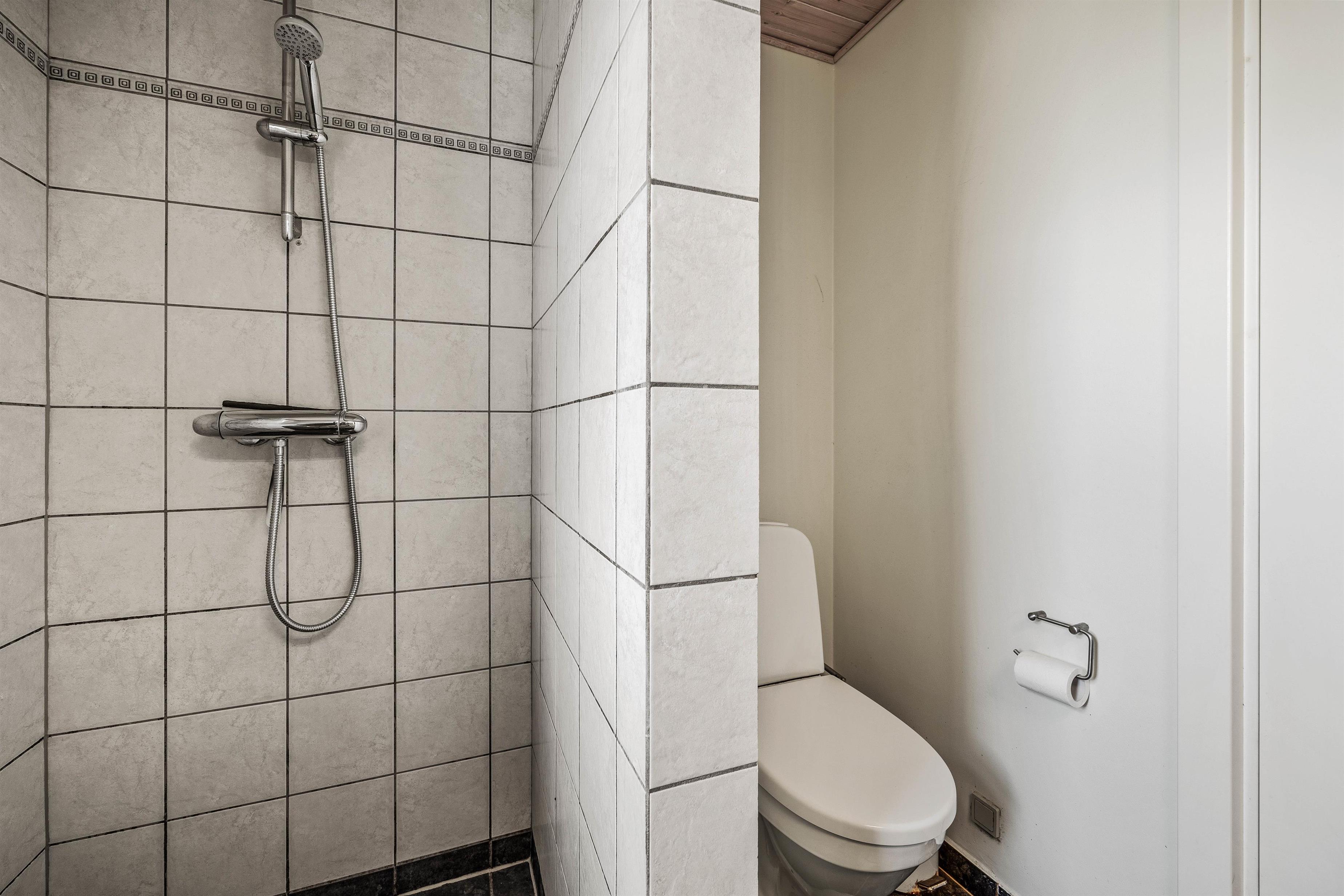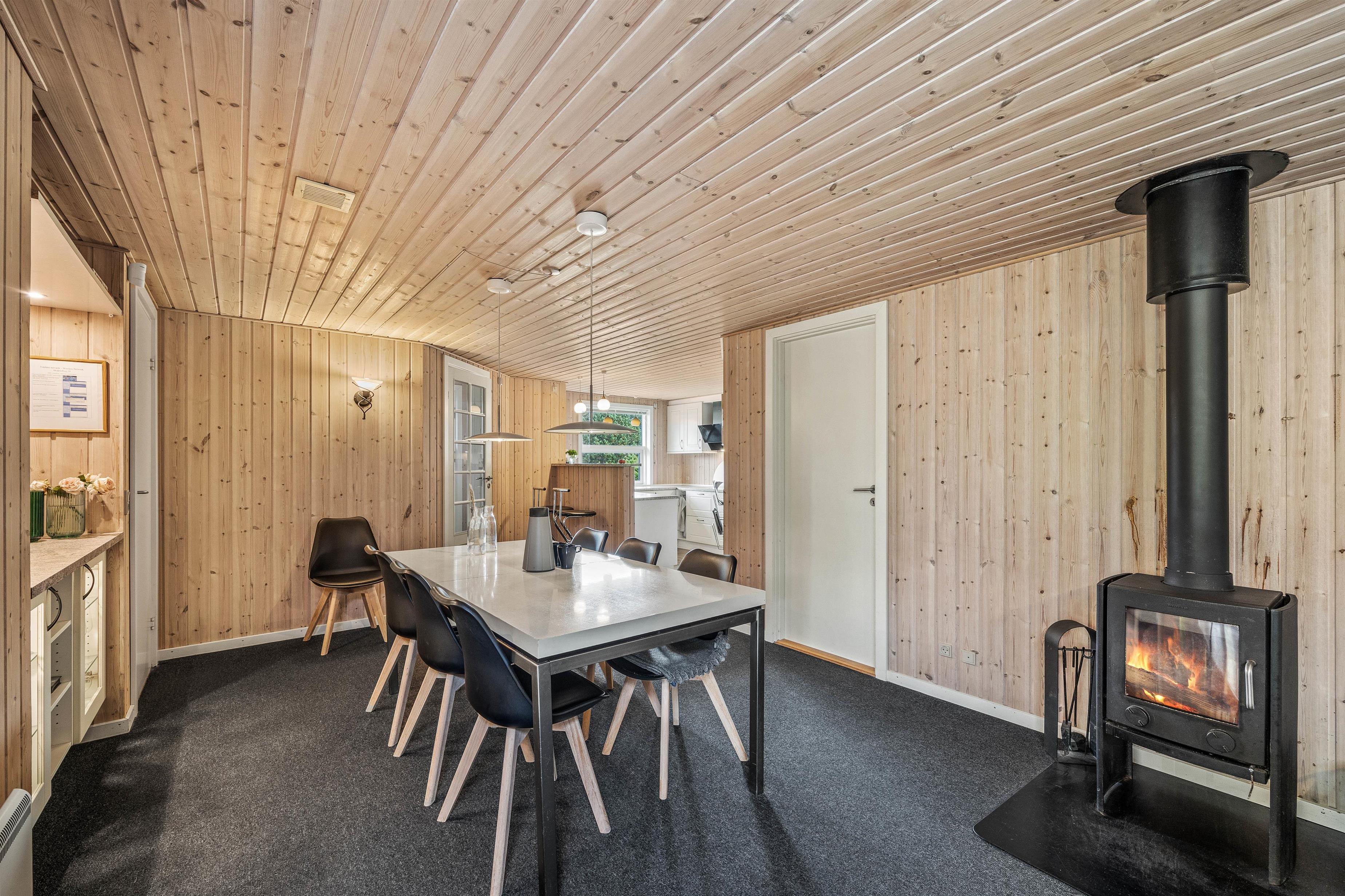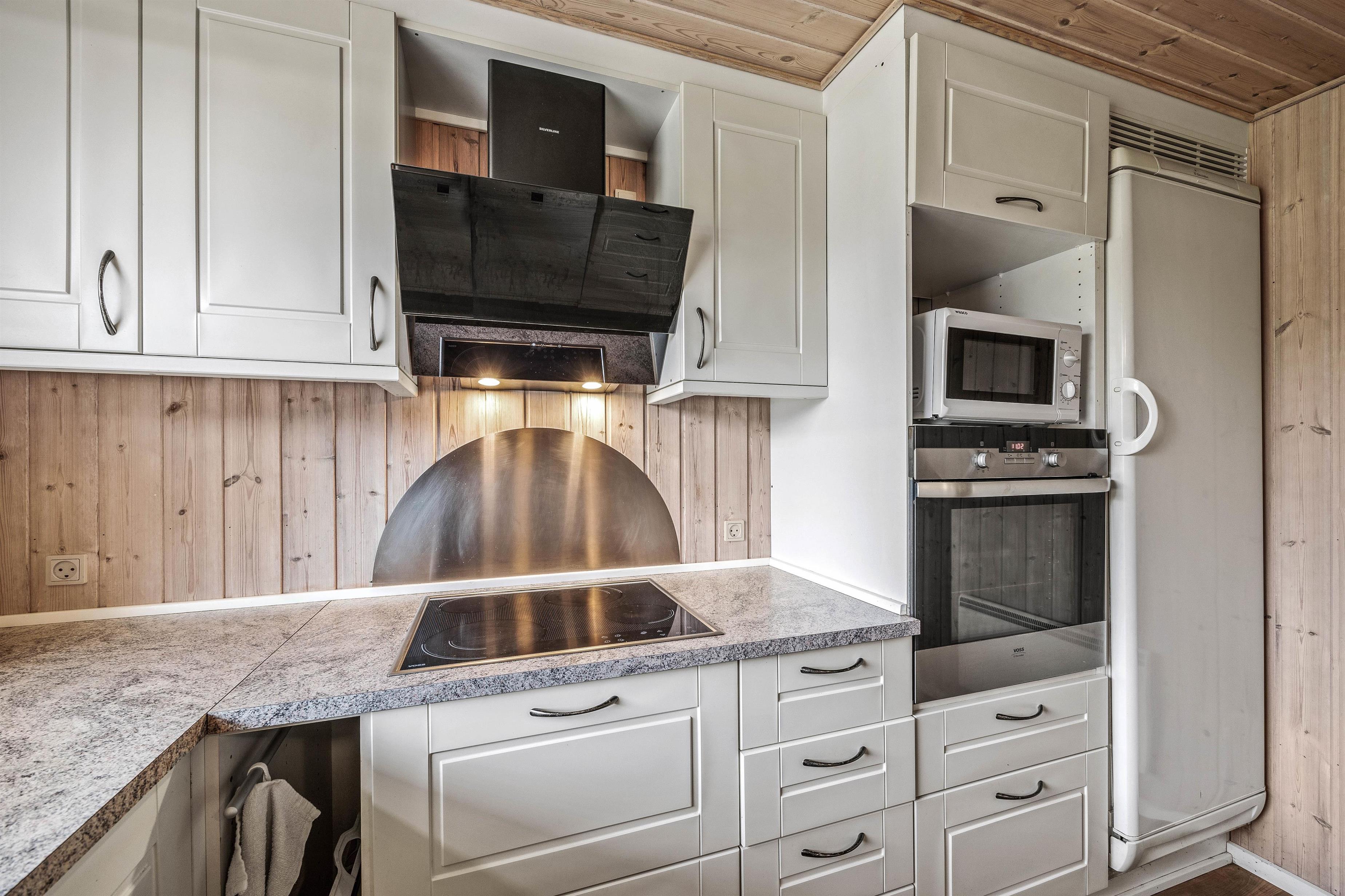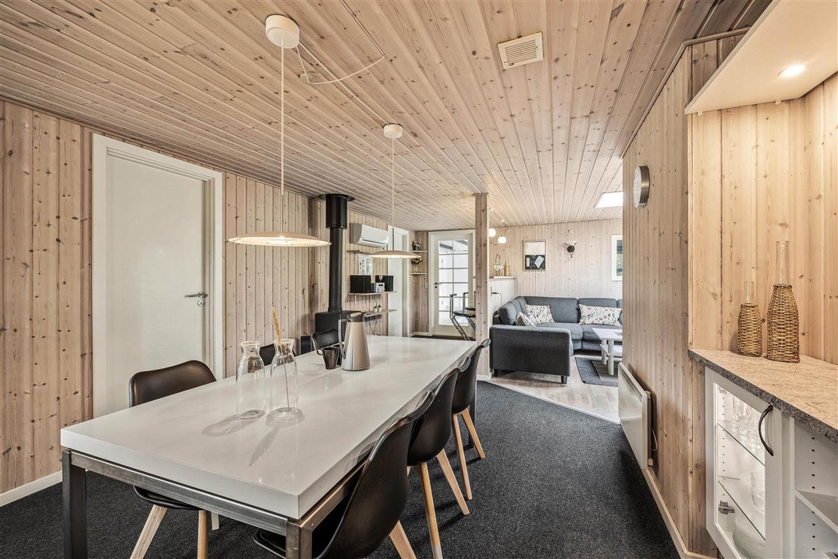 The living area exudes a cosy atmosphere. The wood-burning stove provides welcome warmth and a comfortable ambiance on cooler evenings. The beautiful white kitchen, featuring an induction hob and oven, is modernly equipped and opens onto the living space. Two bar stools at the kitchen counter make for sociable cooking evenings. The kitchen includes a dishwasher, allowing more time for relaxation after meals. Additional comfort features include underfloor heating in the bathroom and an efficient air-to-water heat pump.