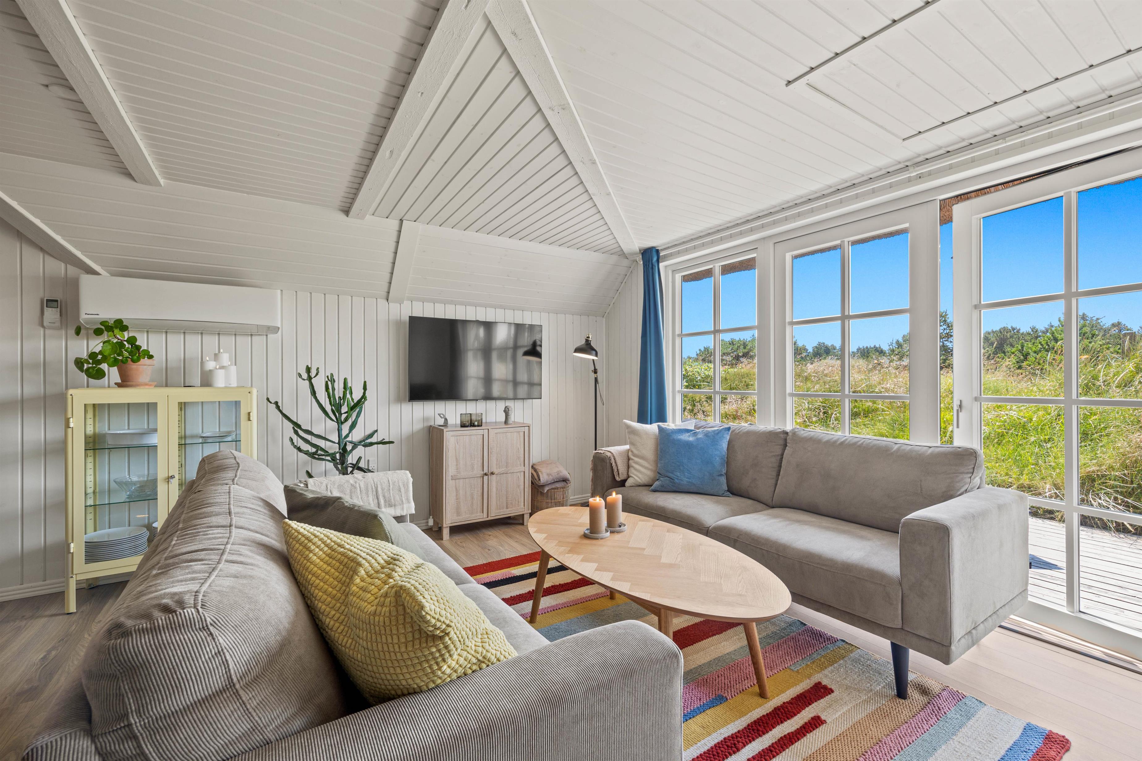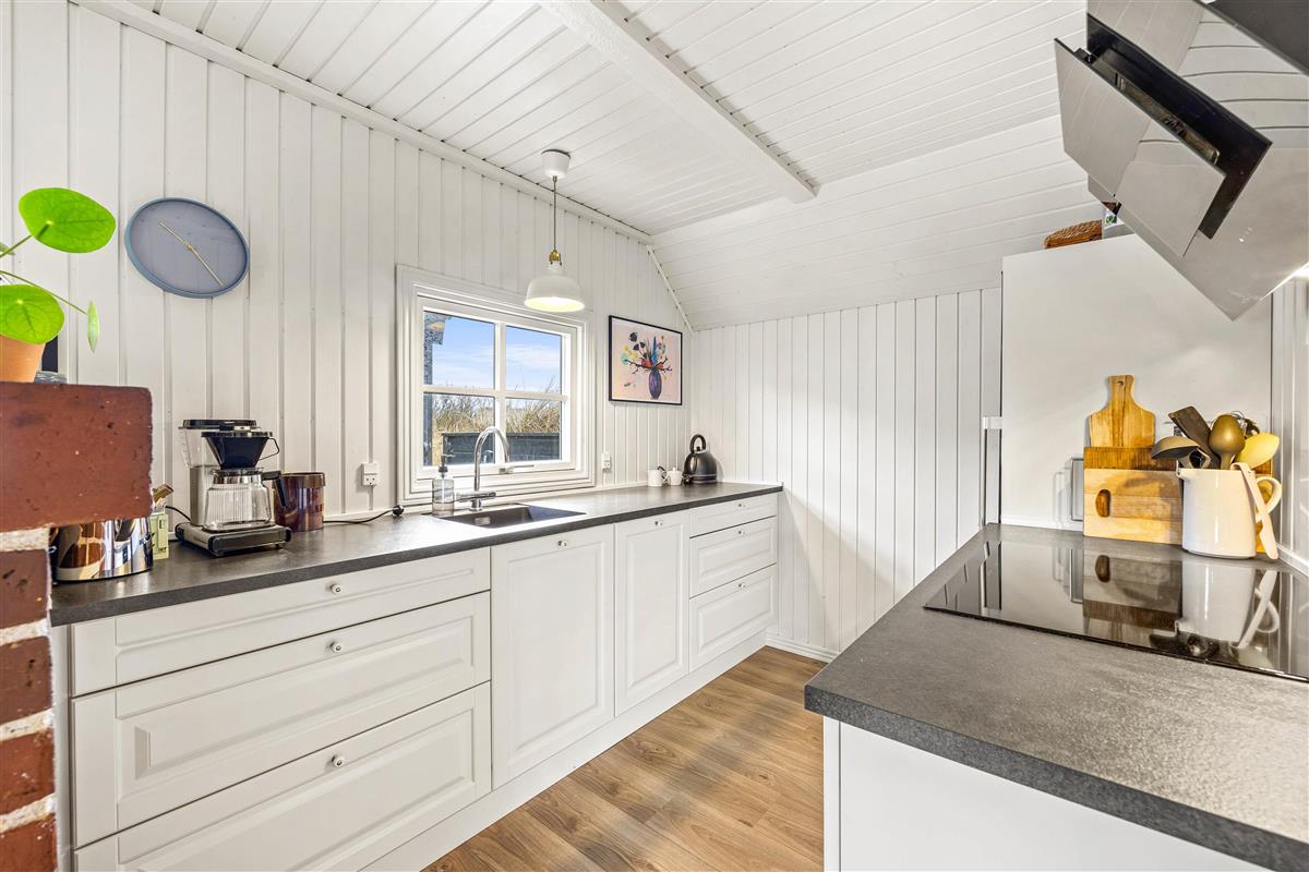 The heart of the house is the cosy, characterful living area with floor-to-ceiling windows that not only flood the space with light but also offer beautiful views of nature. Every corner has been thoughtfully utilised, with various snug spots in the living area where you can put your feet up and unwind. A Danish holiday wouldn't be complete without a crackling fire in the wood-burning stove. The kitchen features modern appliances and is separated from the living area by a counter built from vintage bricks.