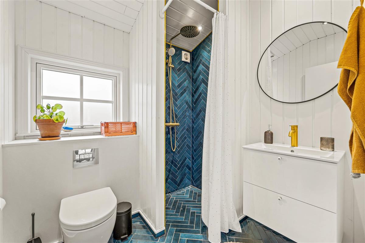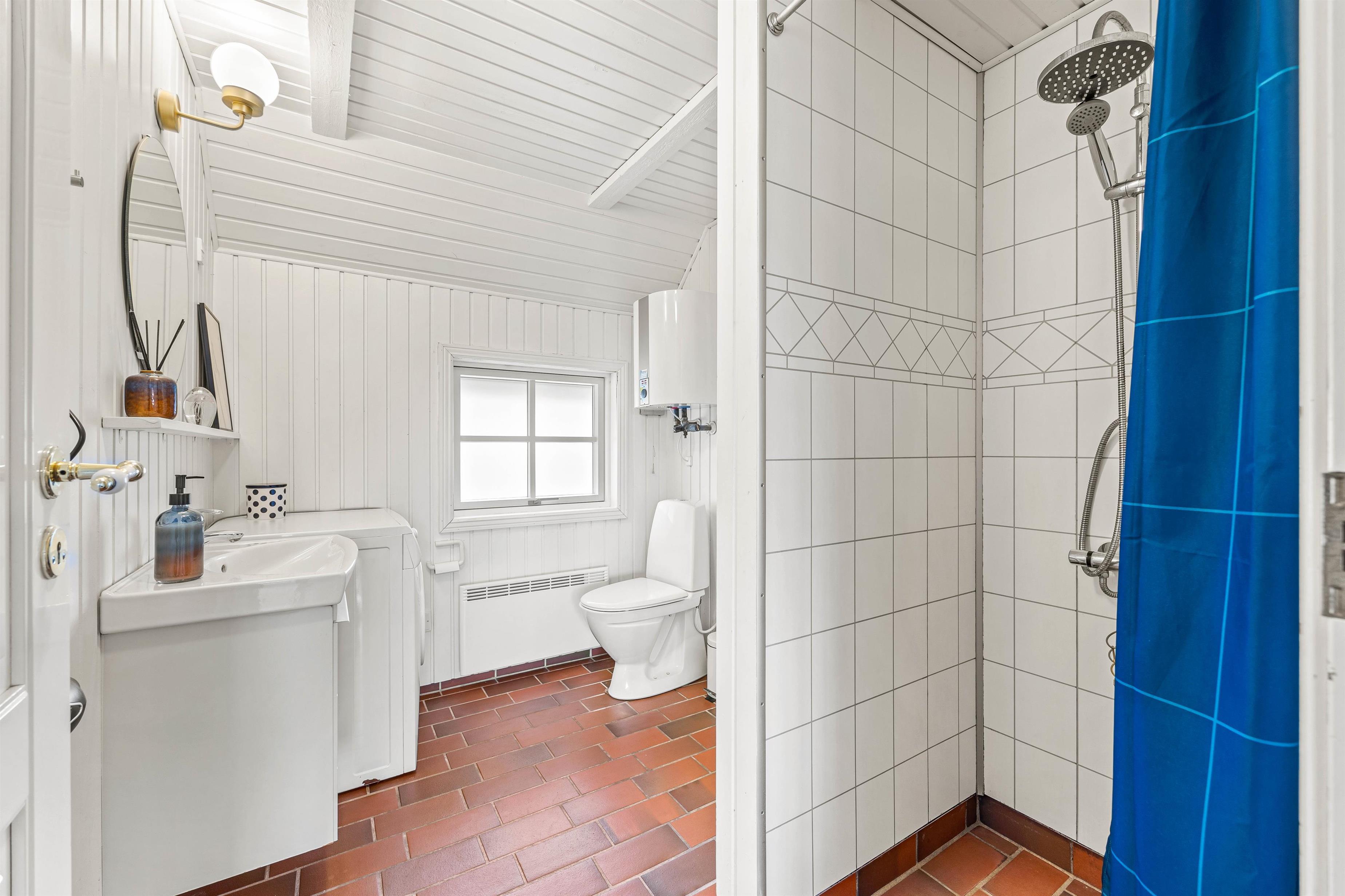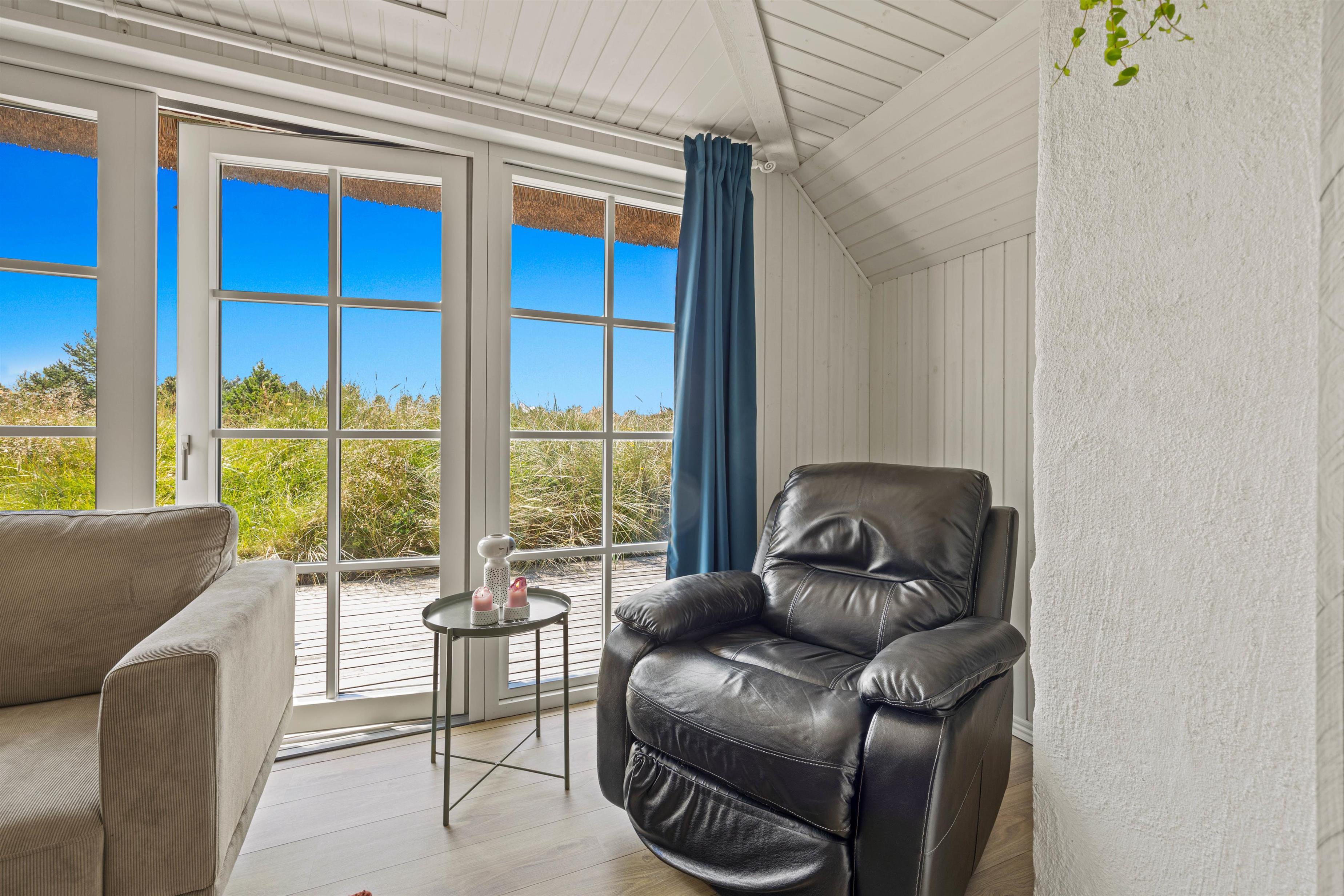 Upon entering this idyllic thatched house at Svinget 28, you'll be welcomed by an inviting and cosy atmosphere that instantly feels like home. White-painted wood panelling, comfortable sofas and armchairs perfect for snuggling, and a country-style kitchen create an authentic Scandinavian feel. The entrance area features a convenient bench for removing wellington boots and shoes.