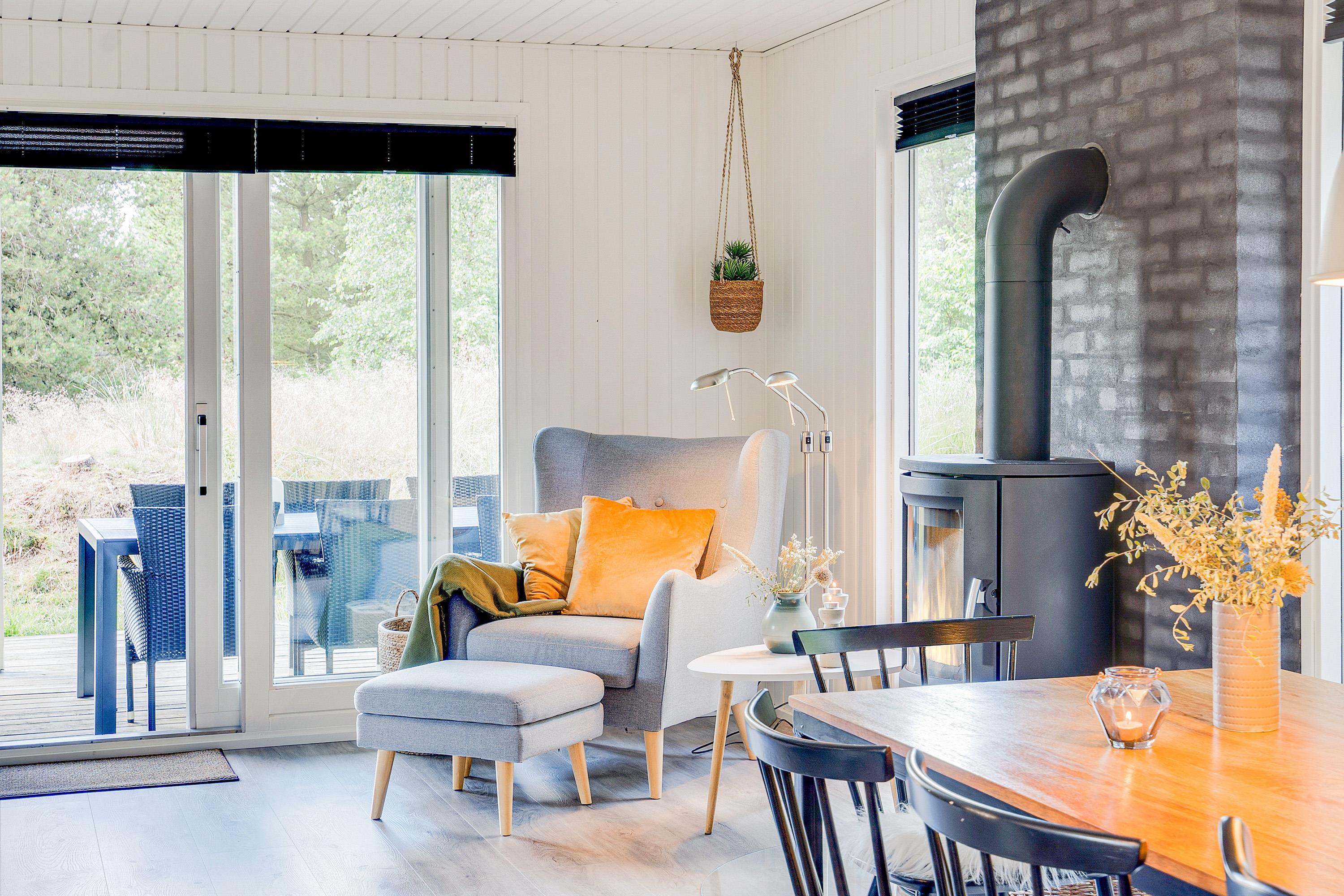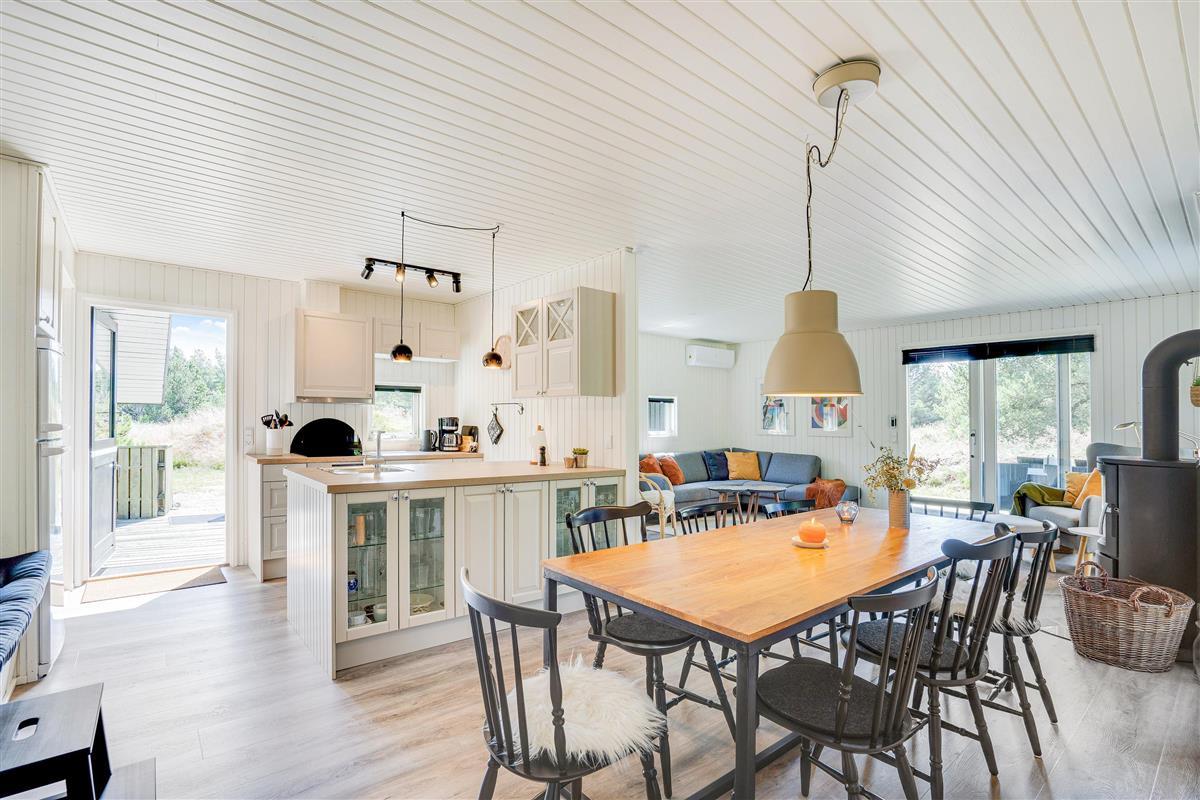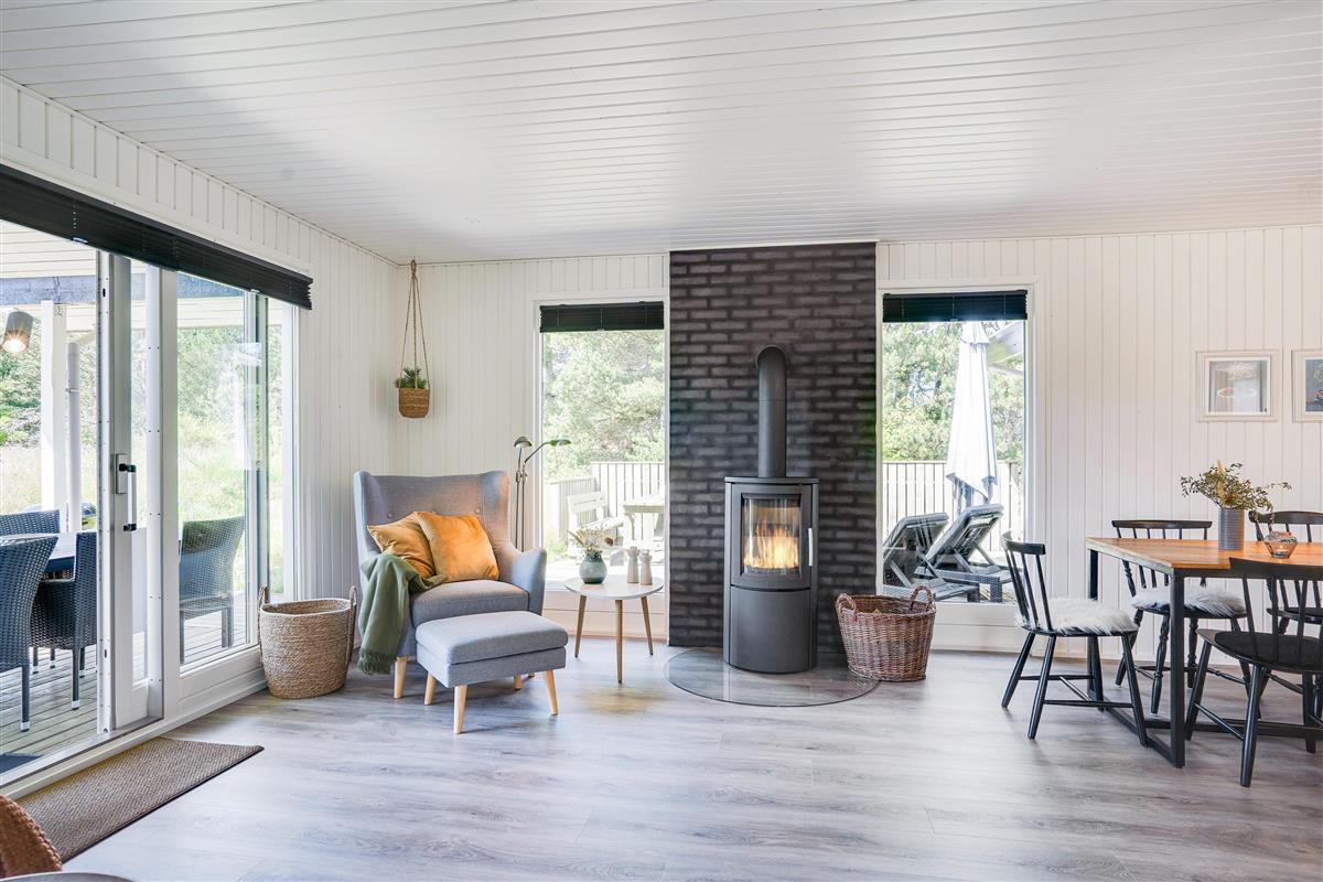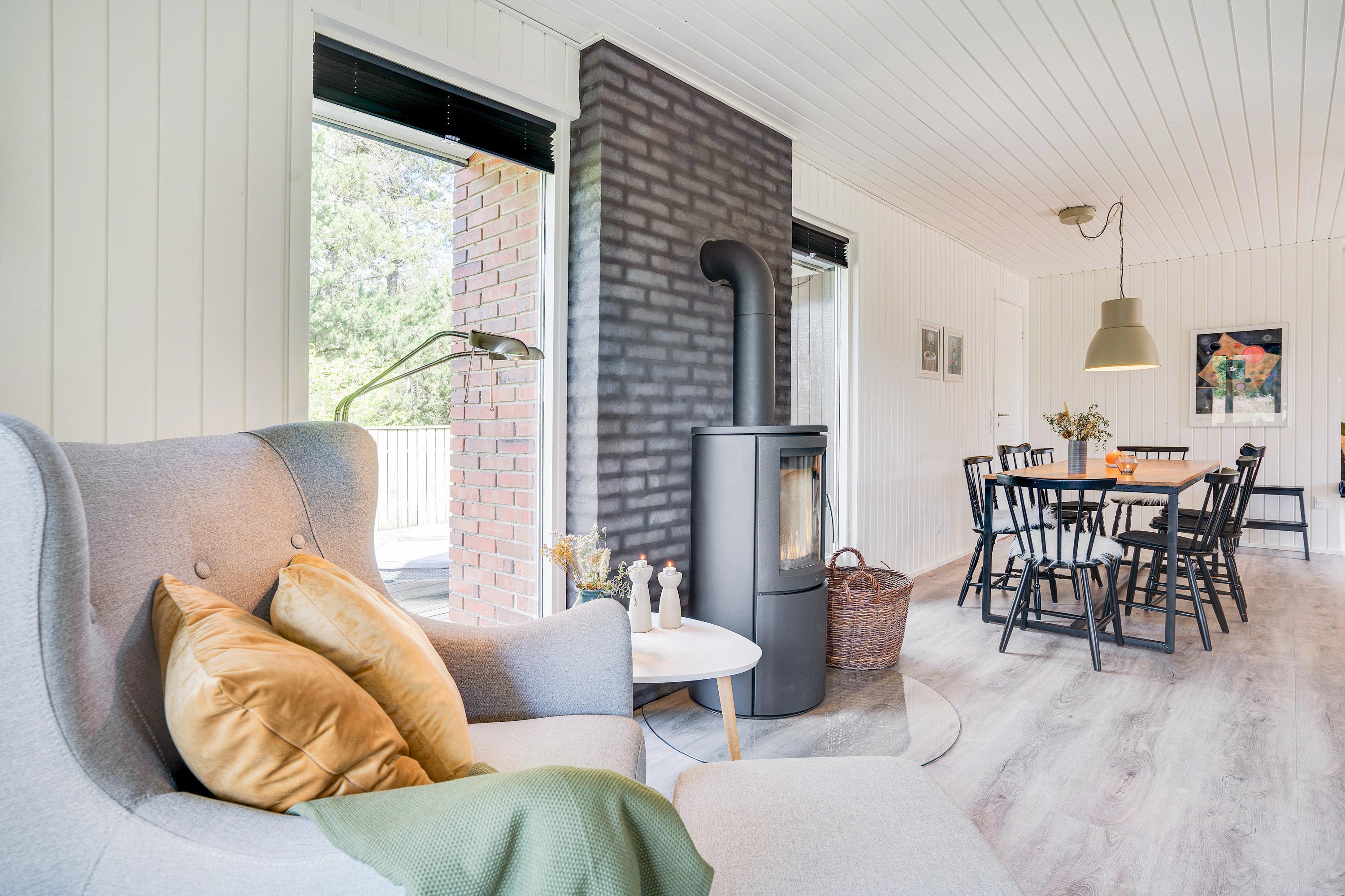 The cosy living room, with its open-plan kitchen and integrated dining area, features an important detail - a wood-burning stove. In the evening, simply put your feet up, curl up in an armchair and watch the flames dance. Sometimes that's all you need!