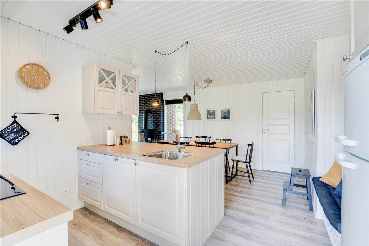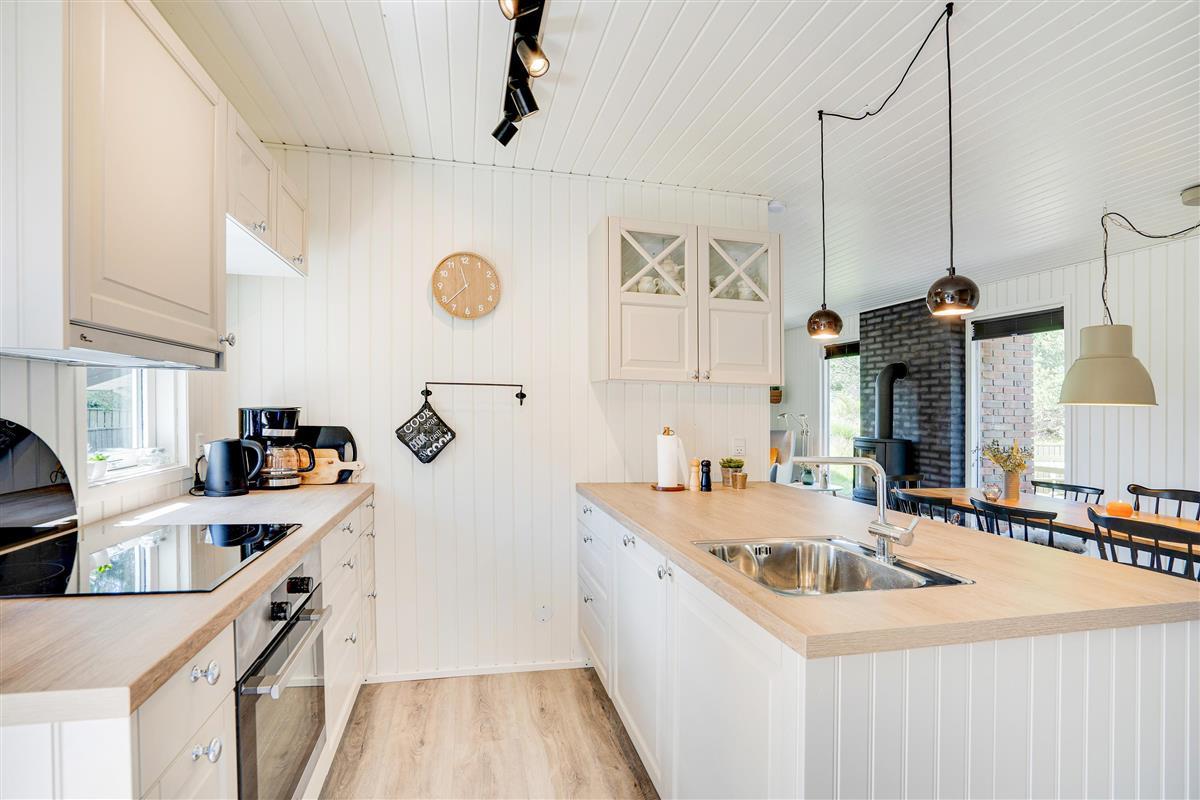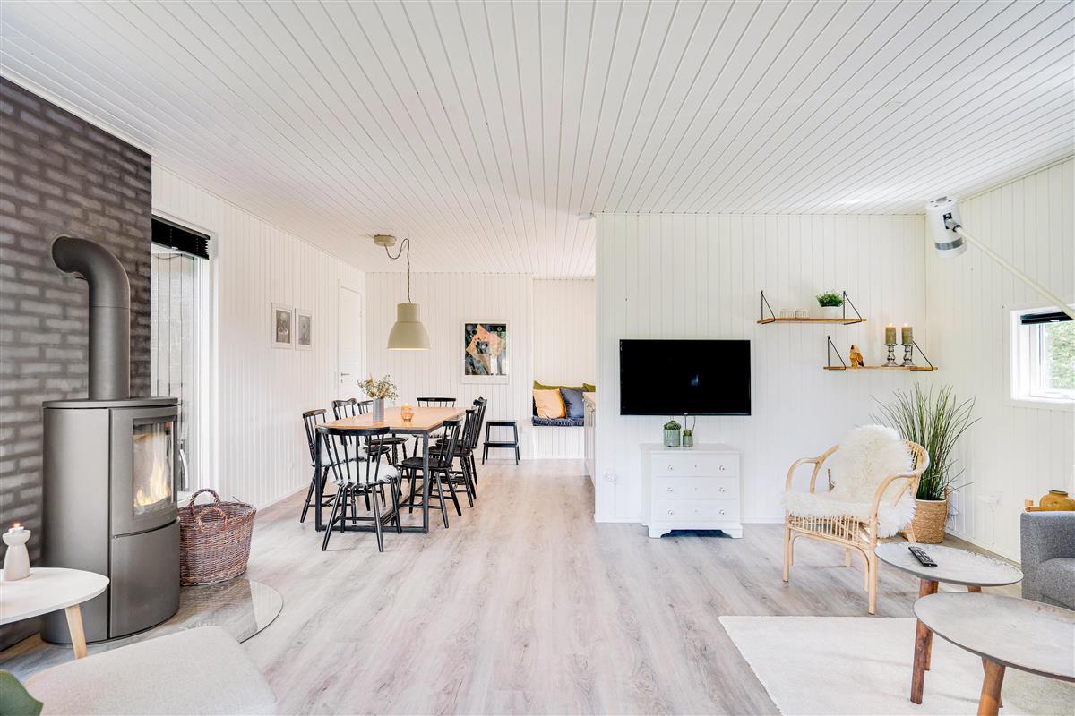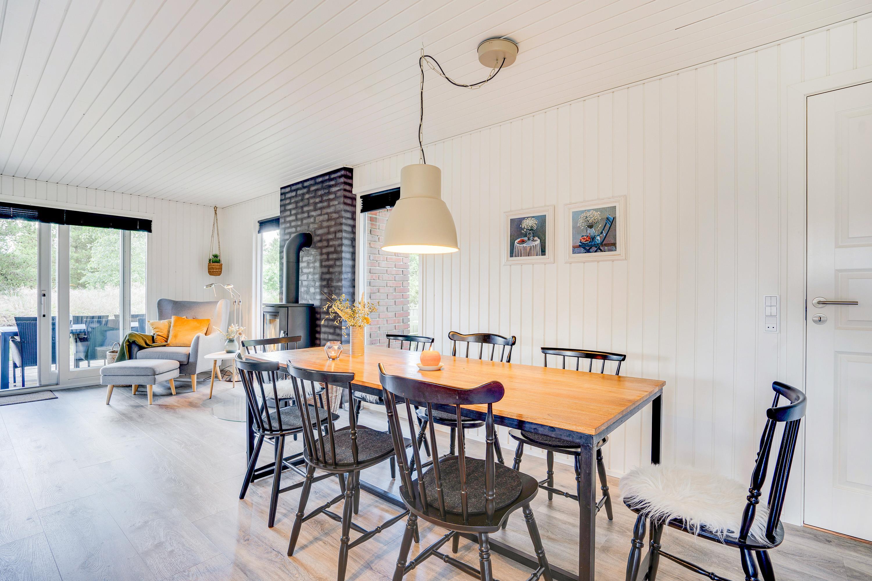 The cosy living room, with its open-plan kitchen and integrated dining area, features an important detail - a wood-burning stove. In the evening, simply put your feet up, curl up in an armchair and watch the flames dance. Sometimes that's all you need!