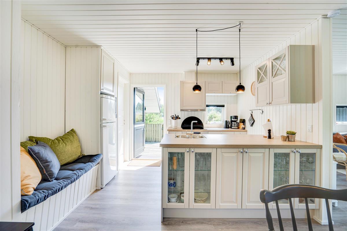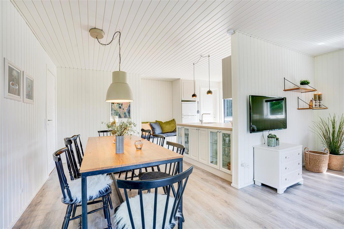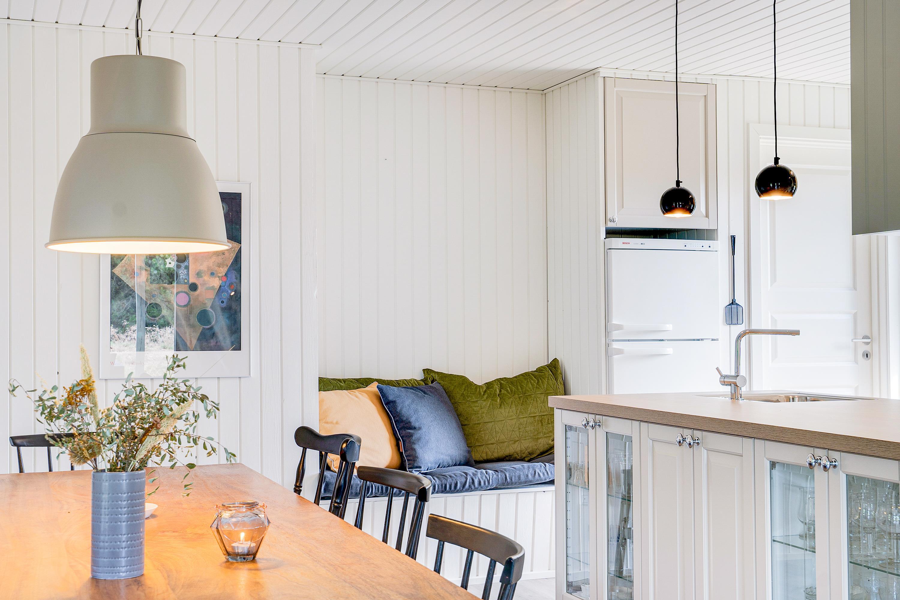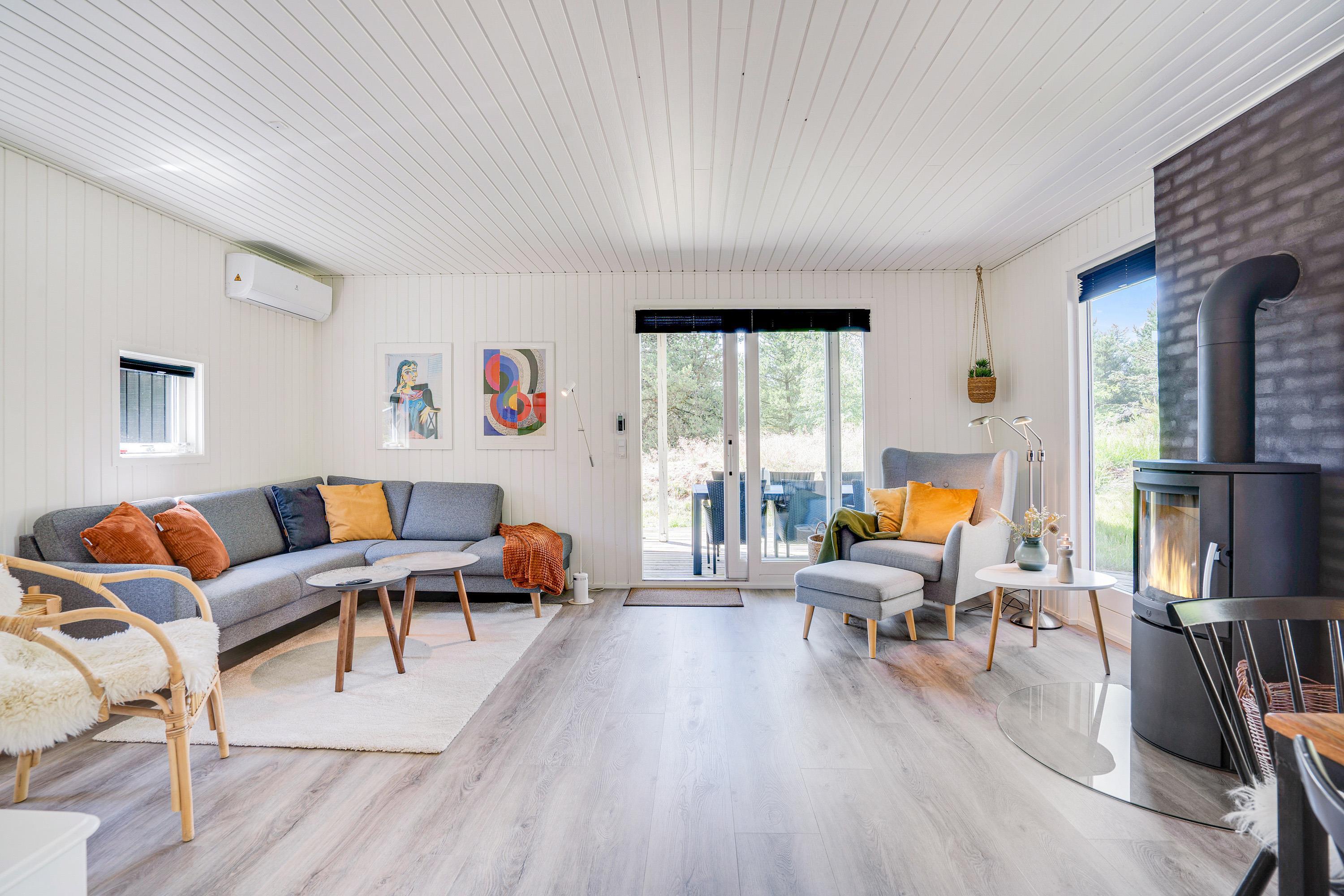 The cosy living room, with its open-plan kitchen and integrated dining area, features an important detail - a wood-burning stove. In the evening, simply put your feet up, curl up in an armchair and watch the flames dance. Sometimes that's all you need!