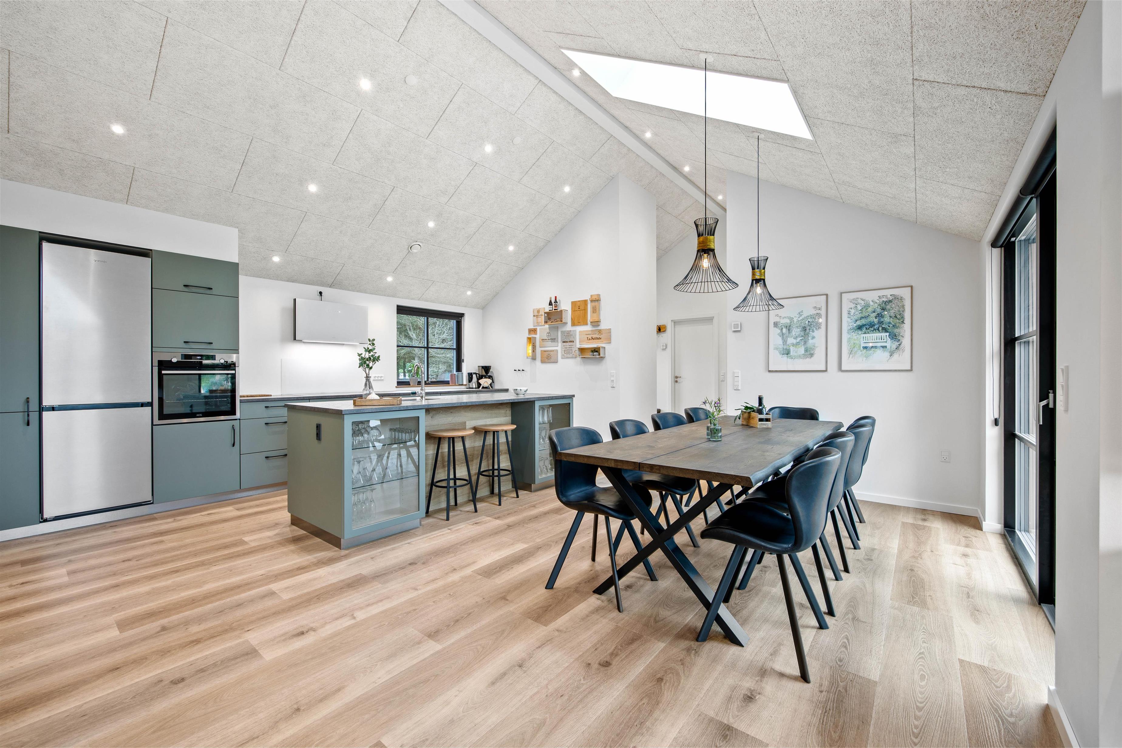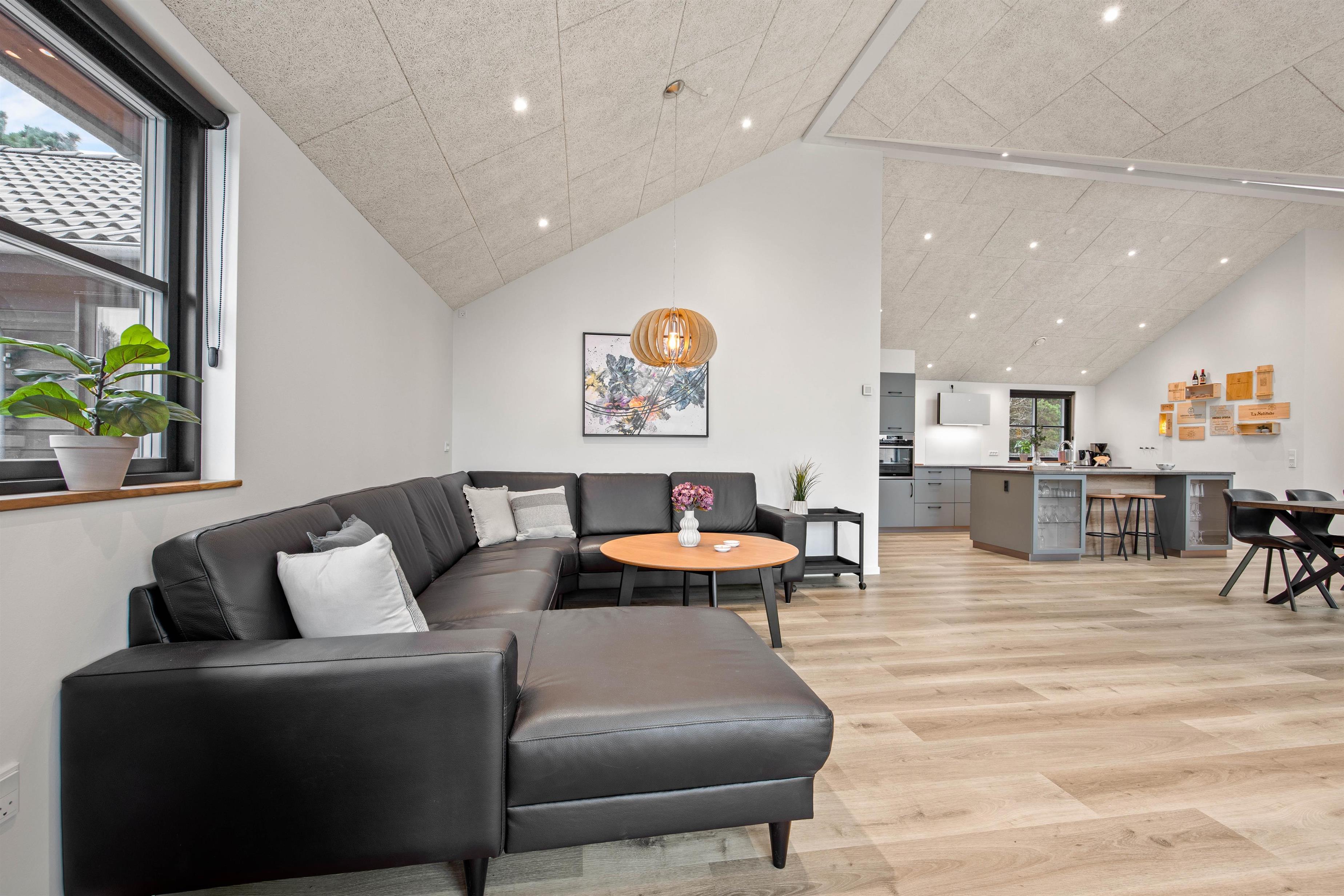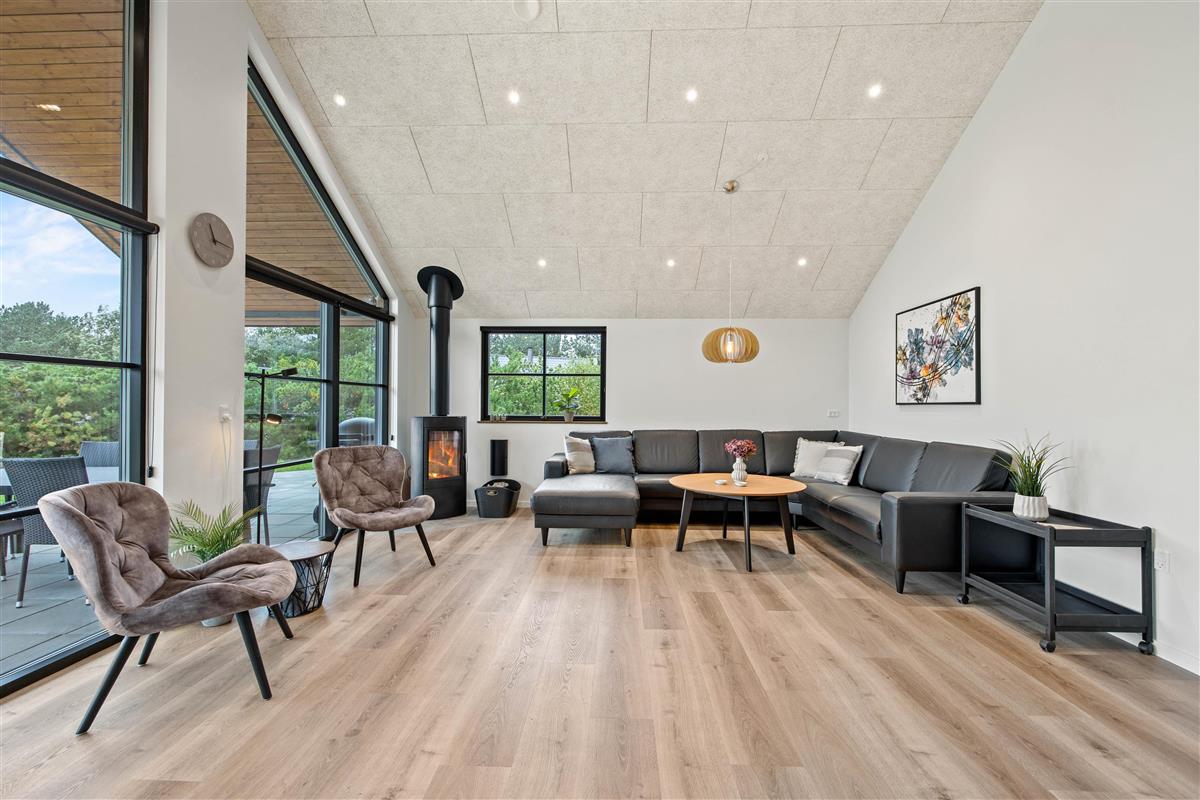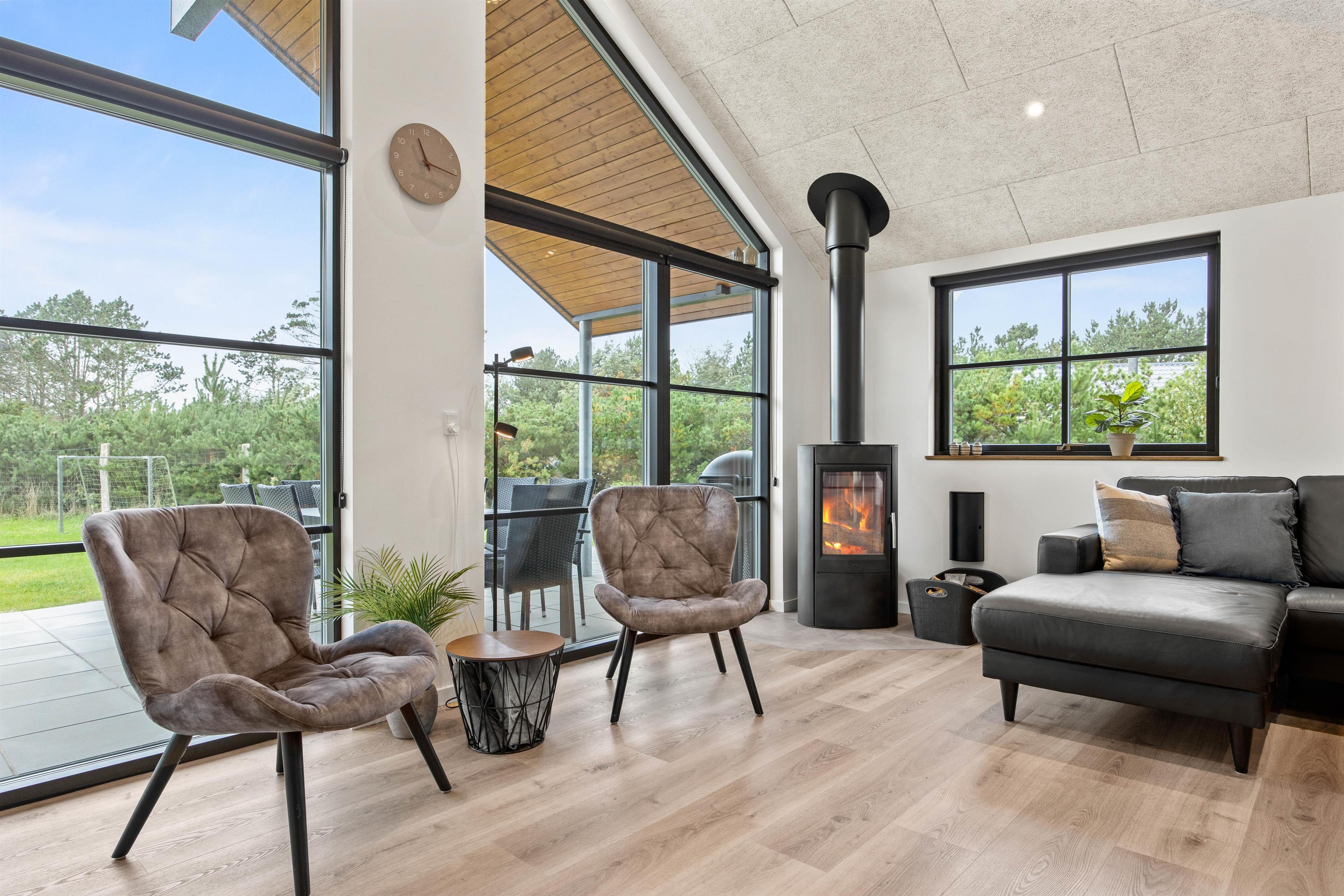 The spacious living area, with its kitchen and long dining table, features floor-to-ceiling windows on all sides, flooding the space with natural light. The modern kitchen makes cooking a pleasure. You can look forward to quality time together here as everything you need is provided. The comfortable corner sofa is perfect for movie nights, or simply enjoying the wood-burning stove and the views.