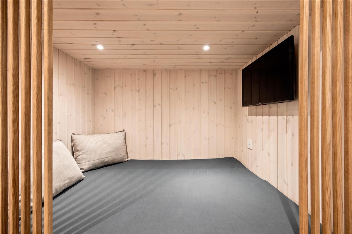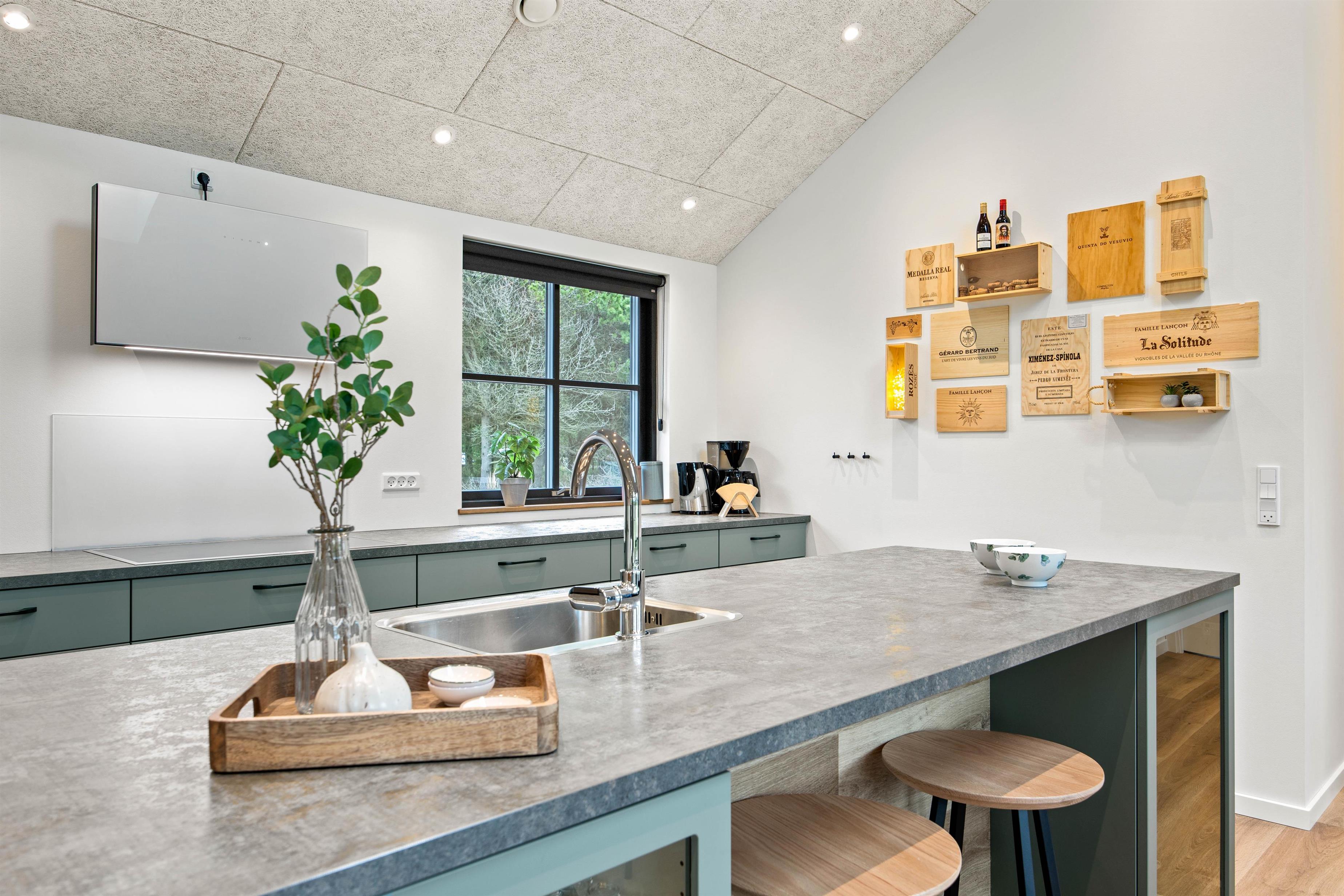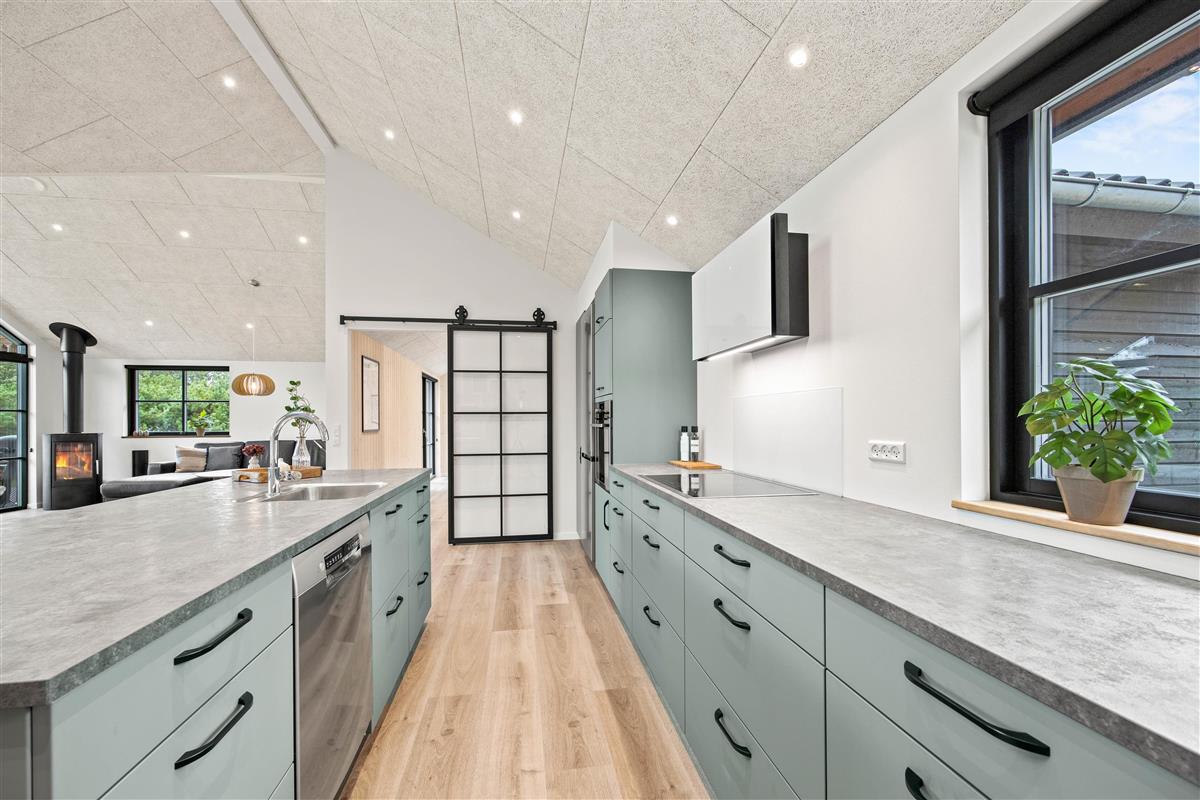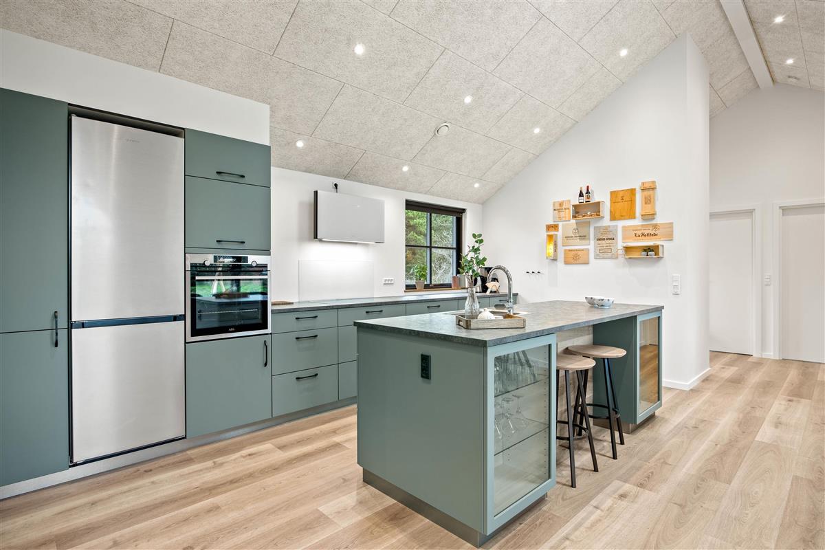 The spacious living area, with its kitchen and long dining table, features floor-to-ceiling windows on all sides, flooding the space with natural light. The modern kitchen makes cooking a pleasure. You can look forward to quality time together here as everything you need is provided. The comfortable corner sofa is perfect for movie nights, or simply enjoying the wood-burning stove and the views.