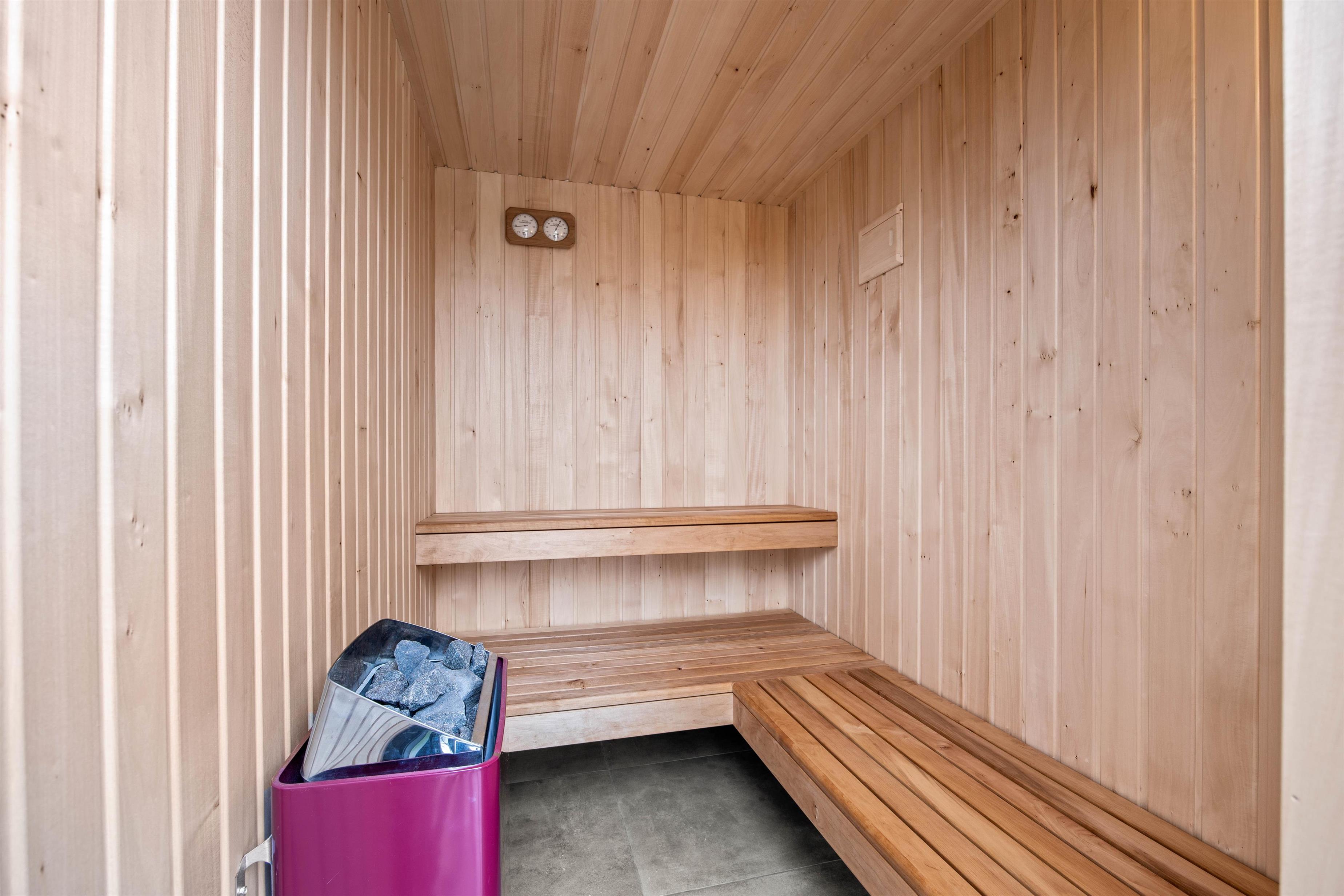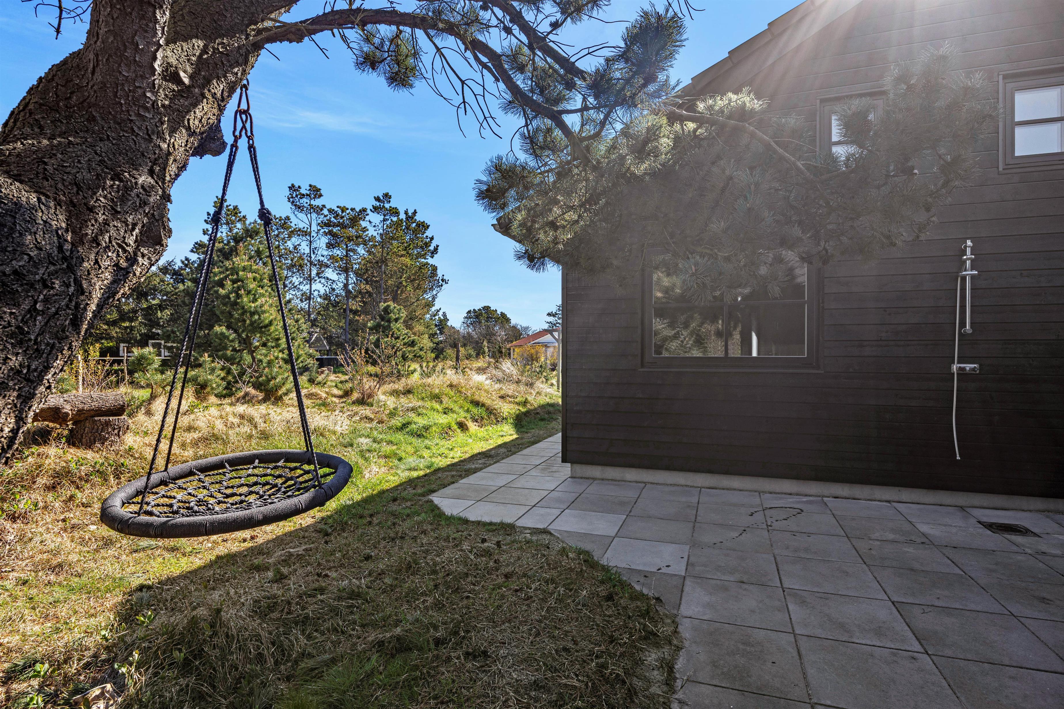 From the living area, step onto the large terrace where you can relax in comfortable garden chairs and sun loungers while children enjoy the swing and sandpit. The outdoor sauna and hot tub are particular highlights. After a sauna session, cool off under the outdoor shower before relaxing in the warm, bubbling water. It's especially magical during evening hours under the starlit sky. The outdoor showers are available from 1 April to 31 October.