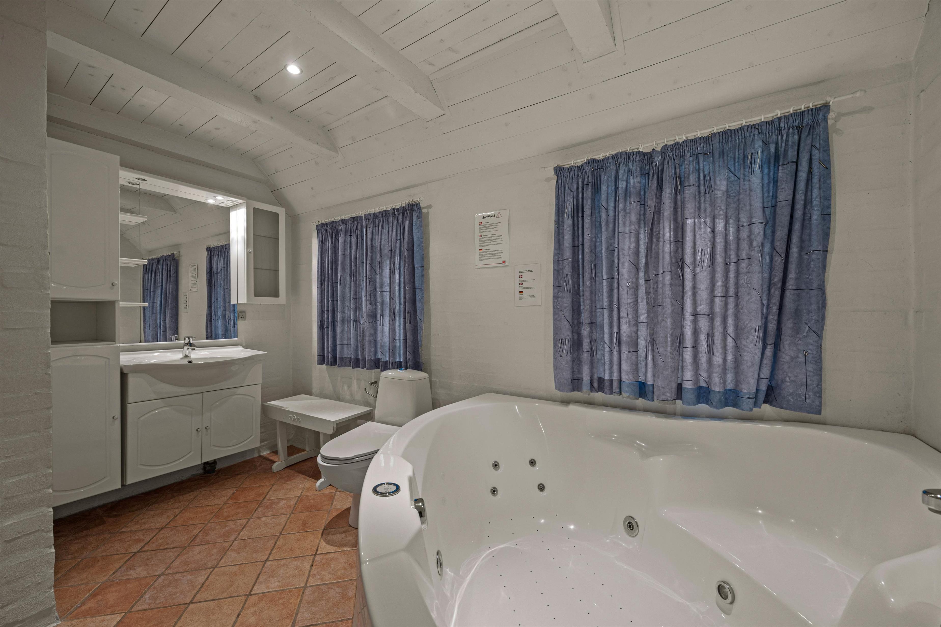One of the two bathrooms is equipped with a child-height sink, which younger children will enjoy. The underfloor heating in the bathrooms ensures a comfortable temperature for your feet, and a special treat for young and old alike is the house's hot tub, where you can warm up on cooler days.