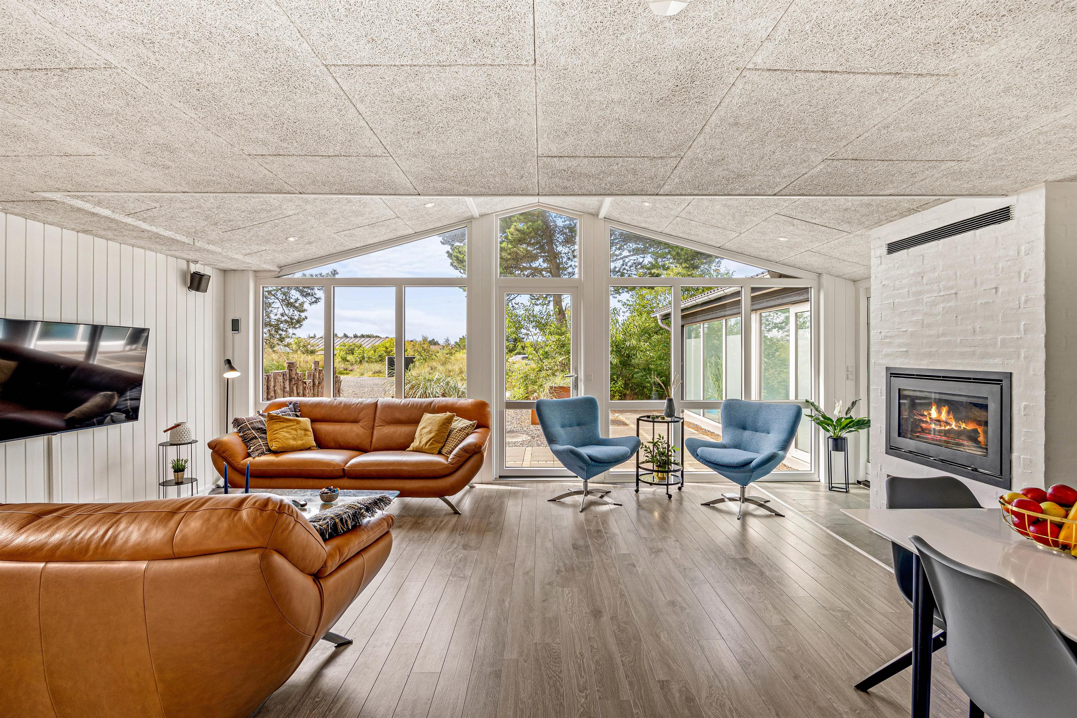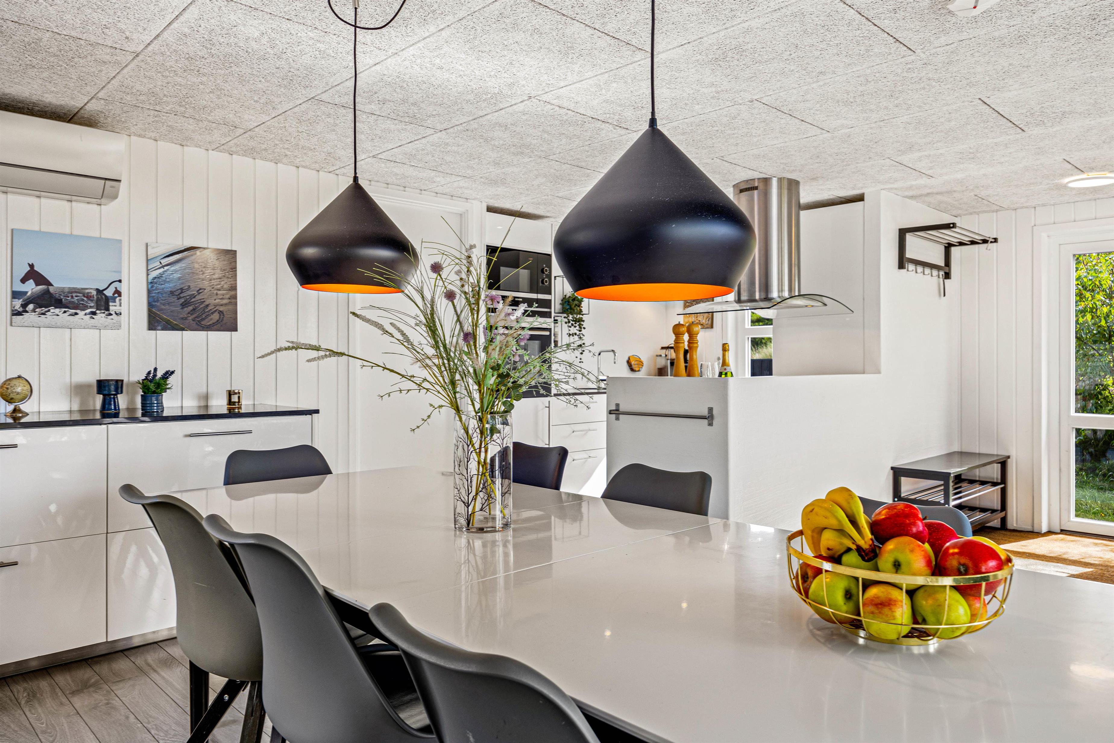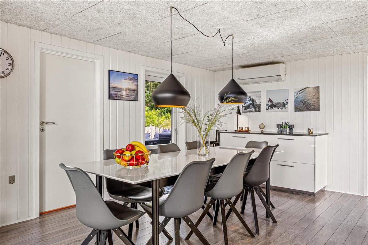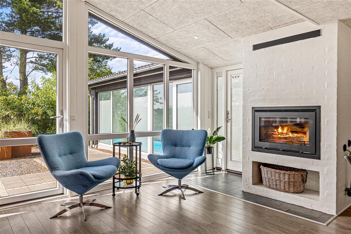 The spacious open-plan living area will undoubtedly become your gathering point for socialising, where you can eat, play games and watch television together. The holiday home features two TVs, one of which is a Smart TV. There's also a wood-burning stove, with the crackling of wood adding extra cosiness to your holiday mood. Both the living area and pool room are equipped with Bluetooth speakers for playing your own playlists.