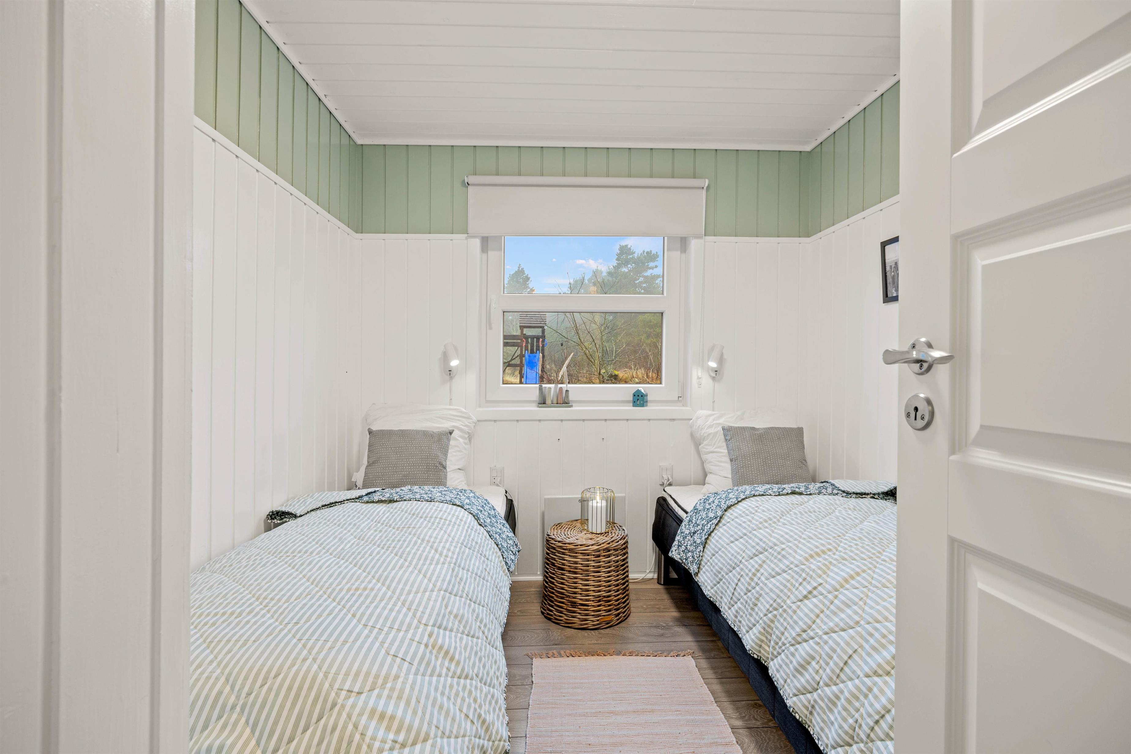 The holiday home has four bedrooms, each sleeping two people. One room features a double bed, while the others each have two single beds. There are two bathrooms, both with underfloor heating, ensuring no cold feet in the morning and no queuing.