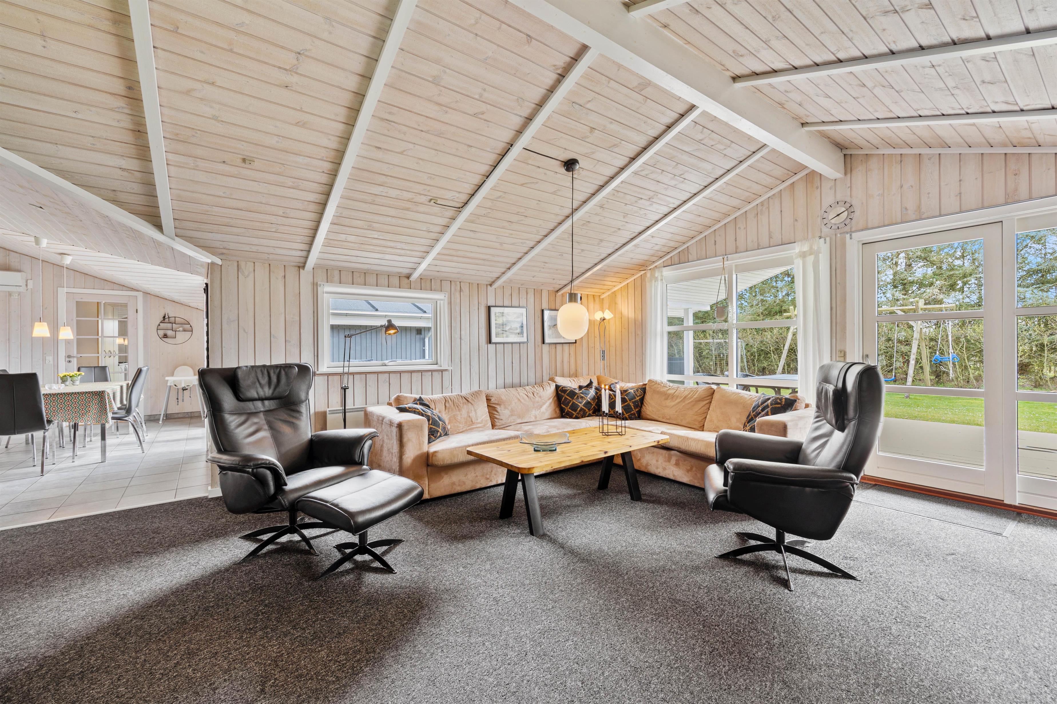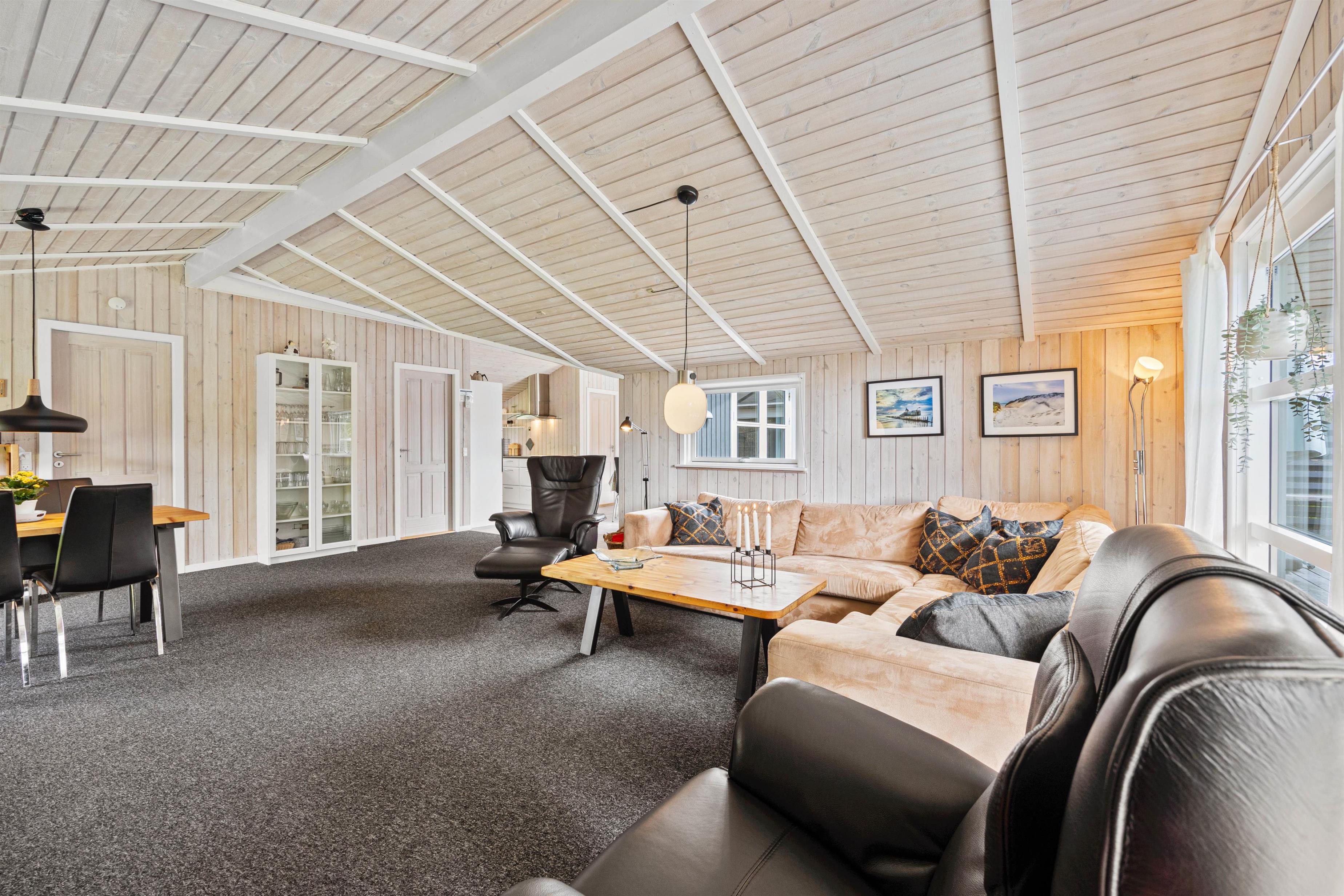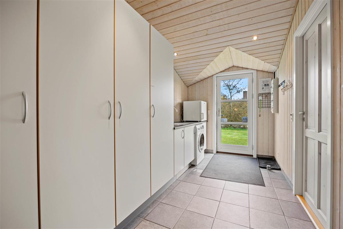 Enter the holiday home through the spacious entrance area, offering plenty of room for your coats and shoes, as well as housing the holiday home's washing machine. Moving forward, you'll find the bright and inviting living area, featuring numerous windows and cosy furnishings in typical Danish style.