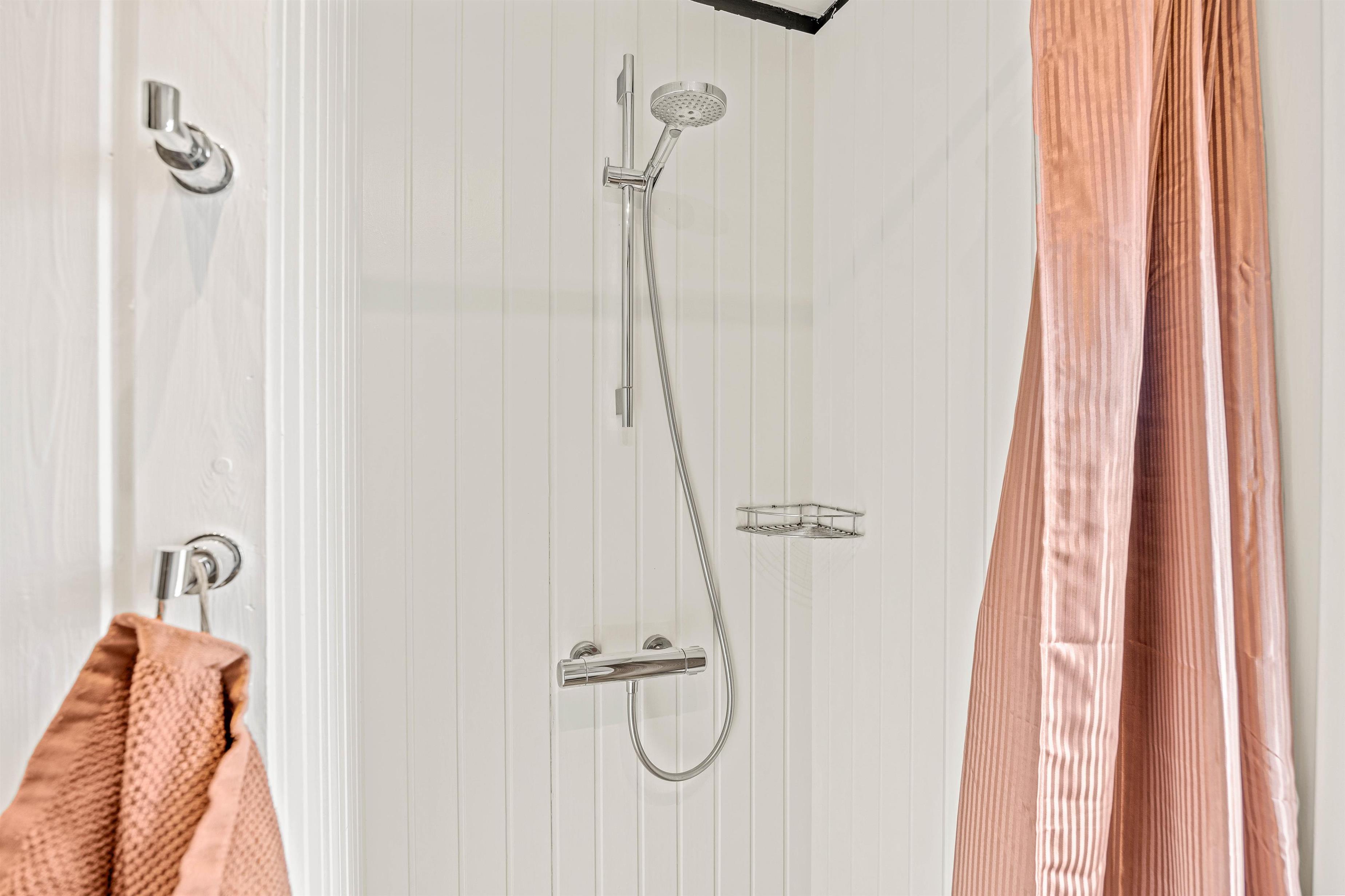 The bathroom features underfloor heating and a shower enclosure, with everything needed for your holiday stay. Through the bathroom, you'll find a separate utility room with washing machine and tumble dryer.