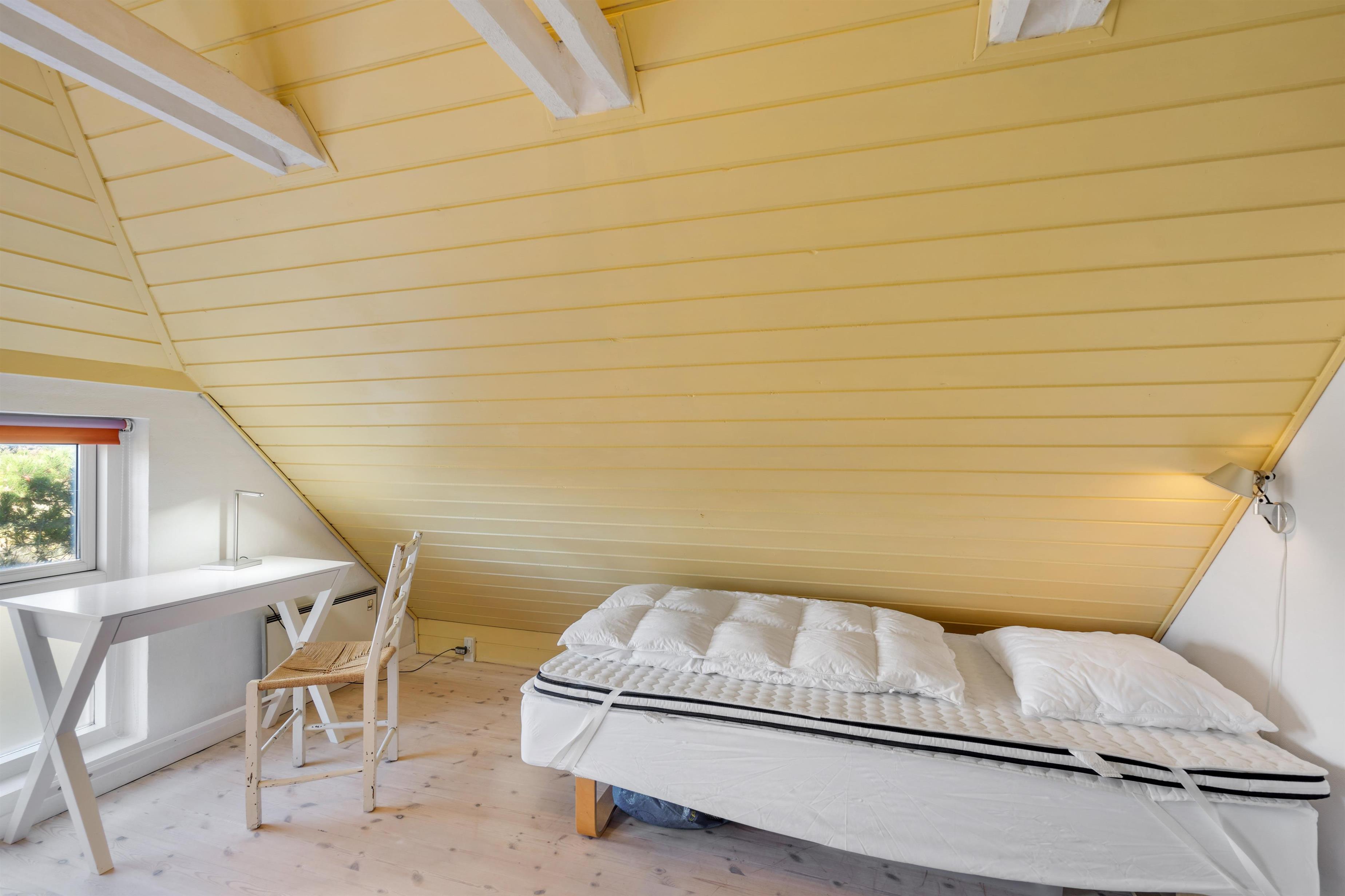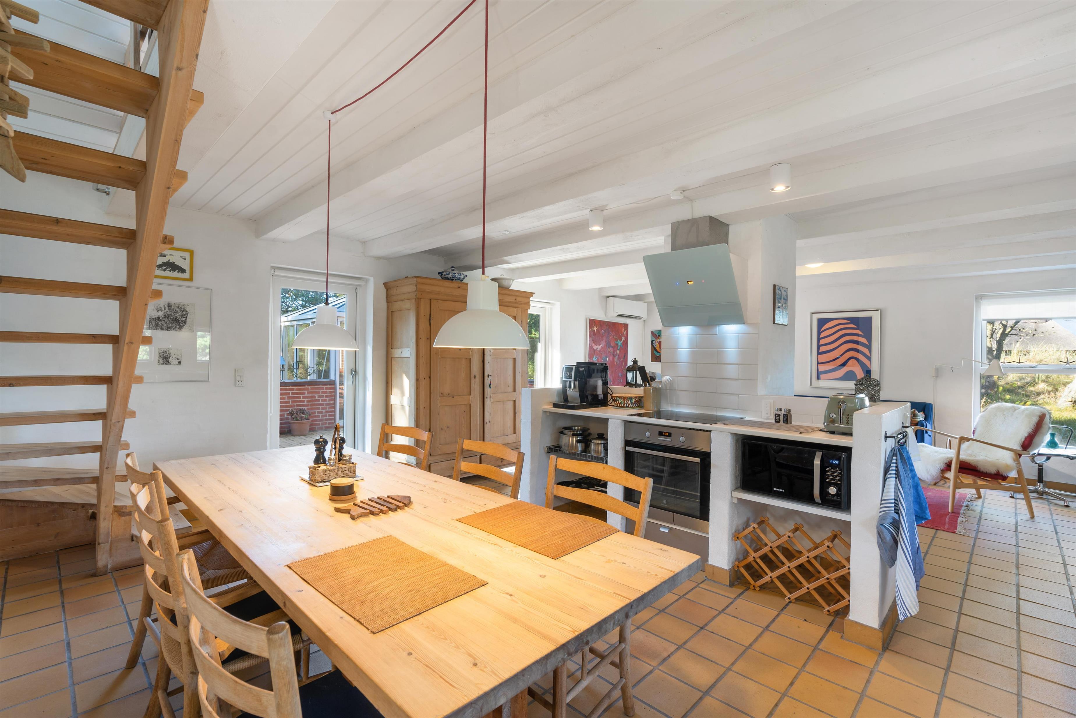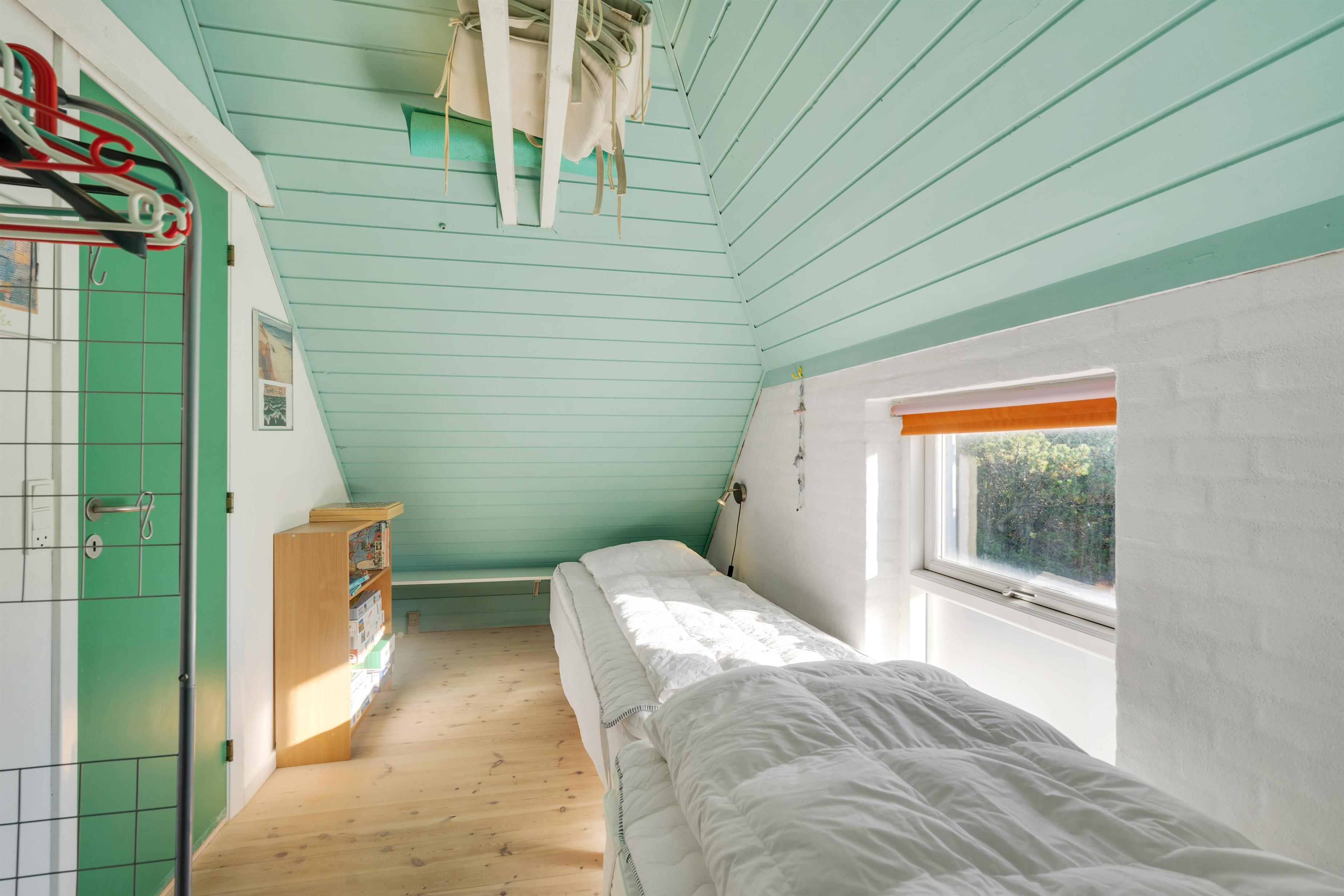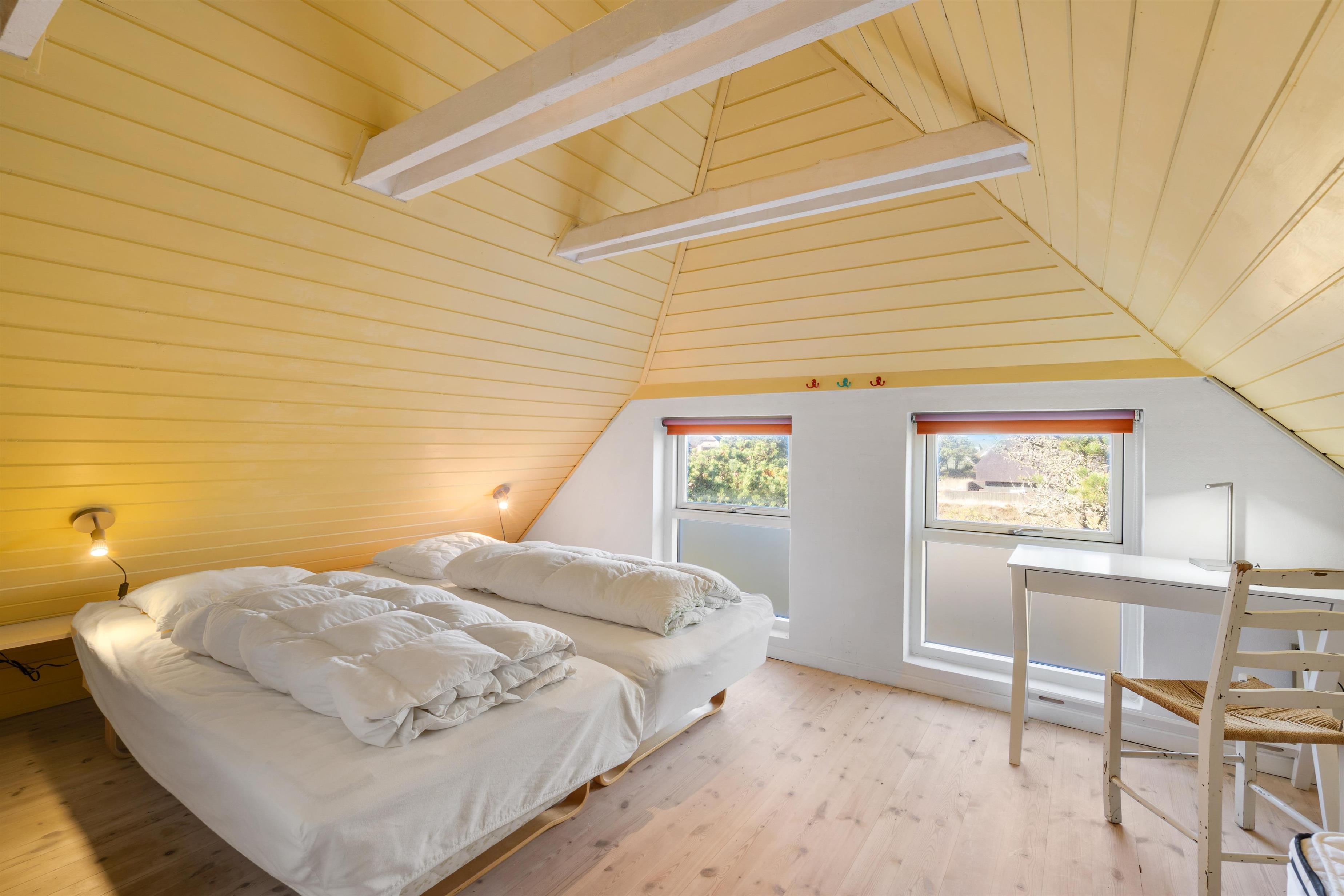 The first floor features two bedrooms: one with a double bed and single bed, the other with two single beds. The sloping ceilings and exposed beams create a particularly cosy atmosphere. You're sure to sleep well, lulled by the gentle beam of the Blåvand lighthouse.