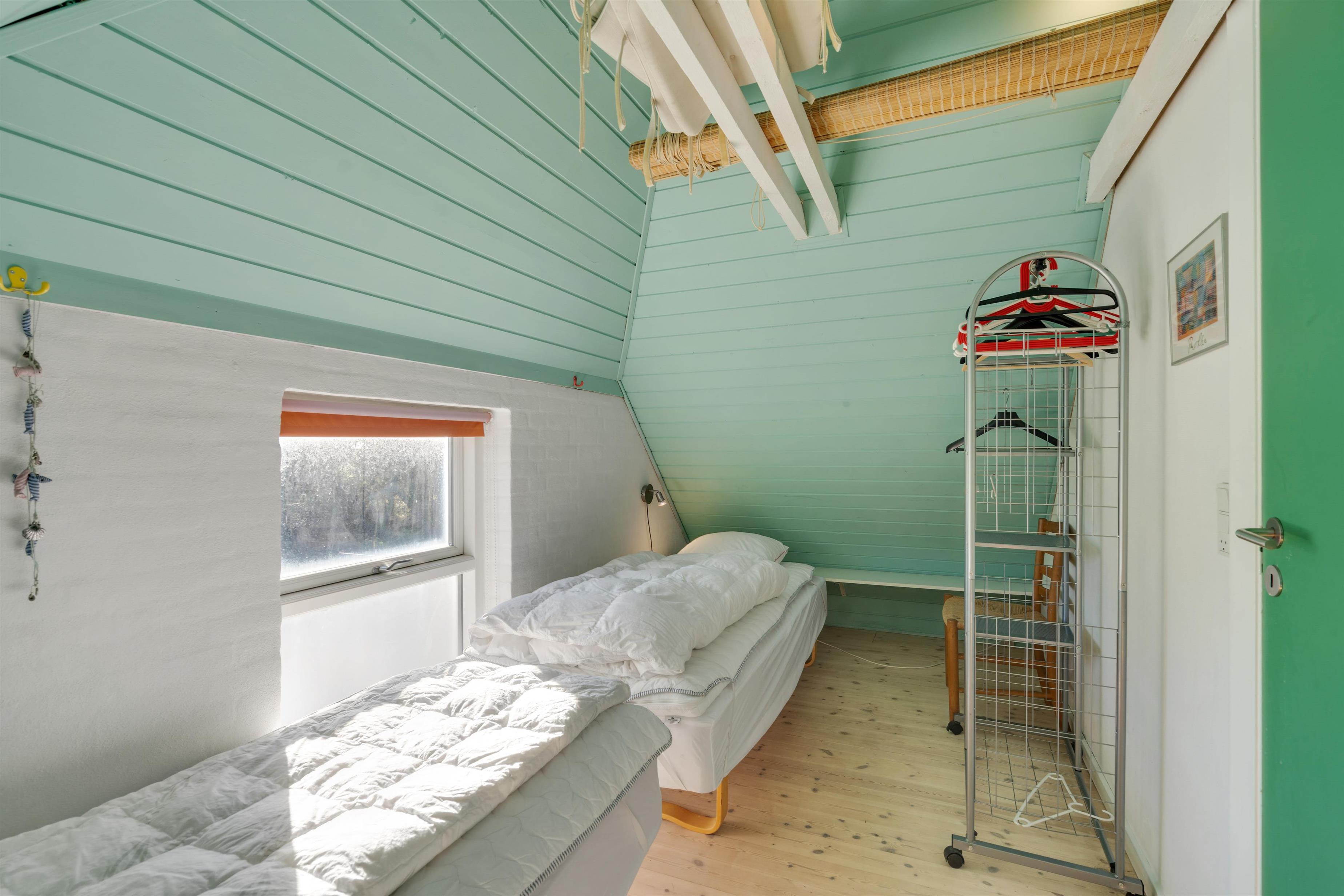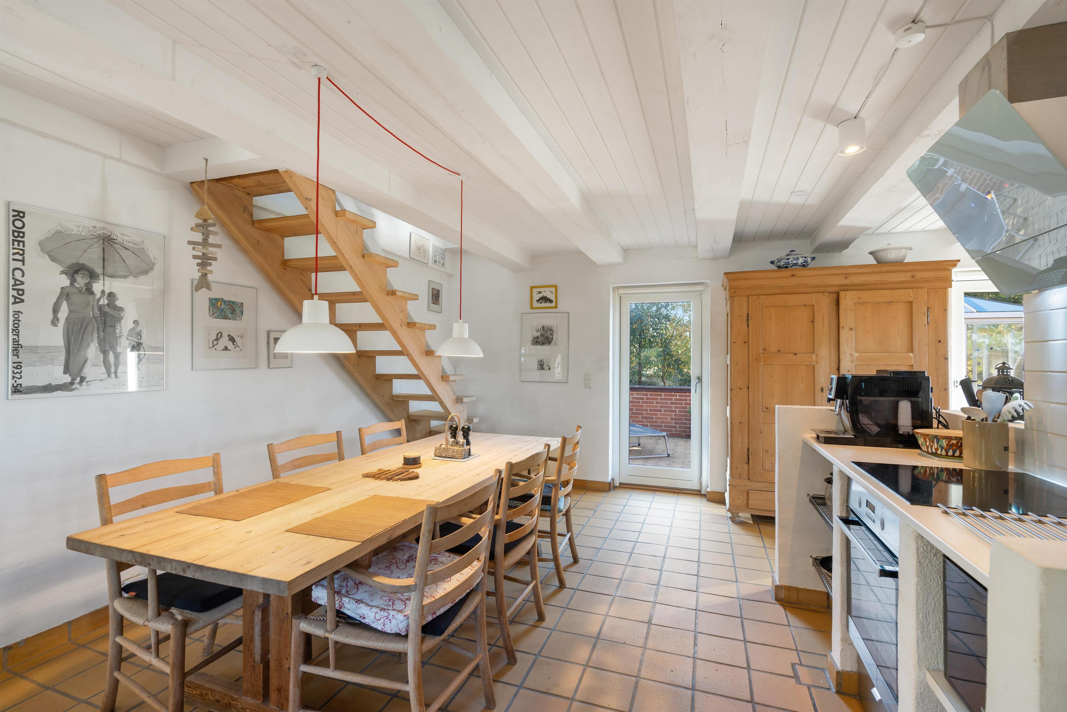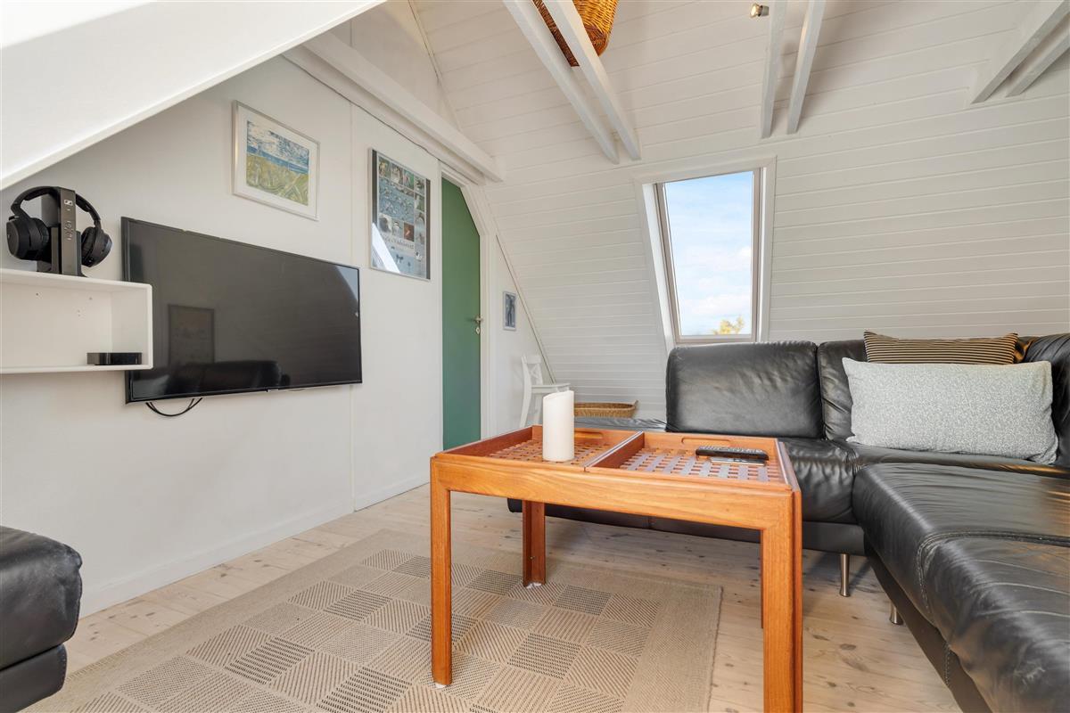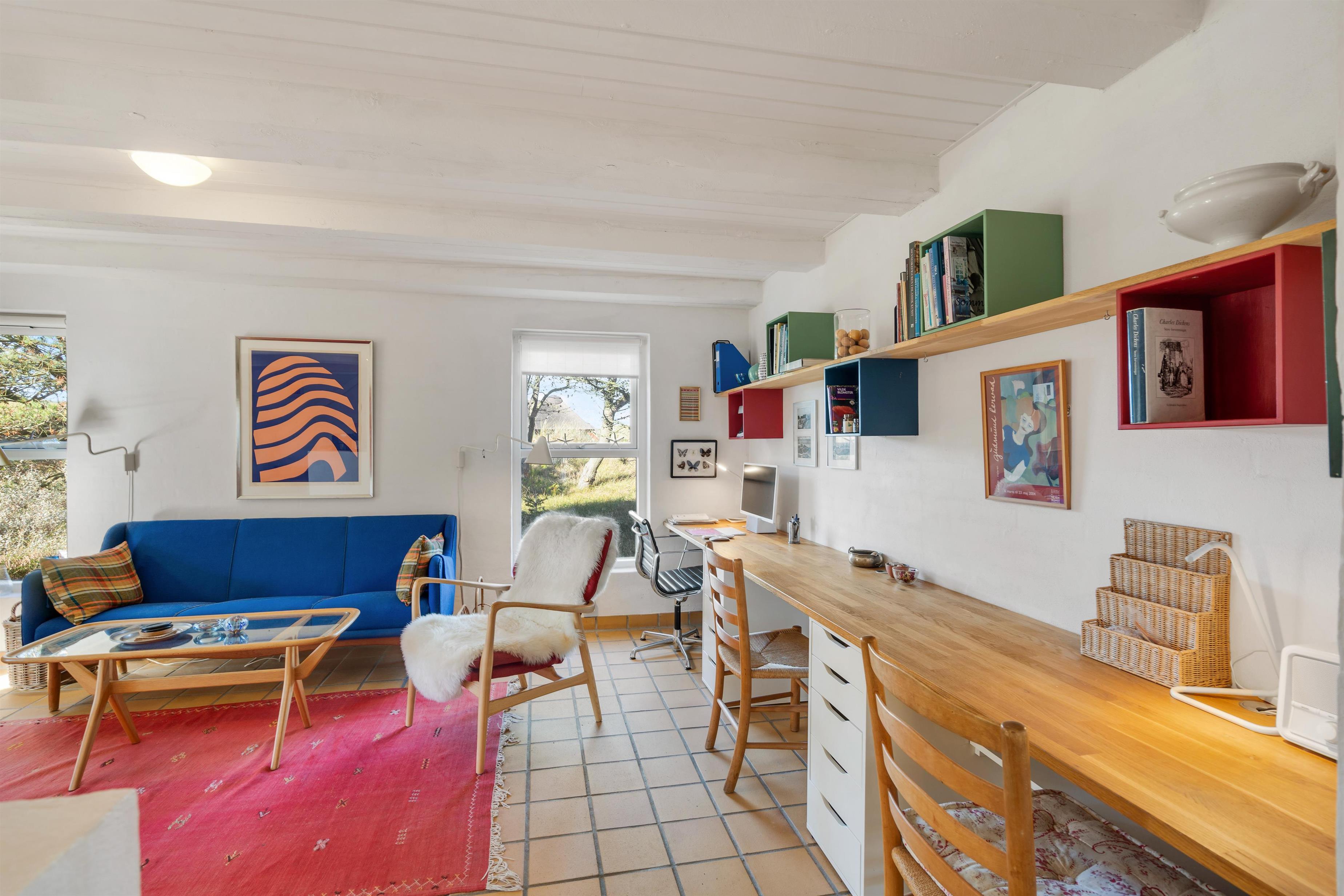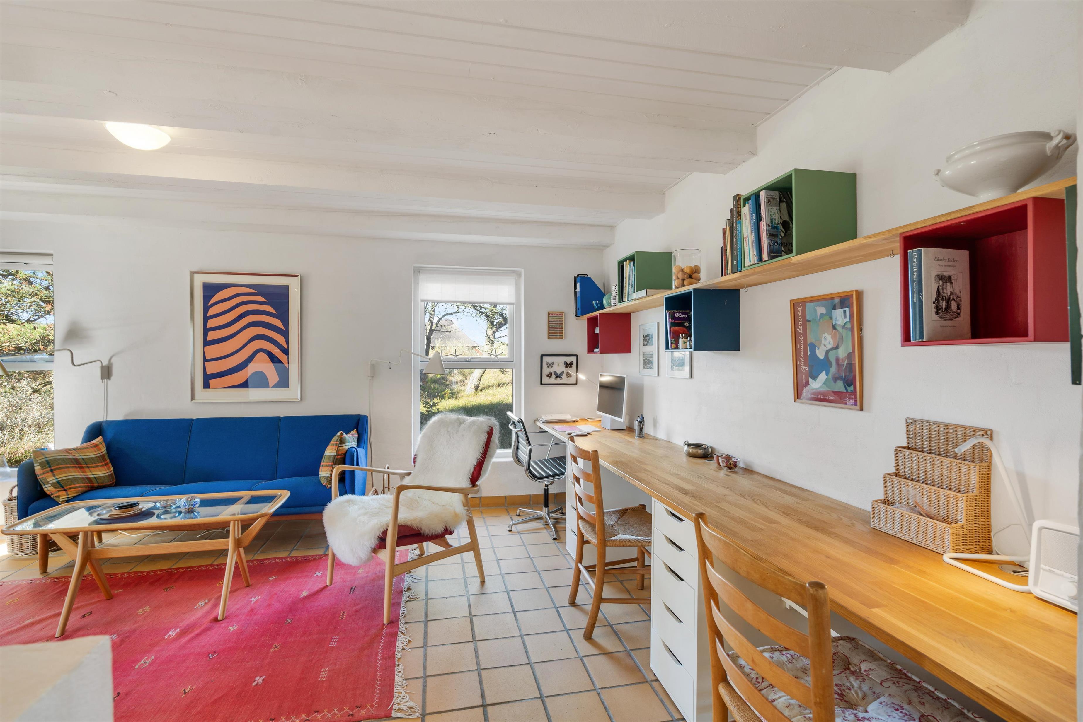 The first floor features two bedrooms: one with a double bed and single bed, the other with two single beds. The sloping ceilings and exposed beams create a particularly cosy atmosphere. You're sure to sleep well, lulled by the gentle beam of the Blåvand lighthouse.