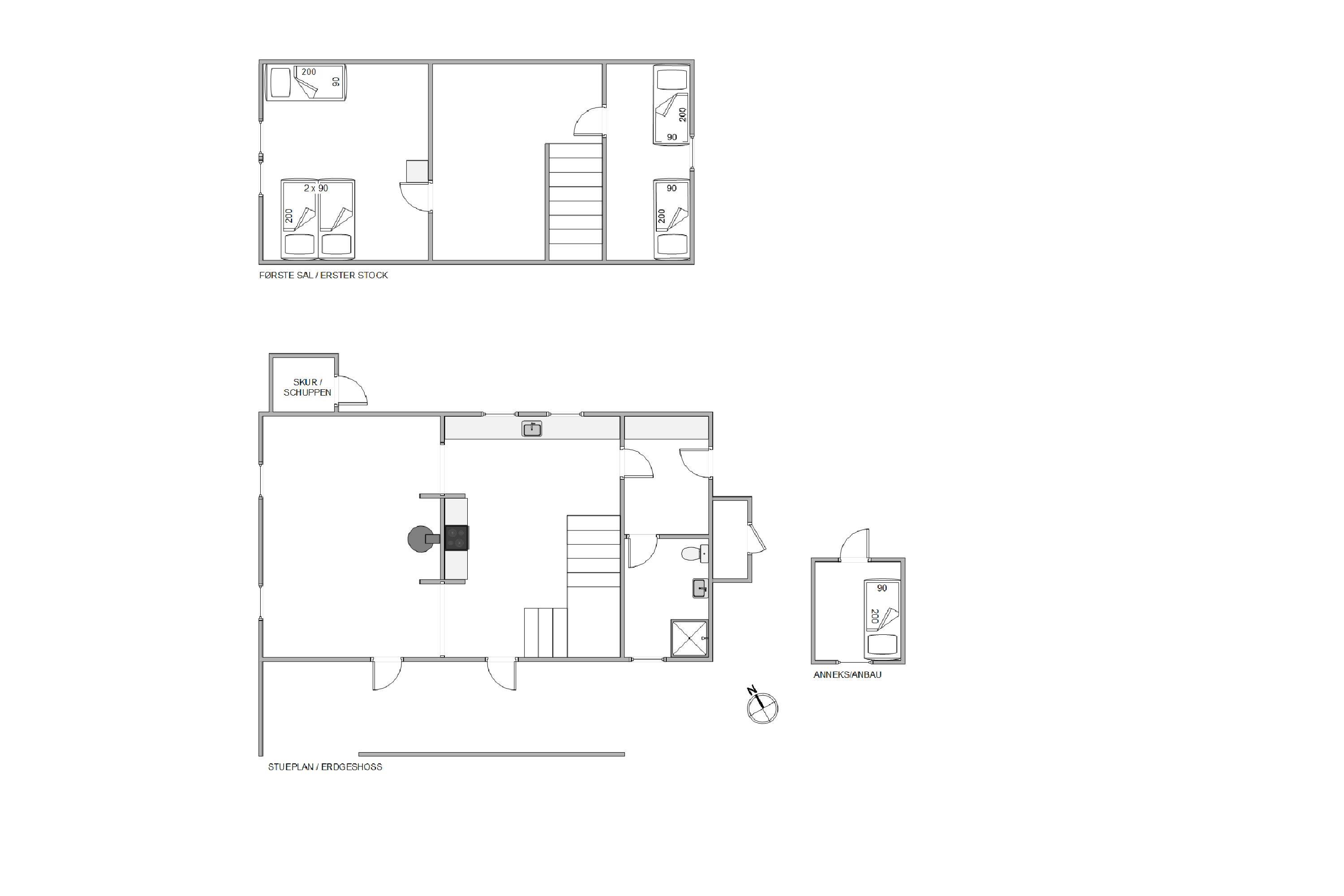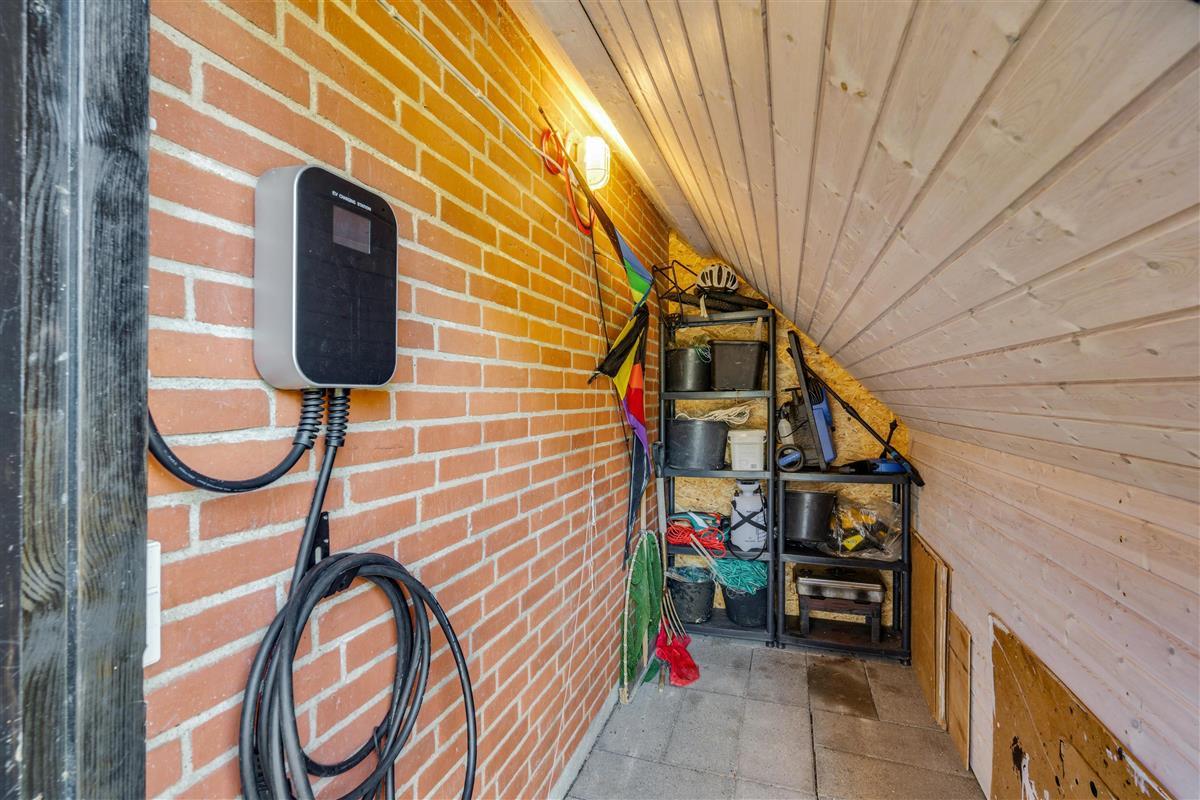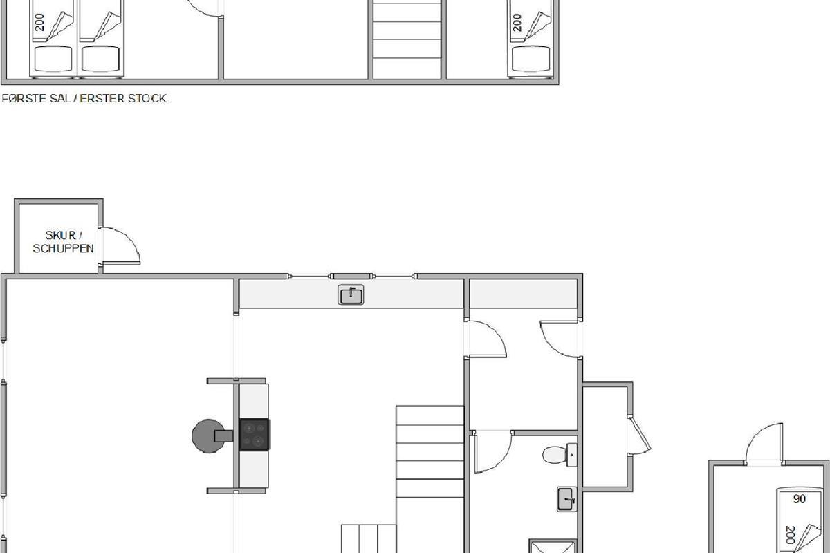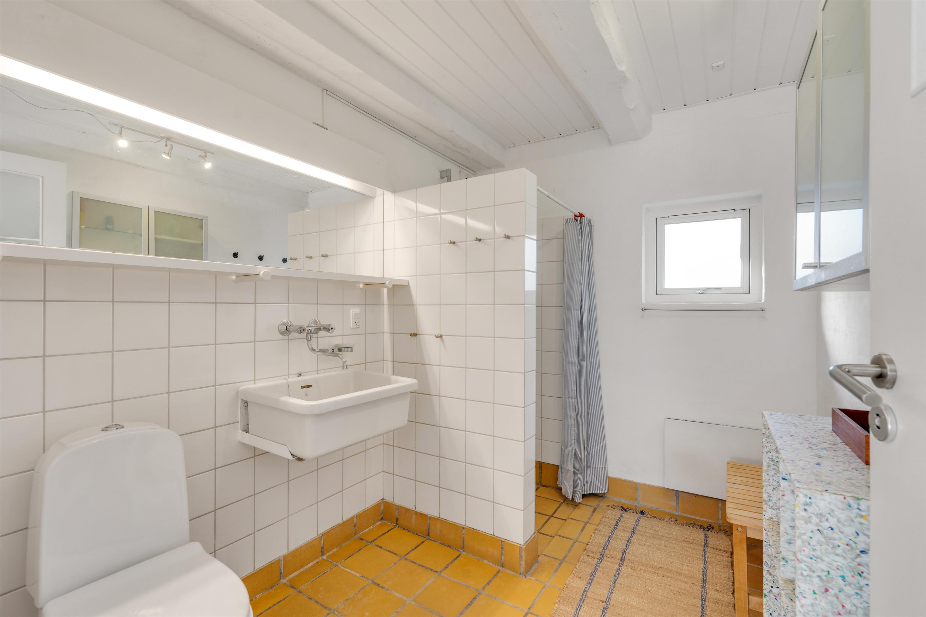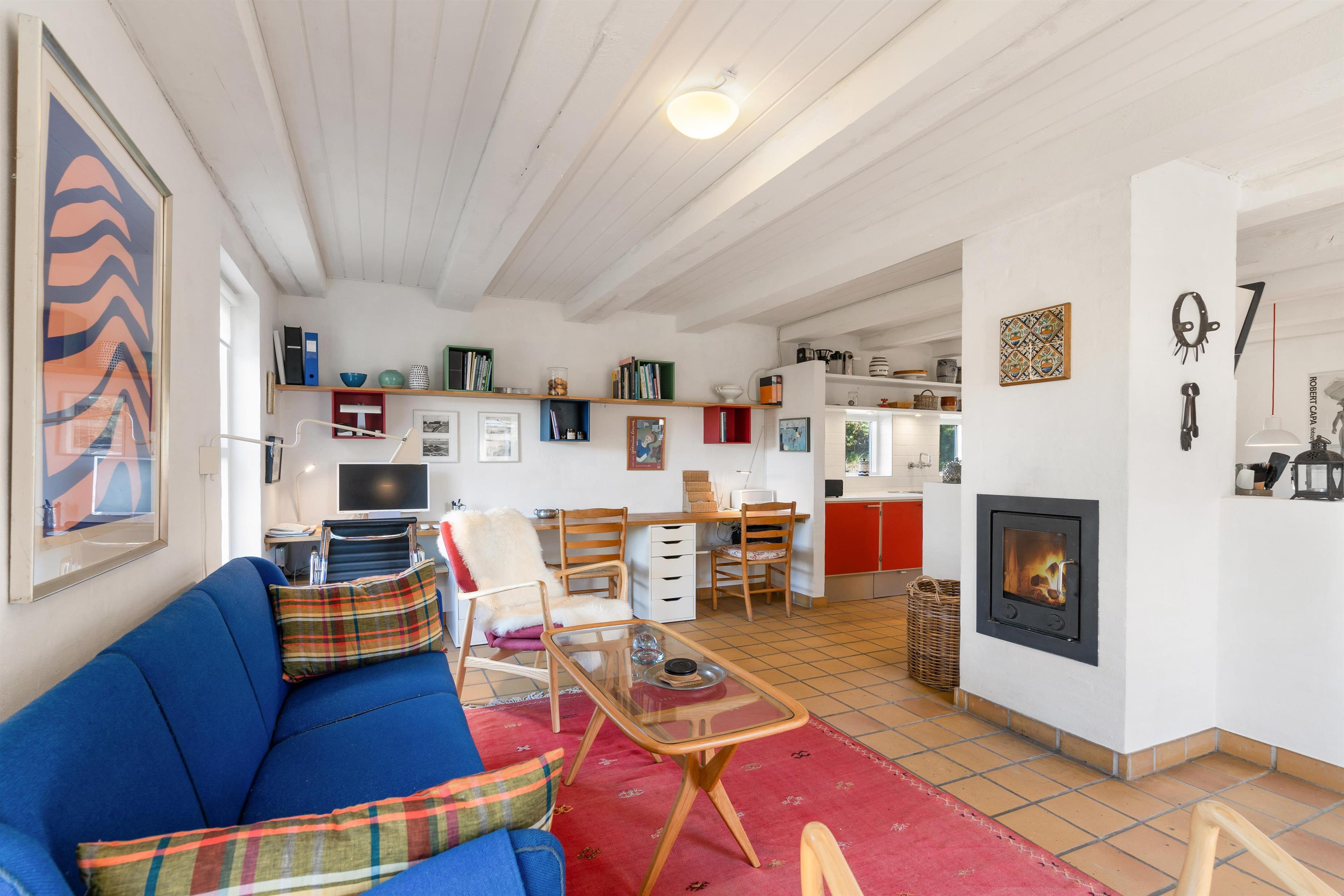 The first floor features two bedrooms: one with a double bed and single bed, the other with two single beds. The sloping ceilings and exposed beams create a particularly cosy atmosphere. You're sure to sleep well, lulled by the gentle beam of the Blåvand lighthouse.