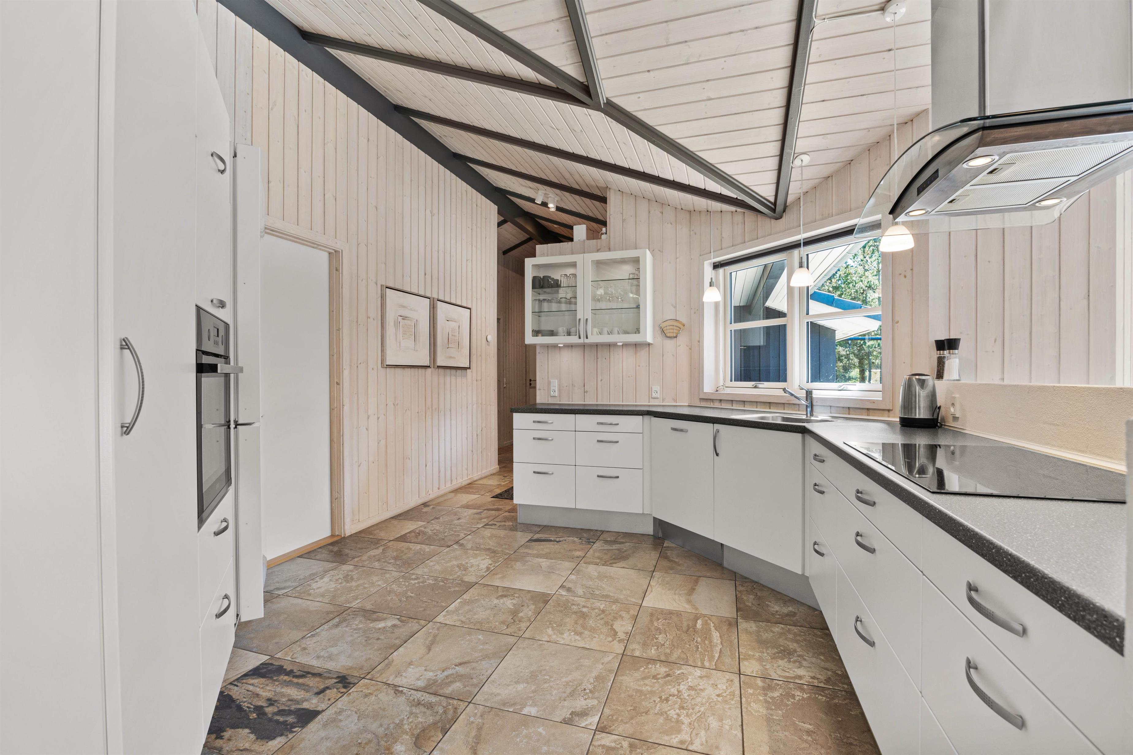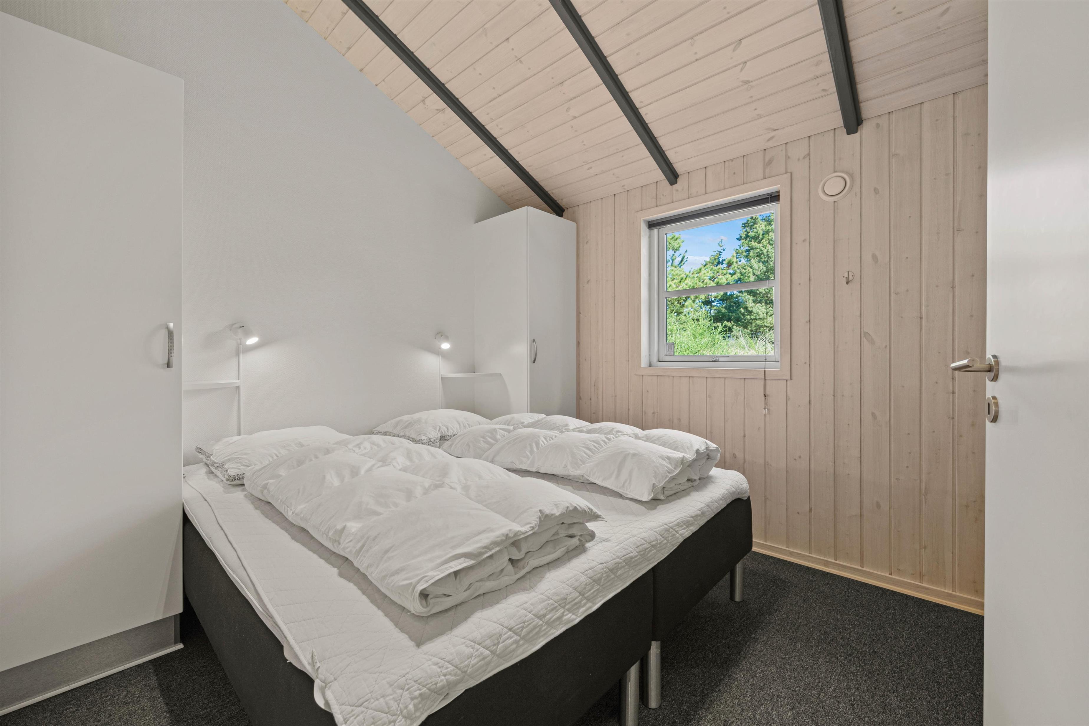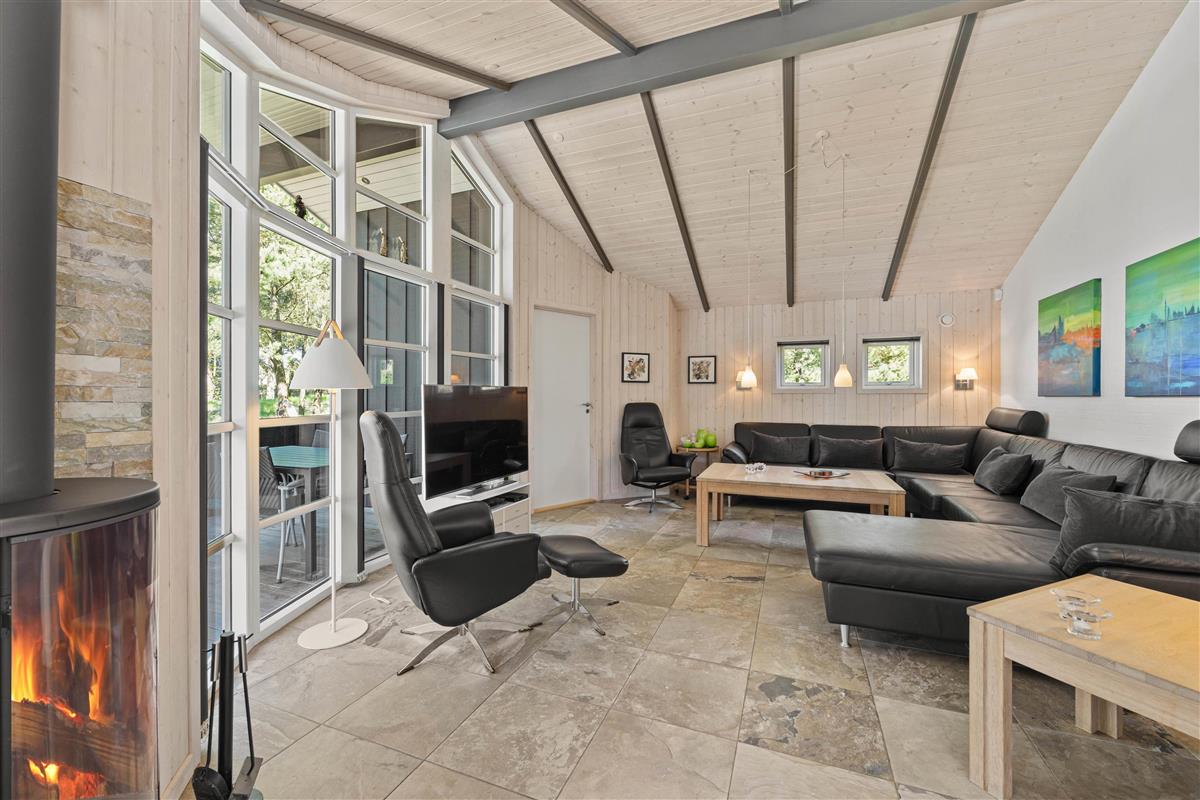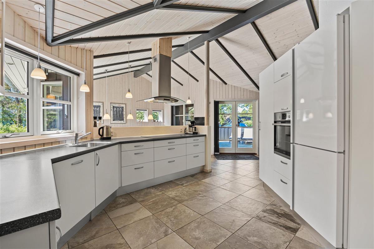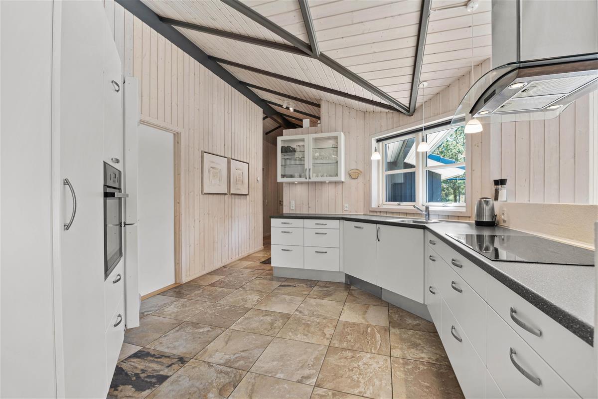 As typical in Danish holiday homes, there's a central living space combining the kitchen, dining area and living room. Wood-panelled walls, large windows and light-coloured walls create a truly welcoming atmosphere. A wood-burning stove provides cosy warmth and a homely ambiance, especially on cooler evenings. The fully equipped kitchen features an induction hob, separate freezer and dishwasher - taking care of the washing up so you can spend more time with your fellow guests.