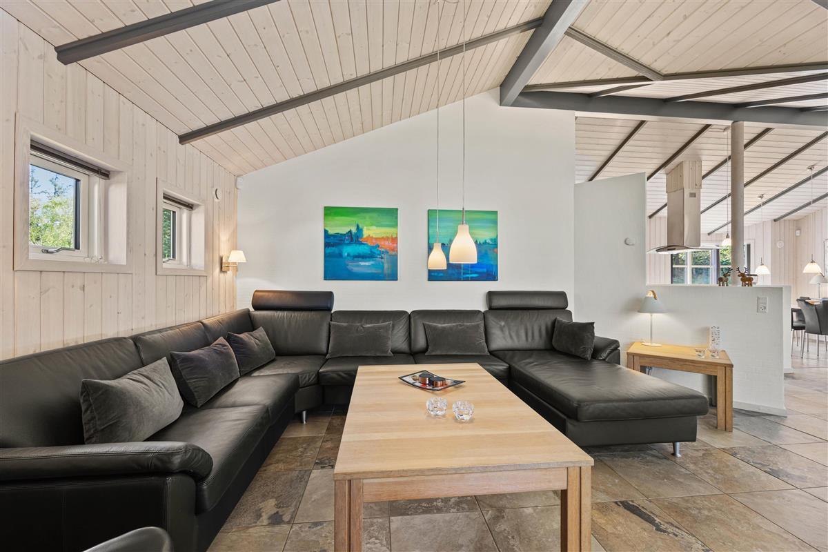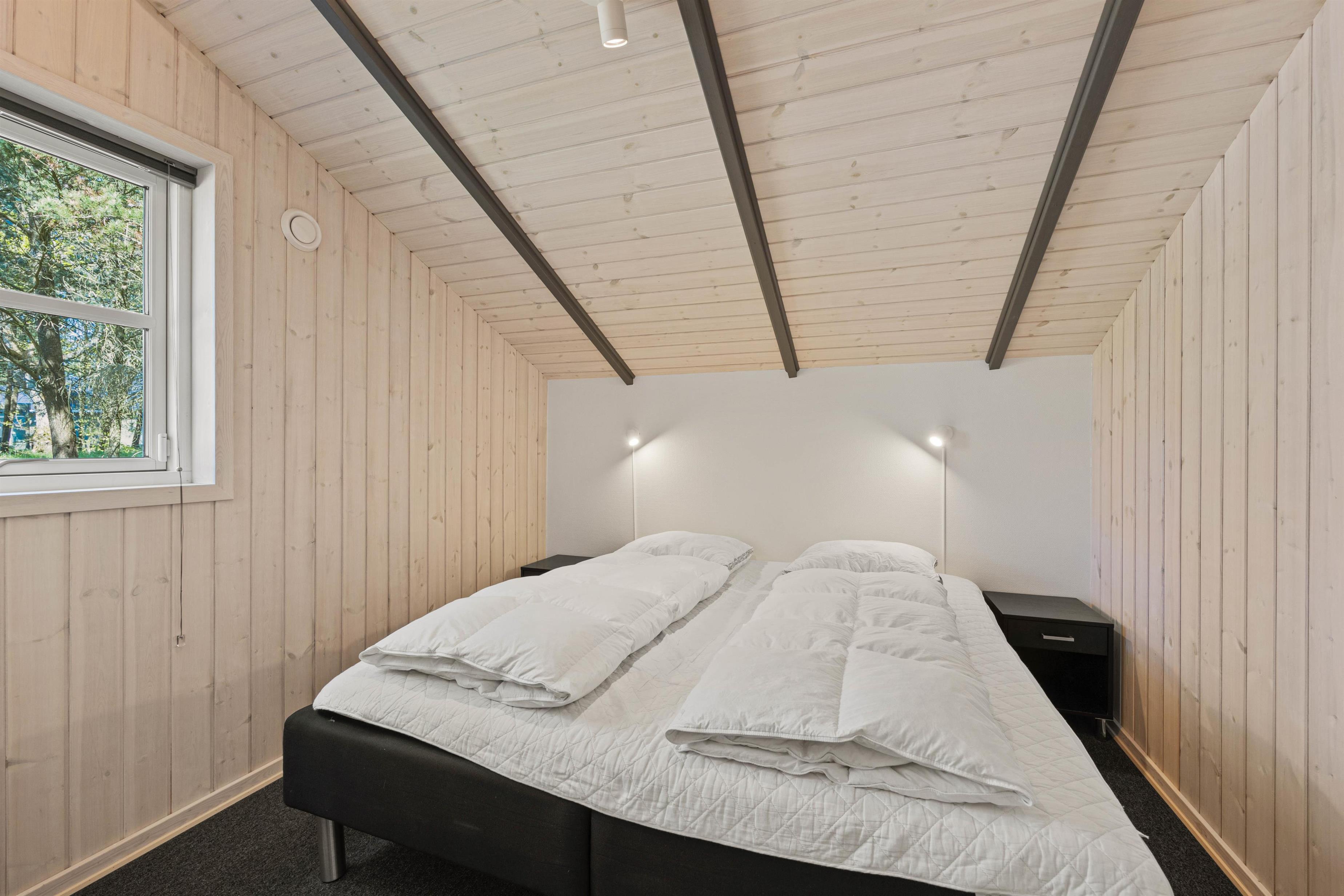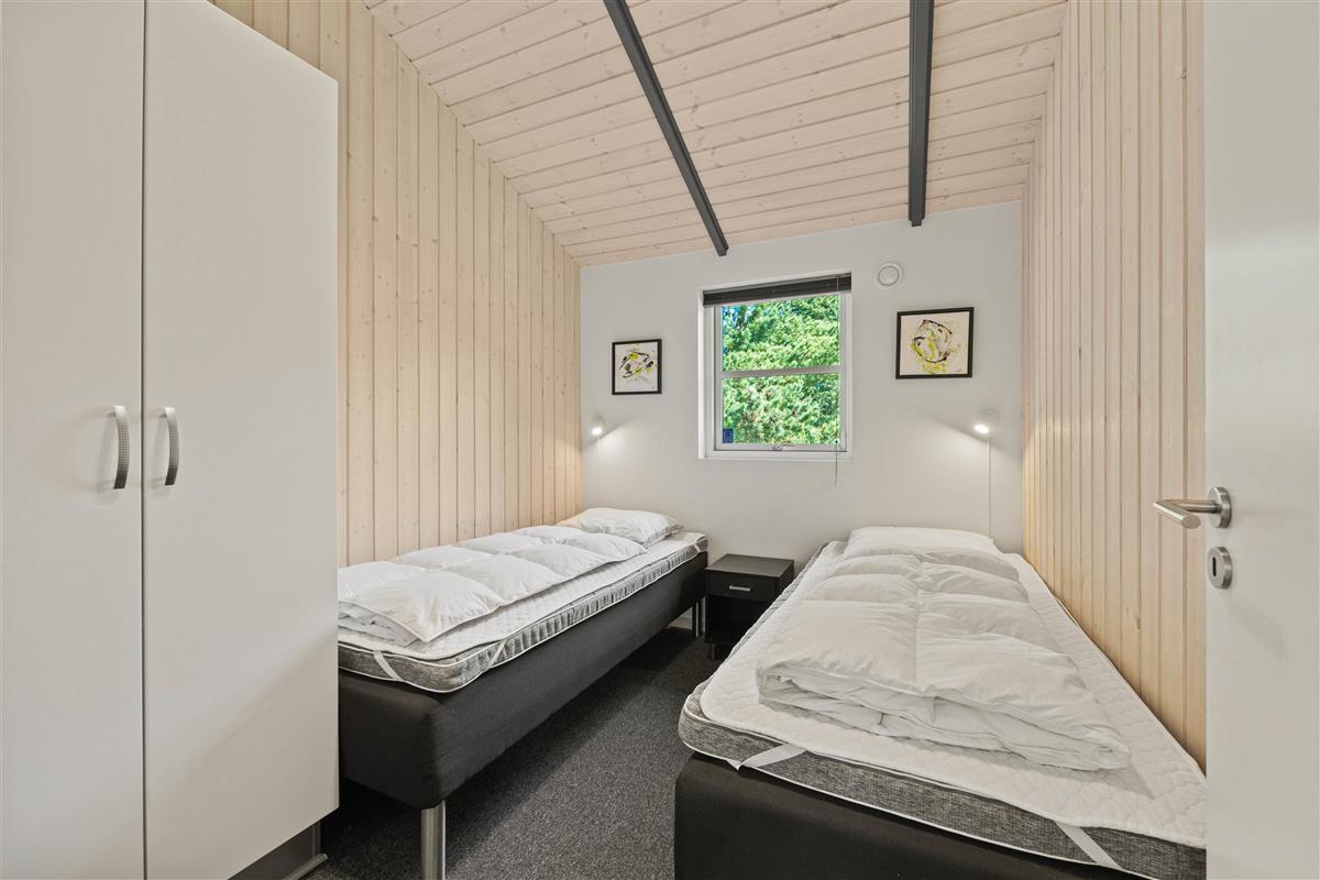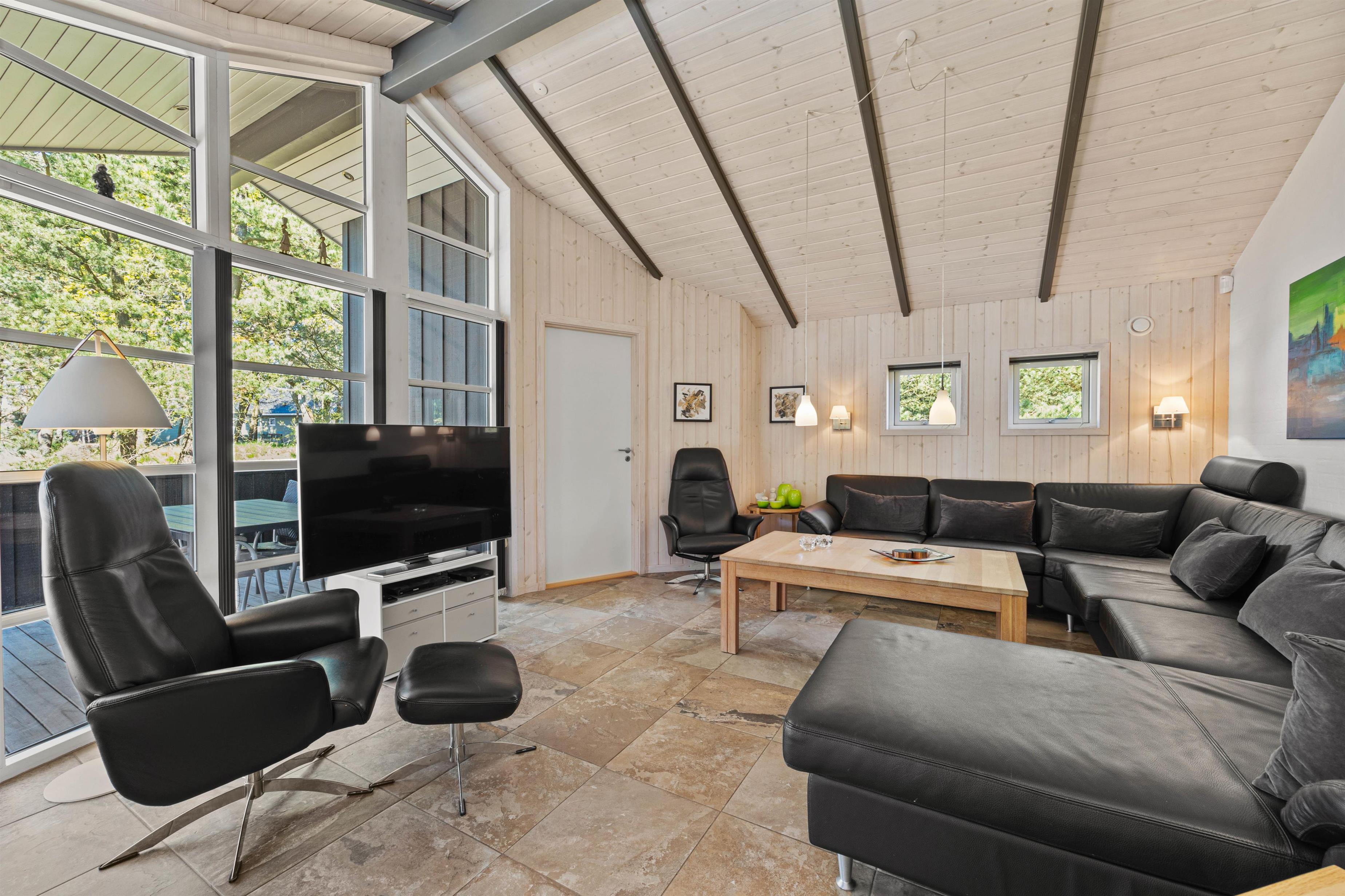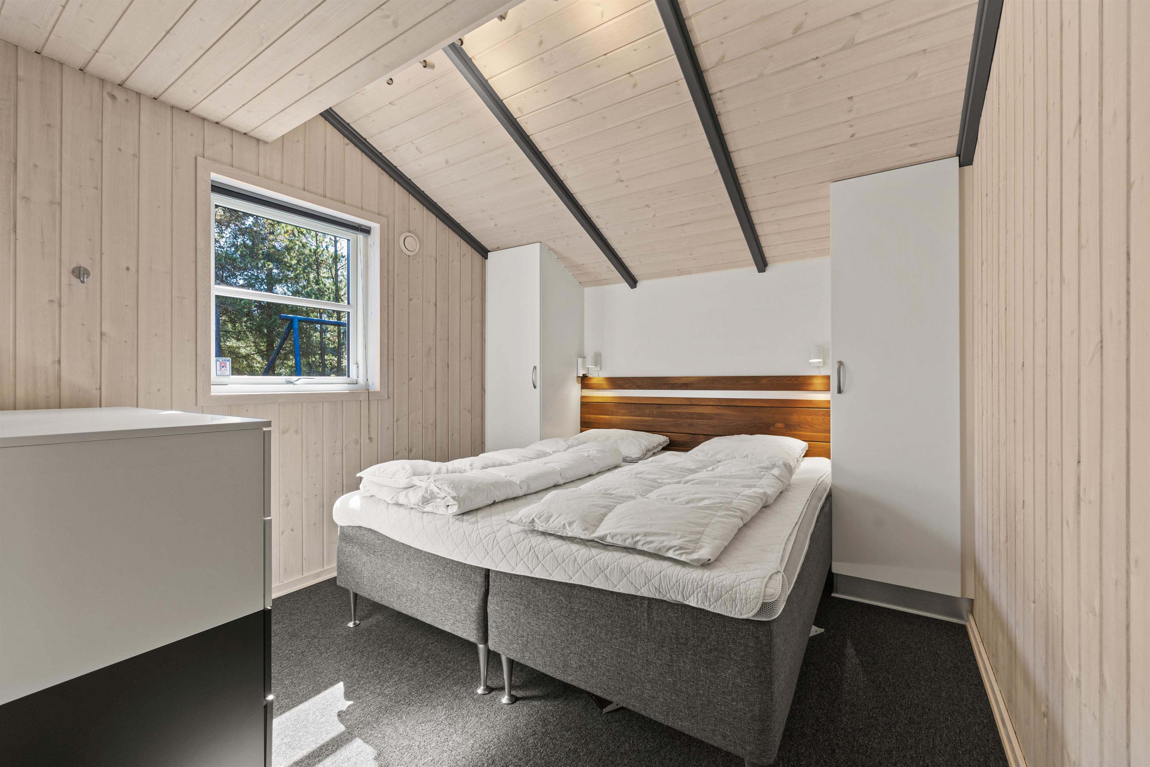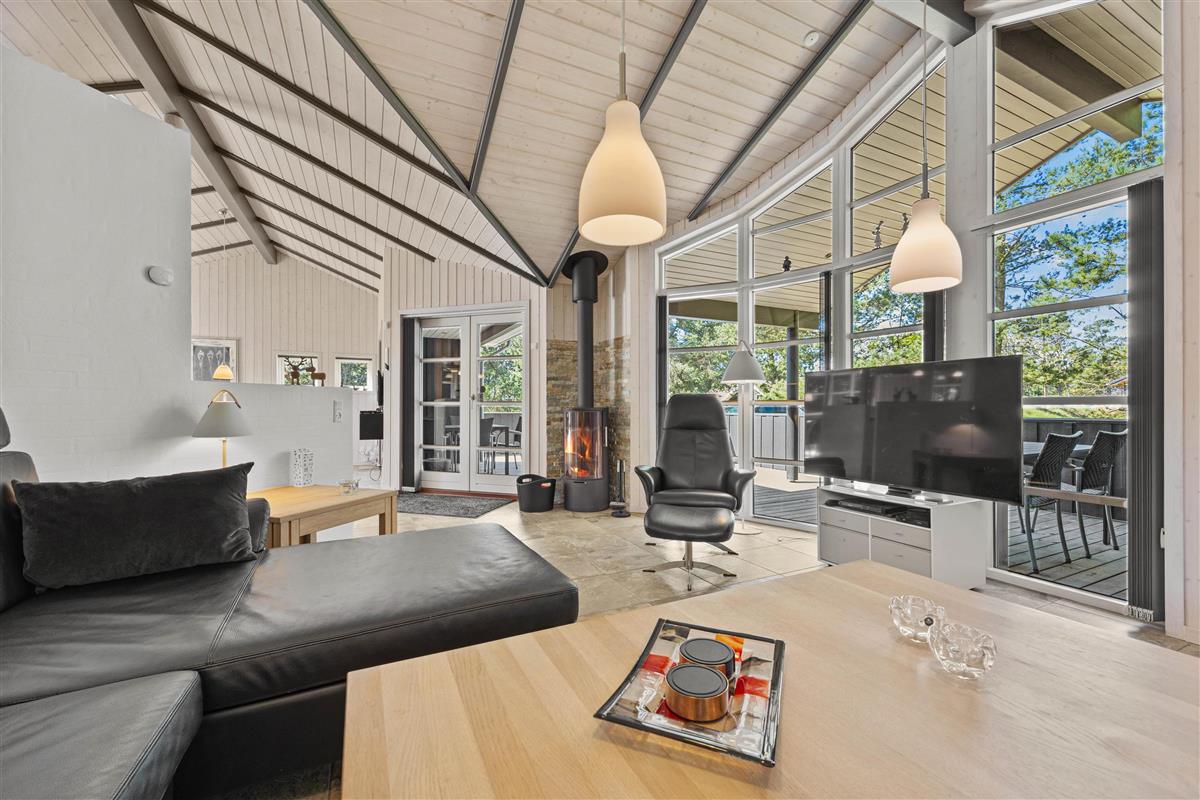 As typical in Danish holiday homes, there's a central living space combining the kitchen, dining area and living room. Wood-panelled walls, large windows and light-coloured walls create a truly welcoming atmosphere. A wood-burning stove provides cosy warmth and a homely ambiance, especially on cooler evenings. The fully equipped kitchen features an induction hob, separate freezer and dishwasher - taking care of the washing up so you can spend more time with your fellow guests.