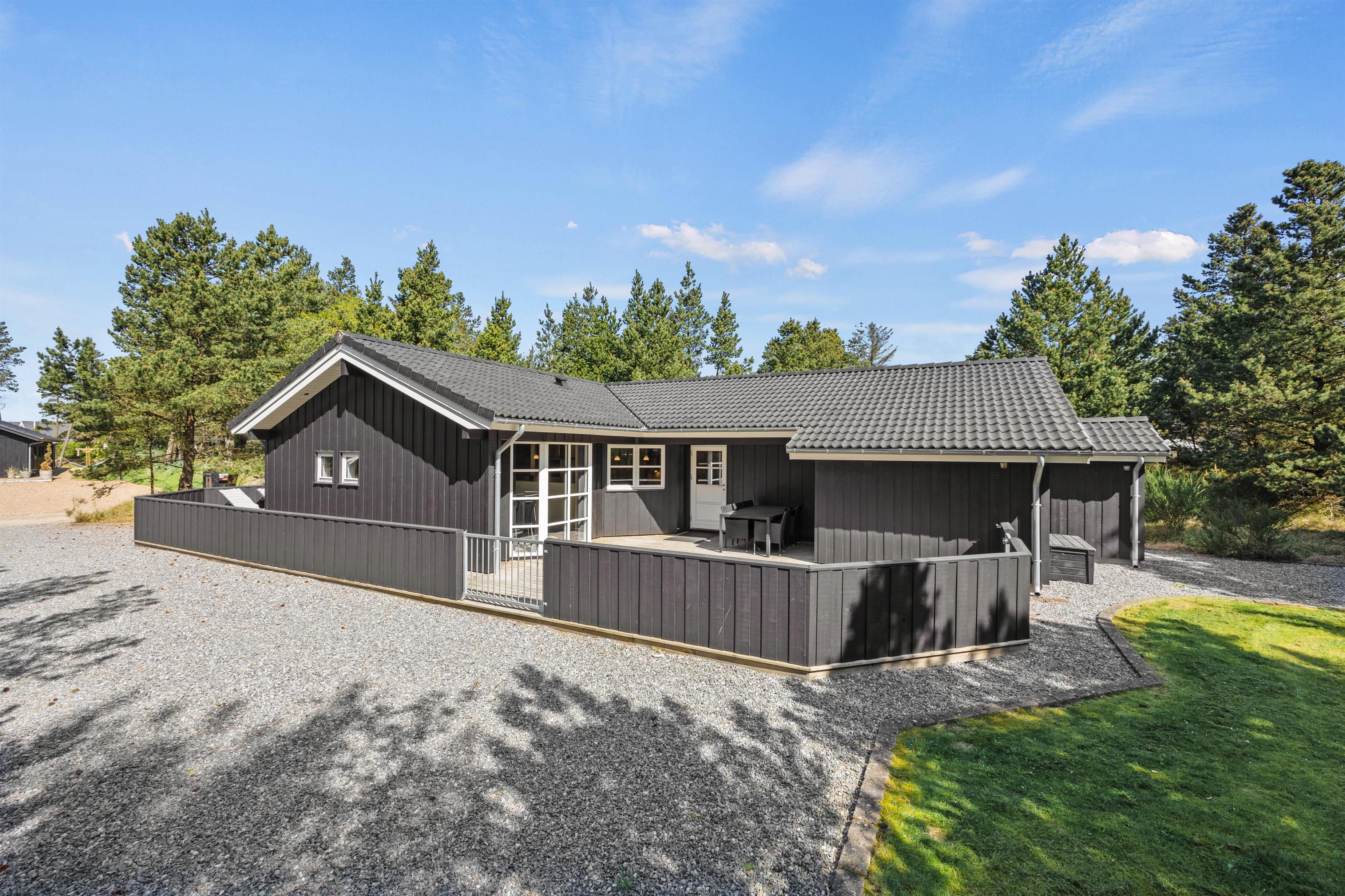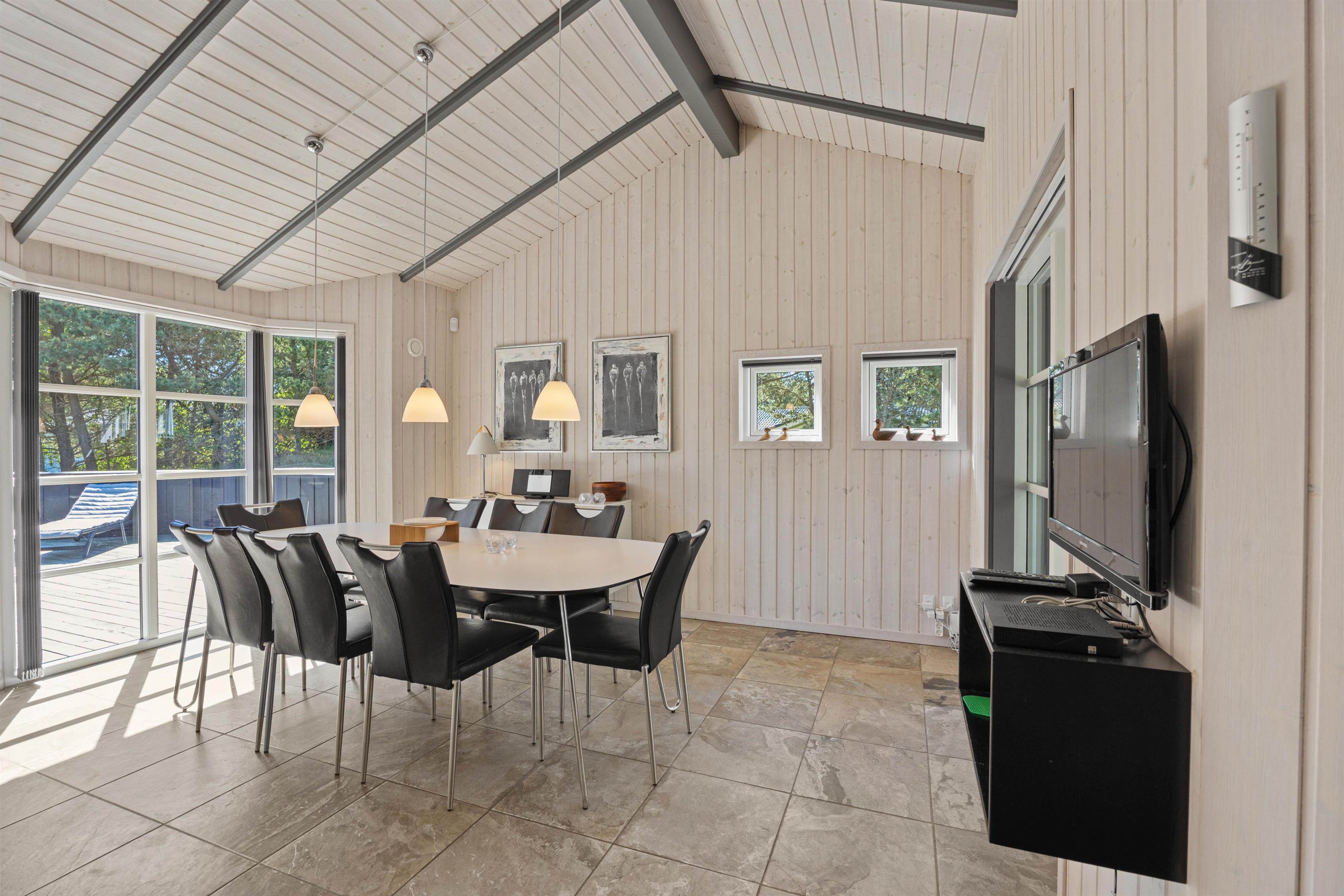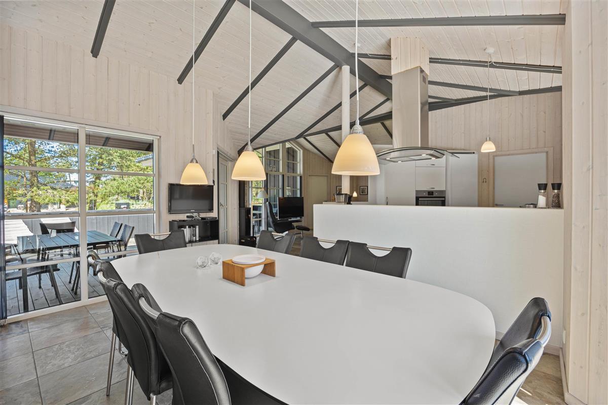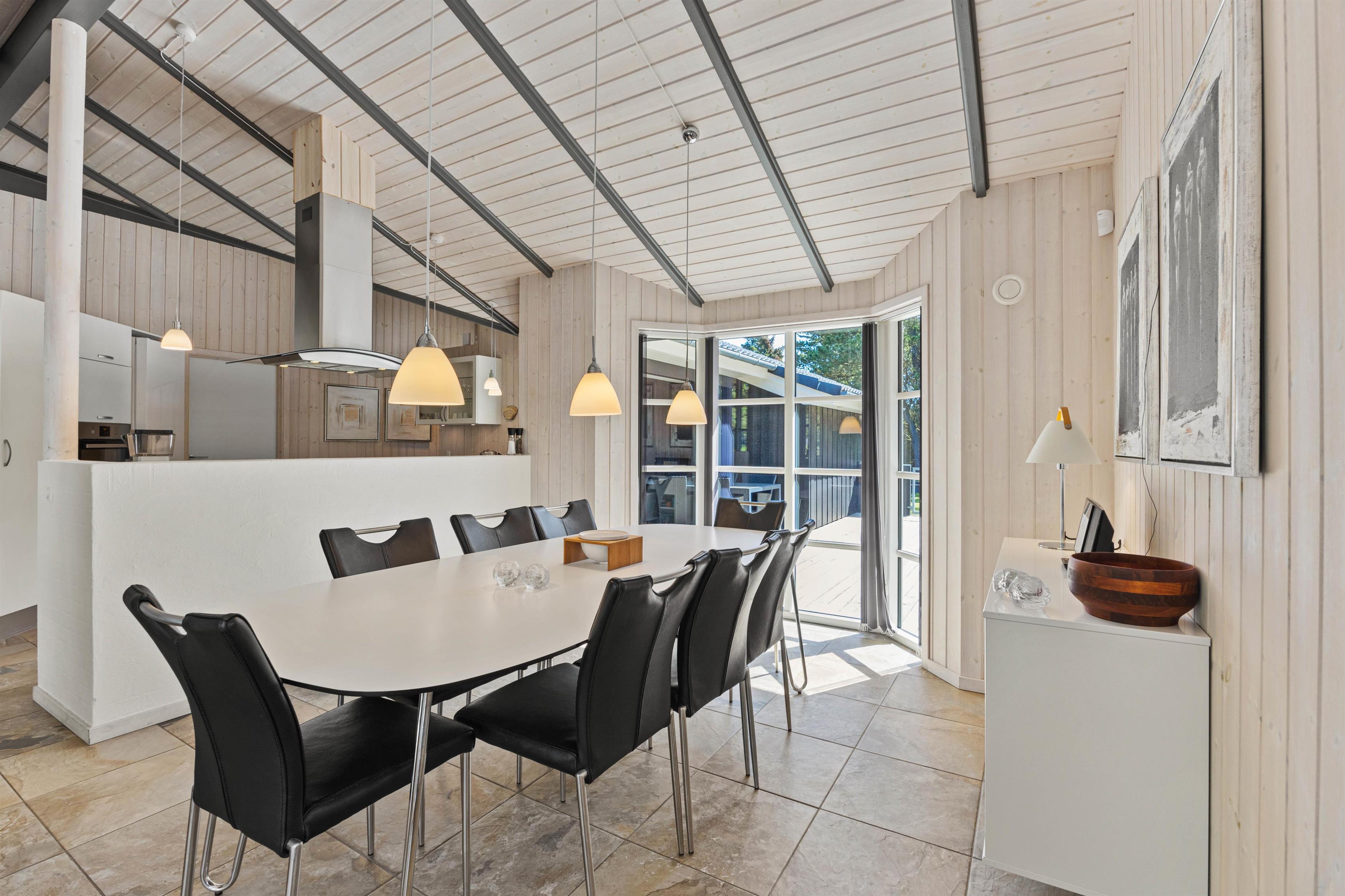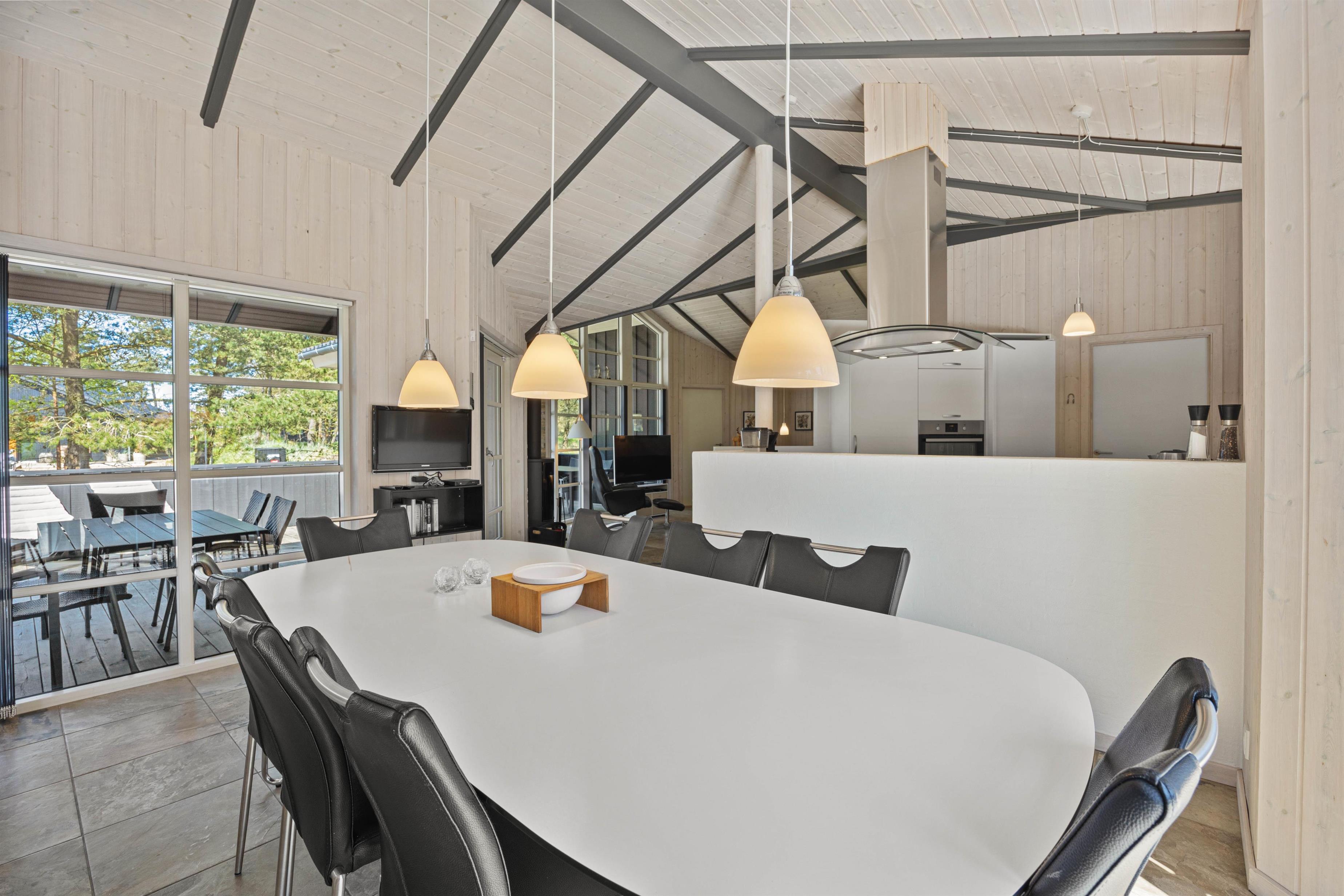 As typical in Danish holiday homes, there's a central living space combining the kitchen, dining area and living room. Wood-panelled walls, large windows and light-coloured walls create a truly welcoming atmosphere. A wood-burning stove provides cosy warmth and a homely ambiance, especially on cooler evenings. The fully equipped kitchen features an induction hob, separate freezer and dishwasher - taking care of the washing up so you can spend more time with your fellow guests.