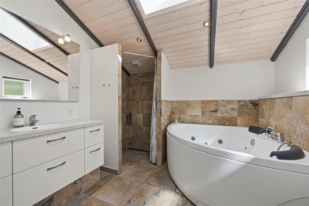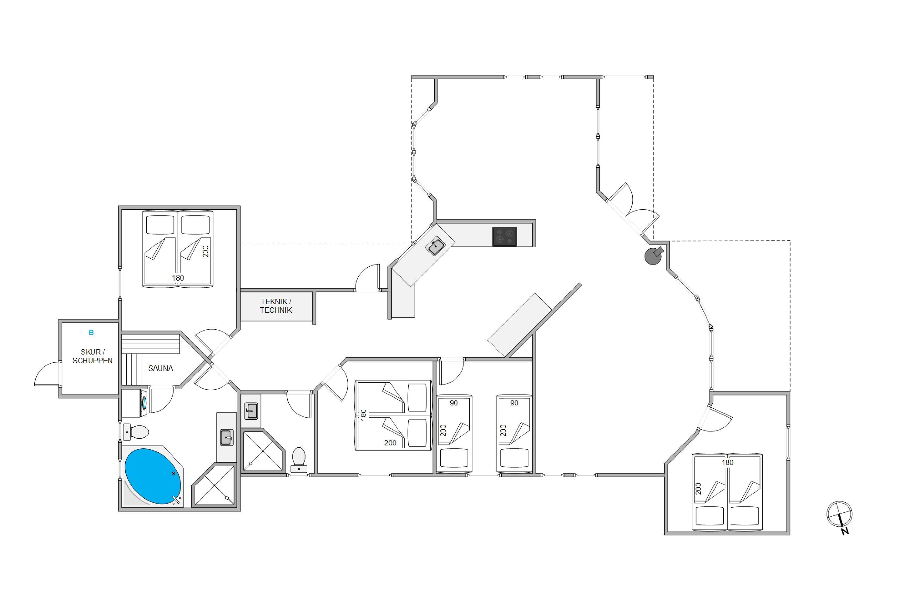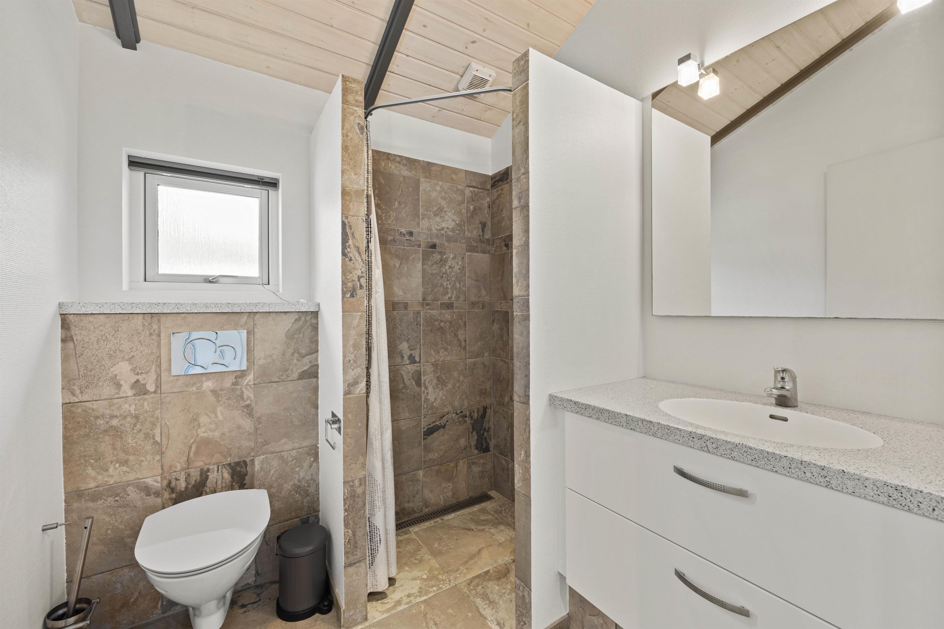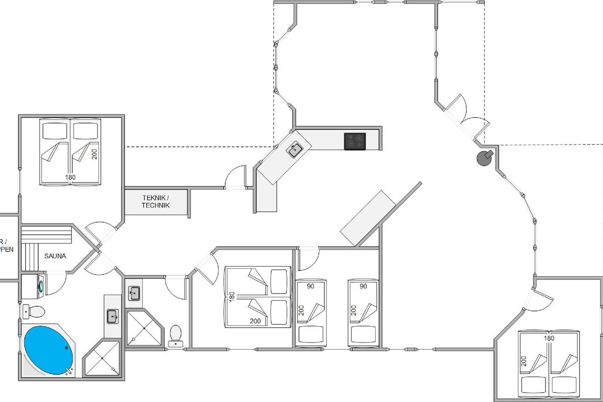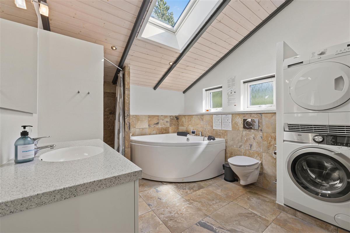 As typical in Danish holiday homes, there's a central living space combining the kitchen, dining area and living room. Wood-panelled walls, large windows and light-coloured walls create a truly welcoming atmosphere. A wood-burning stove provides cosy warmth and a homely ambiance, especially on cooler evenings. The fully equipped kitchen features an induction hob, separate freezer and dishwasher - taking care of the washing up so you can spend more time with your fellow guests.