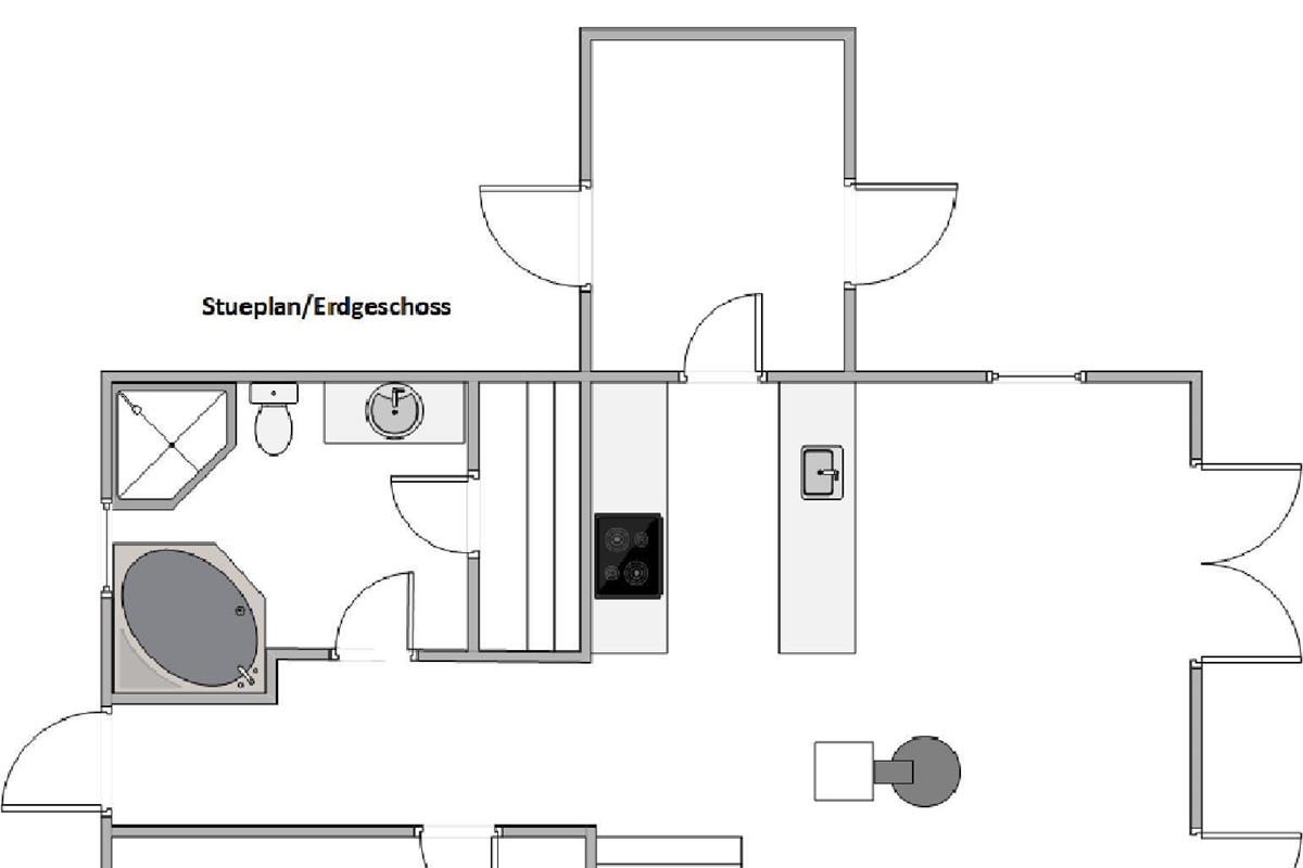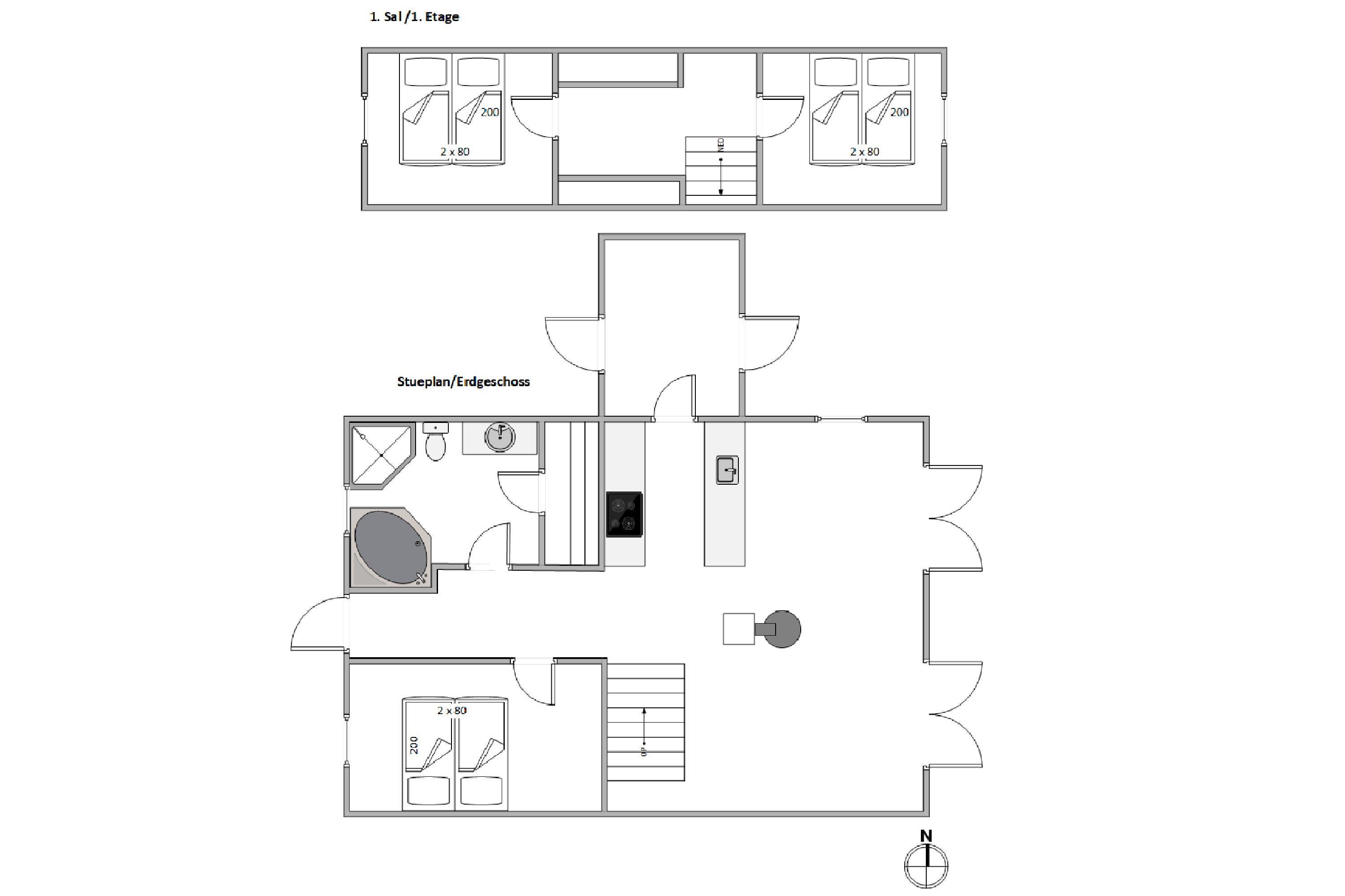 The ground floor features the living room with open-plan kitchen, dining area, and a cosy sofa corner where you can stream via Chromecast. This level also houses one of the bedrooms and a large bathroom with underfloor heating, plus your private wellness area with sauna and whirlpool. The remaining two bedrooms are located on the first floor.