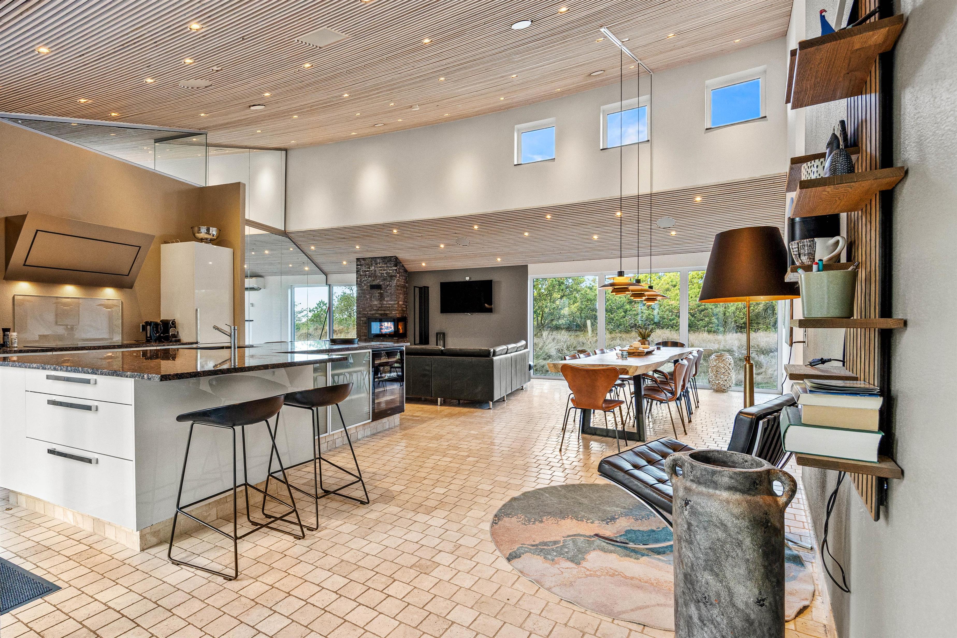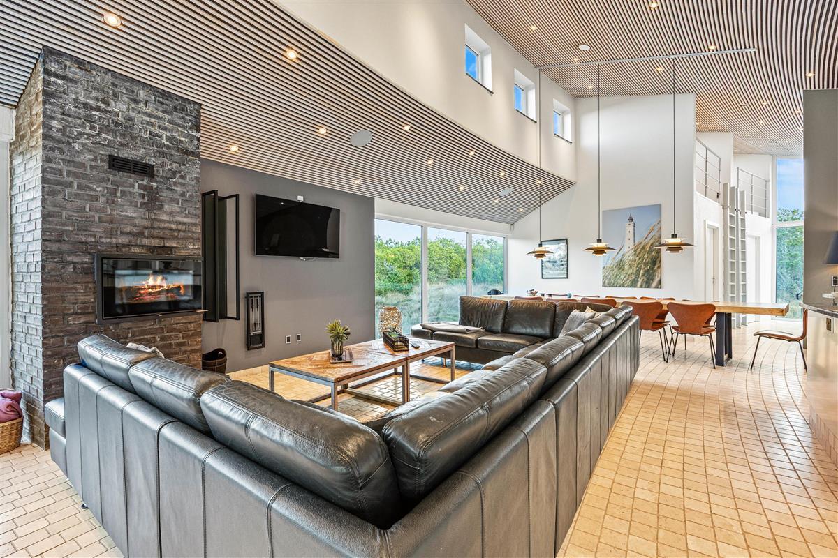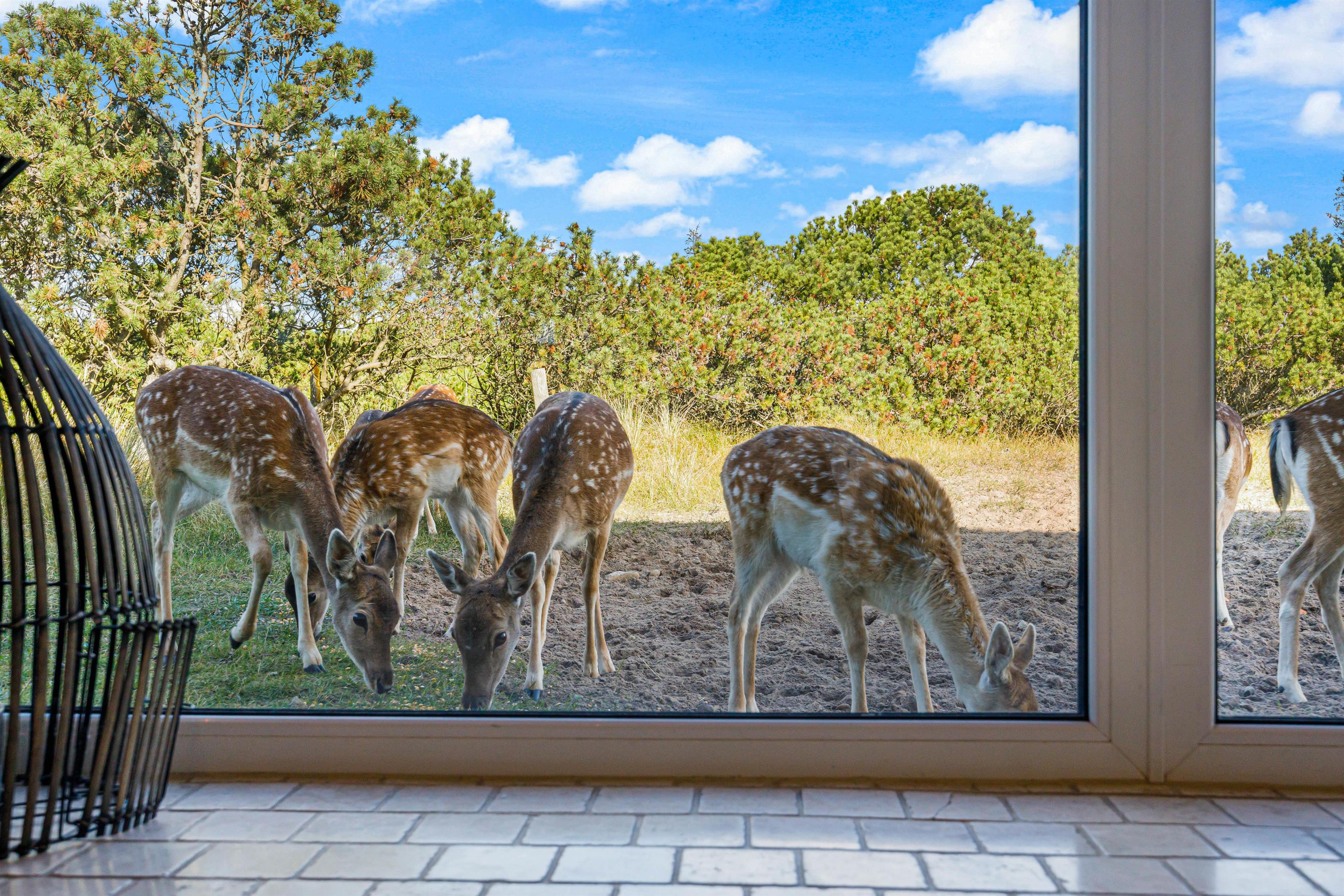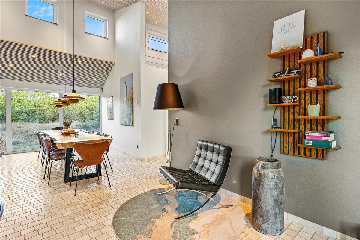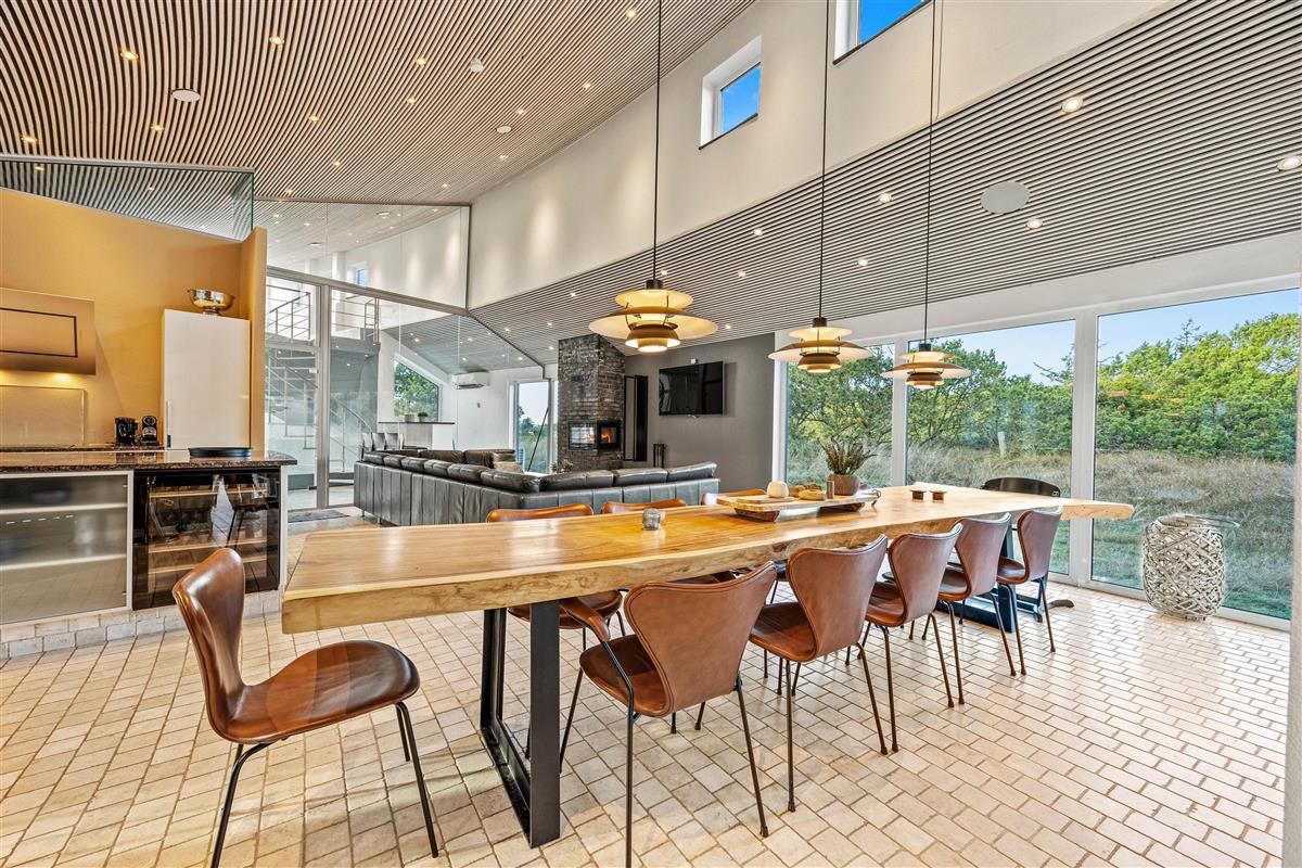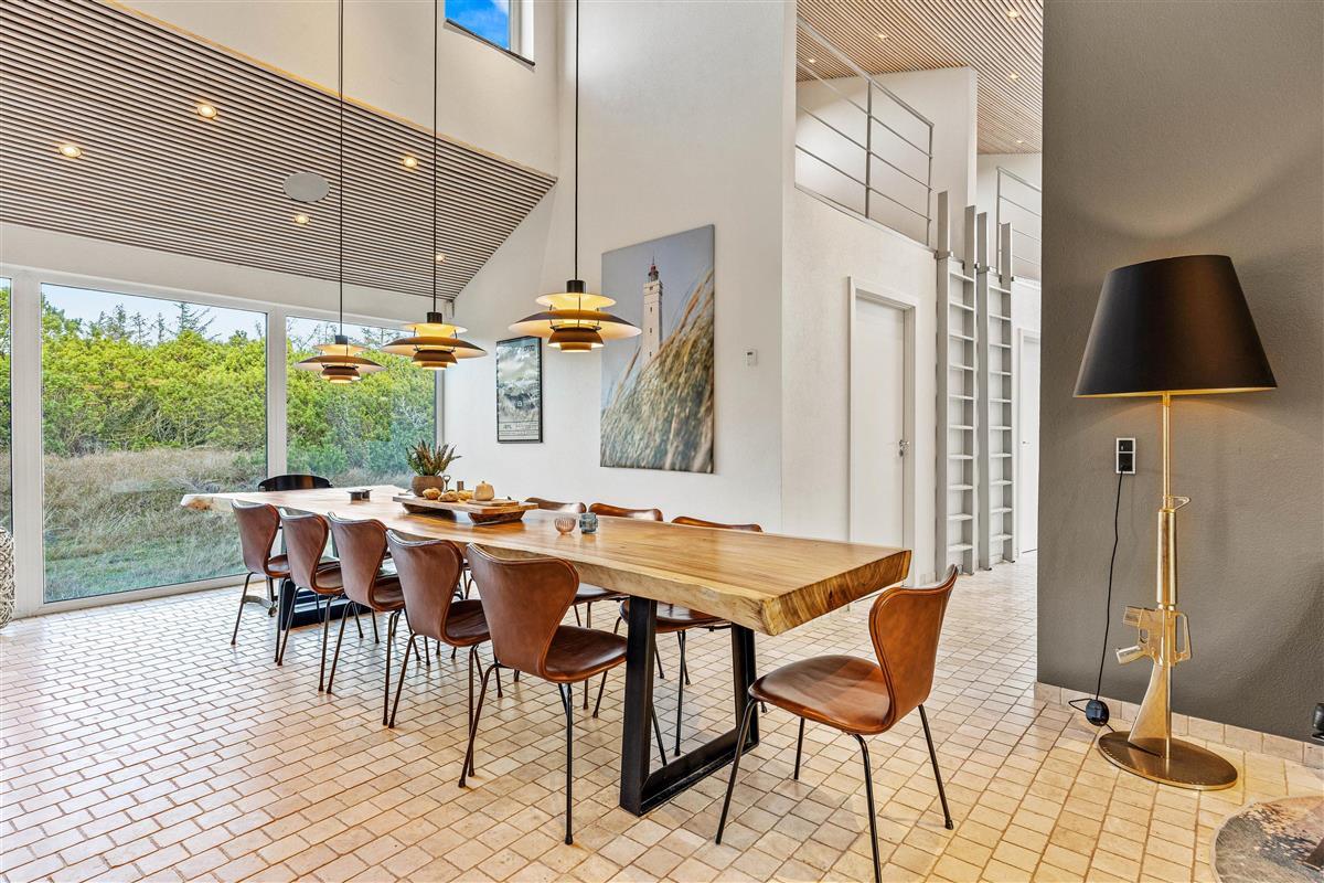 The spacious living area with open-plan kitchen and large dining table is perfect for spending time together. Through the large windows spanning the entire front of the house, you'll feel immersed in the Danish West Coast's natural environment. As the holiday home borders a large nature reserve, your only visitors on the private grounds will be the occasional deer or rabbit.