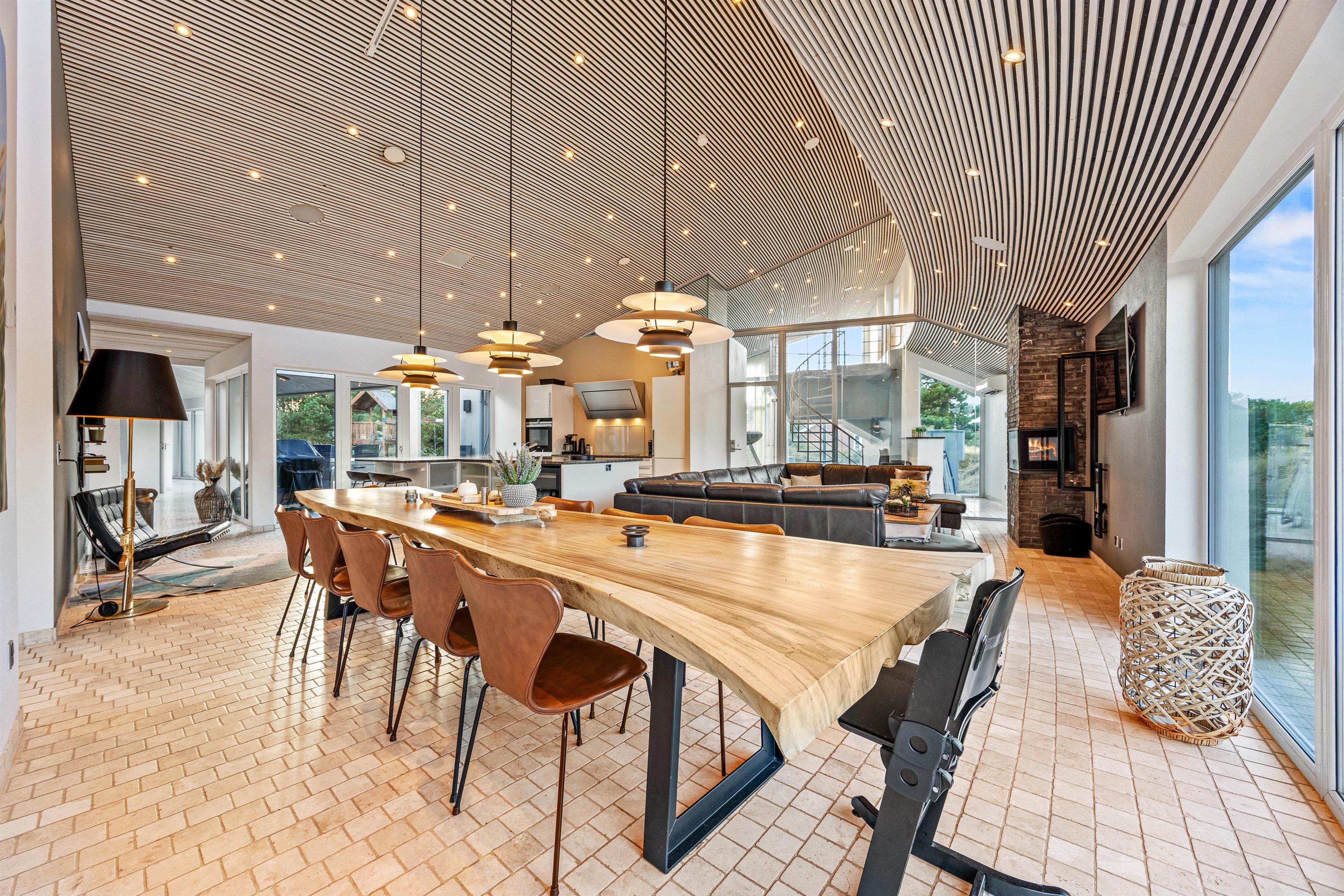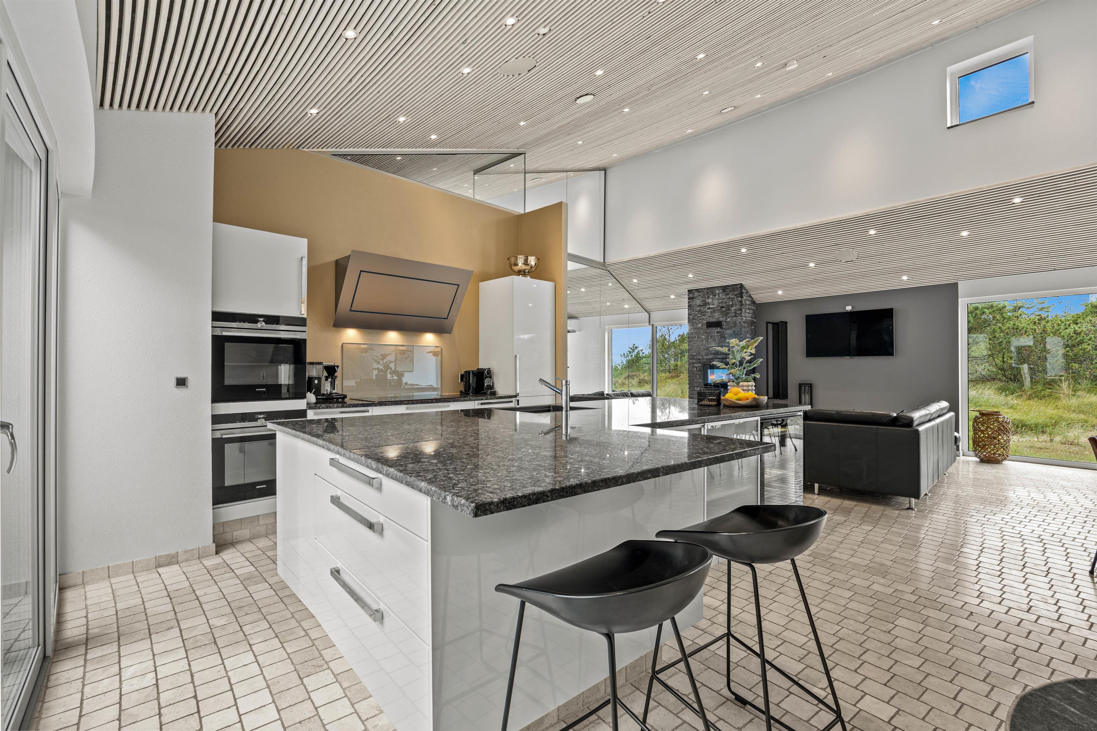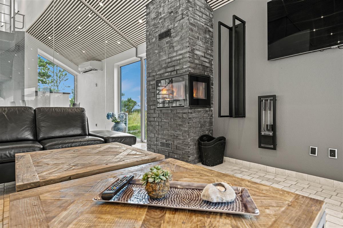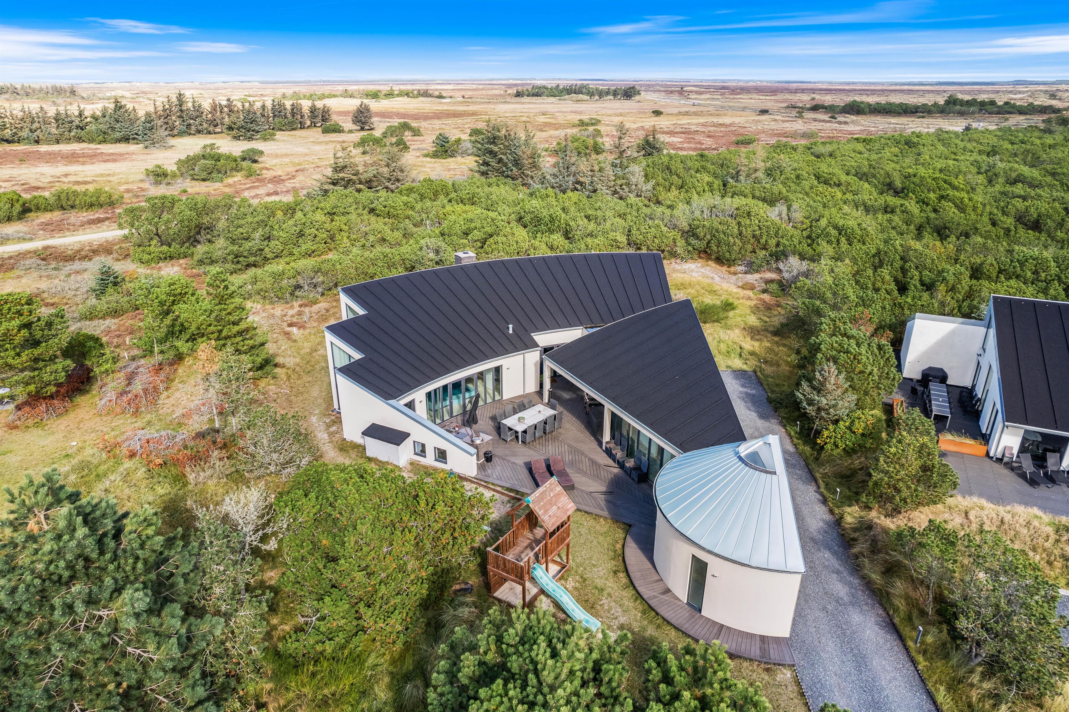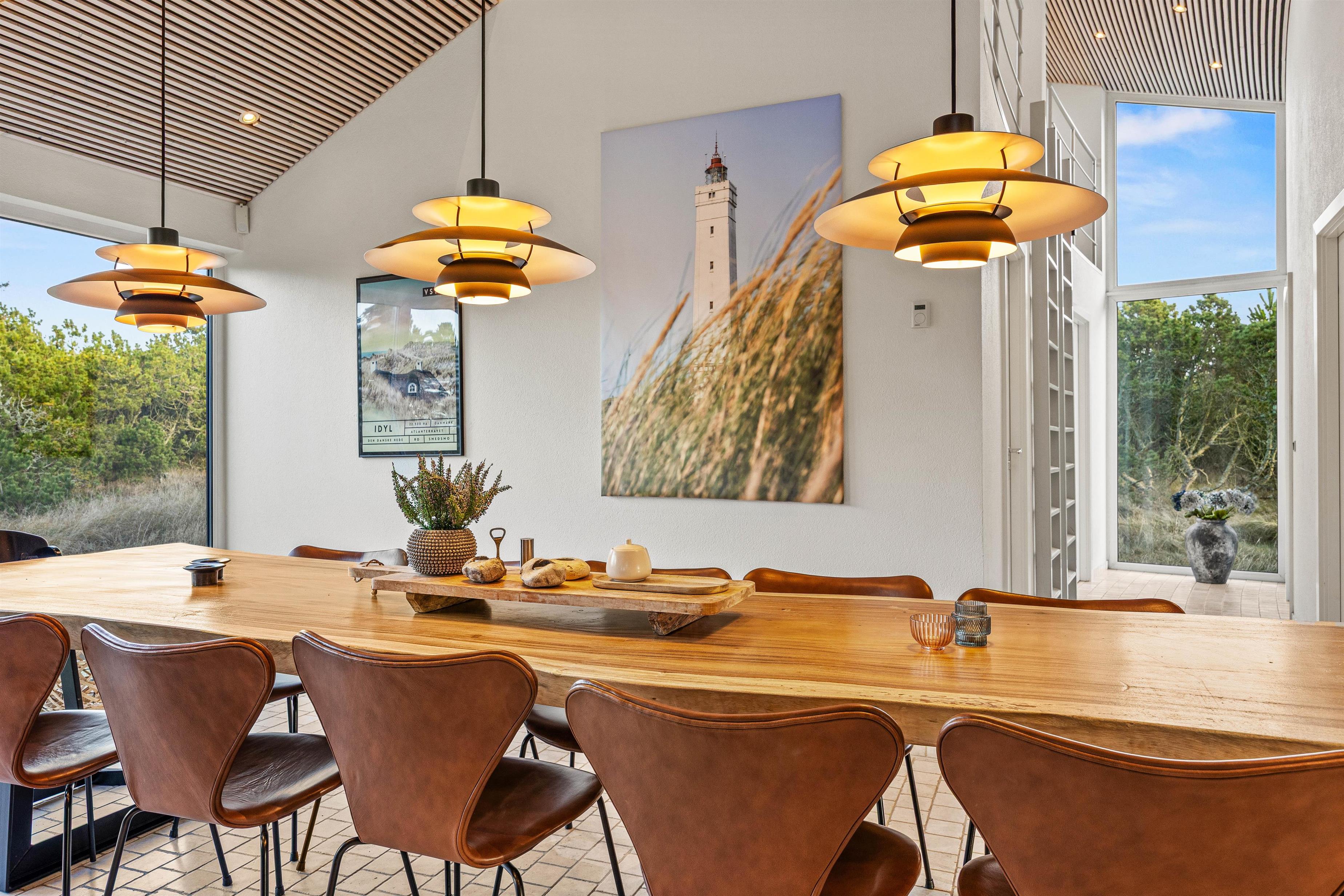 The spacious living area with open-plan kitchen and large dining table is perfect for spending time together. Through the large windows spanning the entire front of the house, you'll feel immersed in the Danish West Coast's natural environment. As the holiday home borders a large nature reserve, your only visitors on the private grounds will be the occasional deer or rabbit.