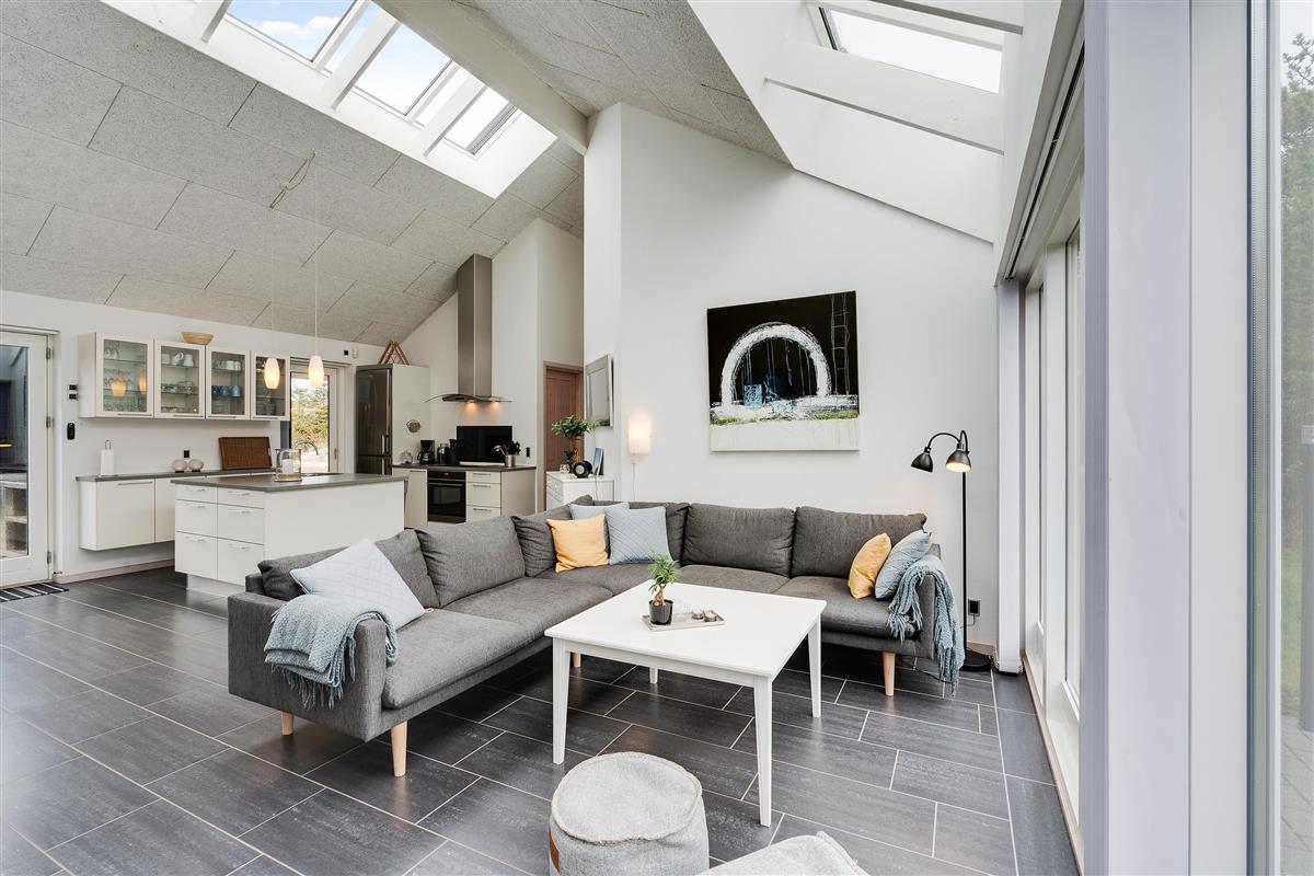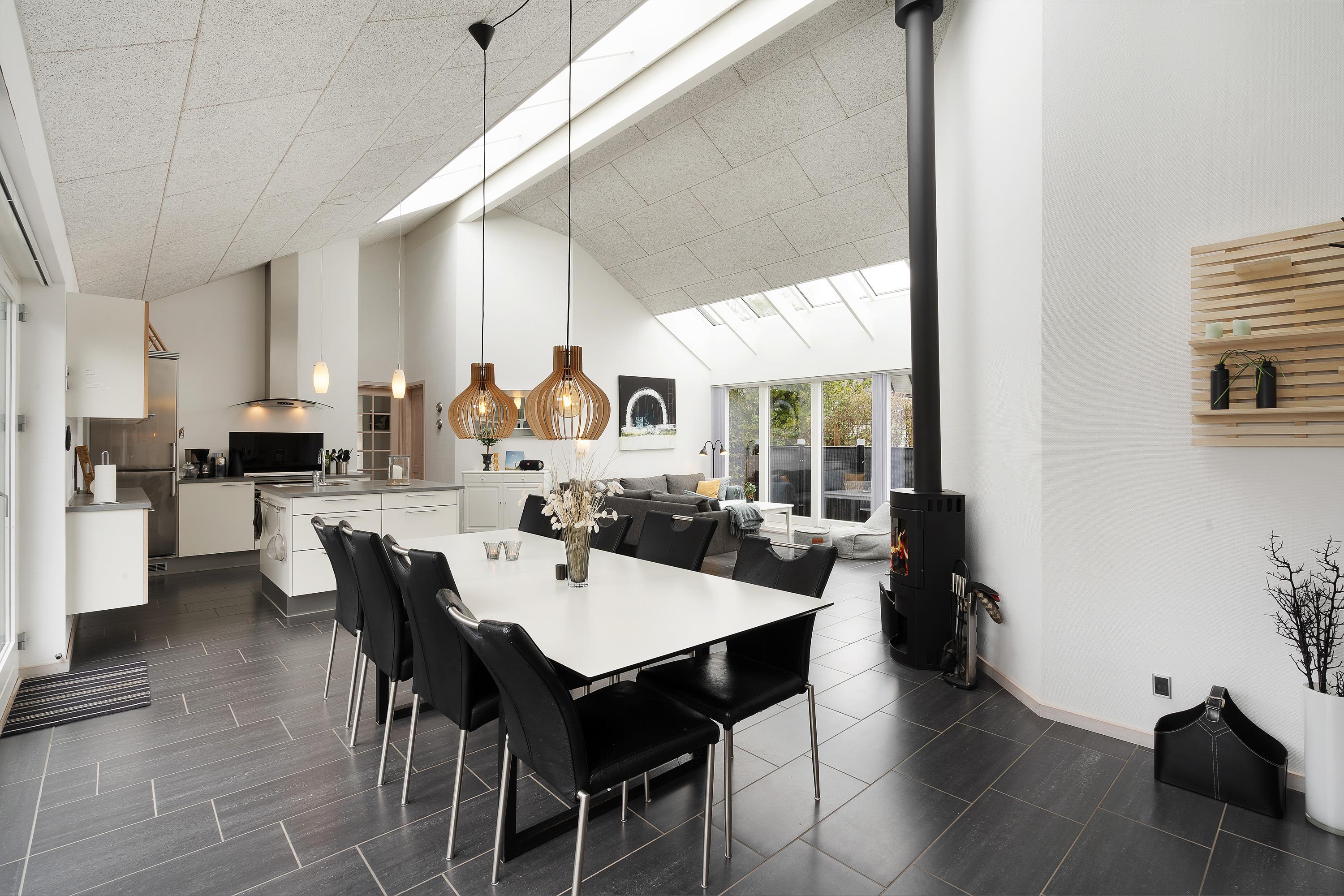 Upon entering the spacious living and dining area with its integrated kitchen, you'll appreciate the bright and welcoming atmosphere. Sloping ceilings throughout create high-ceilinged rooms, while large window sections flood the living area with natural light.