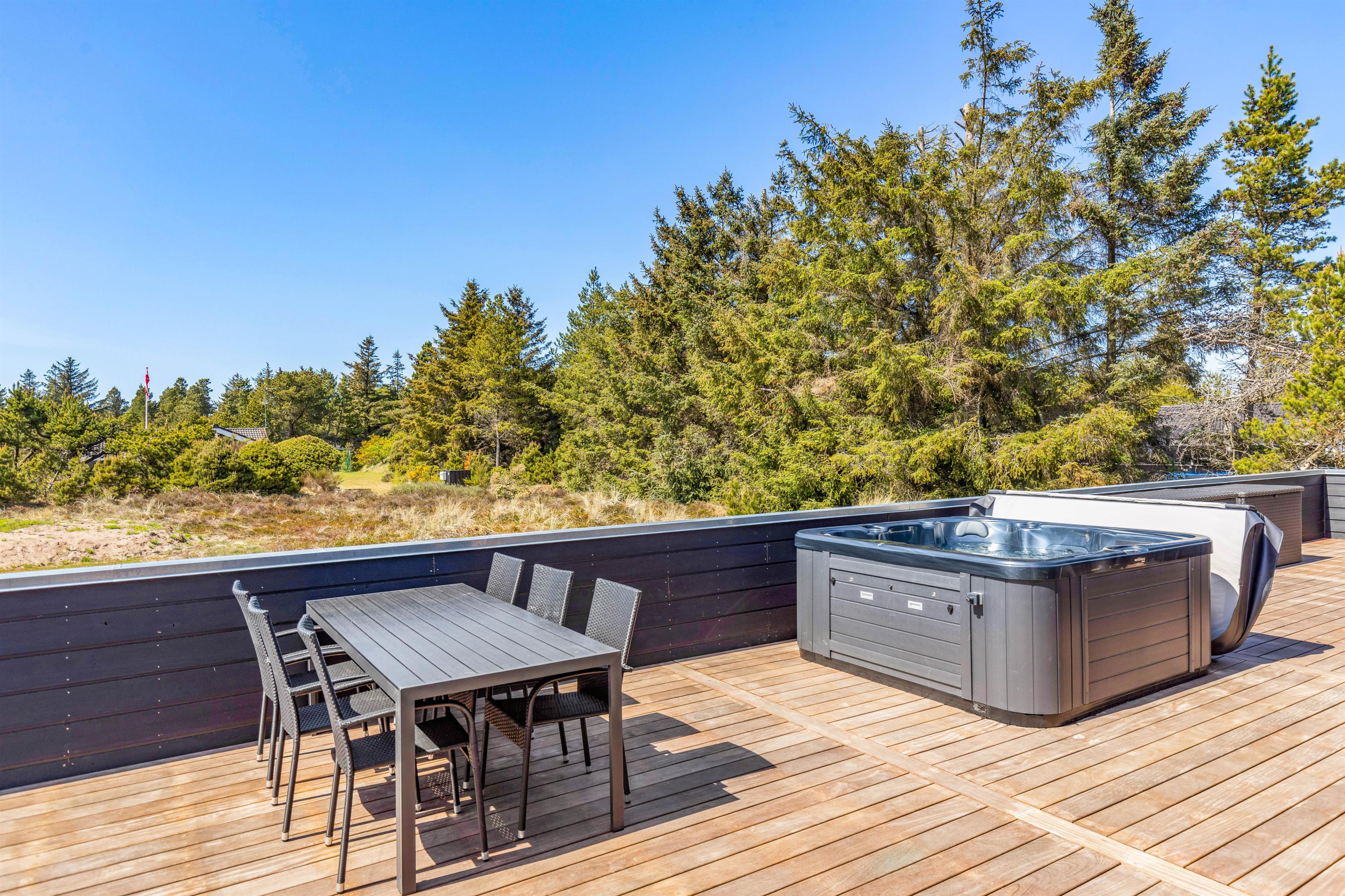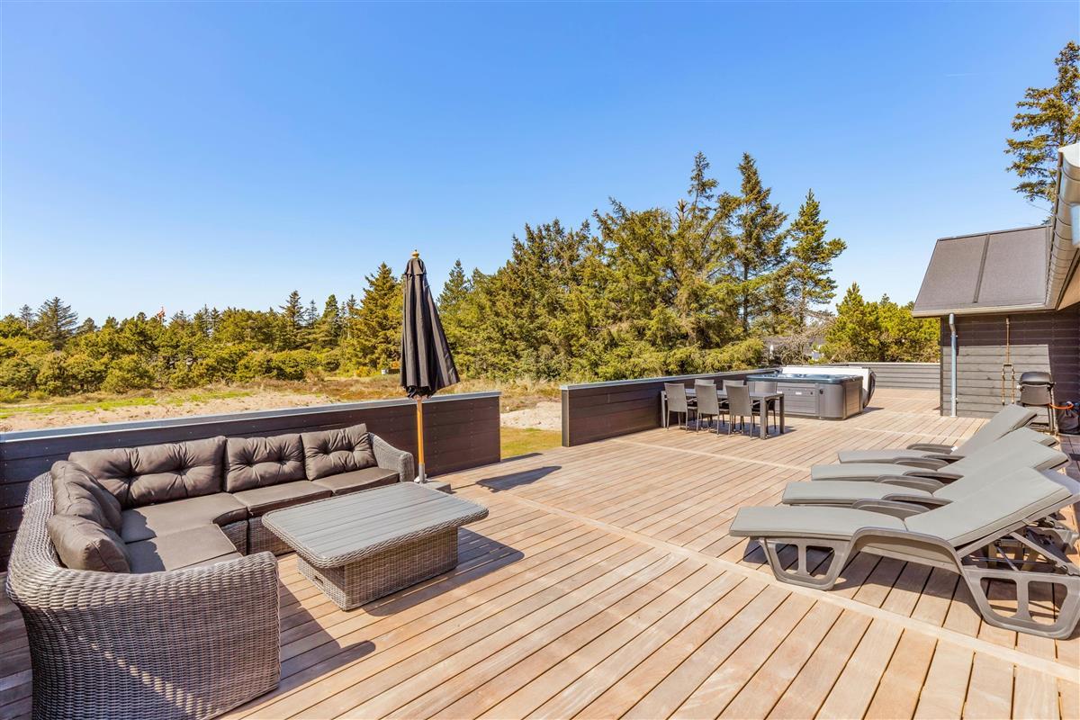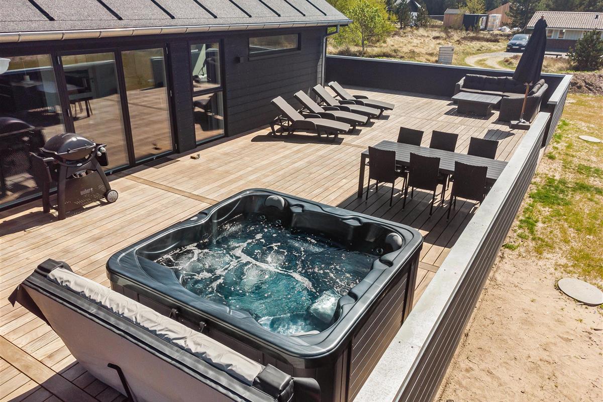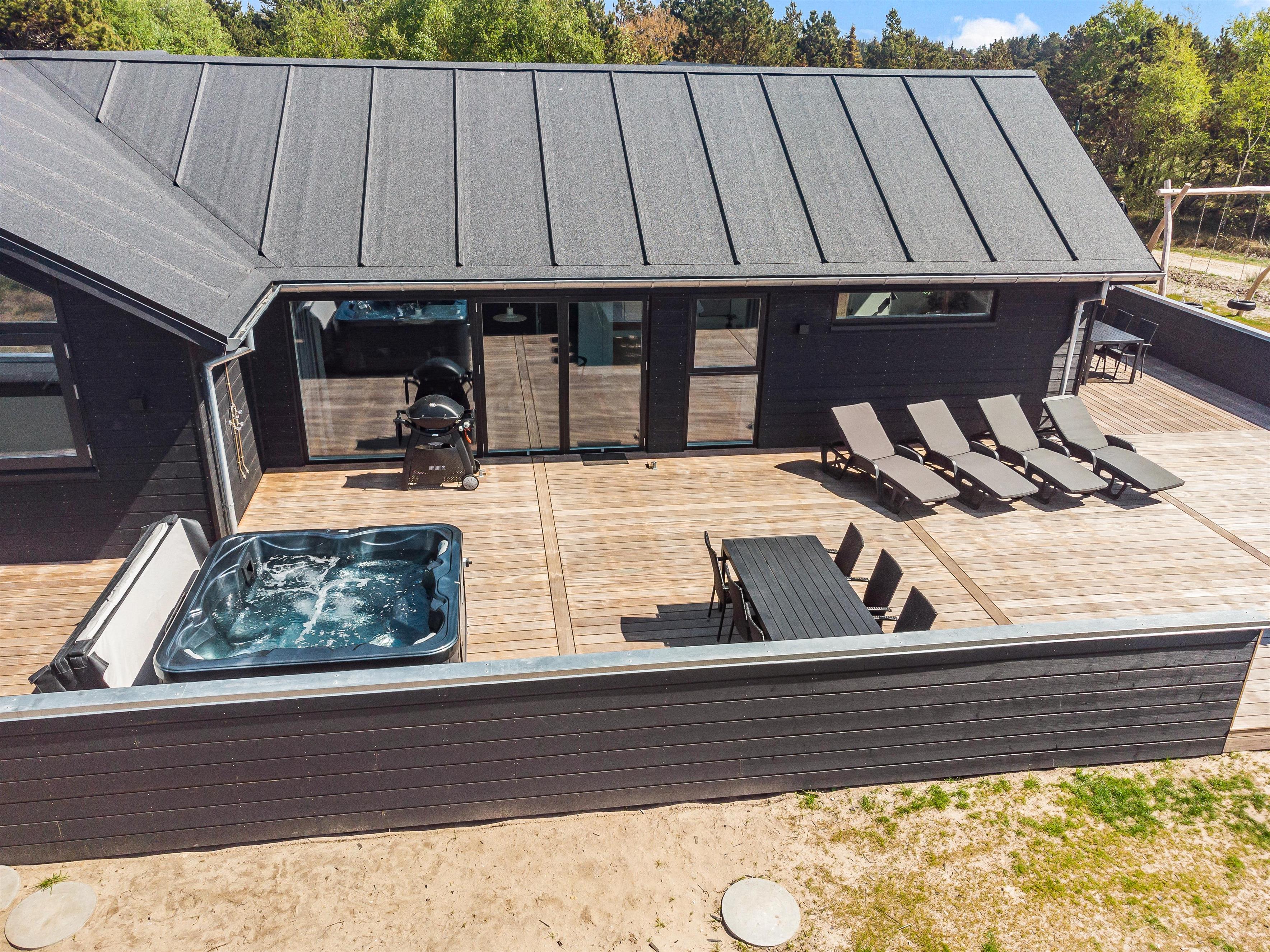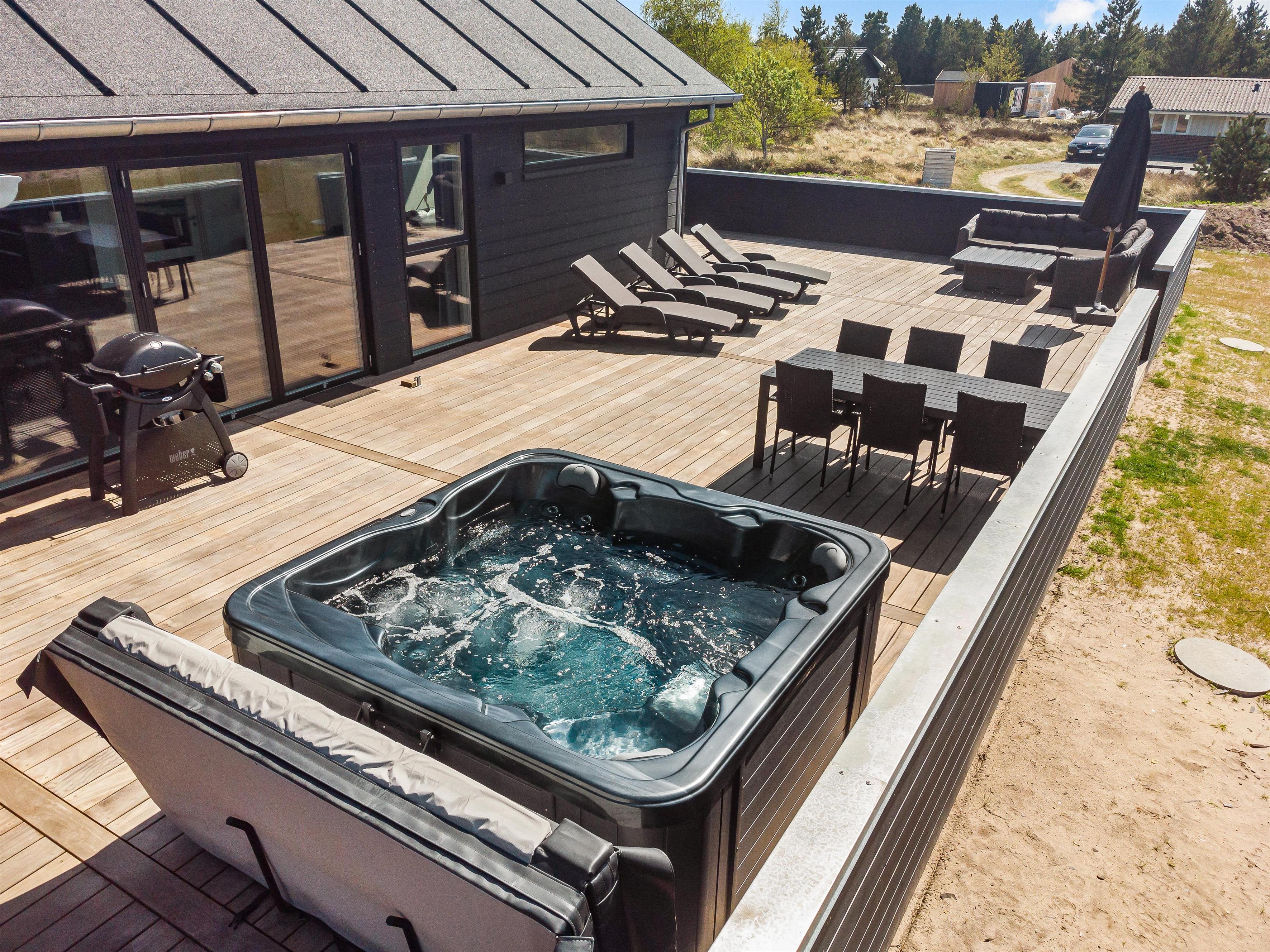 The spacious holiday home at Søren Gades Mark 28 in Blåvand features a 22-square-metre swimming pool, along with an outdoor hot tub and a beautiful sauna.