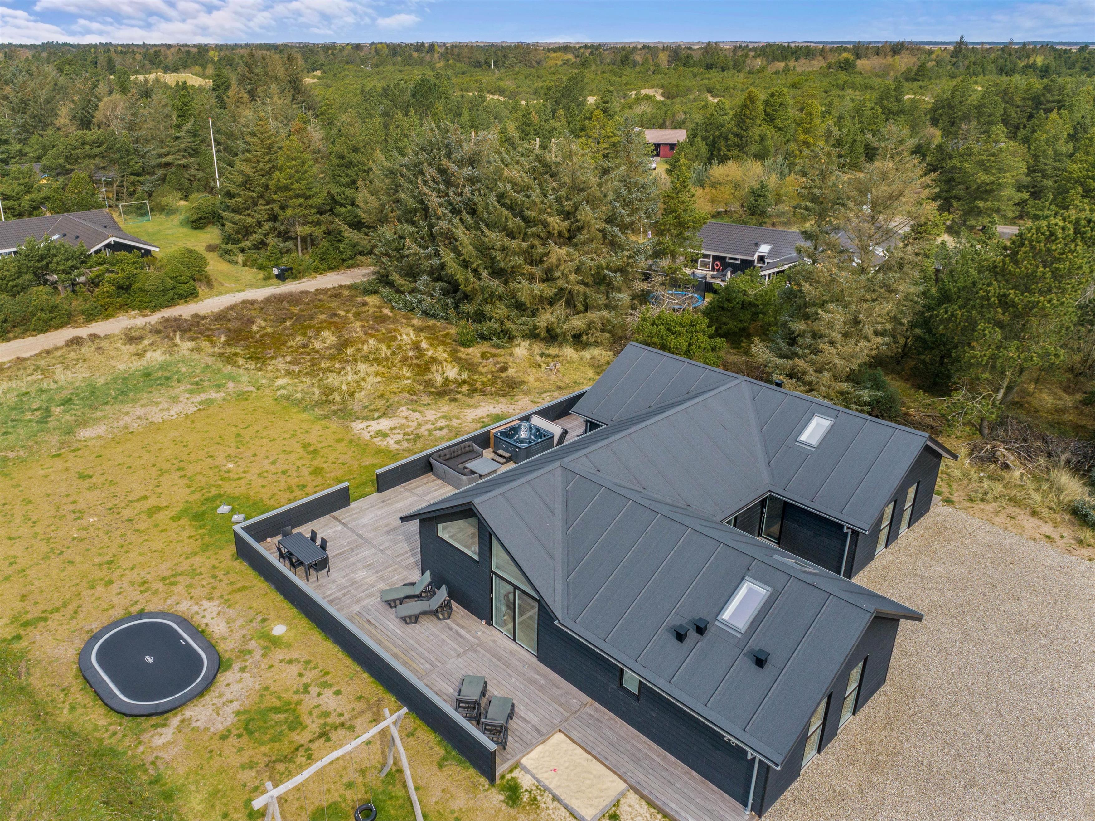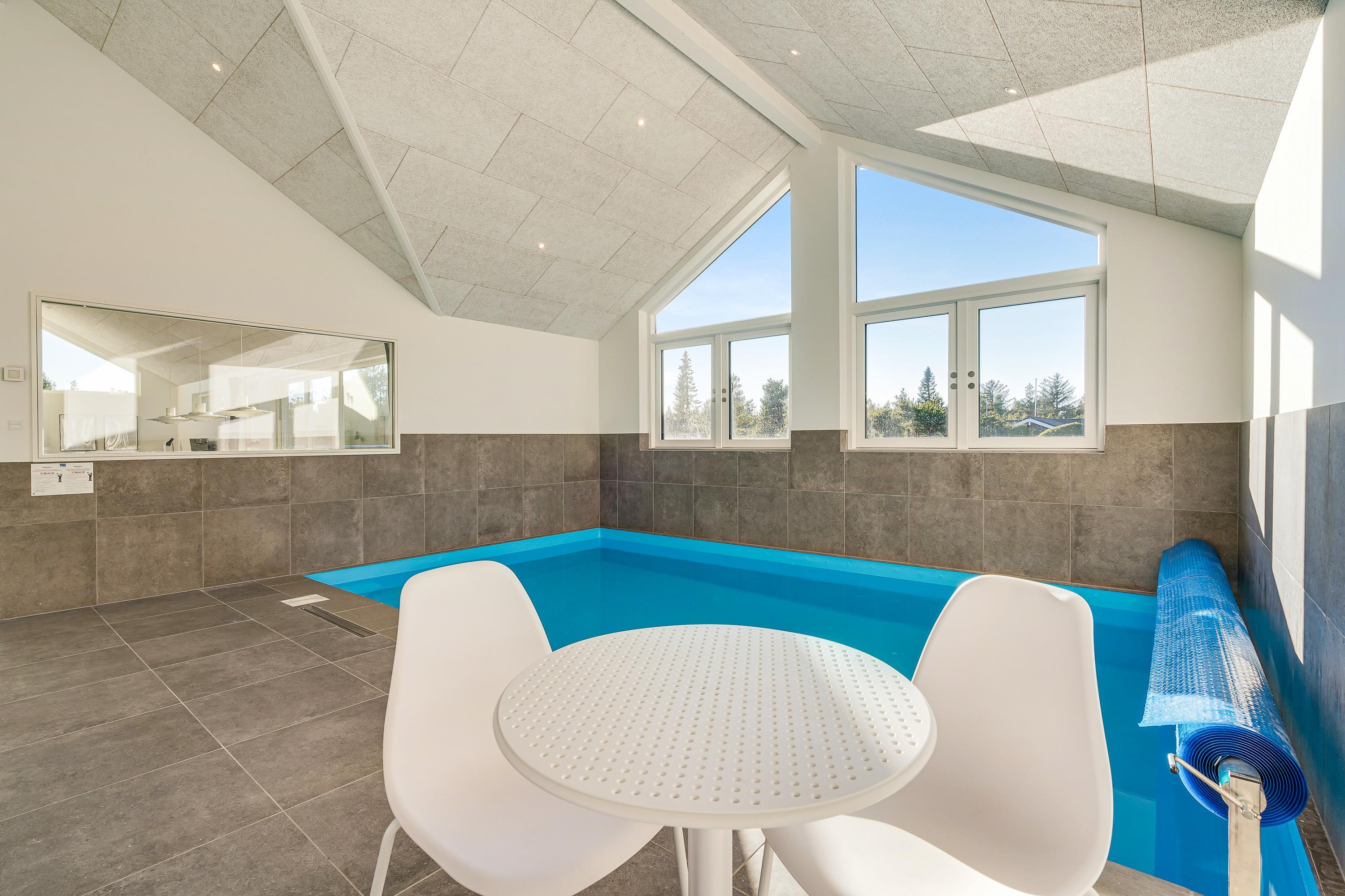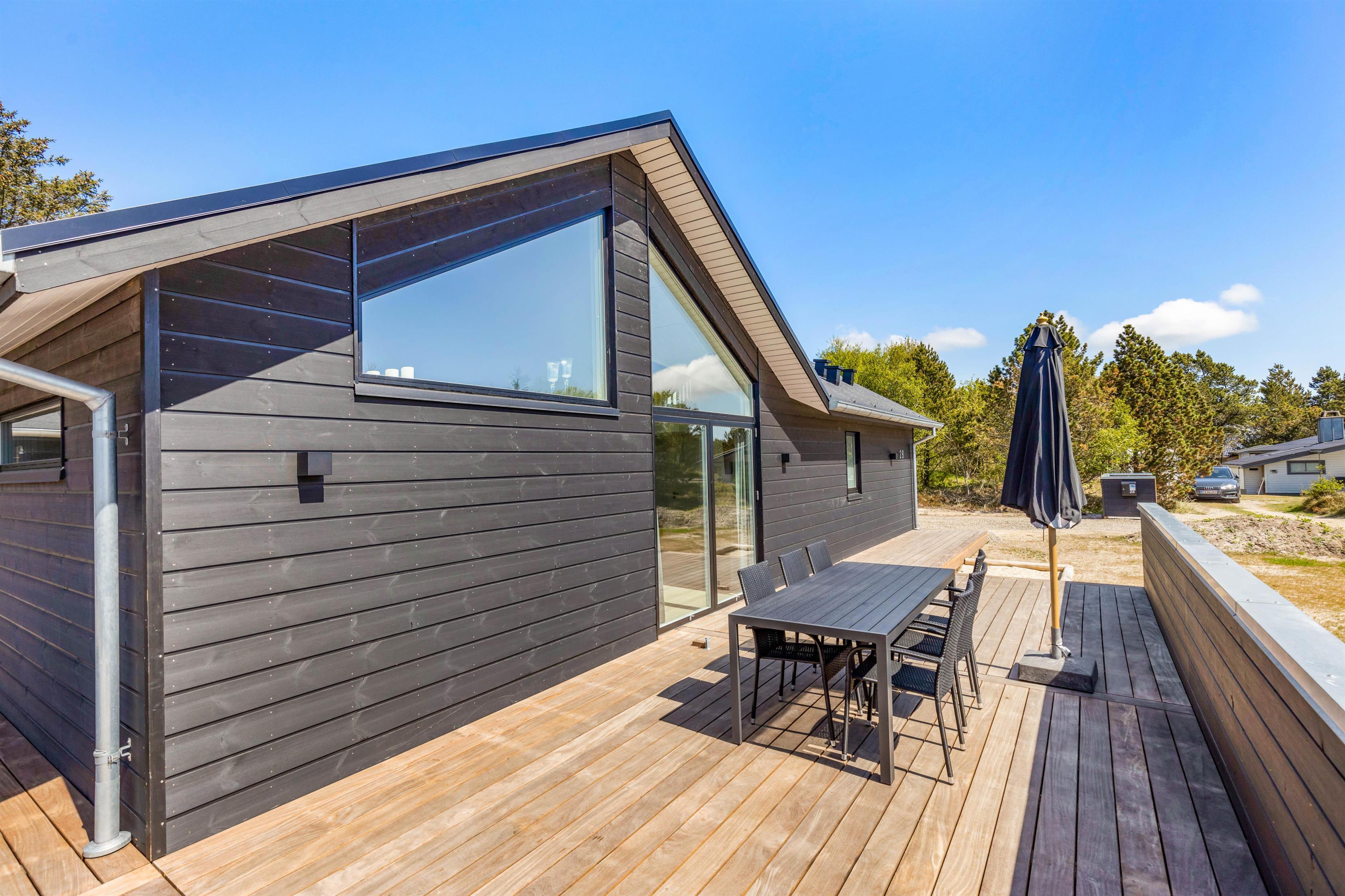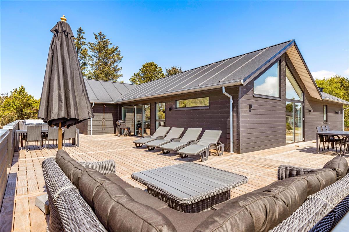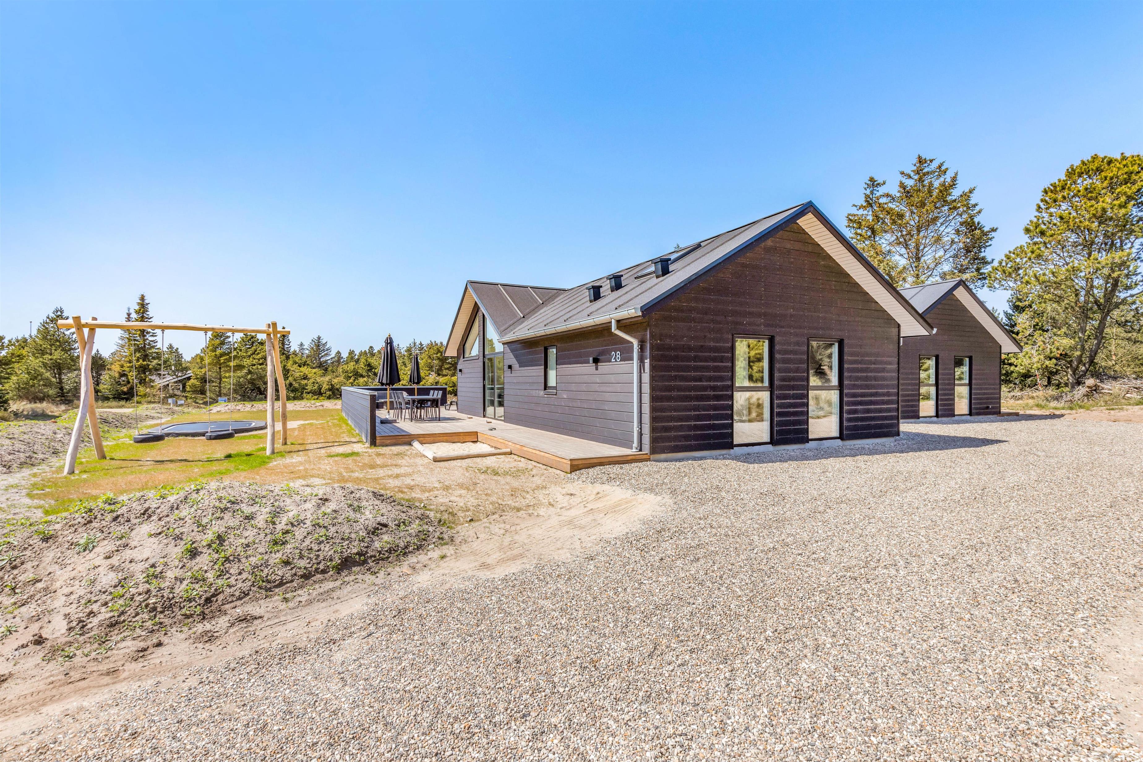 The spacious holiday home at Søren Gades Mark 28 in Blåvand features a 22-square-metre swimming pool, along with an outdoor hot tub and a beautiful sauna.