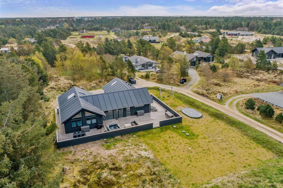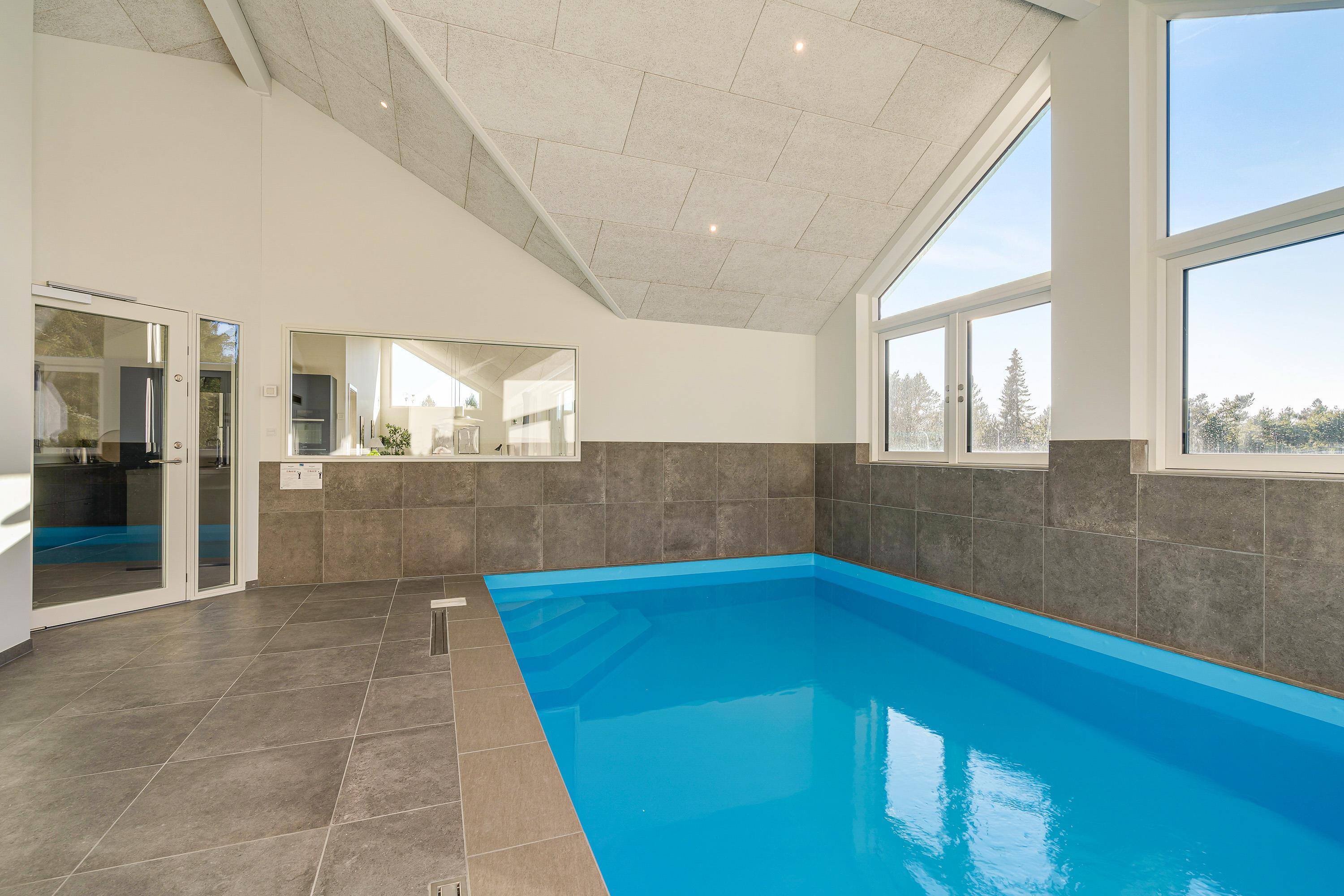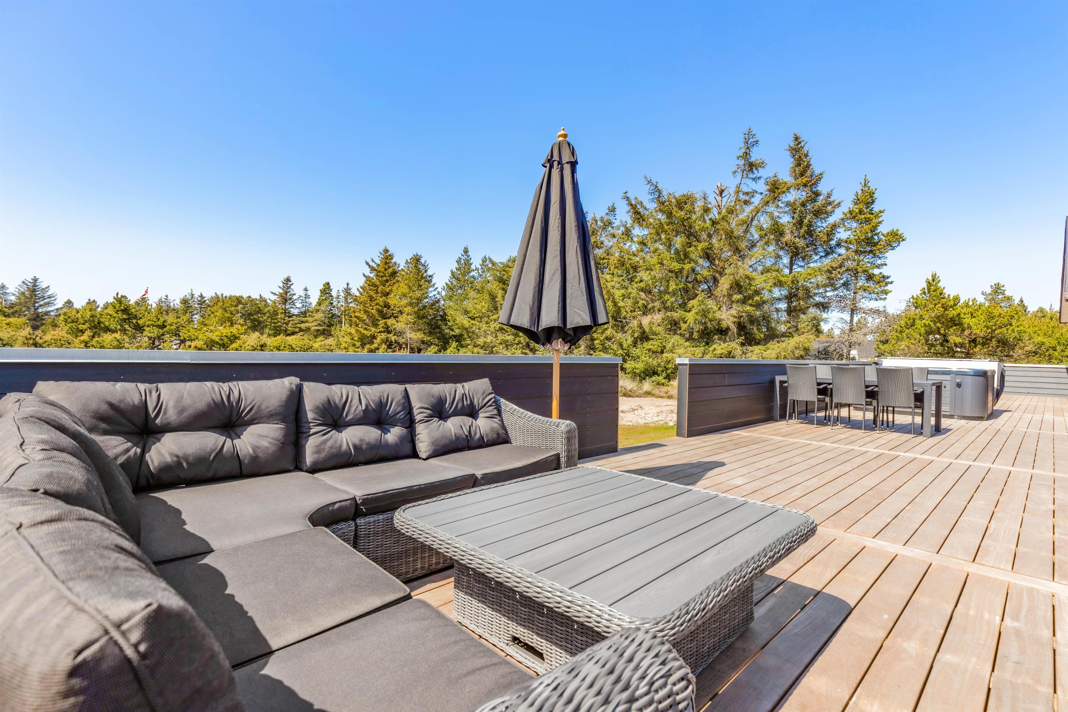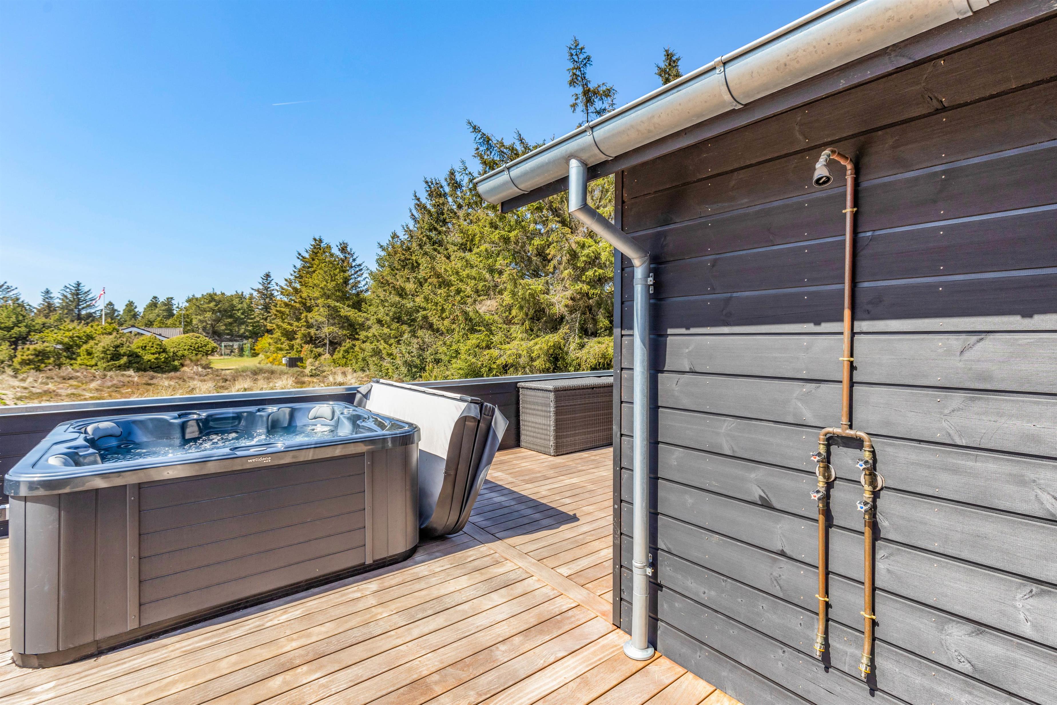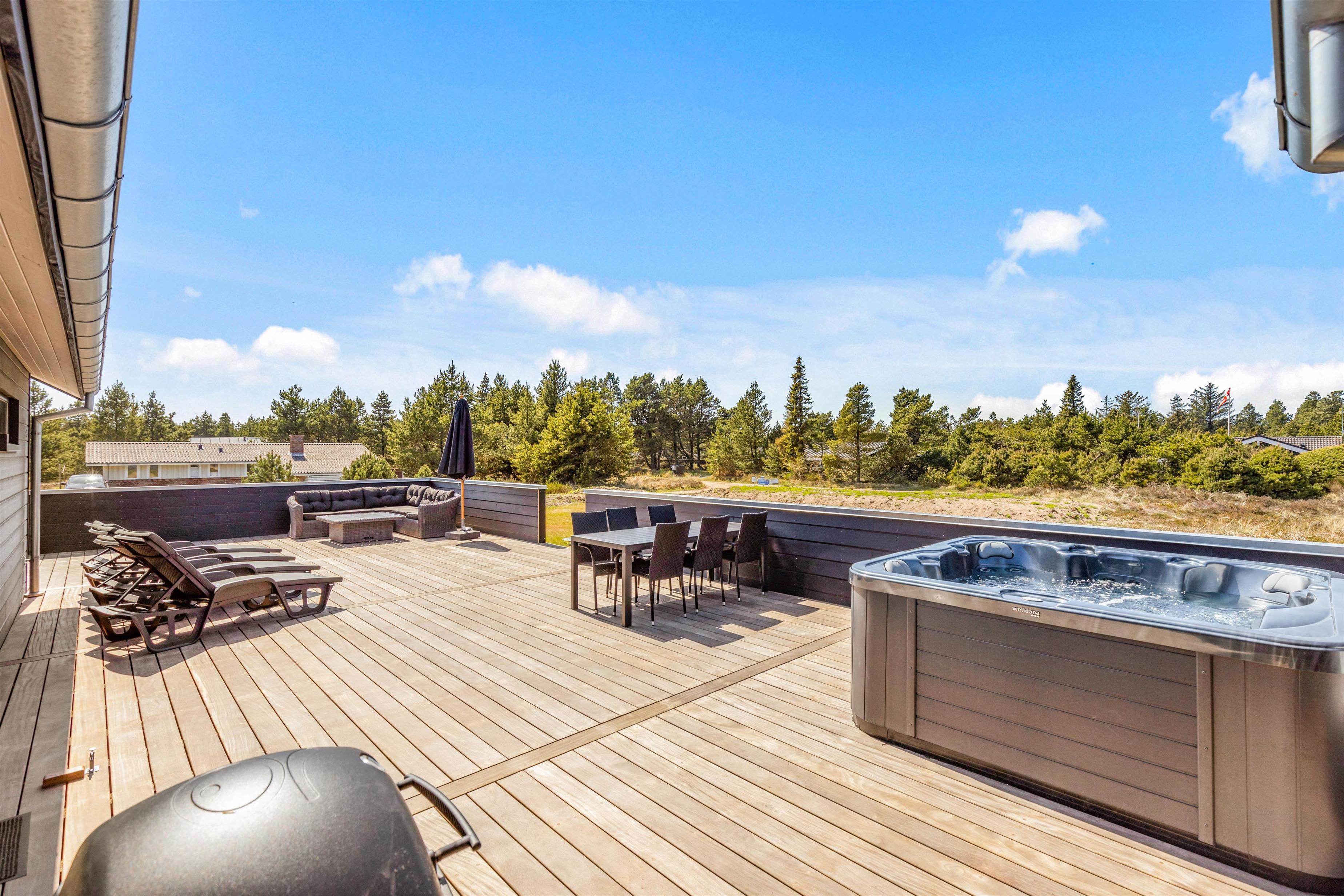The spacious holiday home at Søren Gades Mark 28 in Blåvand features a 22-square-metre swimming pool, along with an outdoor hot tub and a beautiful sauna.
