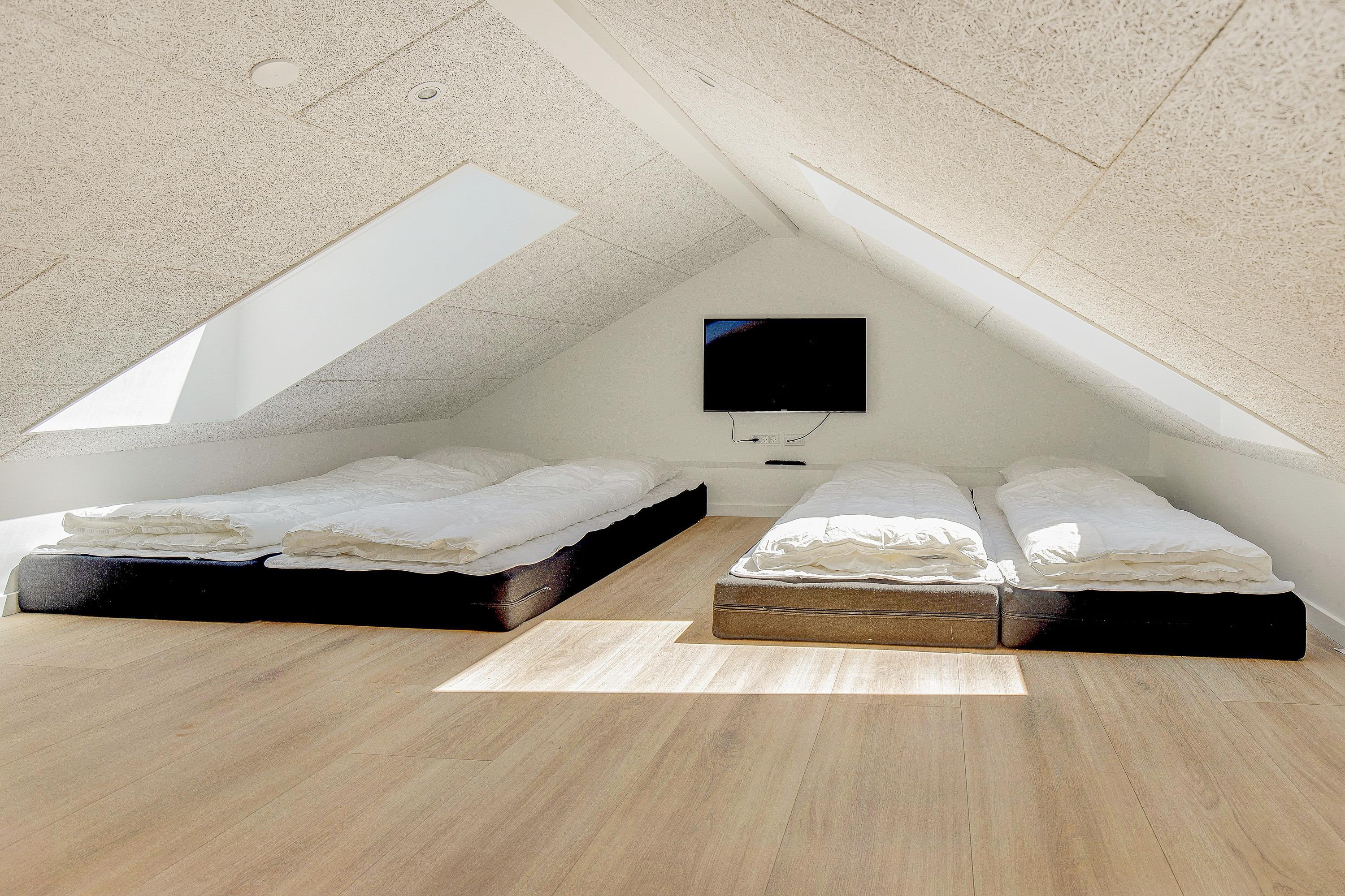 This holiday home has five bedrooms and two bathrooms with underfloor heating, so there's no need to queue in the morning or worry about cold feet. The two remaining bedrooms are located in the mezzanine area.