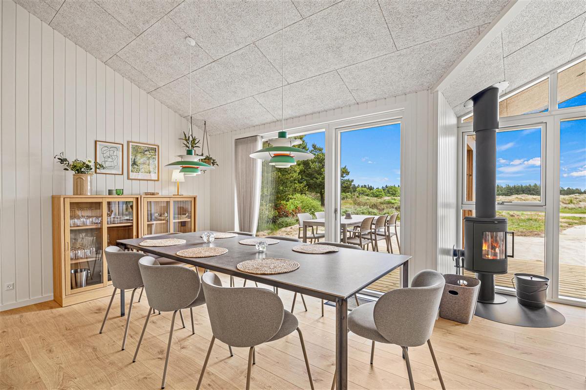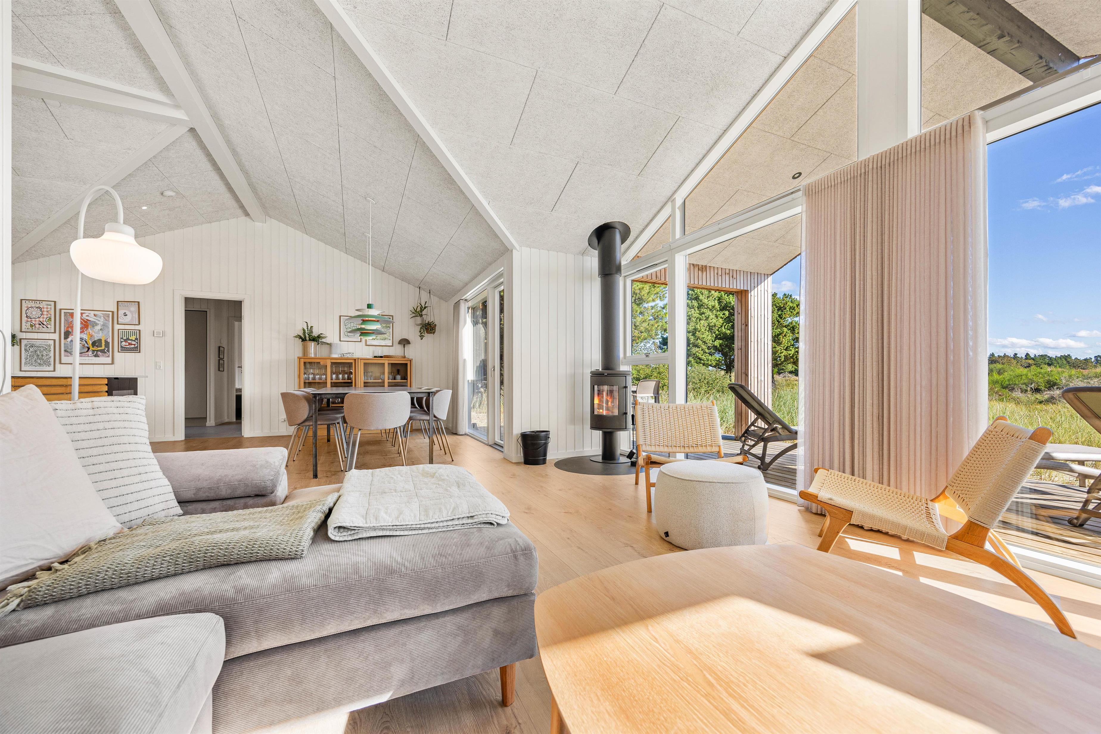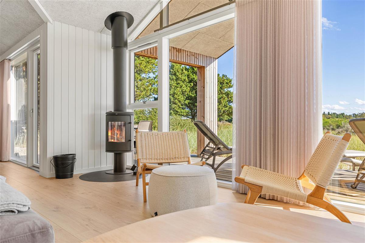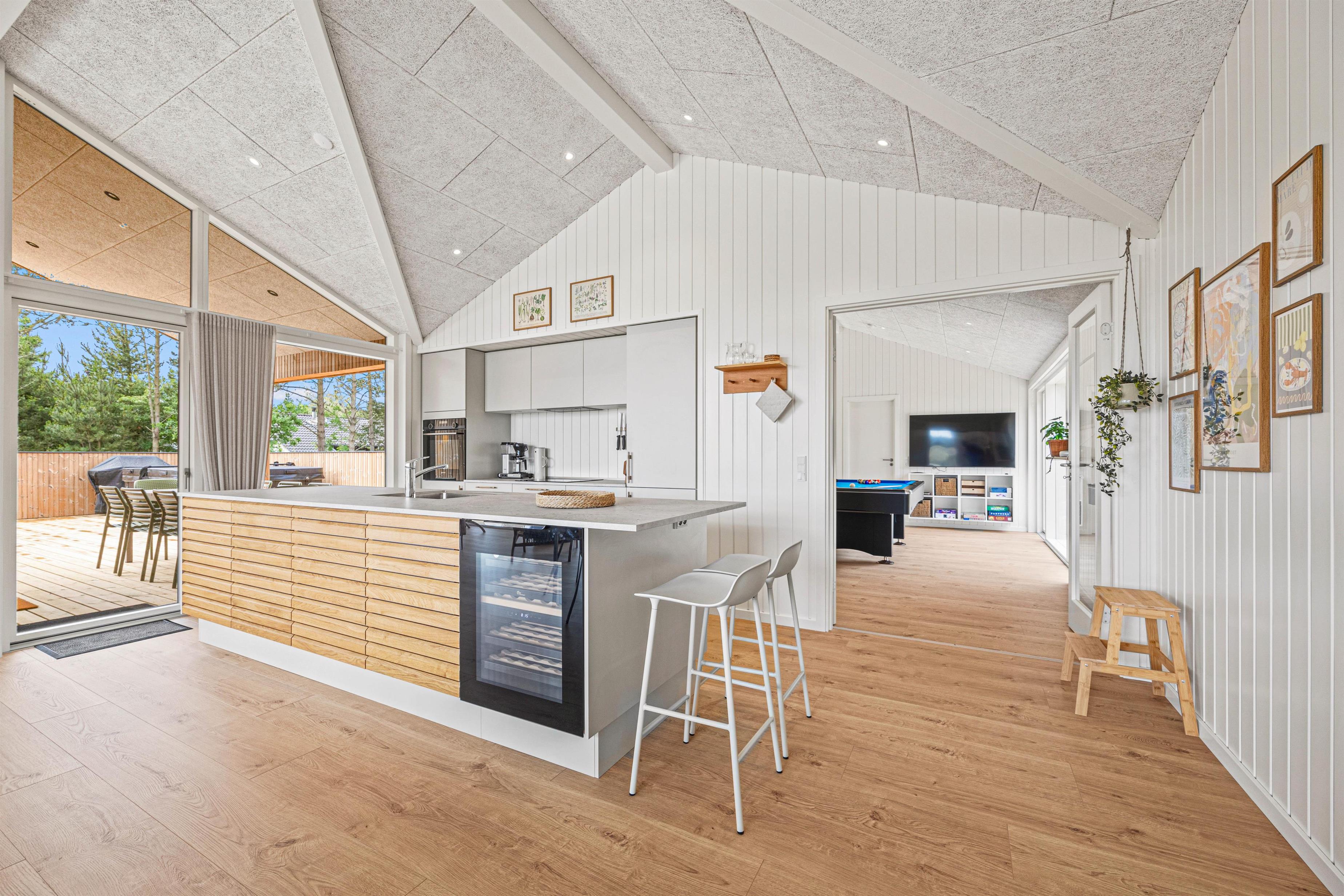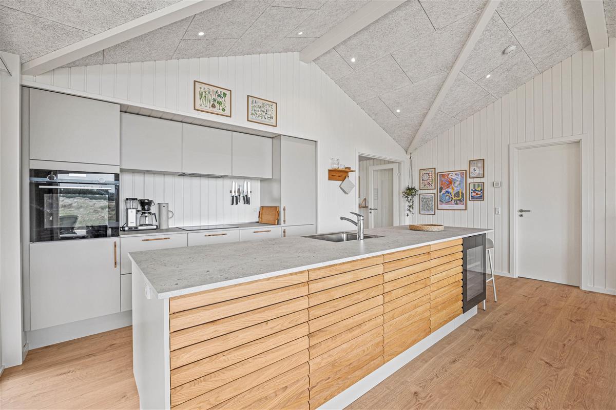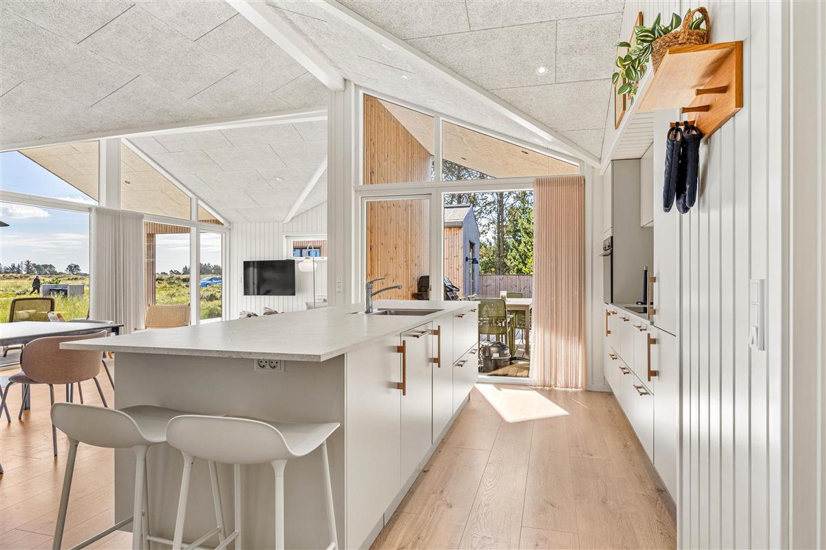 This holiday home at Gl. Mælkevej 70 is ideal for two families or friends holidaying together. The well-thought-out layout provides ample opportunity for privacy when desired. The house is furnished in Scandinavian style with modern design elements and delights with many beautiful details. The living area, with its modern kitchen and dining table, is bathed in wonderful light through large window fronts. Brightness, high wooden ceilings and the wood-burning stove create the perfect hygge atmosphere. The new, modern kitchen has everything you need and is separated from the living area by a large kitchen island. The sofa offers plenty of space for everyone to relax, enjoy a film evening or take in the beautiful views of nature. Add a perfectly chilled glass of wine from the wine fridge, and your relaxation can begin.