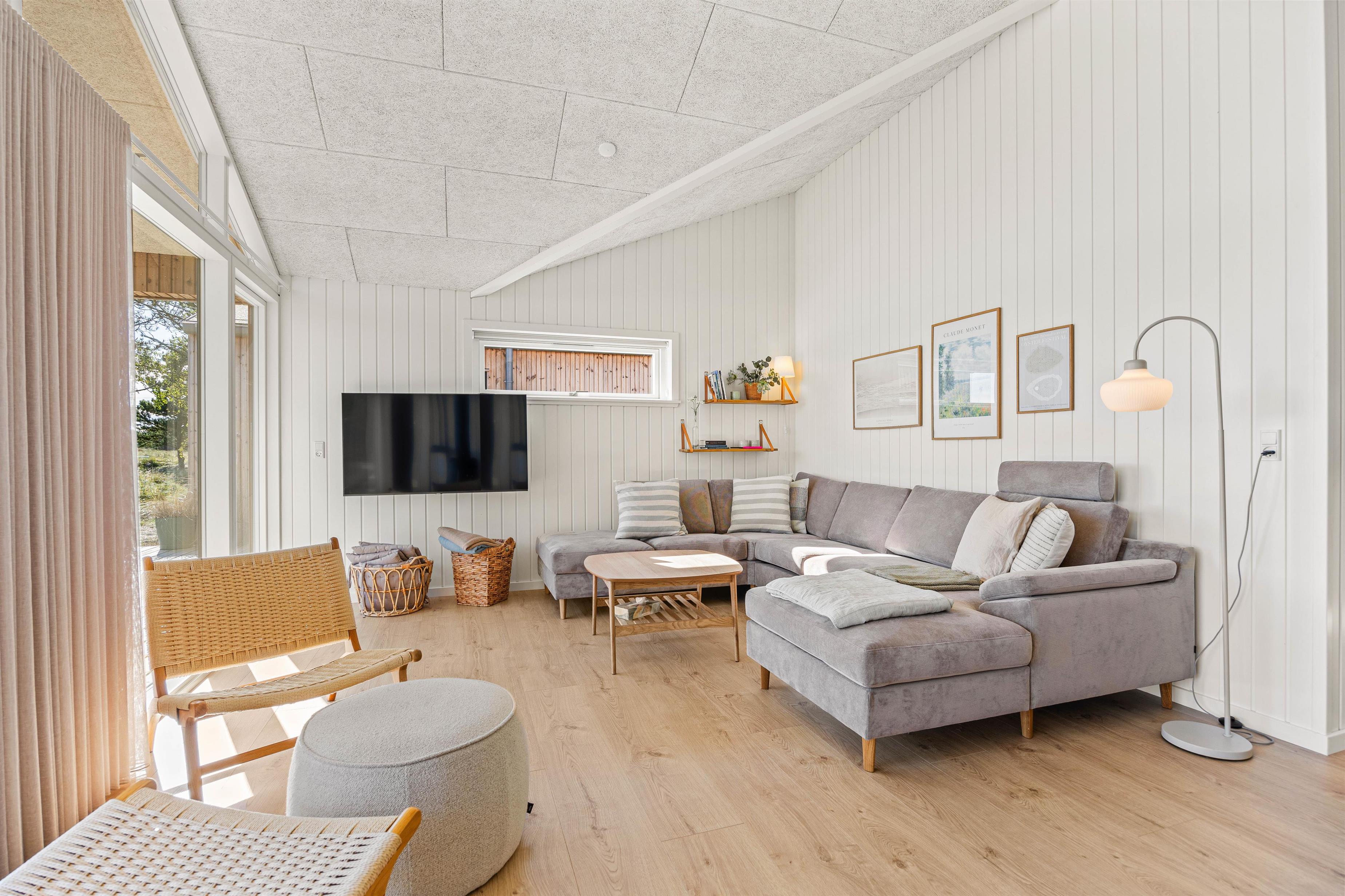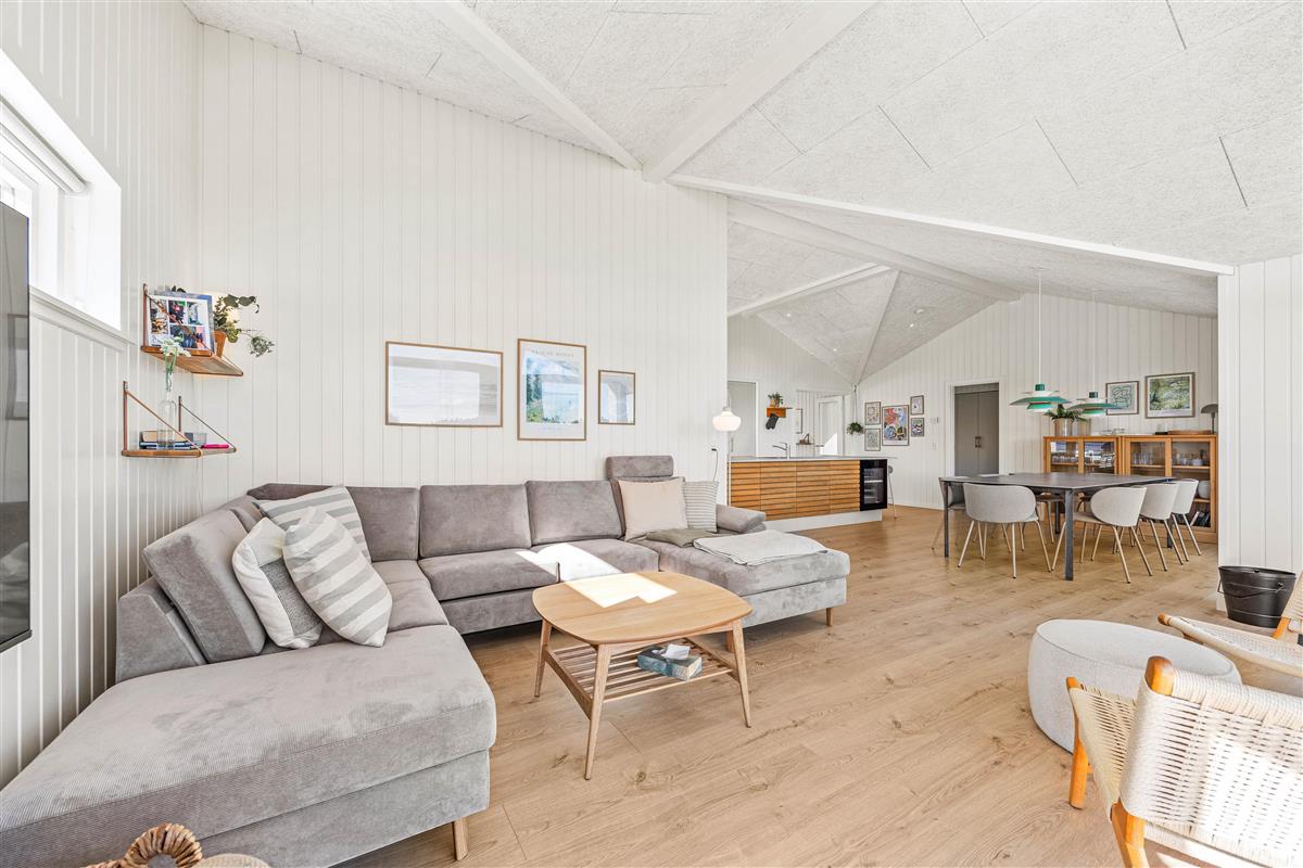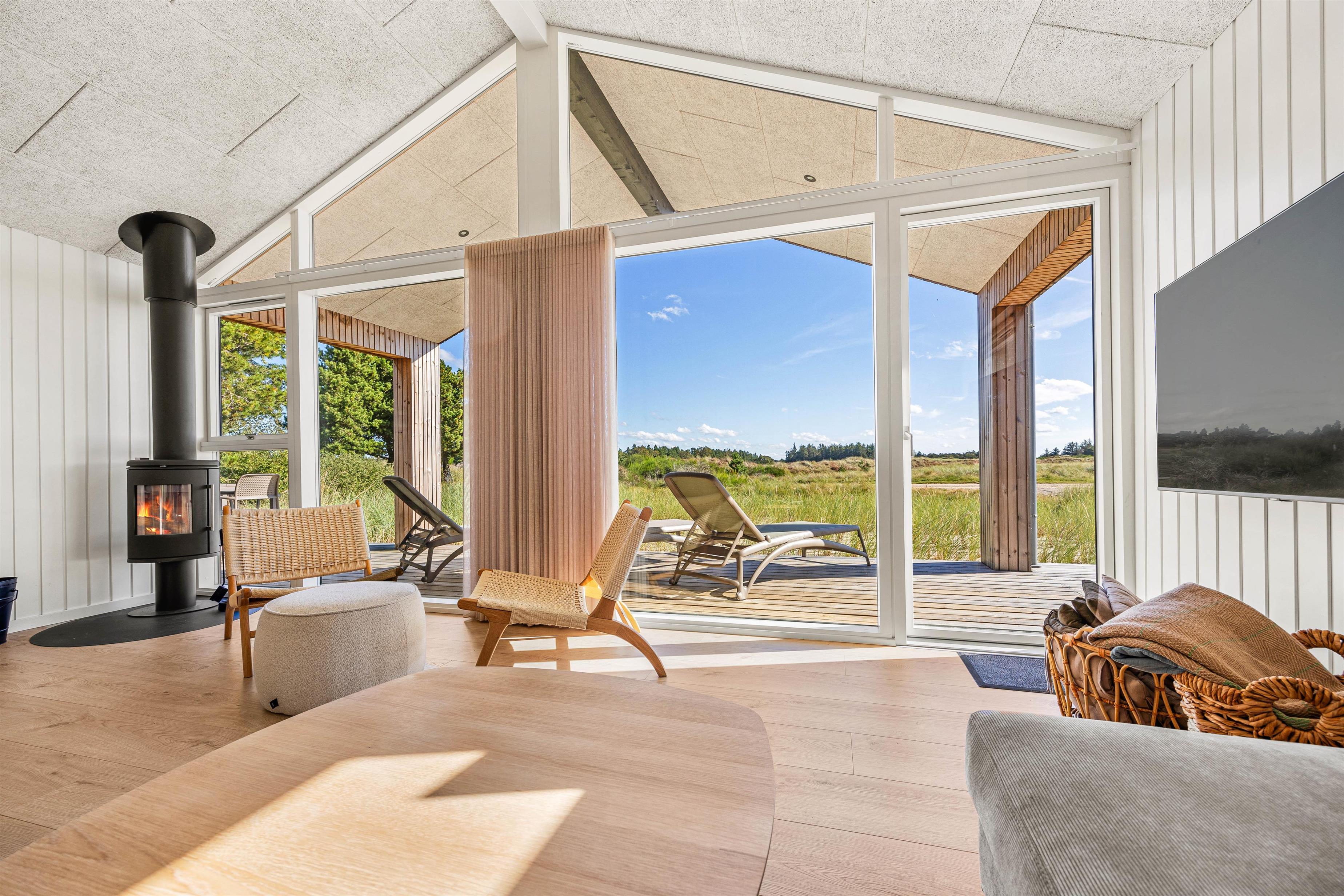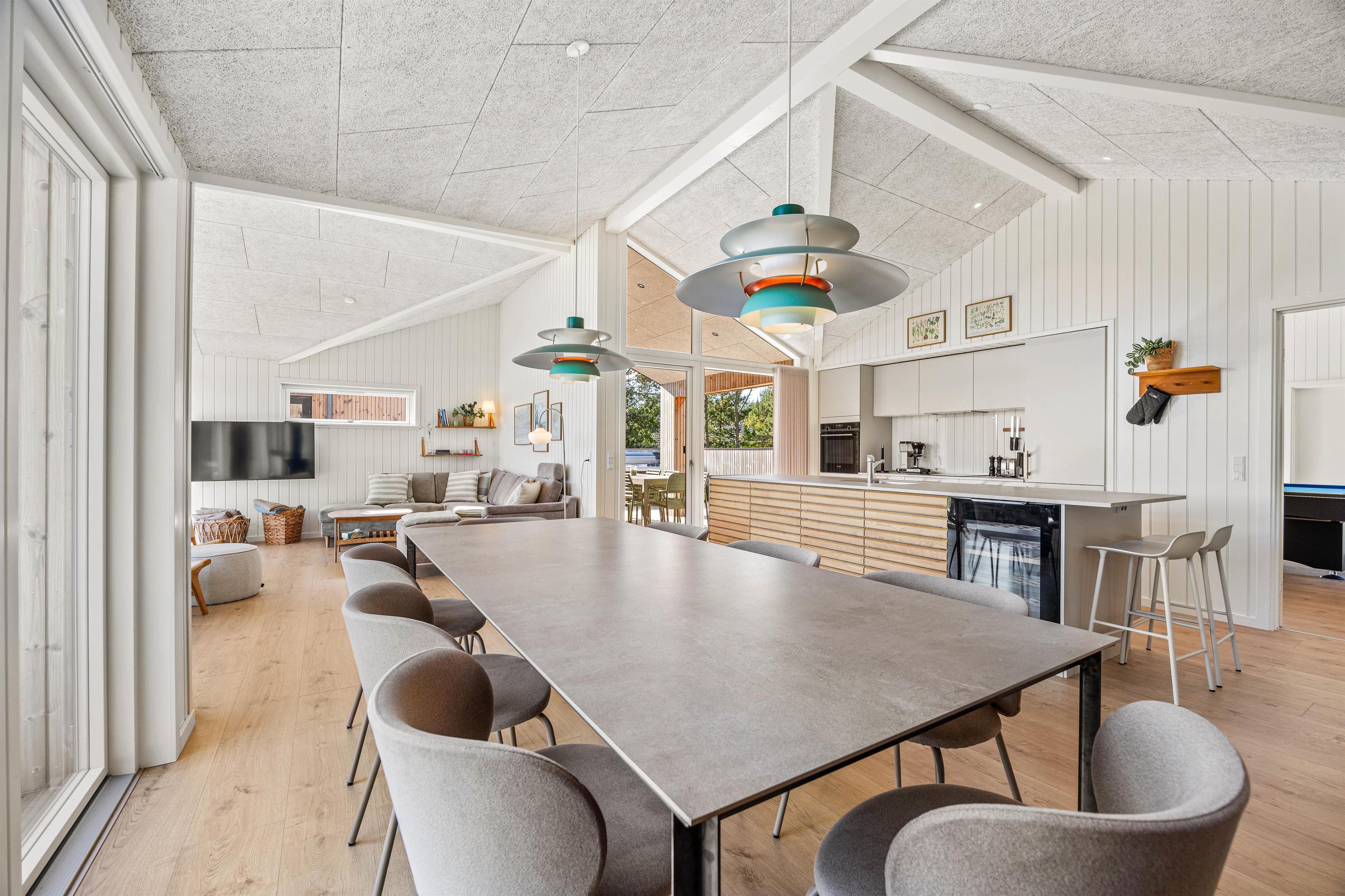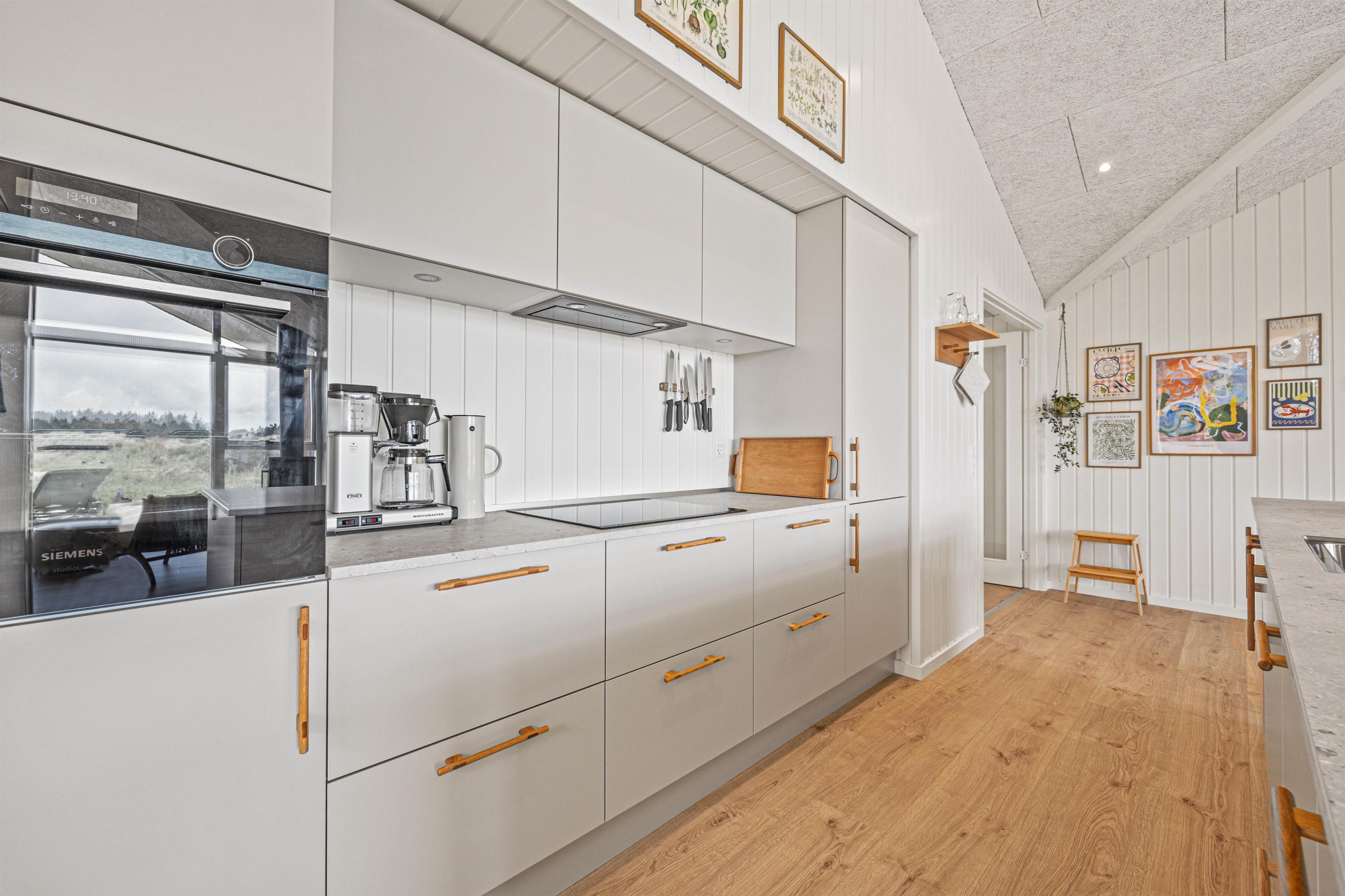 This holiday home at Gl. Mælkevej 70 is ideal for two families or friends holidaying together. The well-thought-out layout provides ample opportunity for privacy when desired. The house is furnished in Scandinavian style with modern design elements and delights with many beautiful details. The living area, with its modern kitchen and dining table, is bathed in wonderful light through large window fronts. Brightness, high wooden ceilings and the wood-burning stove create the perfect hygge atmosphere. The new, modern kitchen has everything you need and is separated from the living area by a large kitchen island. The sofa offers plenty of space for everyone to relax, enjoy a film evening or take in the beautiful views of nature. Add a perfectly chilled glass of wine from the wine fridge, and your relaxation can begin.