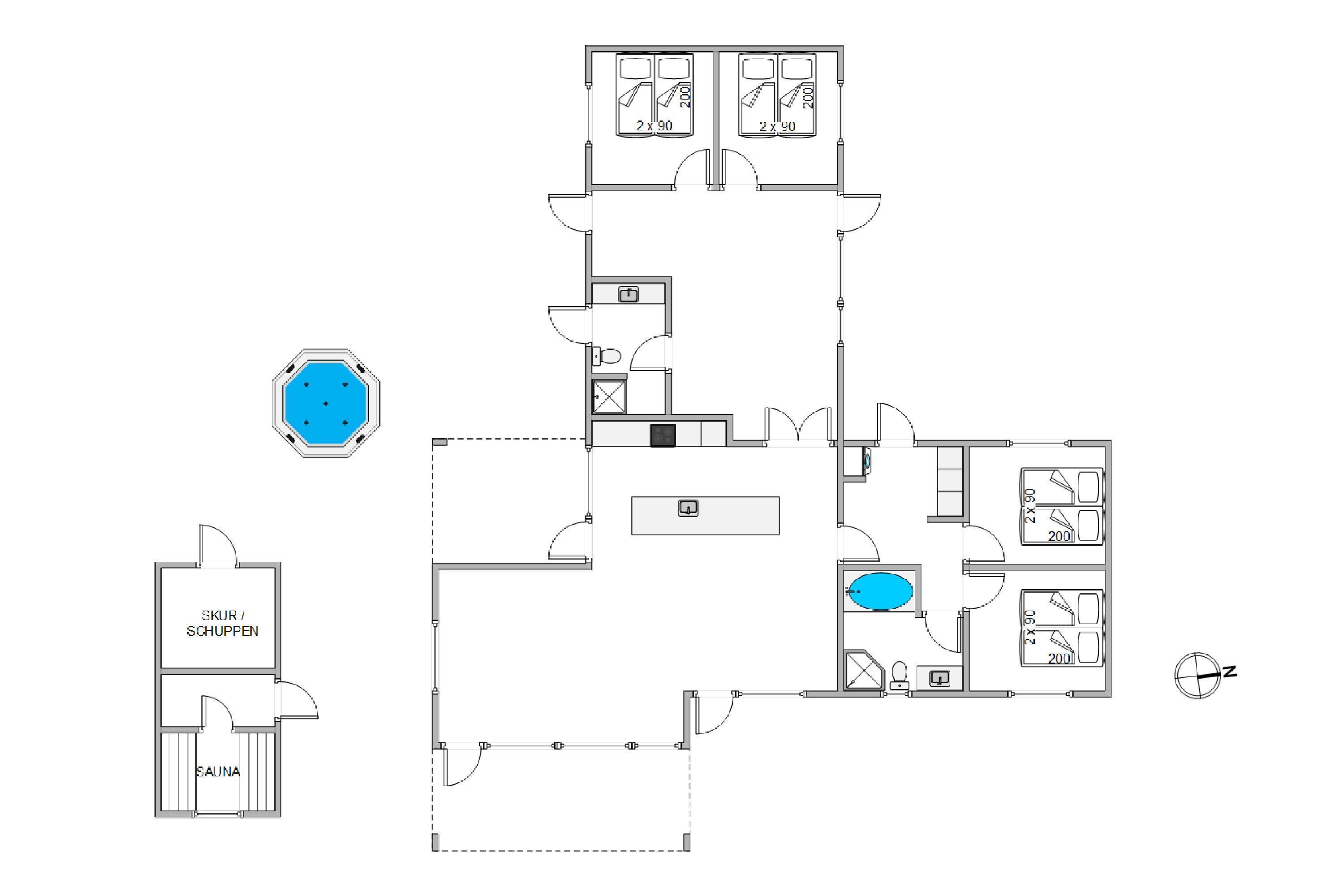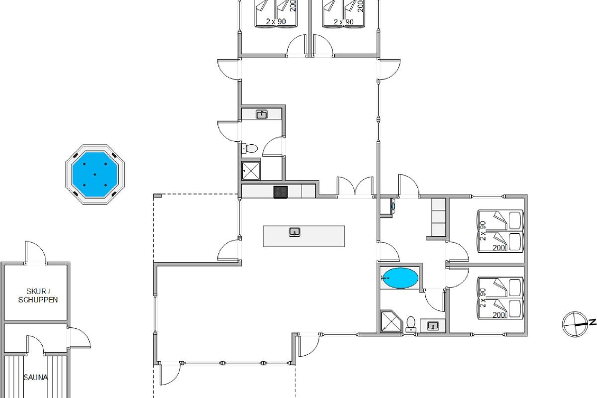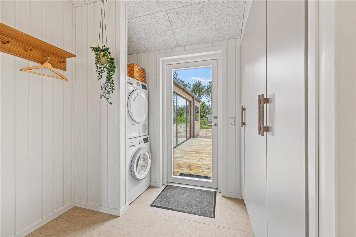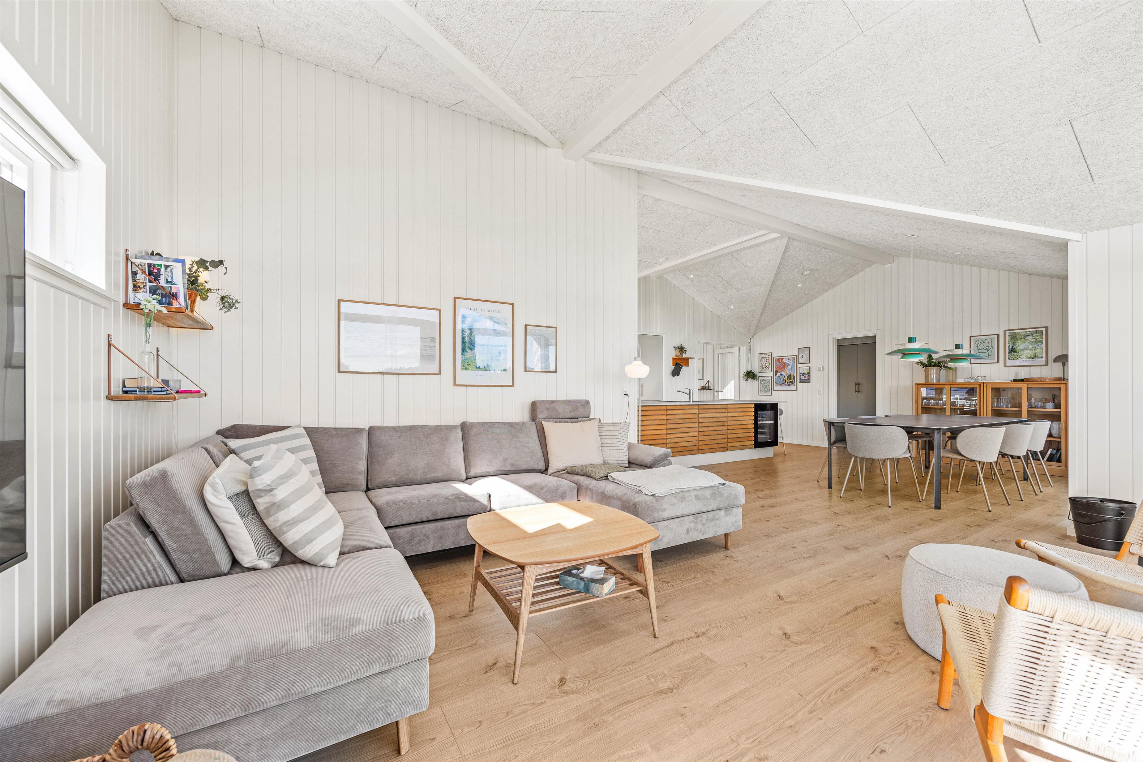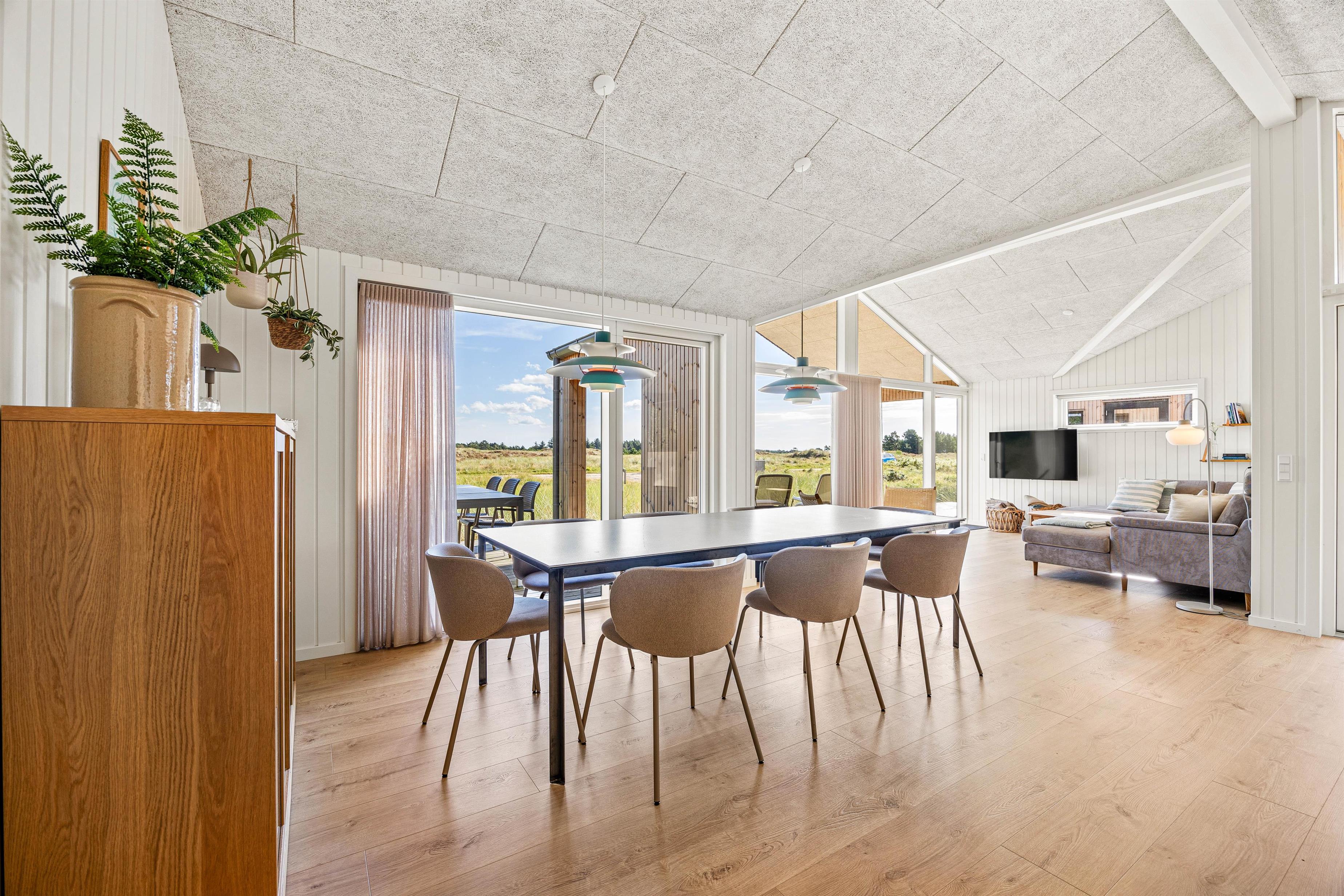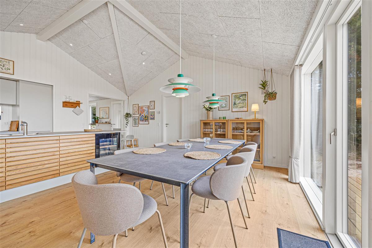 This holiday home at Gl. Mælkevej 70 is ideal for two families or friends holidaying together. The well-thought-out layout provides ample opportunity for privacy when desired. The house is furnished in Scandinavian style with modern design elements and delights with many beautiful details. The living area, with its modern kitchen and dining table, is bathed in wonderful light through large window fronts. Brightness, high wooden ceilings and the wood-burning stove create the perfect hygge atmosphere. The new, modern kitchen has everything you need and is separated from the living area by a large kitchen island. The sofa offers plenty of space for everyone to relax, enjoy a film evening or take in the beautiful views of nature. Add a perfectly chilled glass of wine from the wine fridge, and your relaxation can begin.
