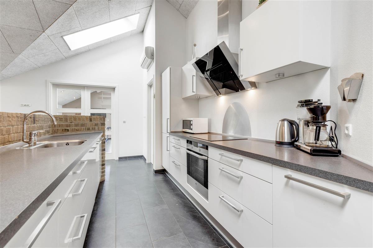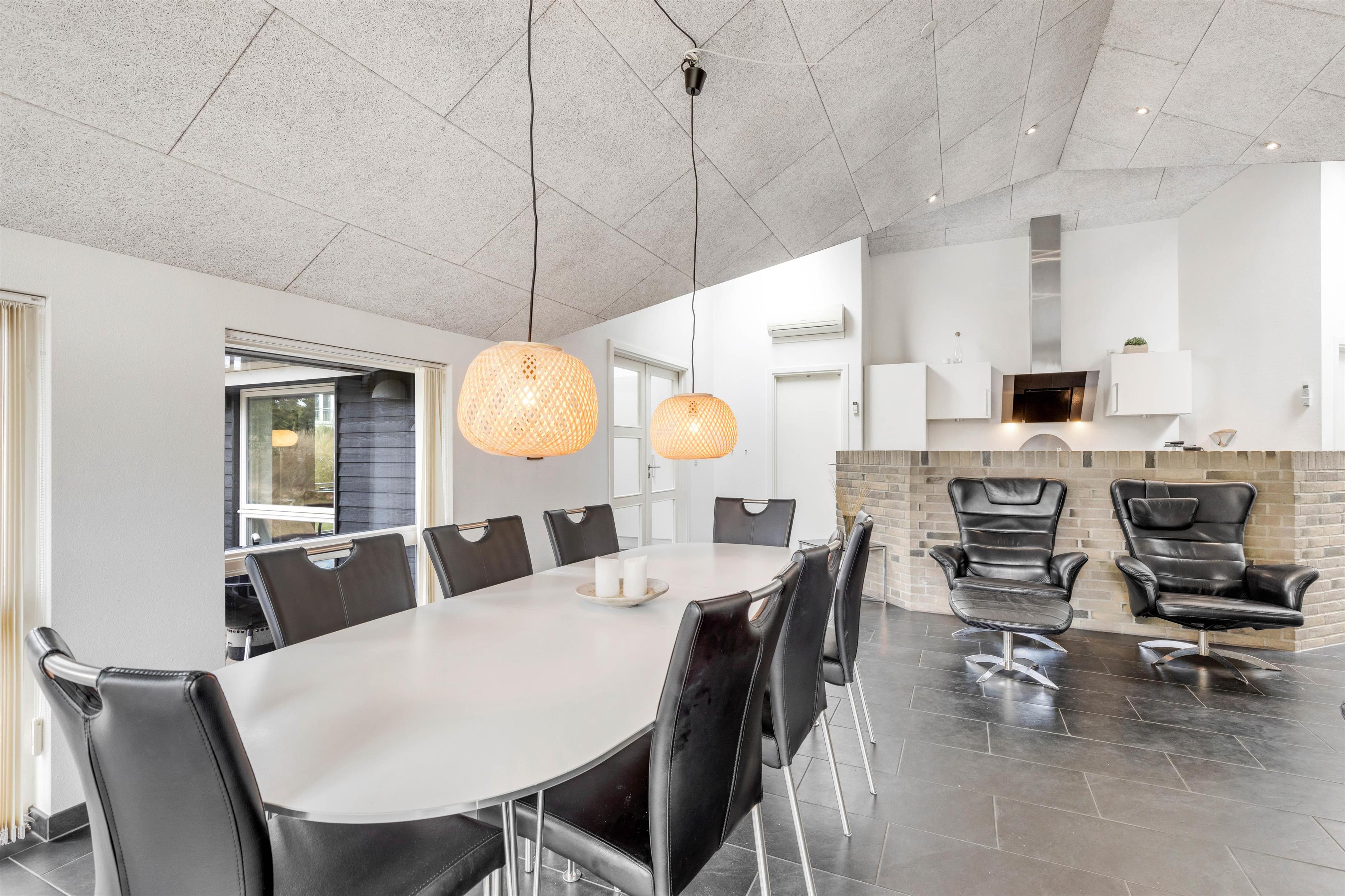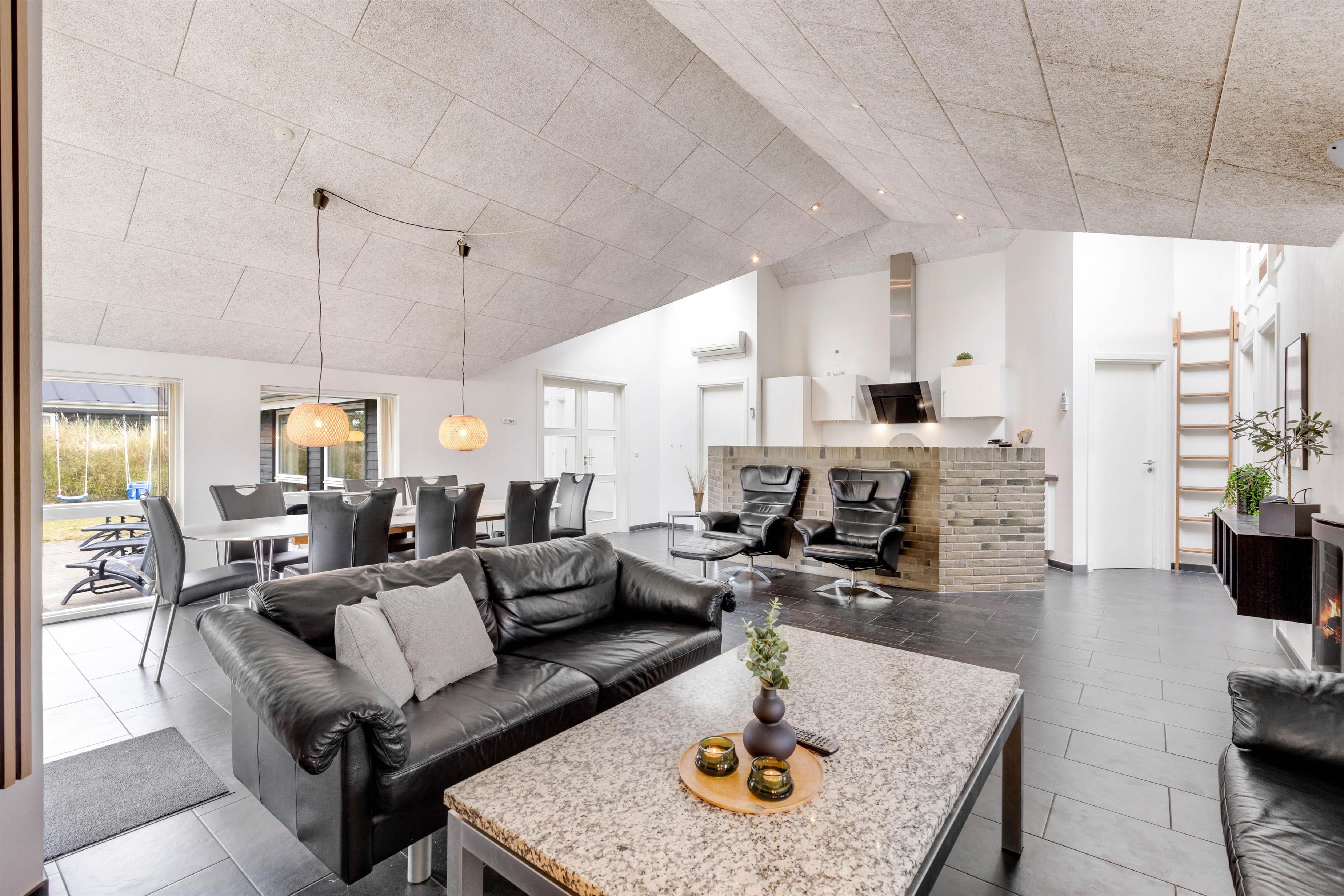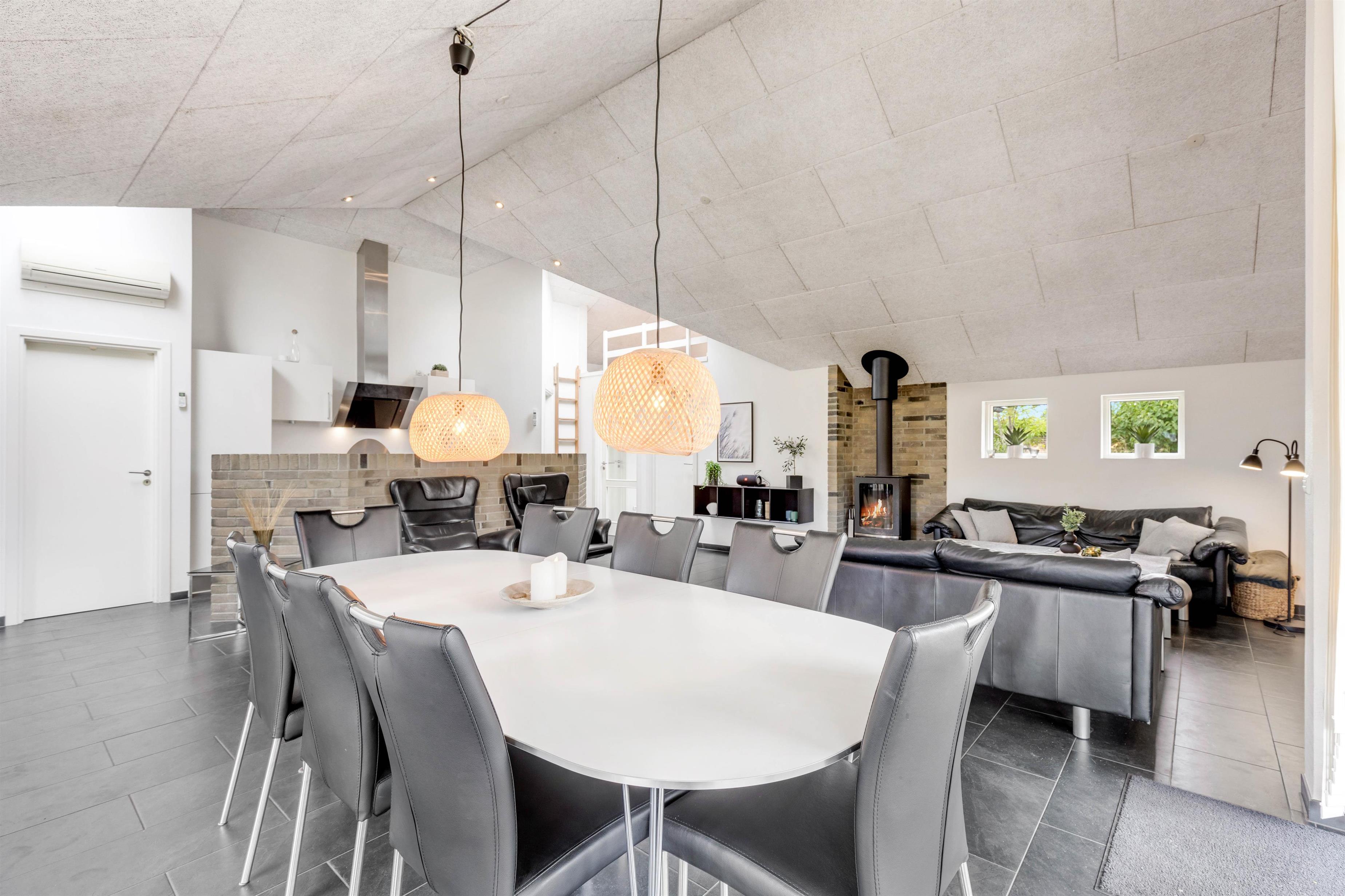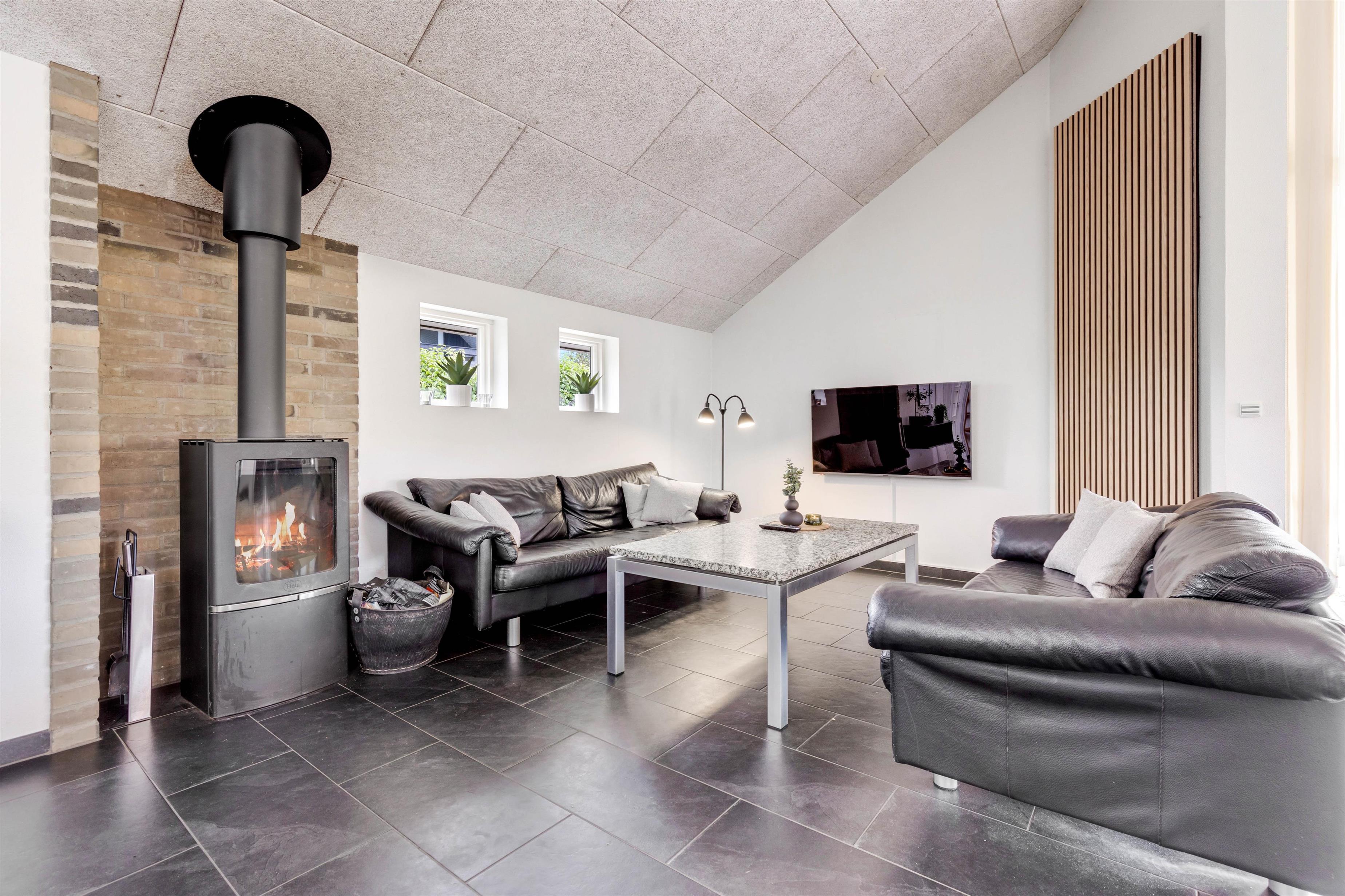 This modern and comfortable holiday home, with its high ceilings and excellent natural light, has plenty to offer. The spacious living area, combining kitchen, dining space and lounge, forms the heart of the holiday home, perfect for spending time together, sharing meals, playing games or simply relaxing. The wood-burning stove creates a cosy atmosphere.