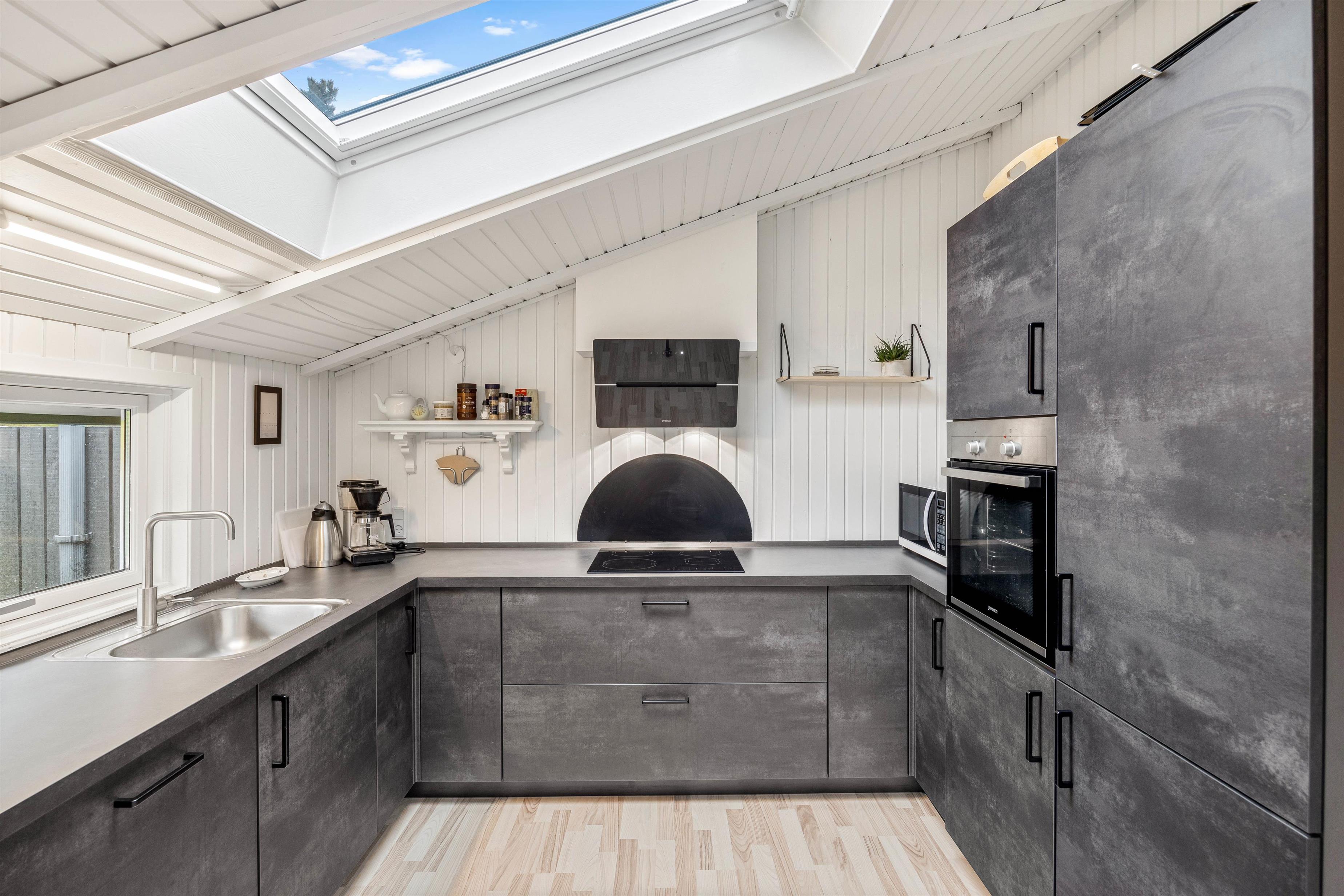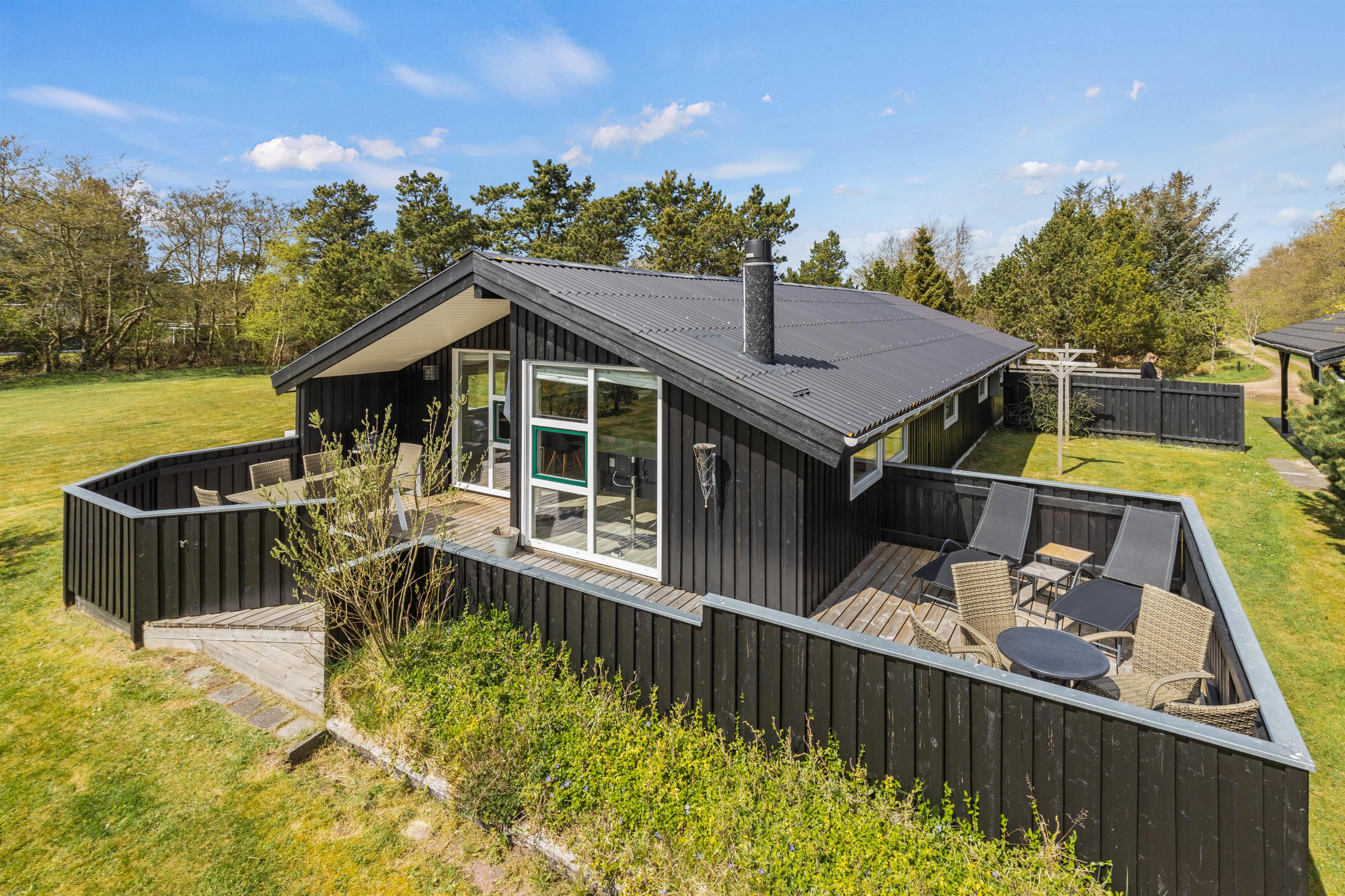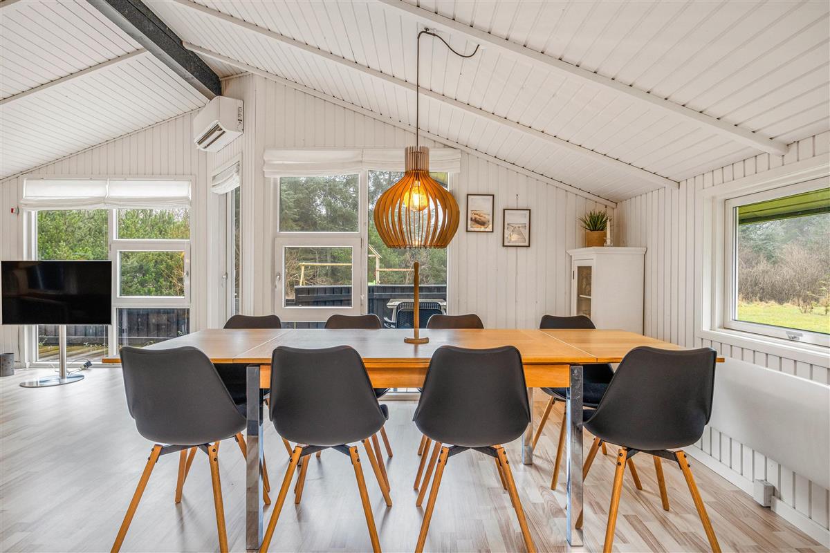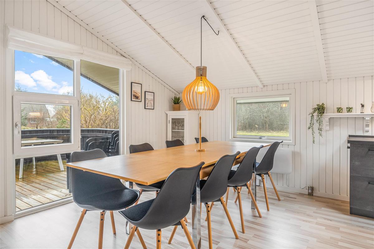 The open-plan living area, typically Danish in style, features a dining space and modern kitchen where you'll spend quality time cooking, playing games and having fun together. Light, warm colours and Scandinavian-style furniture create an utterly inviting atmosphere. Make yourself comfortable in the cosy armchairs or on the sofa for a film evening, enhanced by the crackling flames in the wood-burning stove for a perfect holiday evening.