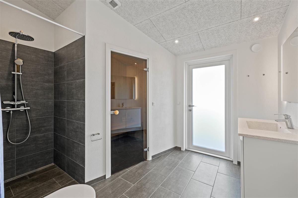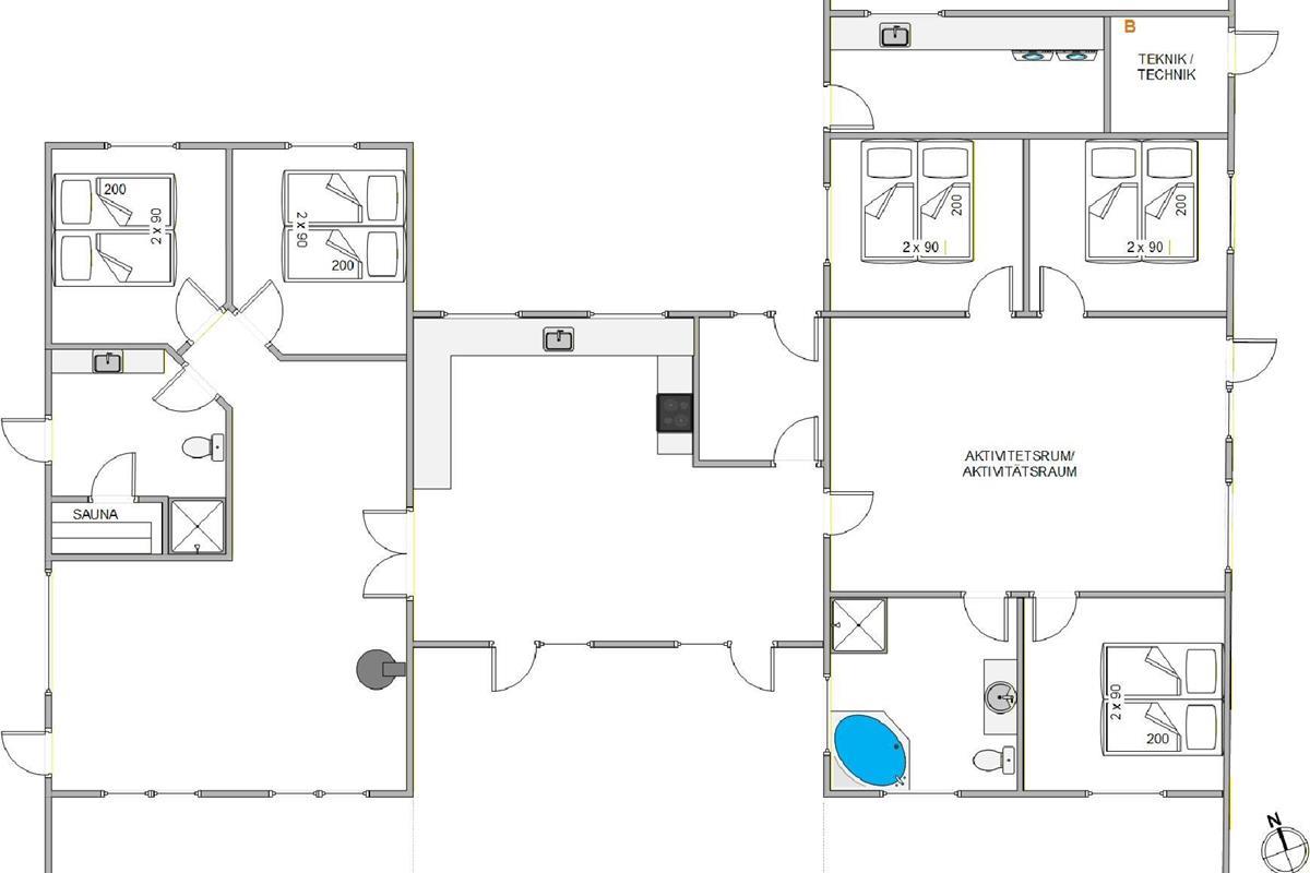 The distinctive 201-square-metre layout of this holiday home at Solhaven 7 is thoughtfully designed and ideal for groups of 10. All rooms are bright and open-plan. At the heart of the house is the spacious kitchen-diner with a dream kitchen setup. Cooking and dining together becomes an event here. From one side of the kitchen-diner, you enter the large living area with comfortable sofas and armchairs and a large flat-screen TV - perfect for a cosy film night by the bio fireplace. The living area also connects to two bedrooms with comfortable double beds and a beautiful bathroom featuring an integrated sauna and shower enclosure.