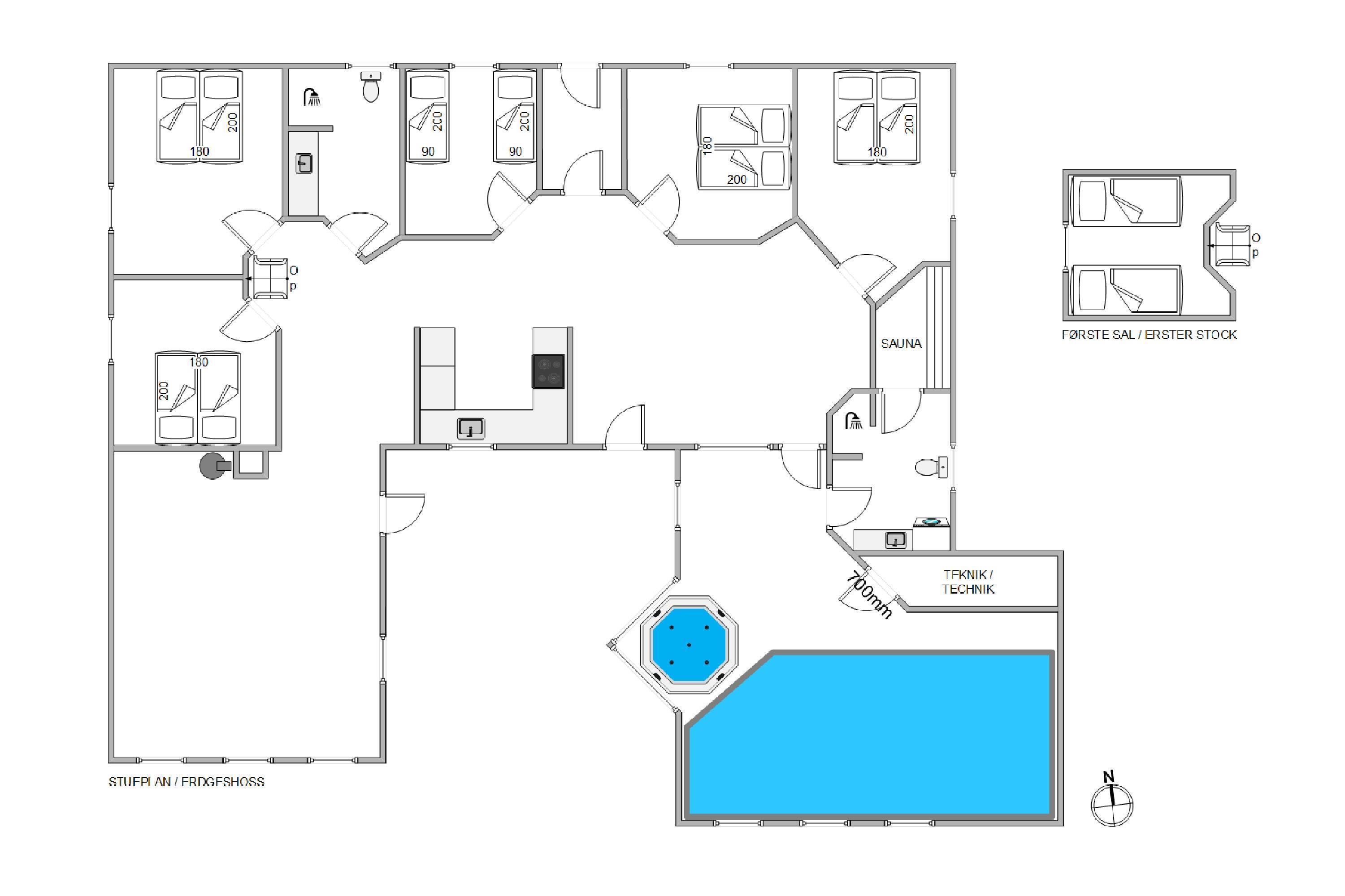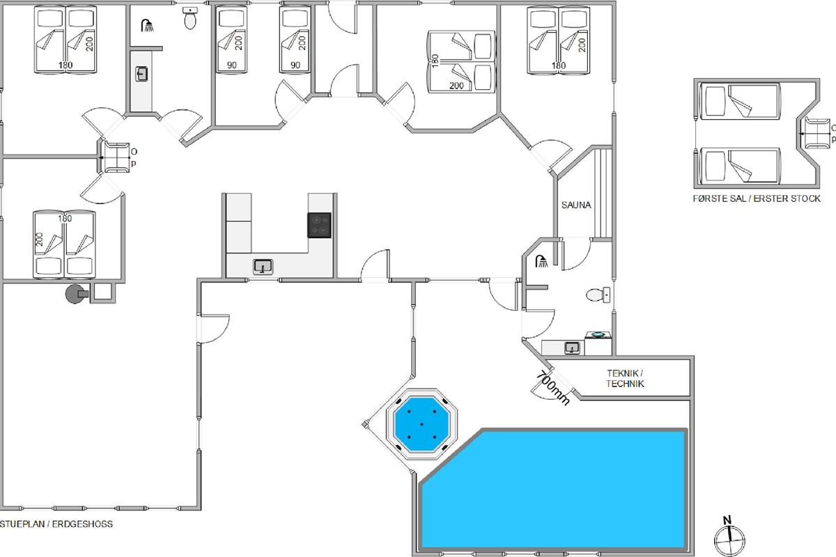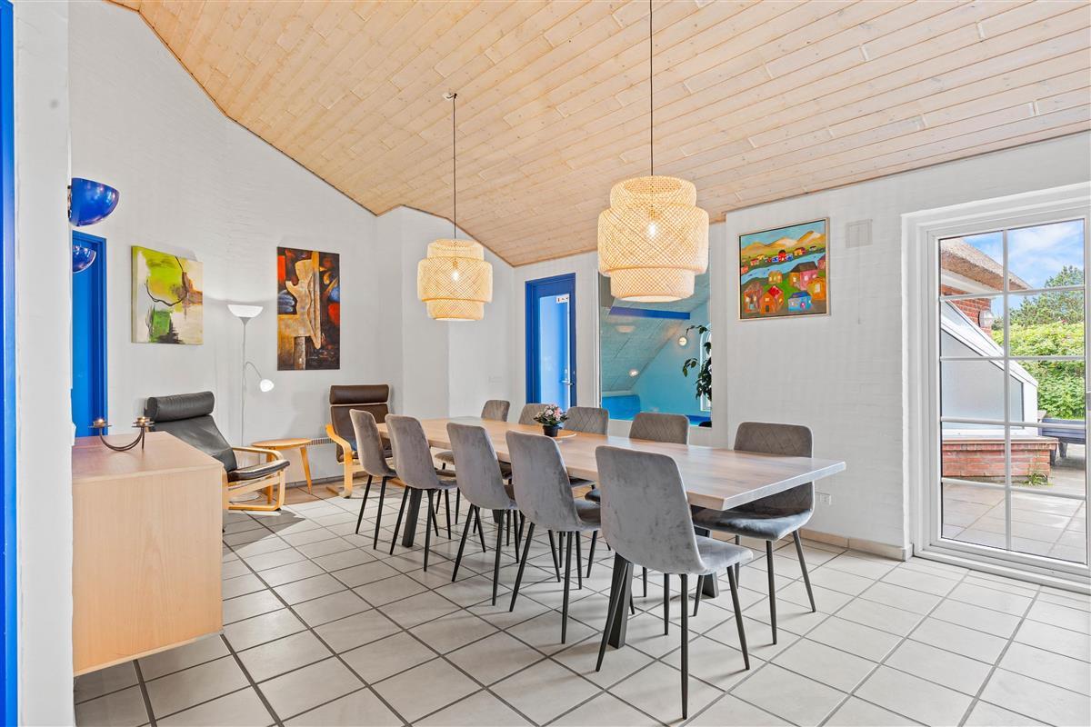 The dining area provides direct access to the holiday home's pool area, featuring an 18-square-metre swimming pool and hot tub. This section also houses one of the two bathrooms with underfloor heating, where you'll find the holiday home's sauna. There are plenty of opportunities for relaxation and unwinding. The convenient location of the pool area means you can keep an eye on children from the dining area.