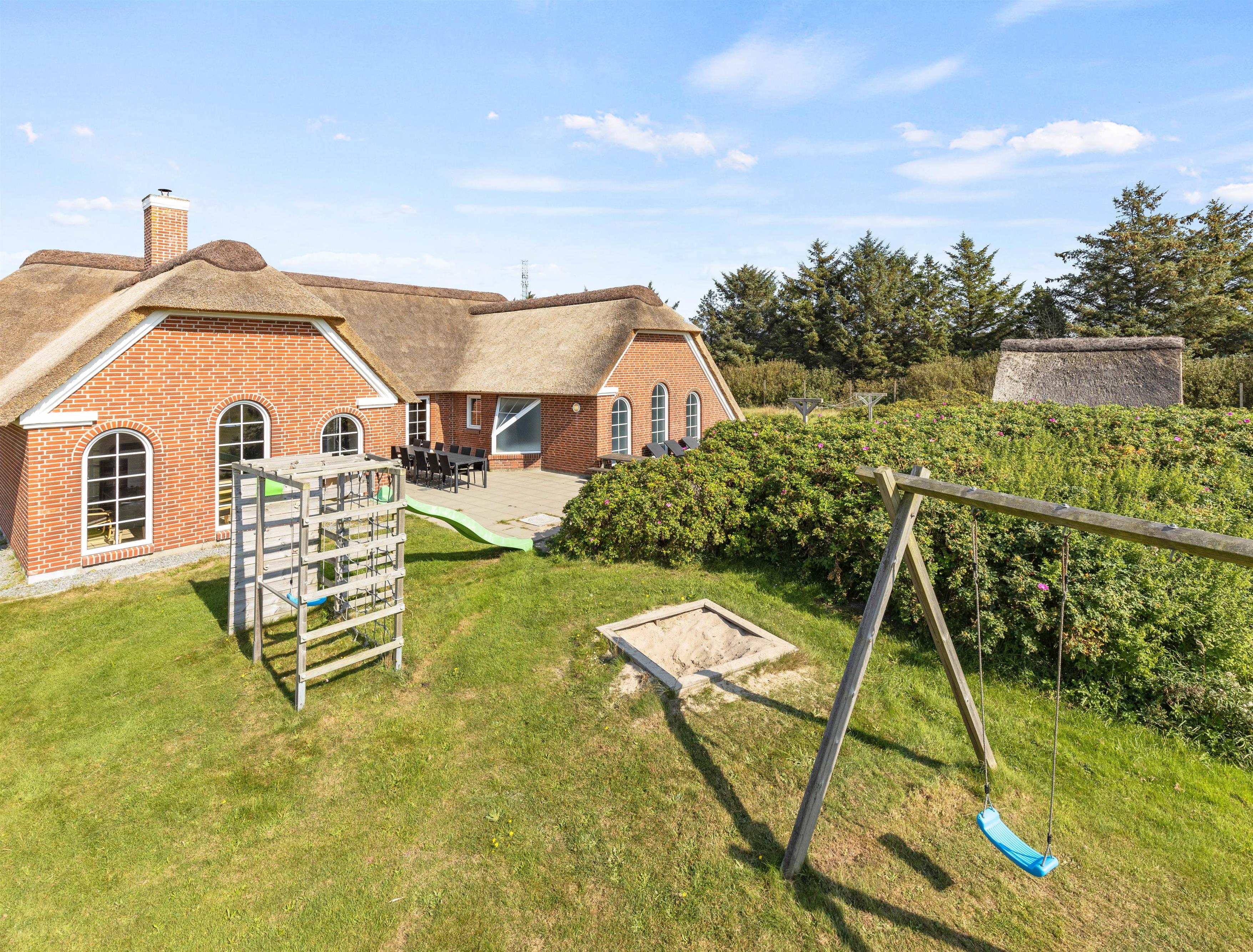 The holiday home features a lovely large terrace situated between the two wings of the holiday home, providing a sheltered spot for summer evening barbecues. Children will enjoy the sandbox and swing set on the spacious lawn, offering plenty of room for play and fun.