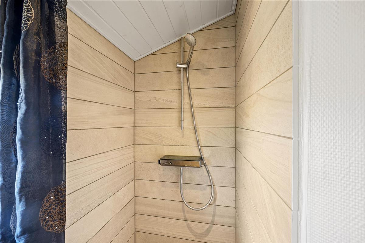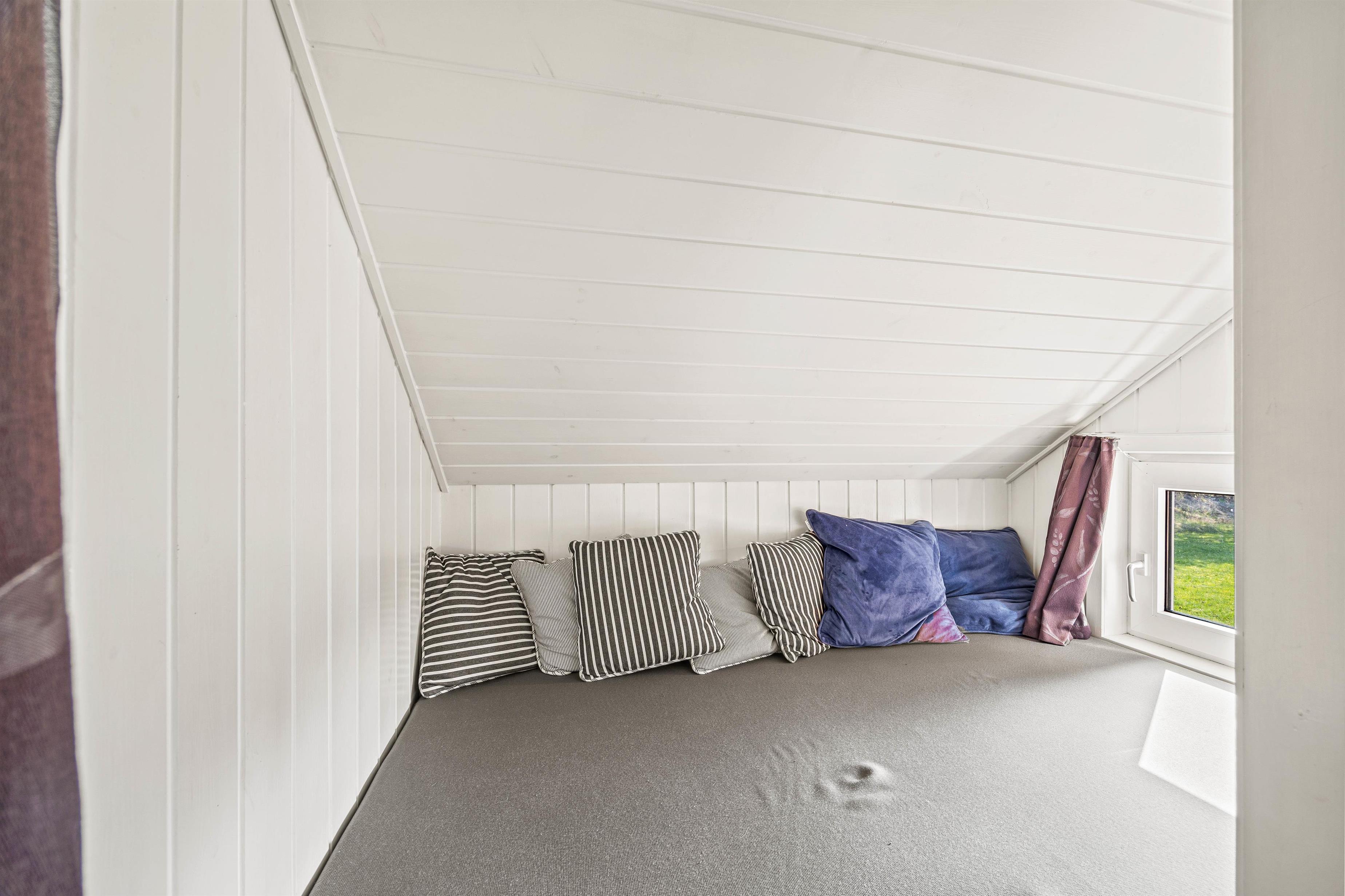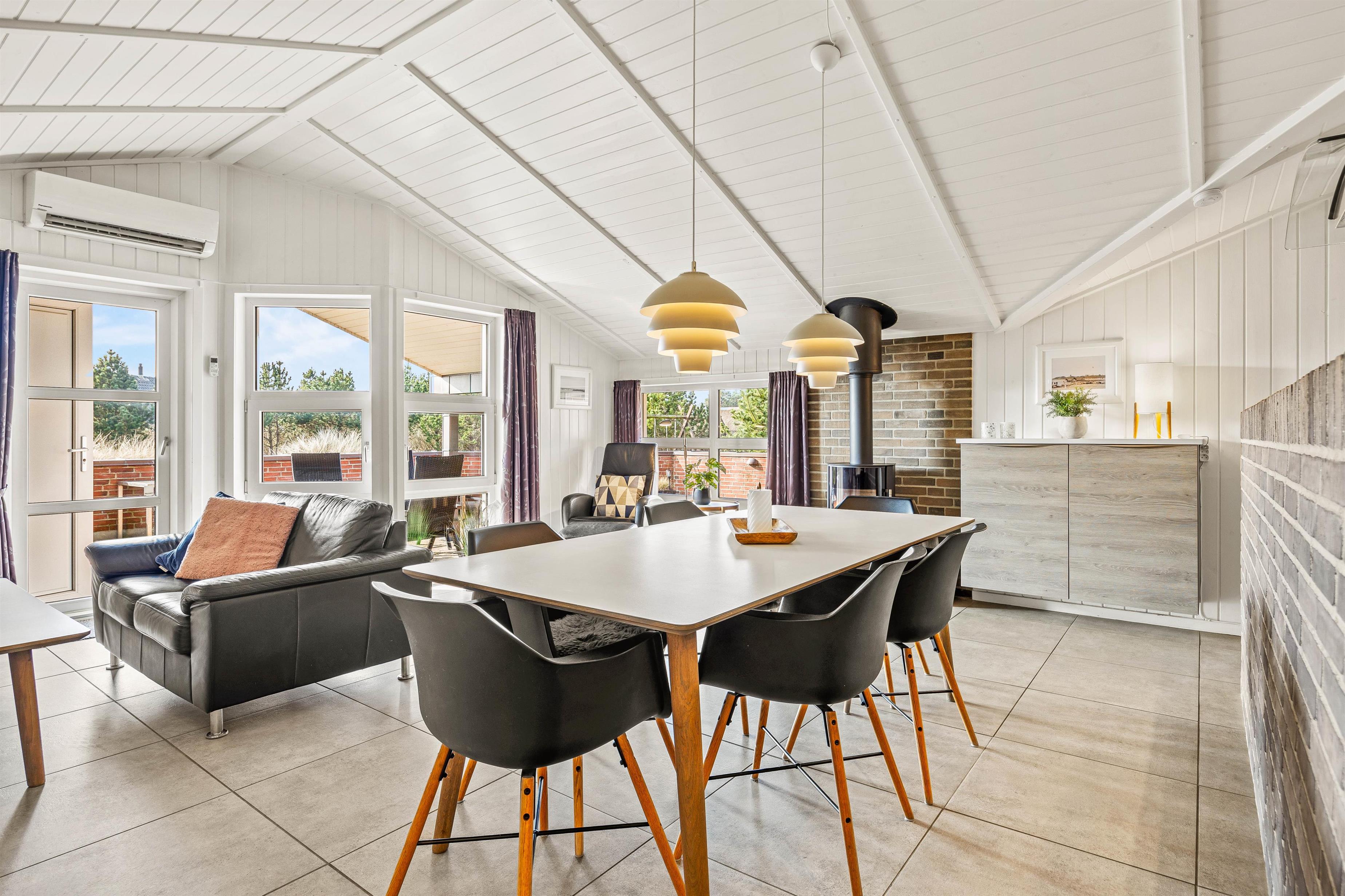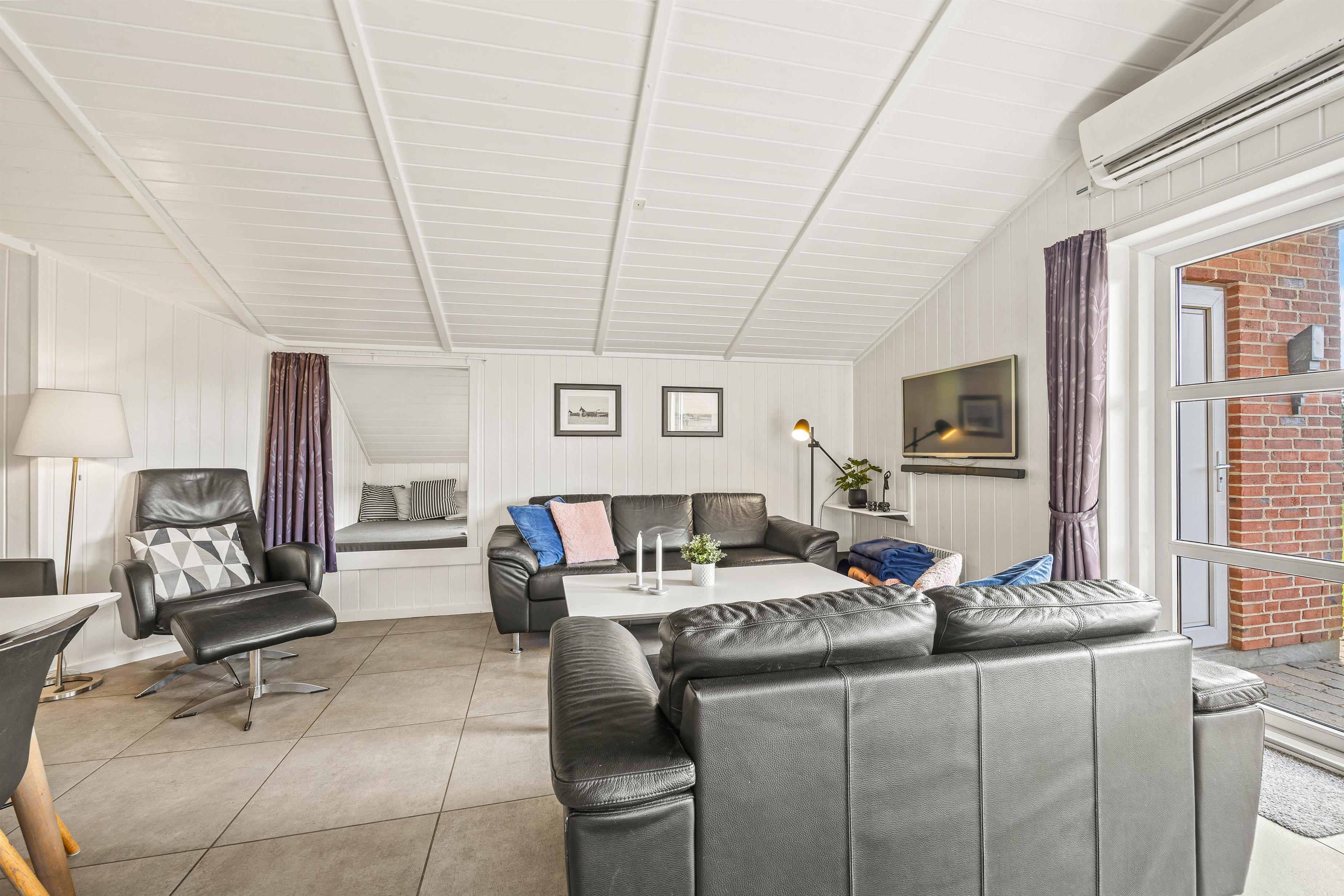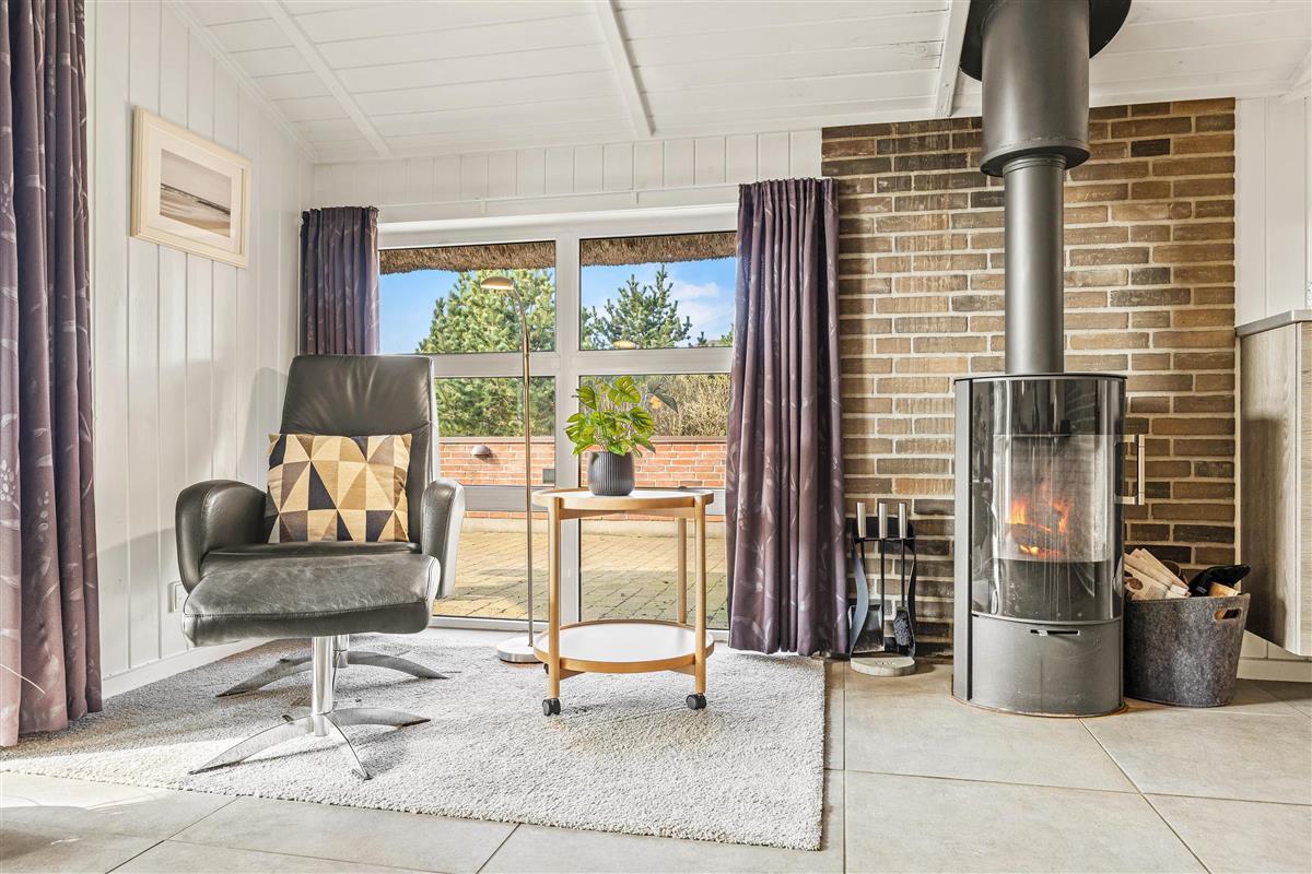 The entire living area features tiled floors with underfloor heating. Additional warmth is provided by a wood-burning stove. The comfortable leather sofas and armchairs offer perfect spots to put your feet up and unwind. A special feature is the traditional Danish 'hyggekrog' - a cosy nook furnished with cushions and a mattress, perfect for curling up with a good book.