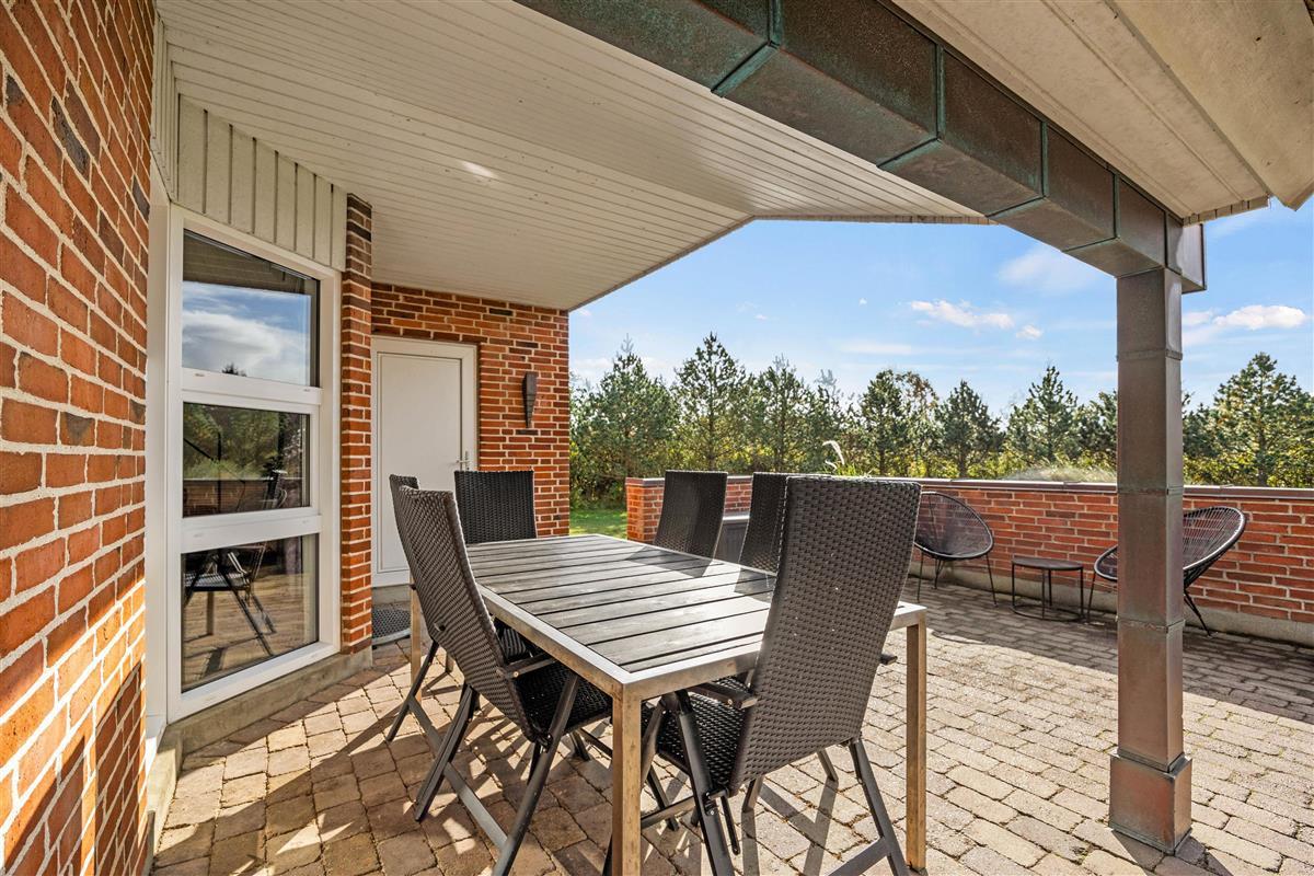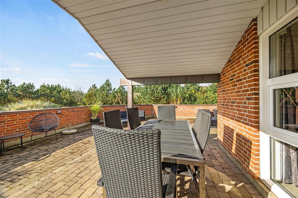 The 1,800-square-metre plot offers plenty of privacy. Children can enjoy the well-maintained lawn, swing set and sandbox. The sheltered terrace, partially covered, provides various spots to enjoy the fresh North Sea air. A barbecue is available for summer evening entertaining.
