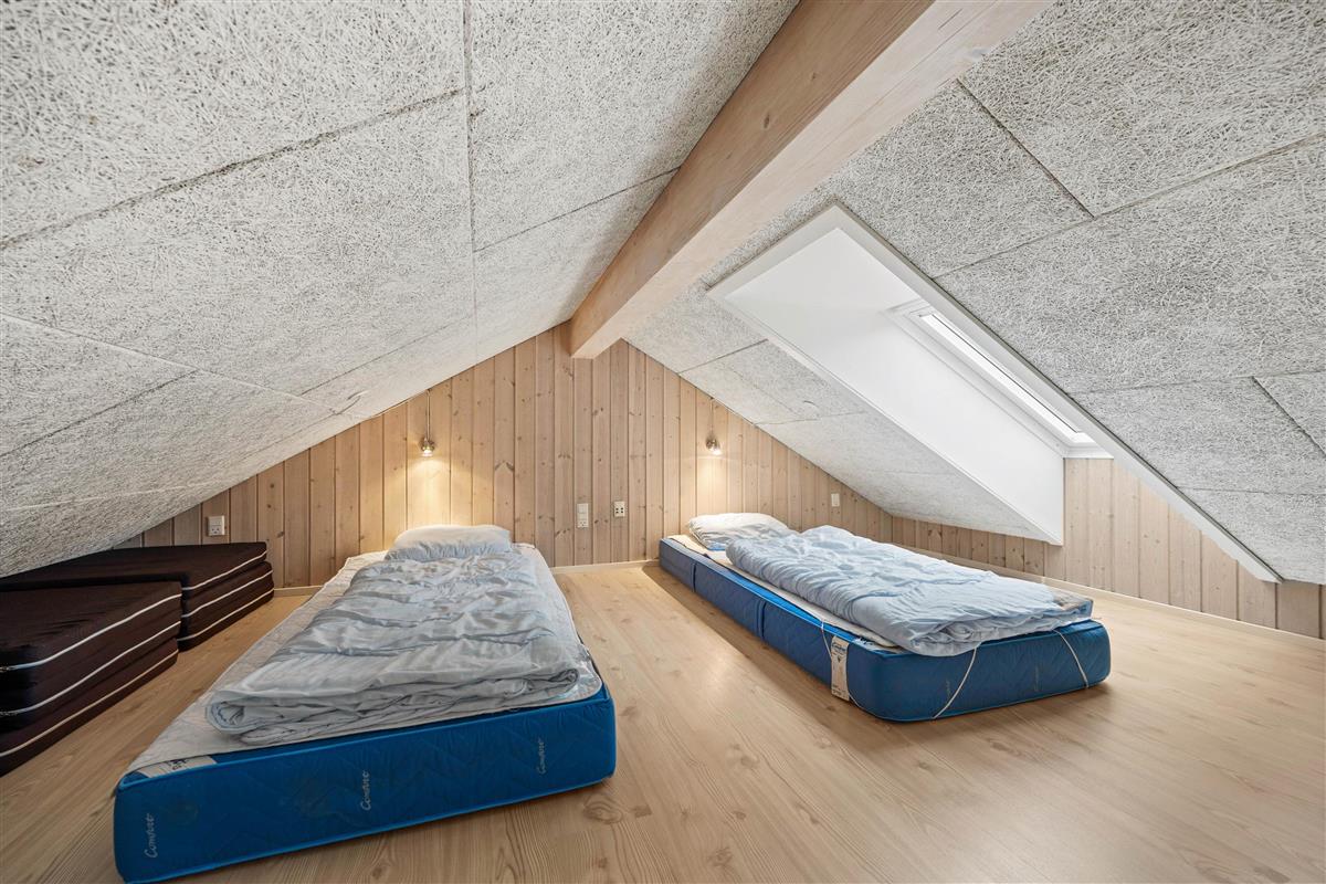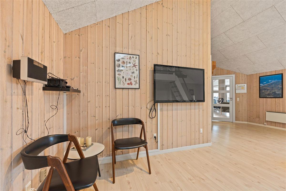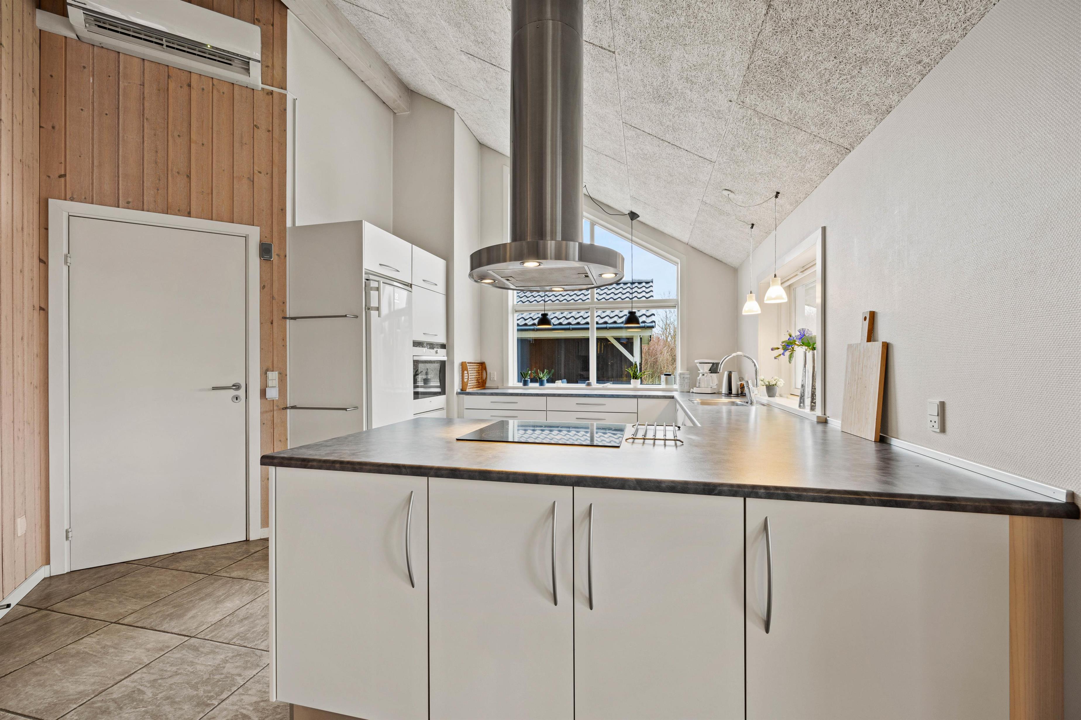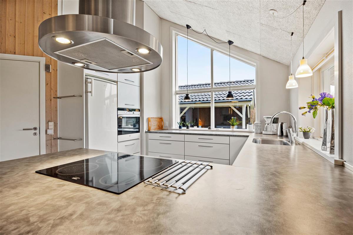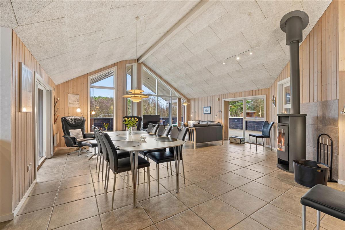 The 150 square metres of this holiday home at Hvidbjerg Strandvej 34 feature a truly attractive layout. No space is wasted, offering plenty of opportunities to retreat, be active or spend quality time together. Upon entering, you'll find yourself in a spacious hallway housing the washing machine, tumble dryer and an extra fridge. There's ample space here for everyone's muddy wellington boots, shoes and coats. Moving on, you'll discover the typically Danish open-plan living area. This space is particularly bright and welcoming, thanks to the converted loft spaces and numerous large windows. The open-plan kitchen features modern essential equipment and plenty of workspace for helpful sous chefs. The open layout ensures you're always part of the action. In the living area, comfortable armchairs and sofas create that distinctive Danish 'hygge' feeling, complemented by the wood-burning stove. The tiled floor in the living area also features underfloor heating.