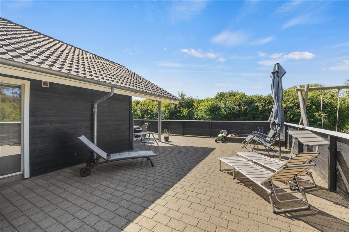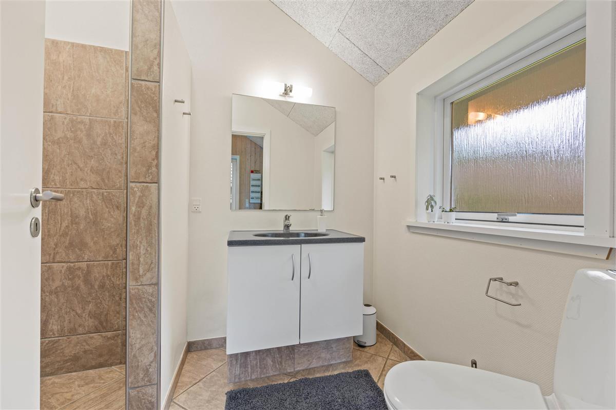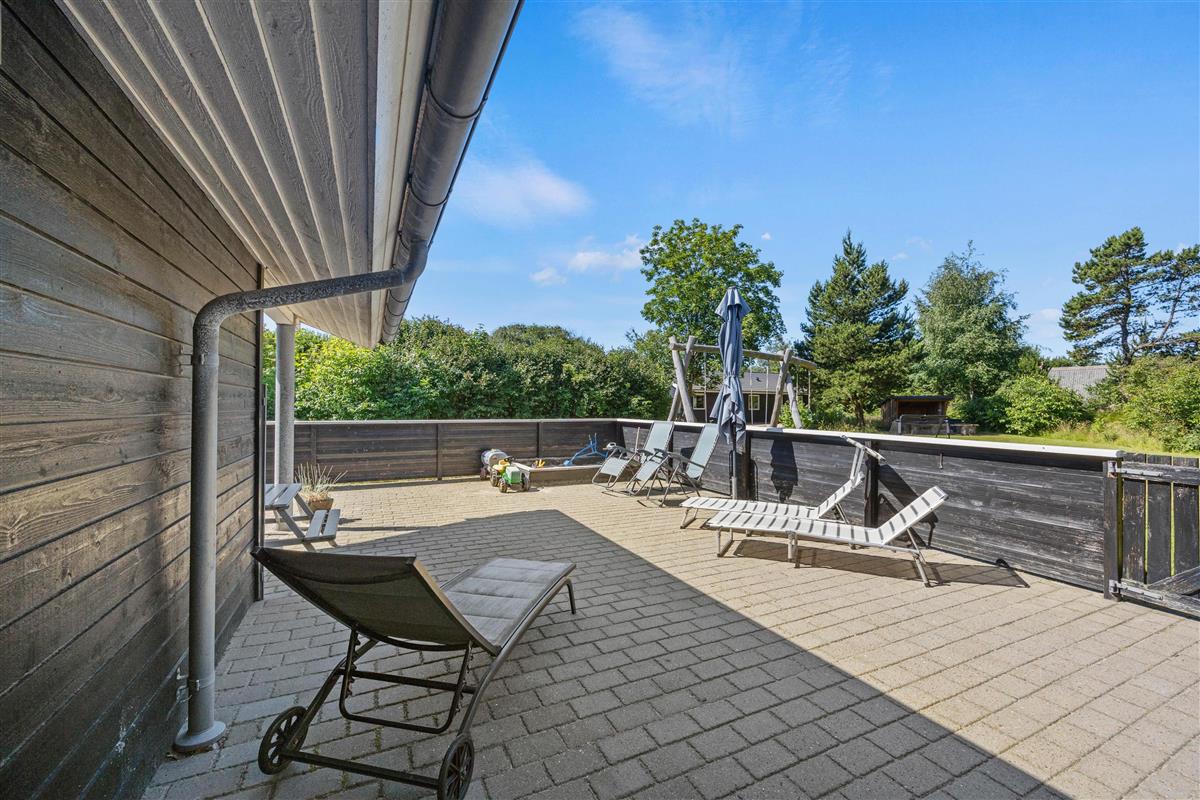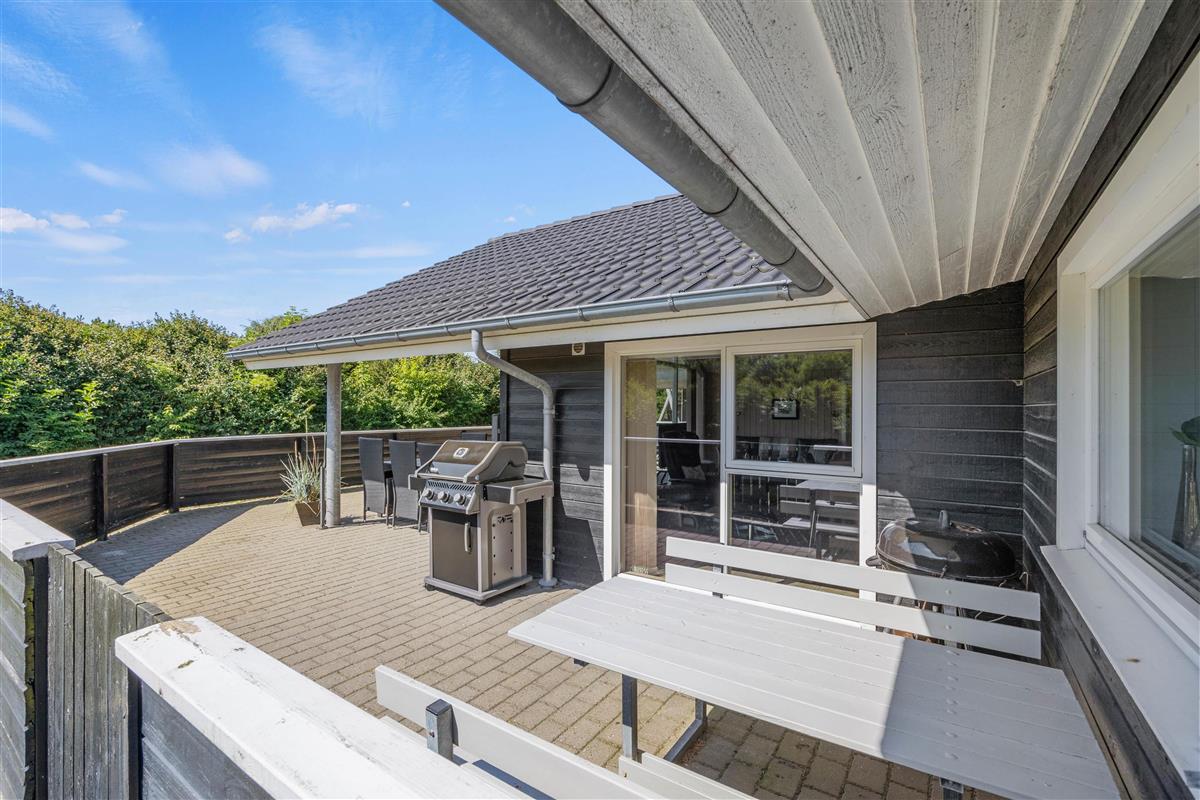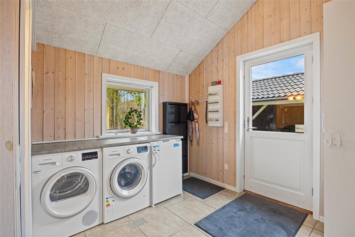 The 150 square metres of this holiday home at Hvidbjerg Strandvej 34 feature a truly attractive layout. No space is wasted, offering plenty of opportunities to retreat, be active or spend quality time together. Upon entering, you'll find yourself in a spacious hallway housing the washing machine, tumble dryer and an extra fridge. There's ample space here for everyone's muddy wellington boots, shoes and coats. Moving on, you'll discover the typically Danish open-plan living area. This space is particularly bright and welcoming, thanks to the converted loft spaces and numerous large windows. The open-plan kitchen features modern essential equipment and plenty of workspace for helpful sous chefs. The open layout ensures you're always part of the action. In the living area, comfortable armchairs and sofas create that distinctive Danish 'hygge' feeling, complemented by the wood-burning stove. The tiled floor in the living area also features underfloor heating.