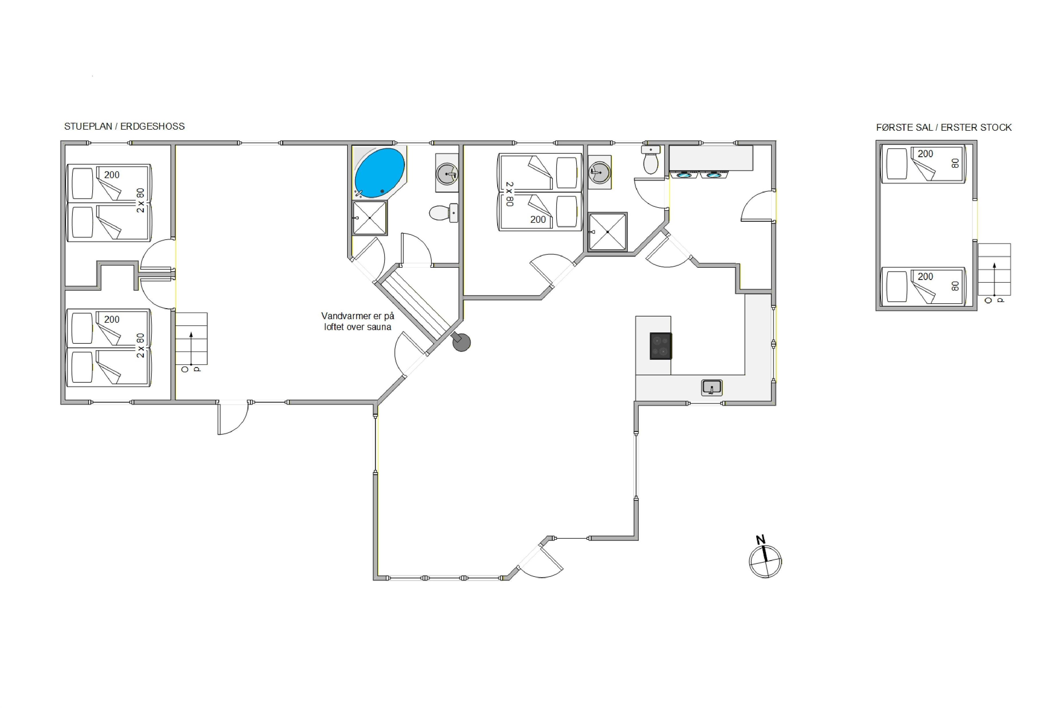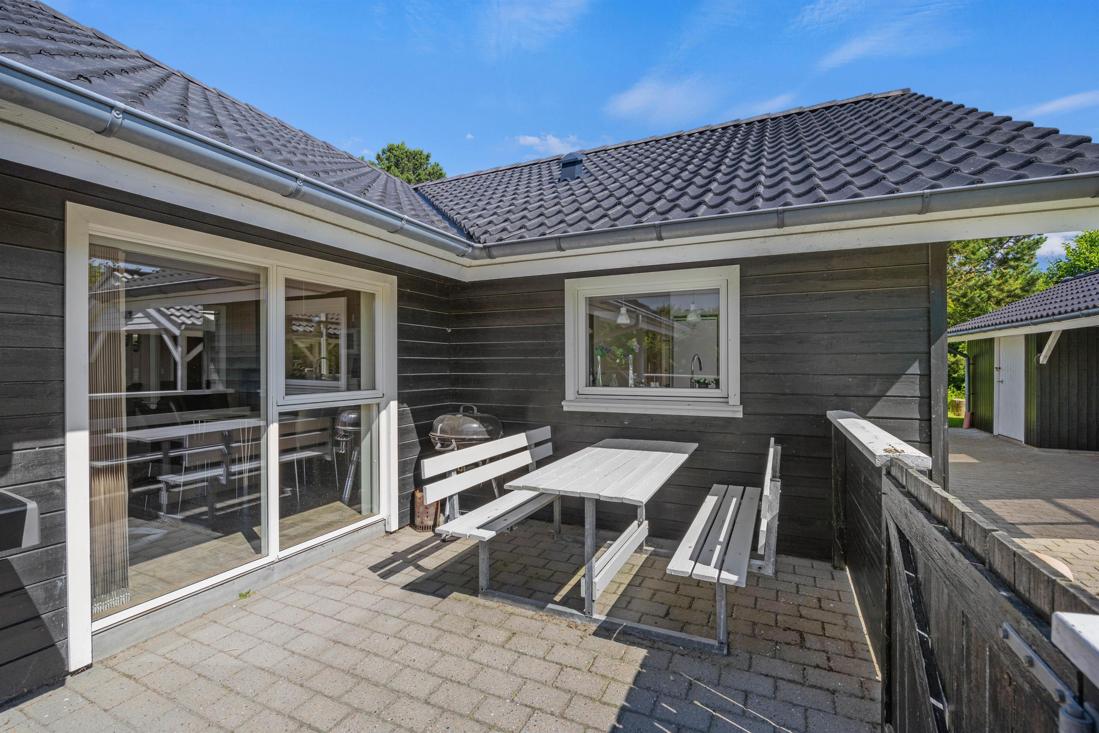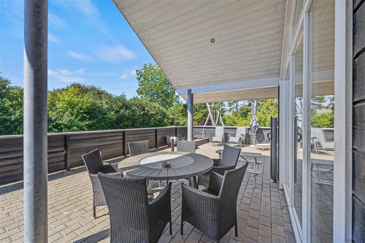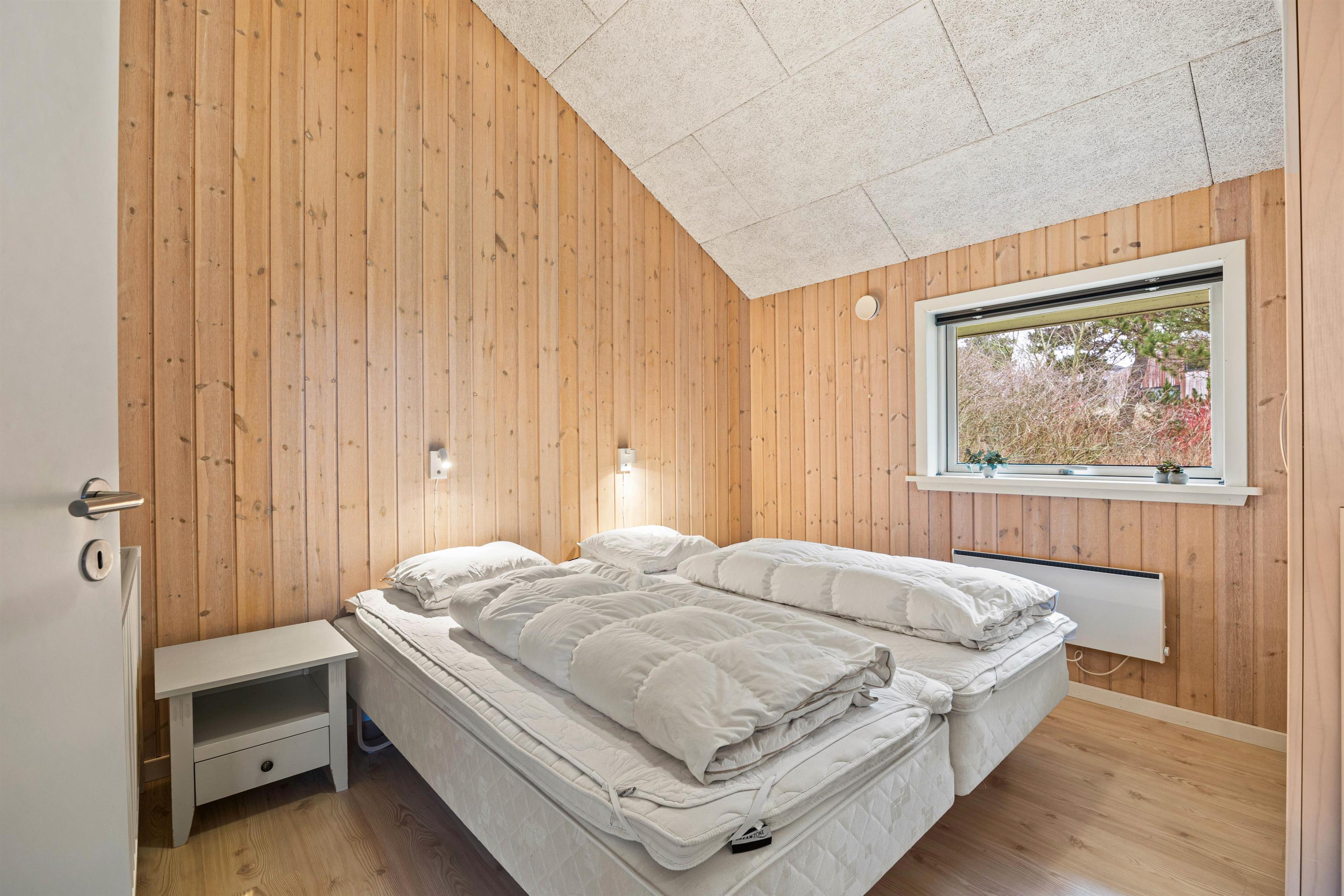 The 150 square metres of this holiday home at Hvidbjerg Strandvej 34 feature a truly attractive layout. No space is wasted, offering plenty of opportunities to retreat, be active or spend quality time together. Upon entering, you'll find yourself in a spacious hallway housing the washing machine, tumble dryer and an extra fridge. There's ample space here for everyone's muddy wellington boots, shoes and coats. Moving on, you'll discover the typically Danish open-plan living area. This space is particularly bright and welcoming, thanks to the converted loft spaces and numerous large windows. The open-plan kitchen features modern essential equipment and plenty of workspace for helpful sous chefs. The open layout ensures you're always part of the action. In the living area, comfortable armchairs and sofas create that distinctive Danish 'hygge' feeling, complemented by the wood-burning stove. The tiled floor in the living area also features underfloor heating.