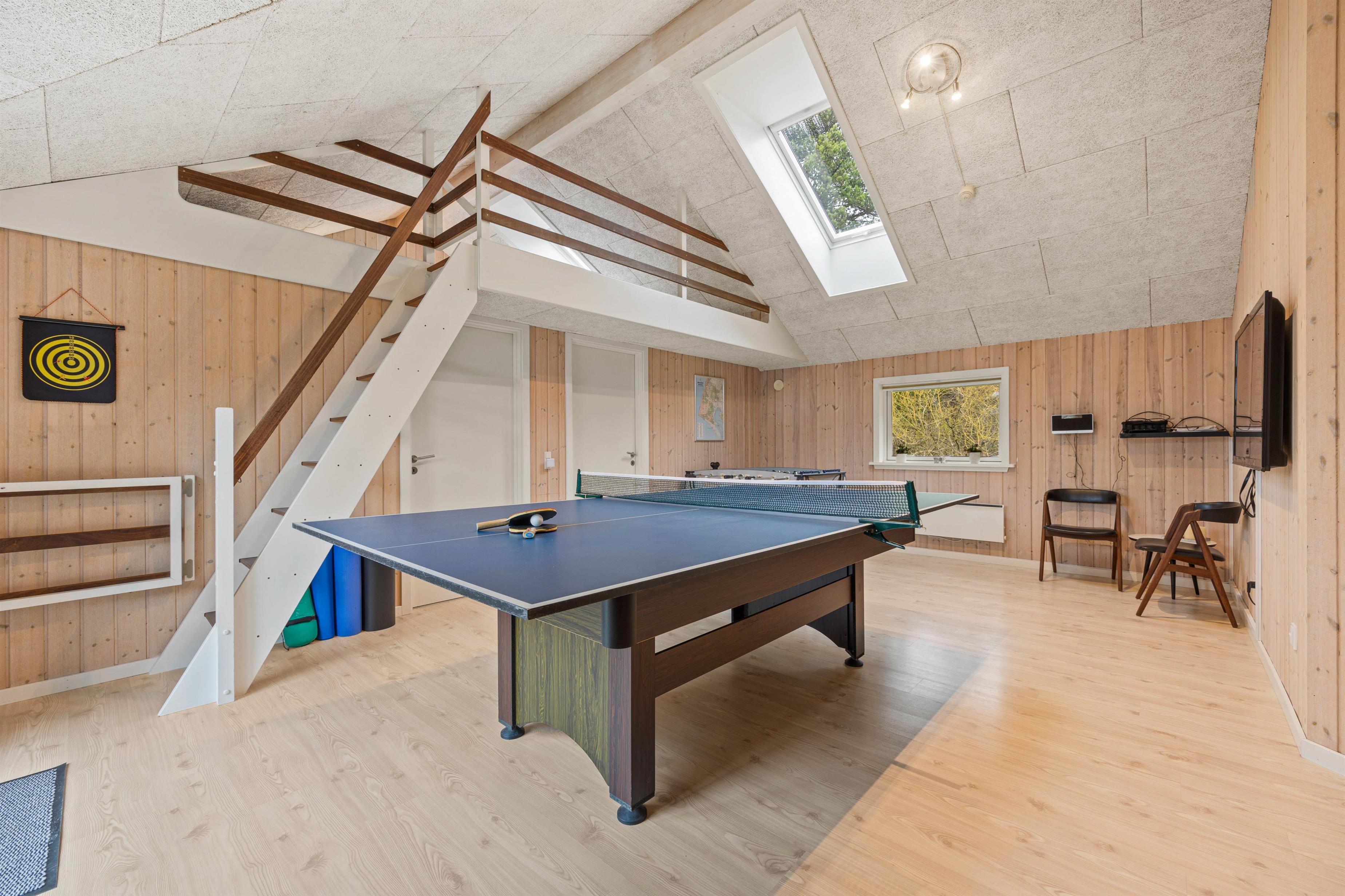 Through a door, you'll find the games room, perfect for guests of all ages. Table tennis, pool table, table football, and a flat-screen TV provide plenty of entertainment options. A child-safe staircase leads to a mezzanine level with two sleeping spaces that children will surely claim as their own.