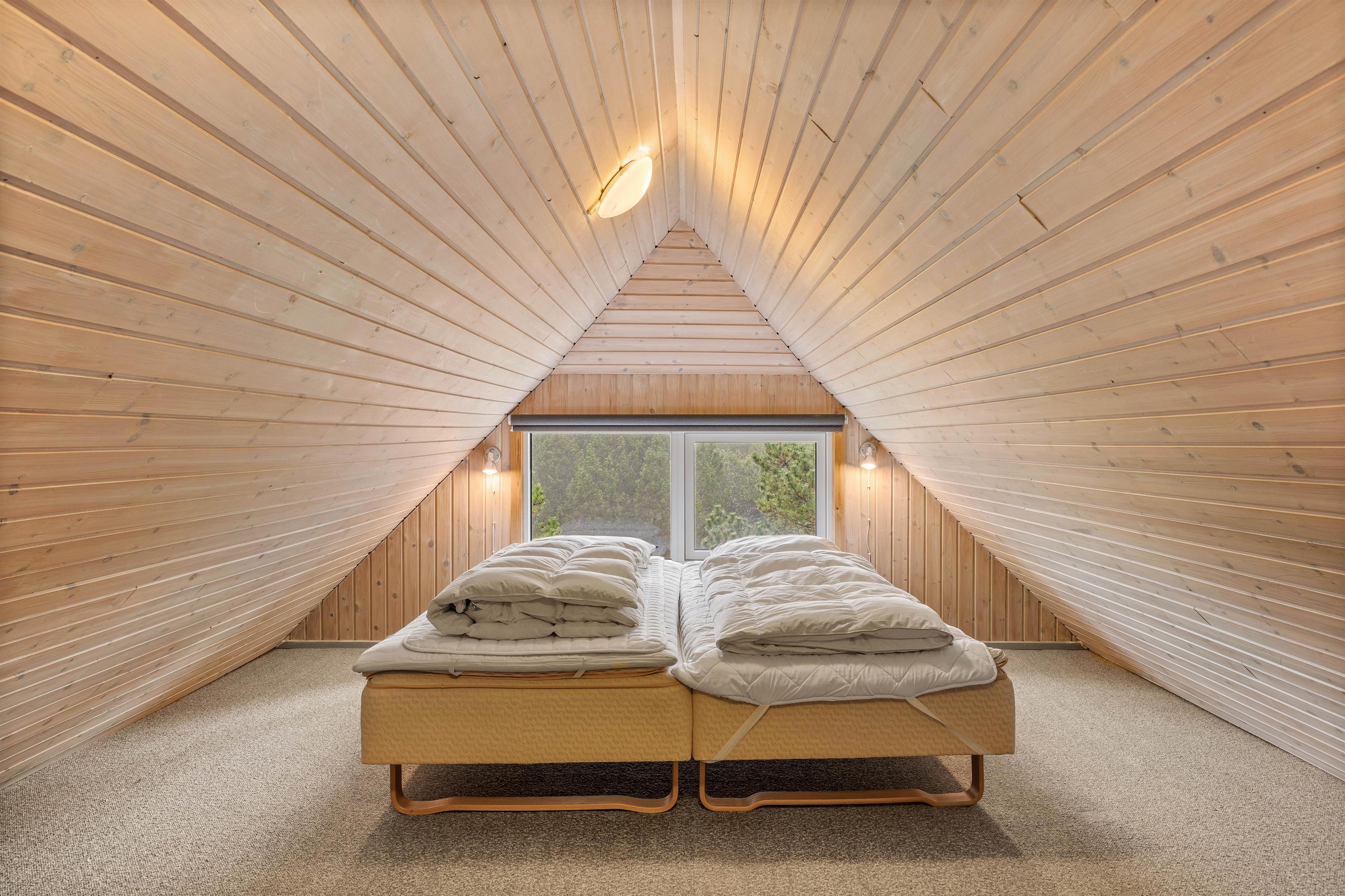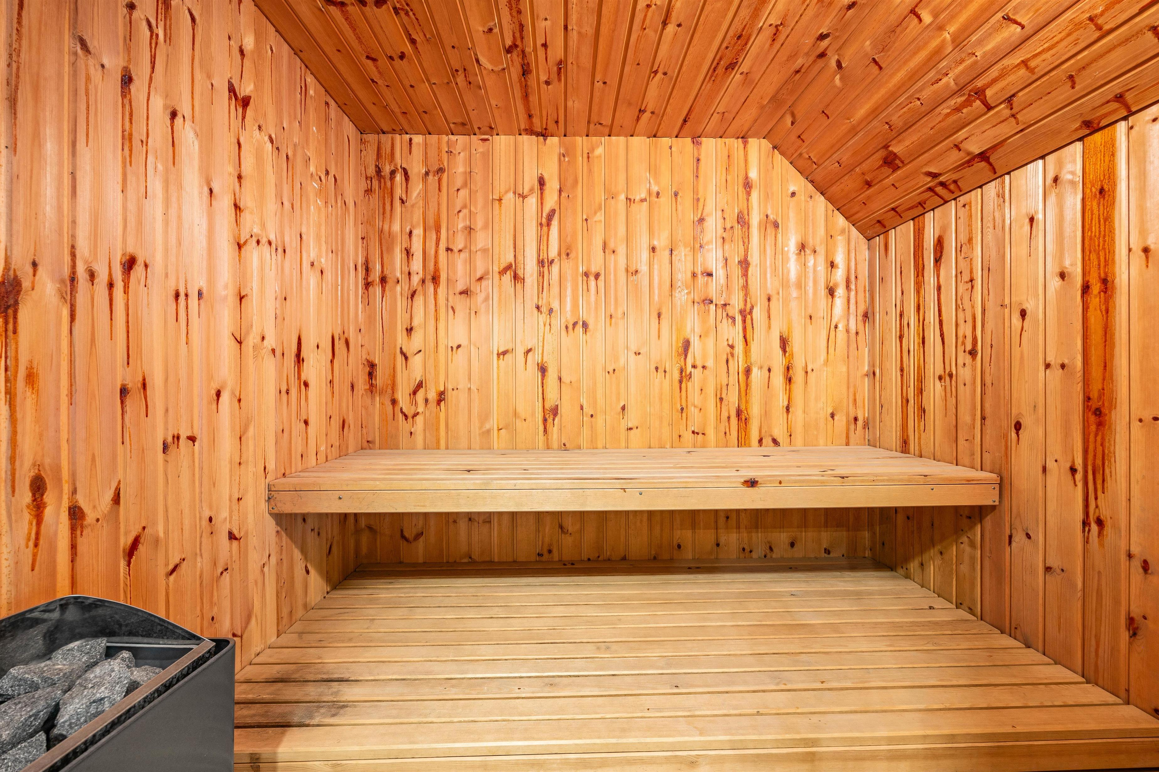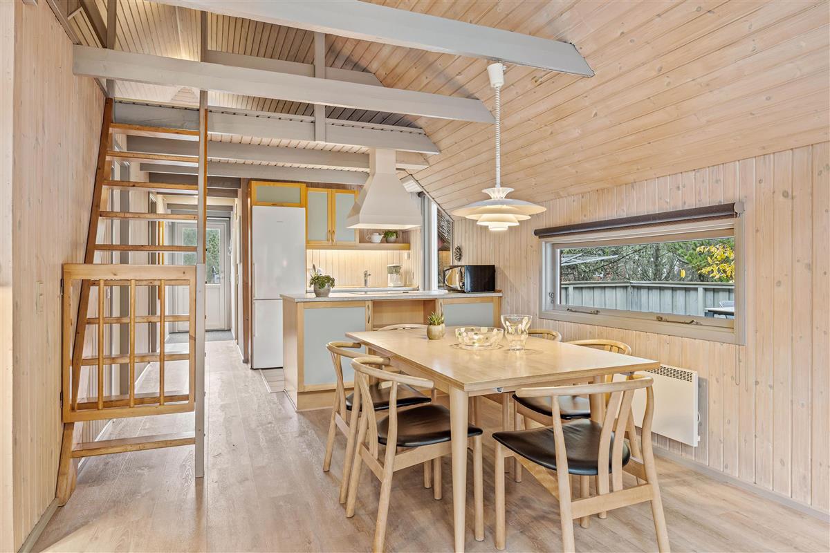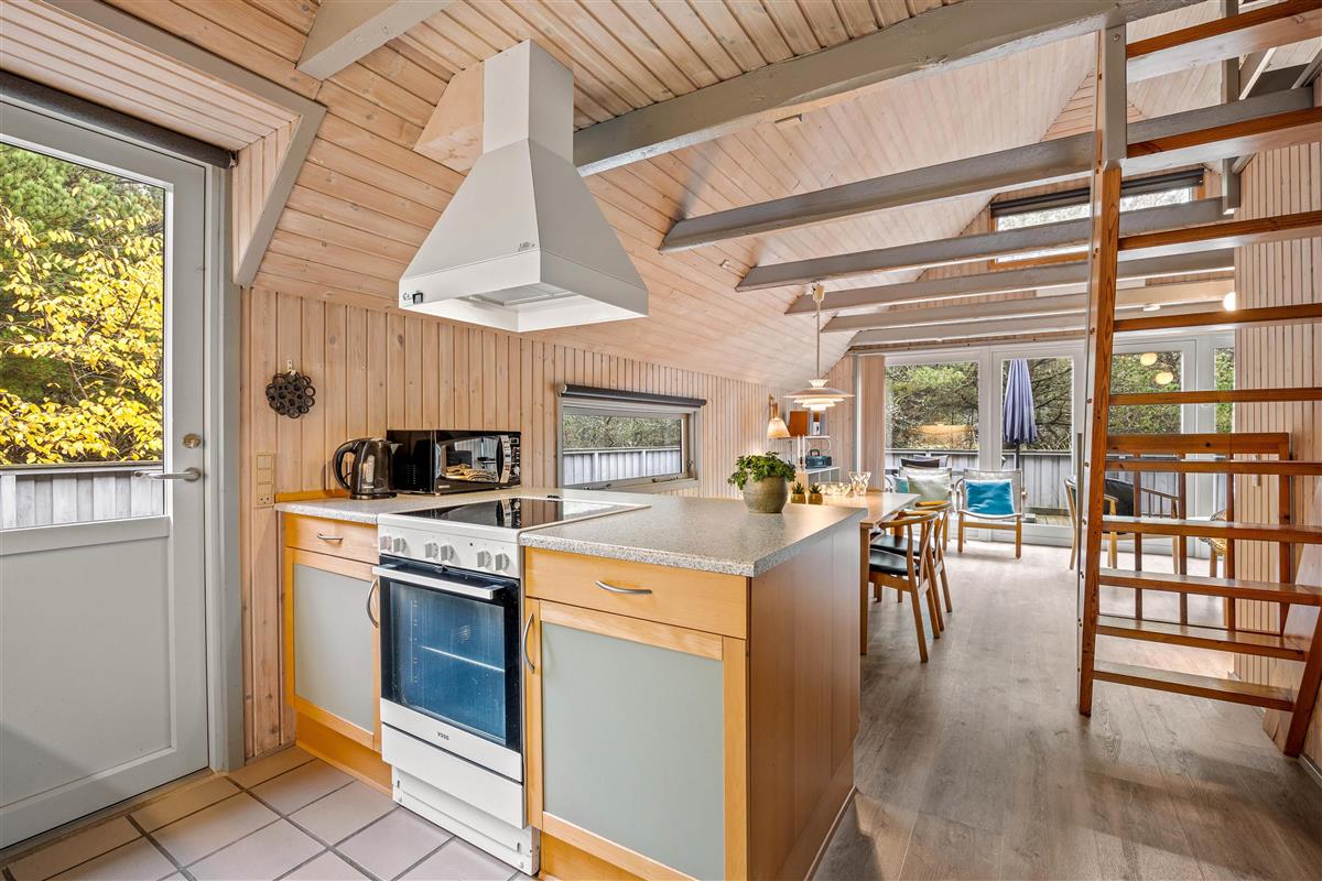 The holiday home features an open-plan living area with integrated kitchen. The well-equipped kitchen includes a dishwasher. From here, stairs lead to the first floor, which offers two sleeping areas and a children's retreat space perfect for quiet moments. An energy-efficient heat pump ensures comfortable temperatures throughout the house, while the wood-burning stove creates a cosy atmosphere during evening hours. The ground floor comprises two bedrooms with double beds and a bathroom with a lovely sauna.